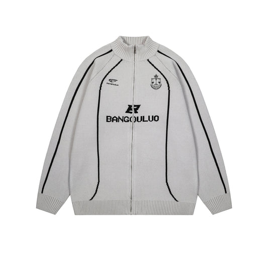 Letter Print Raw Hem Stand Neck Knit Cardigan WN11192