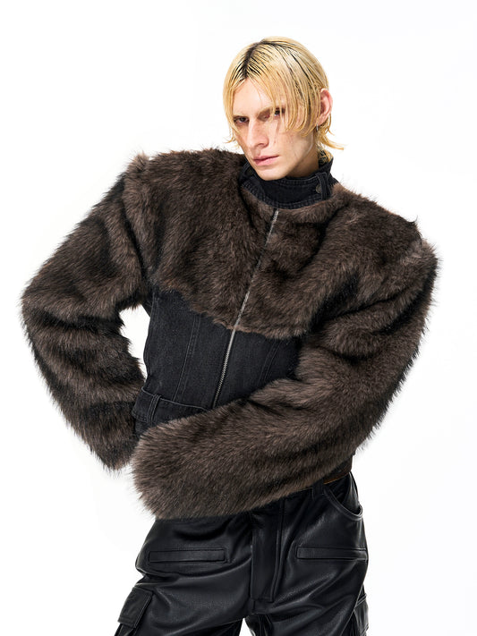 Fake Fur Patchwork Damage Short Denim Jacket WN21822