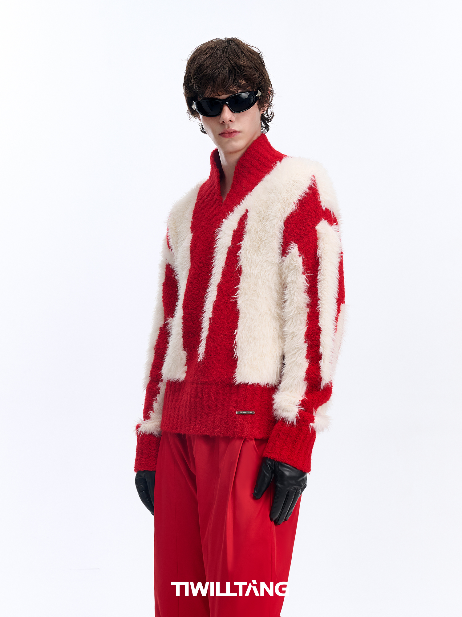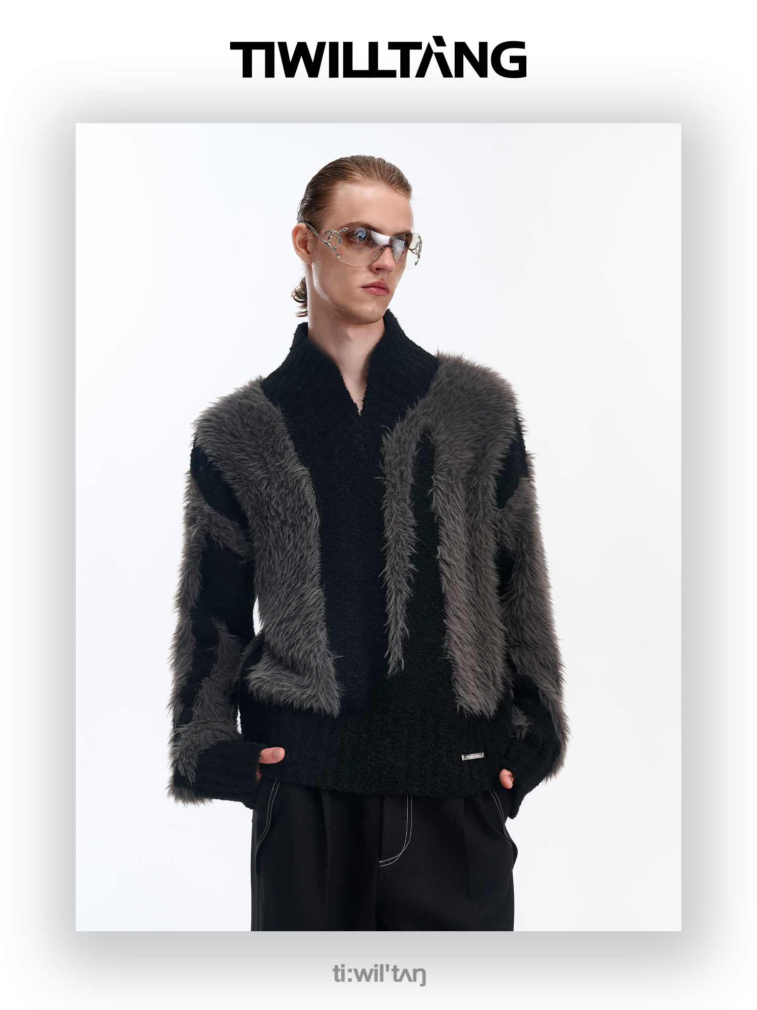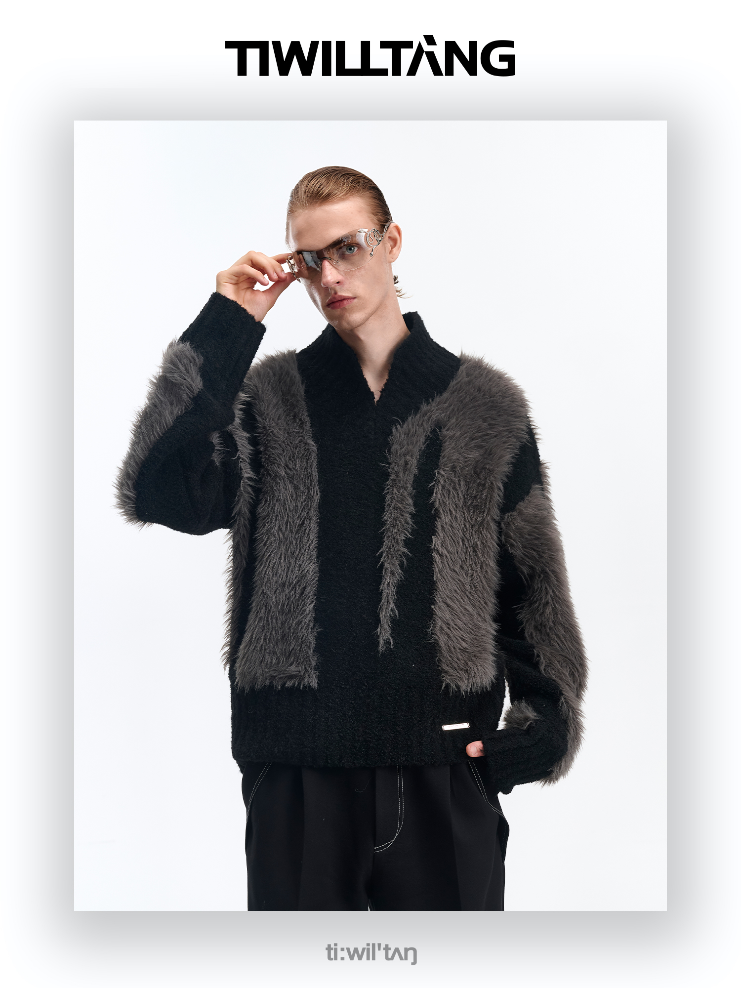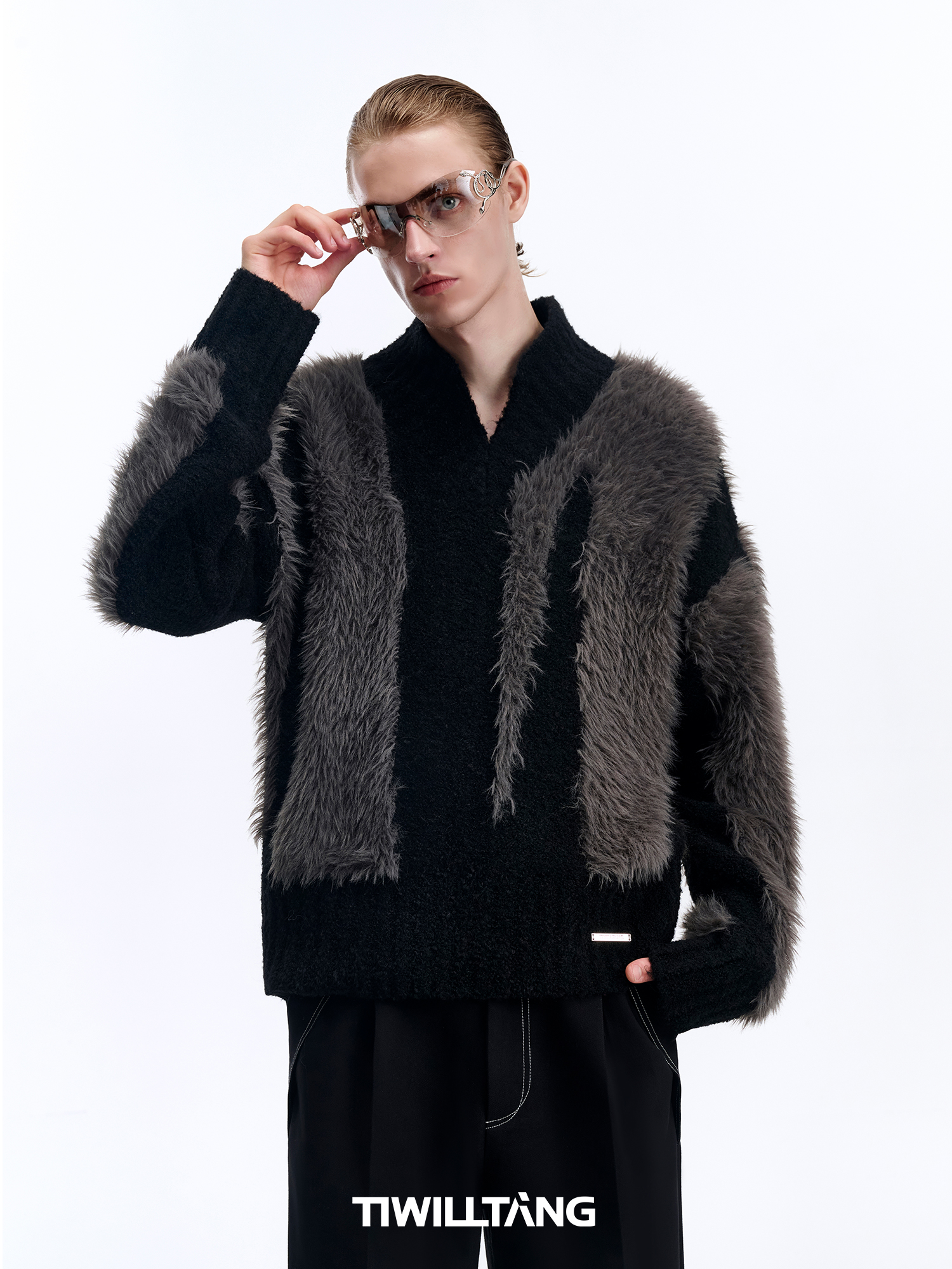 Fake Fur Patchwork Shaggy V-Neck Knit Sweater WN10694
