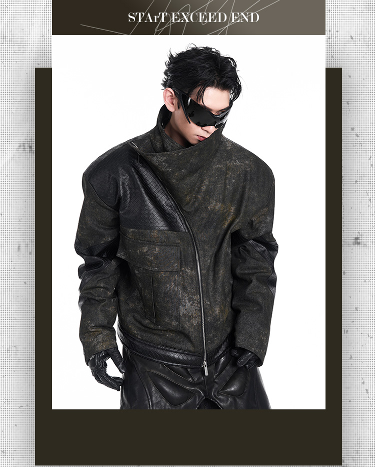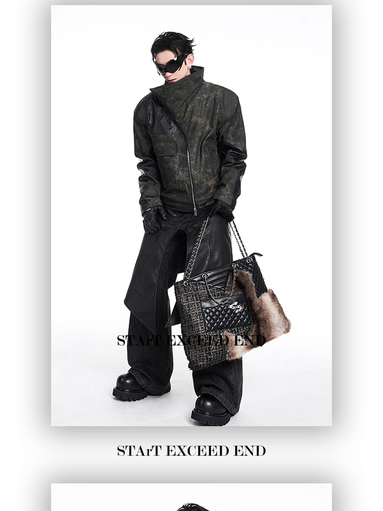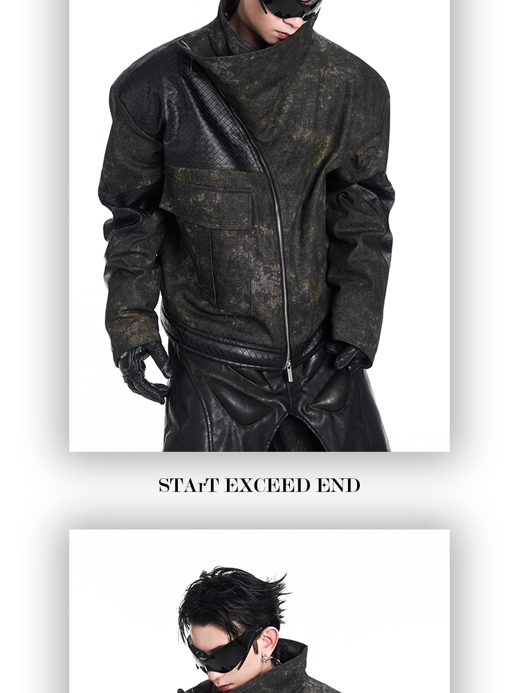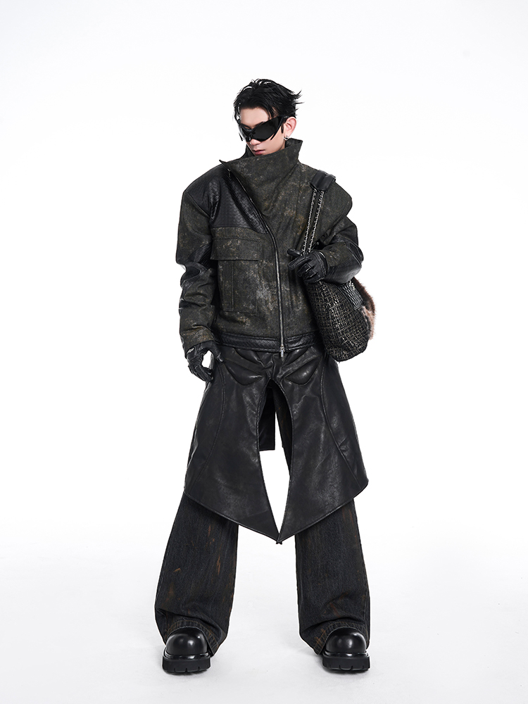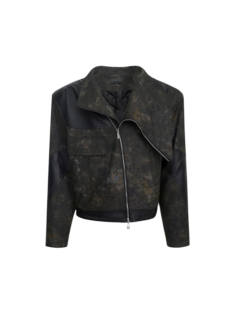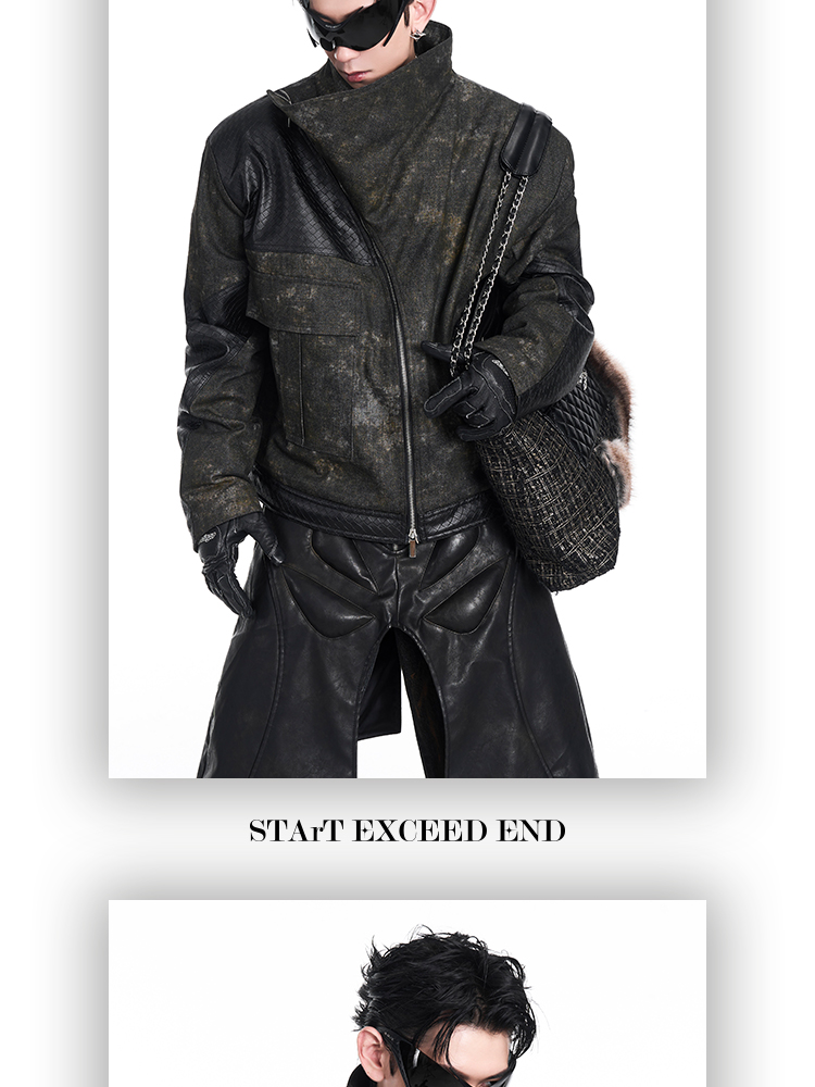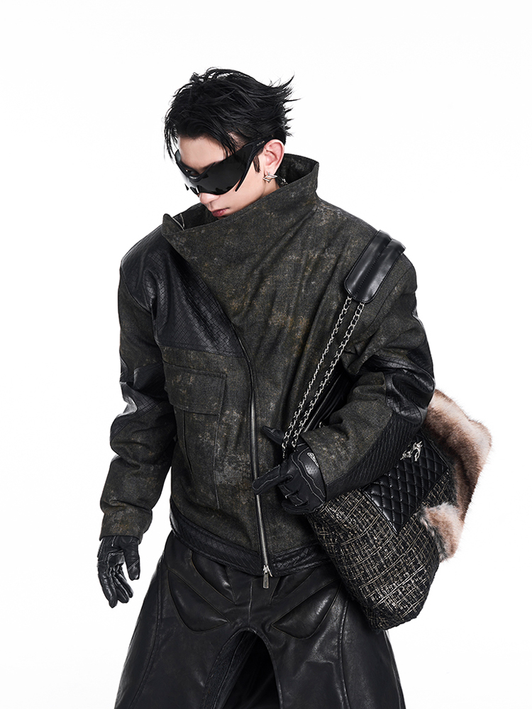Diagonal Zipper Damage Thick Patchwork Jacket WN11721