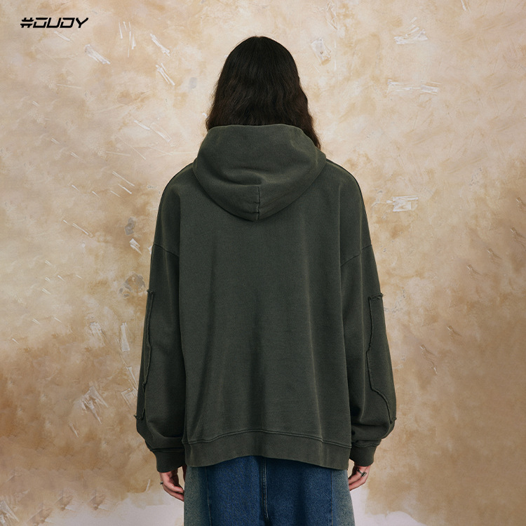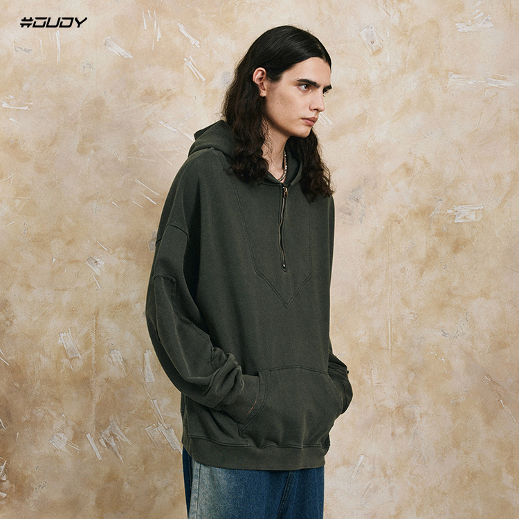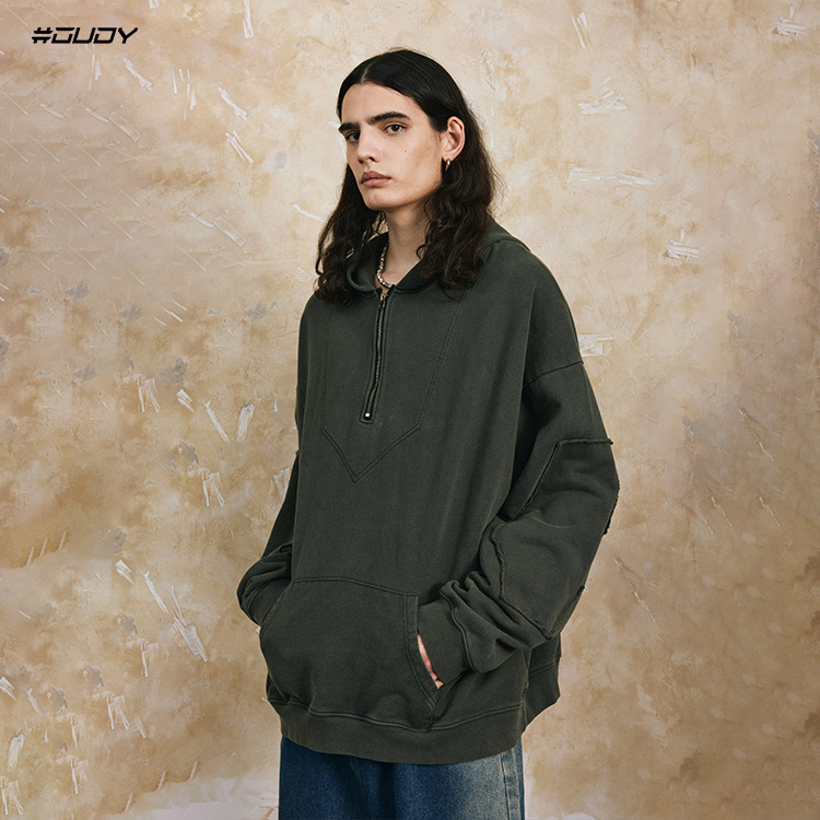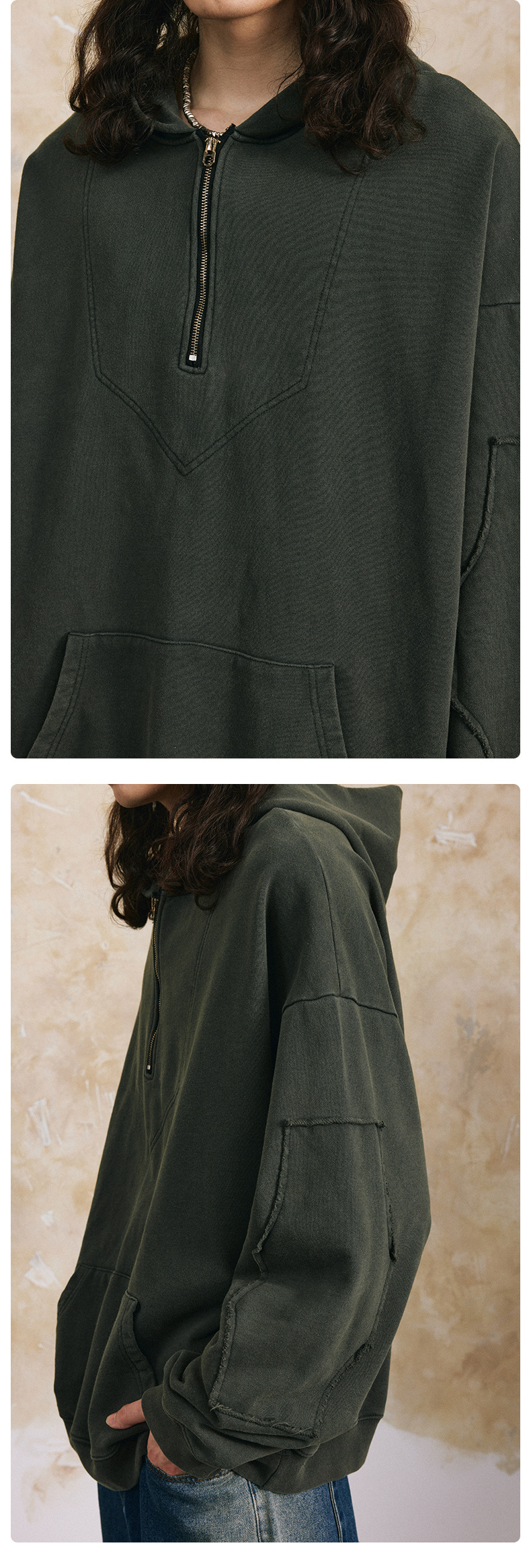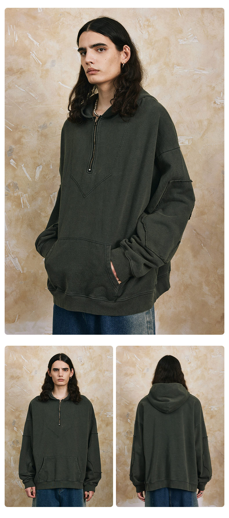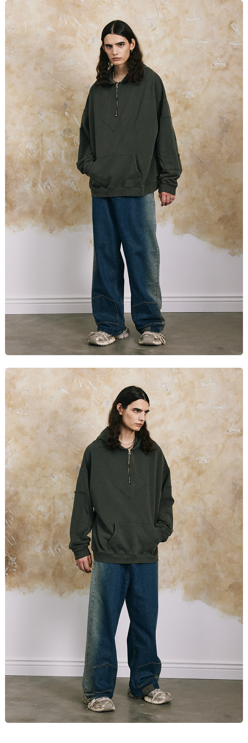 Washed Half Zipper Patchwork Fleece Linning Pullover Hoodie WN12341