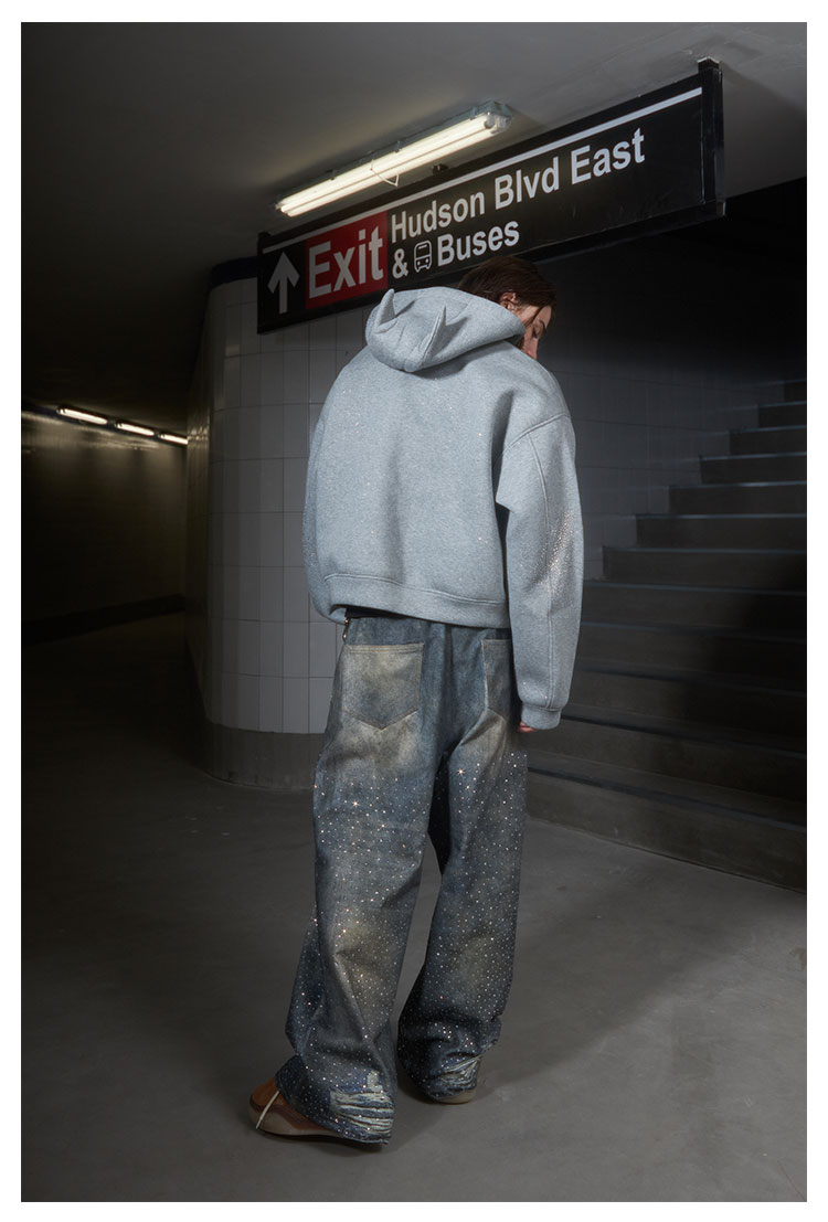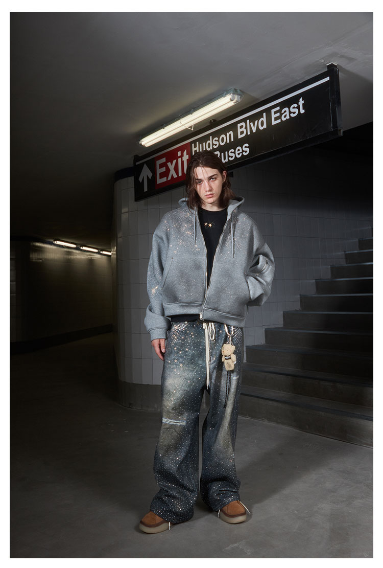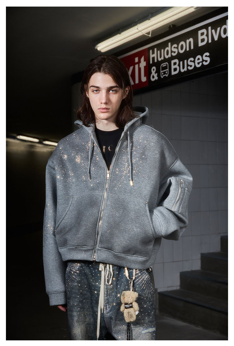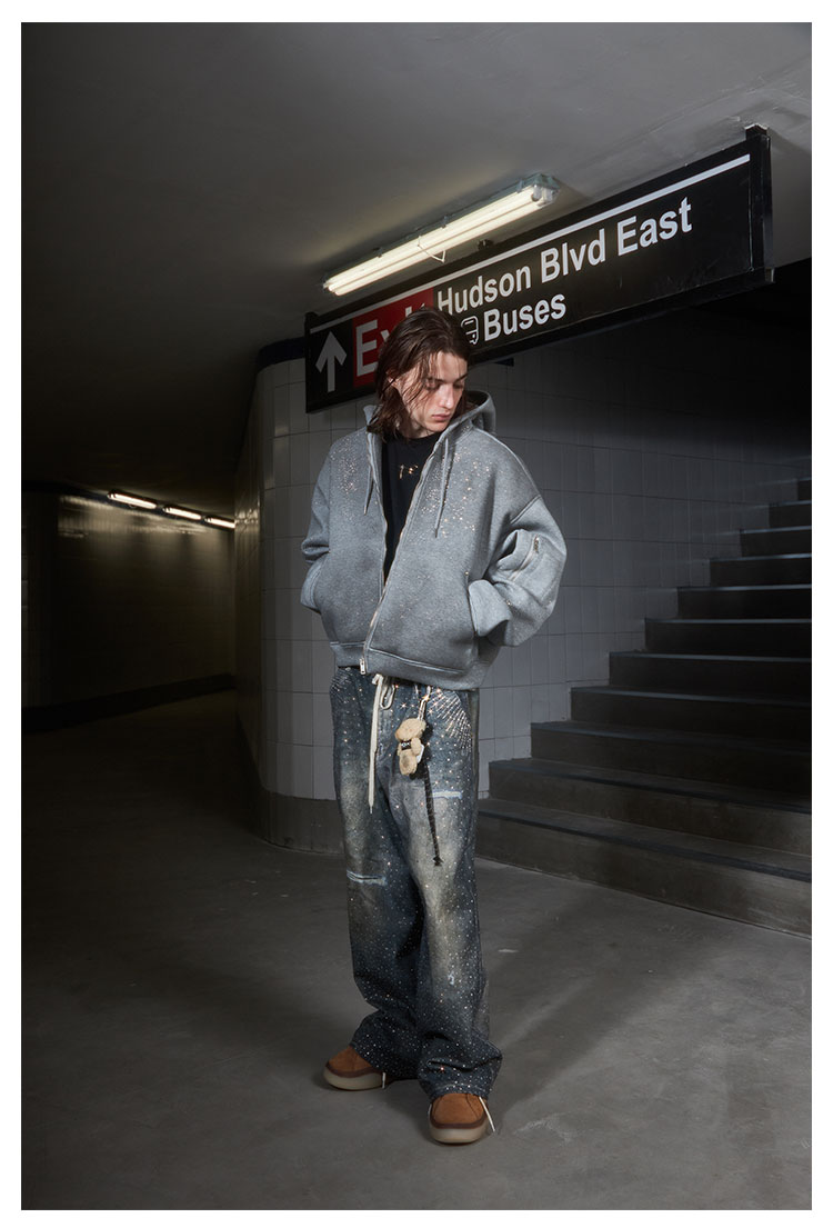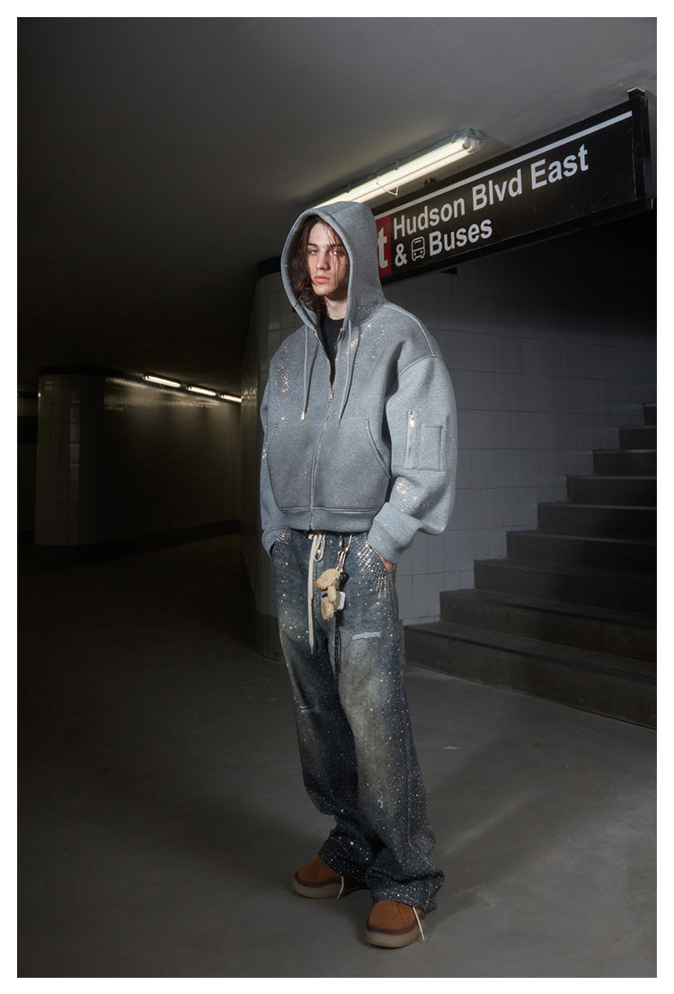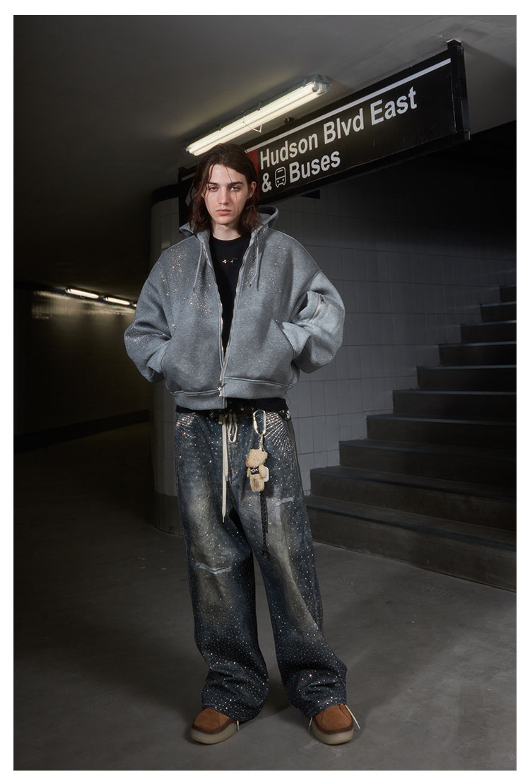 Washed Rhinestone Oversize Zipper Hoodie WN13261