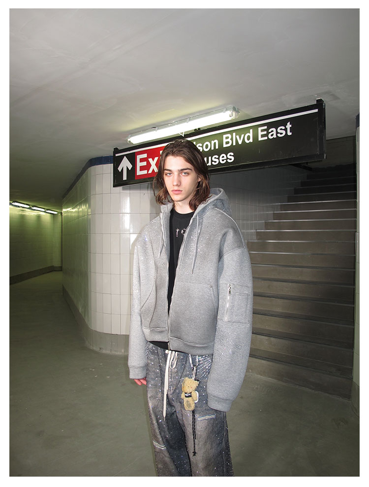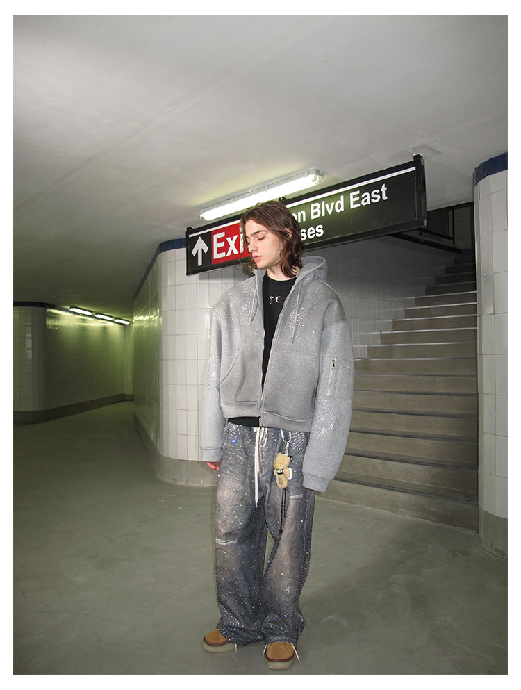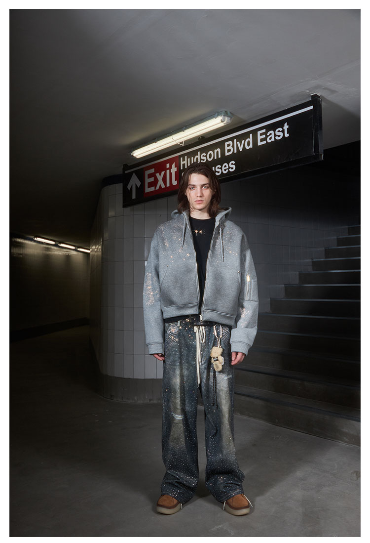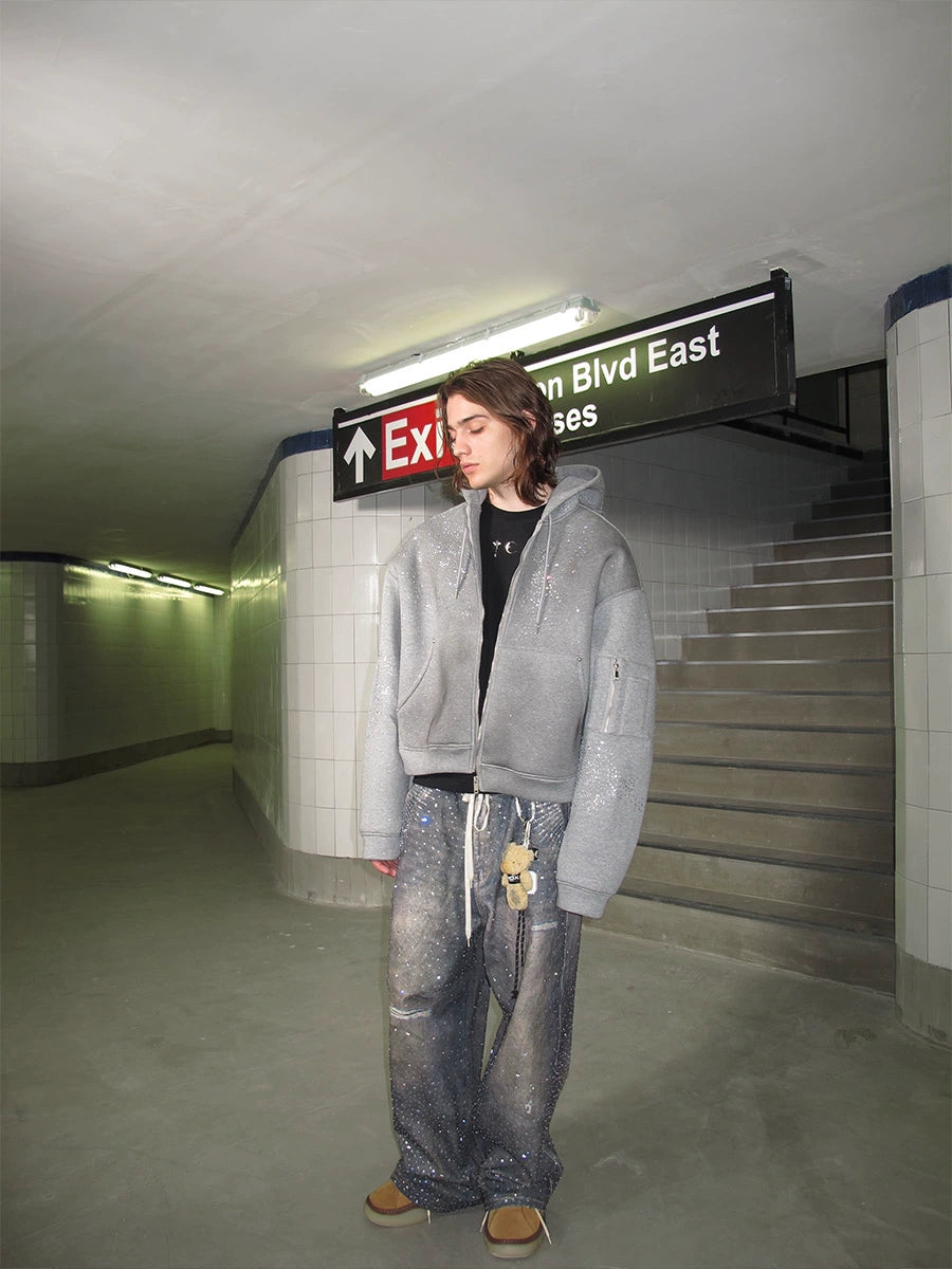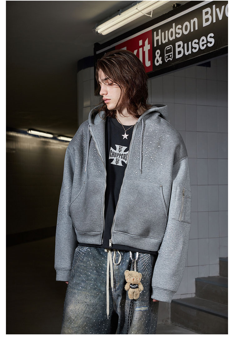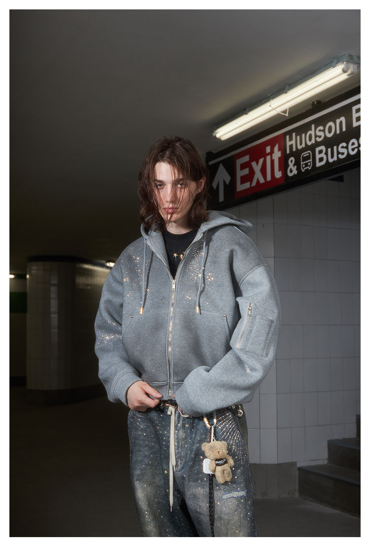Washed Rhinestone Oversize Zipper Hoodie WN13261