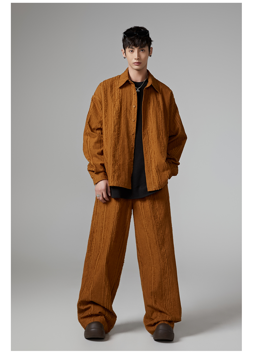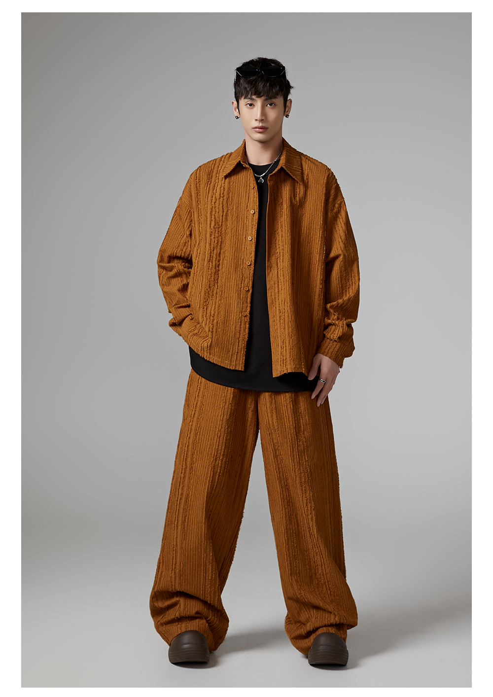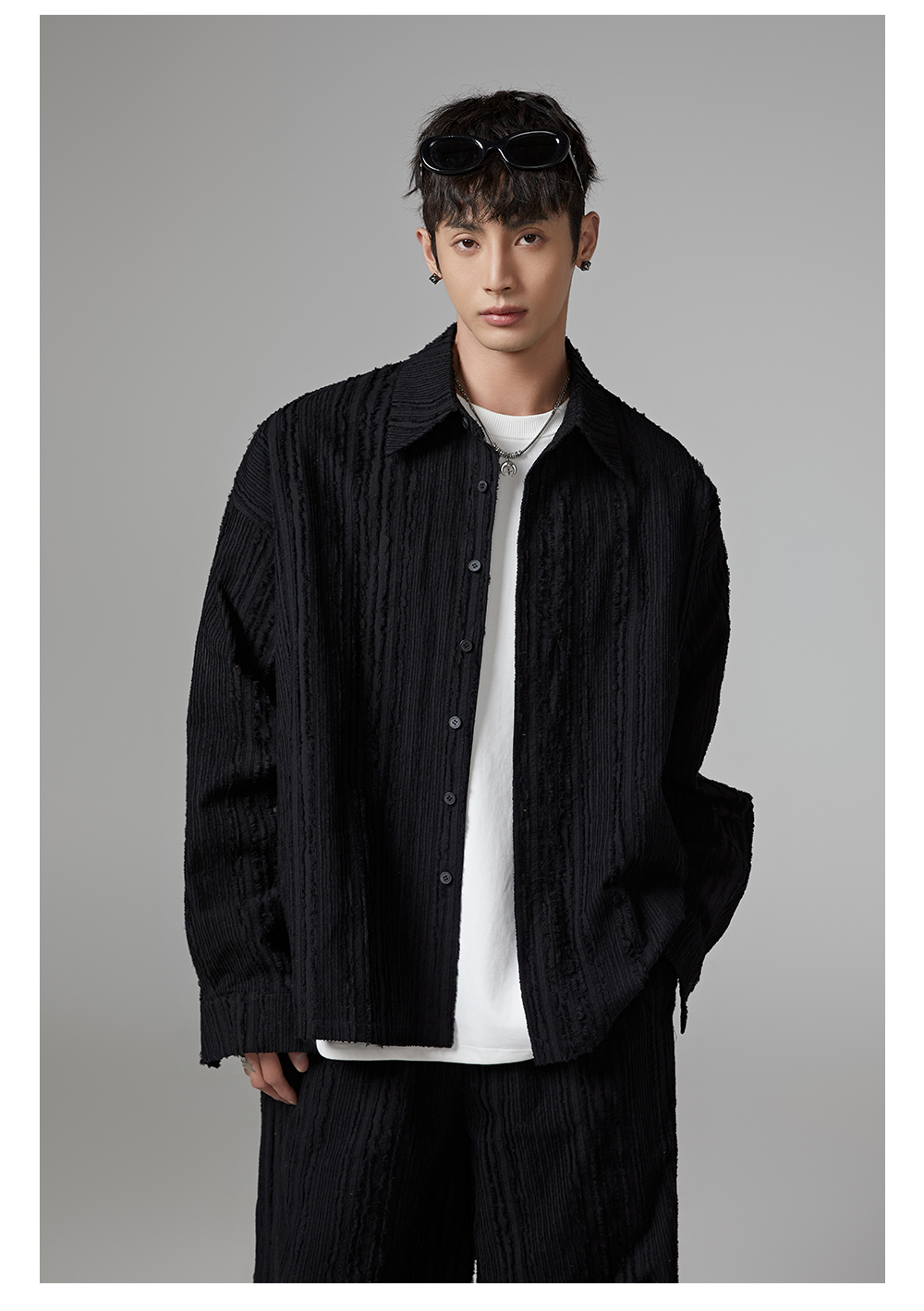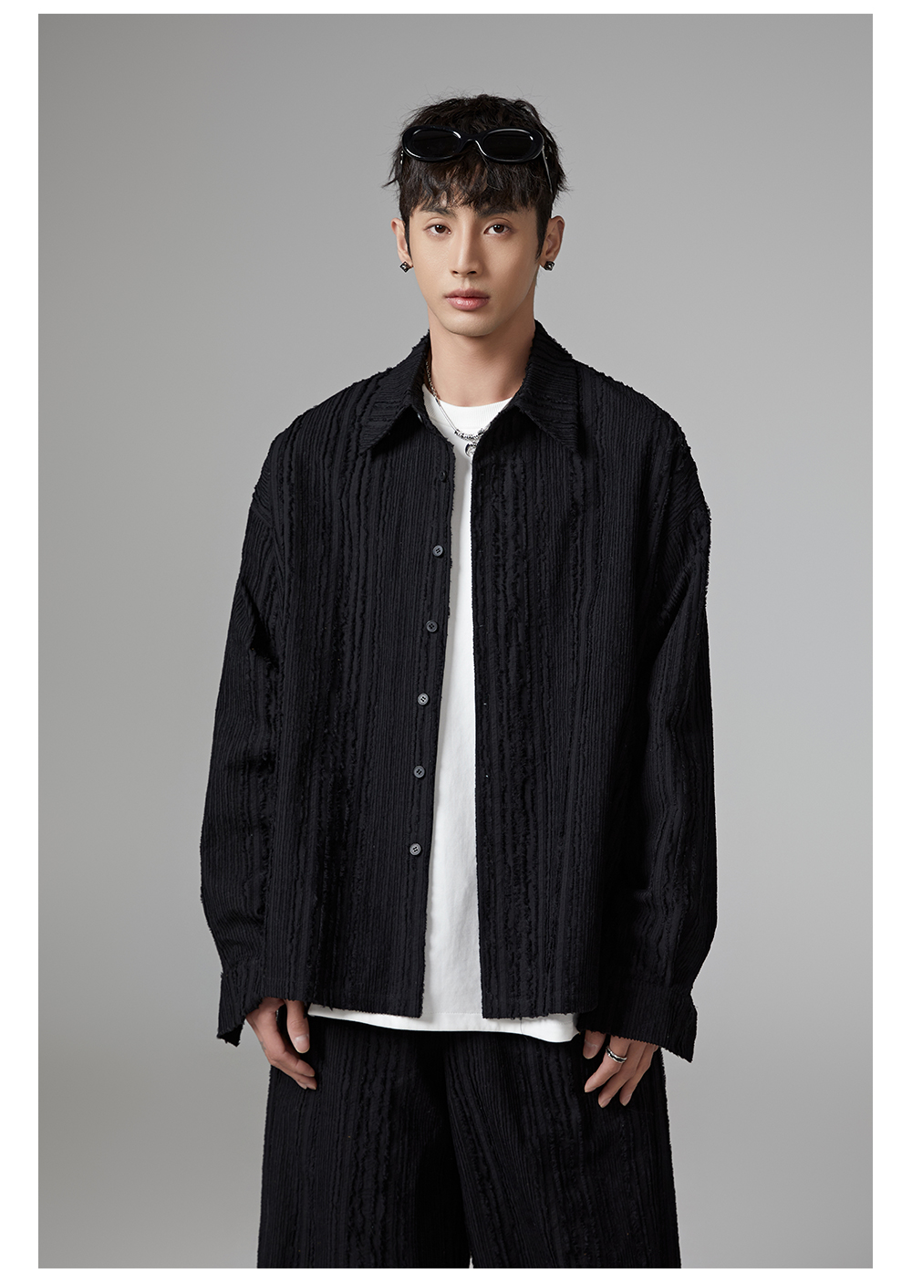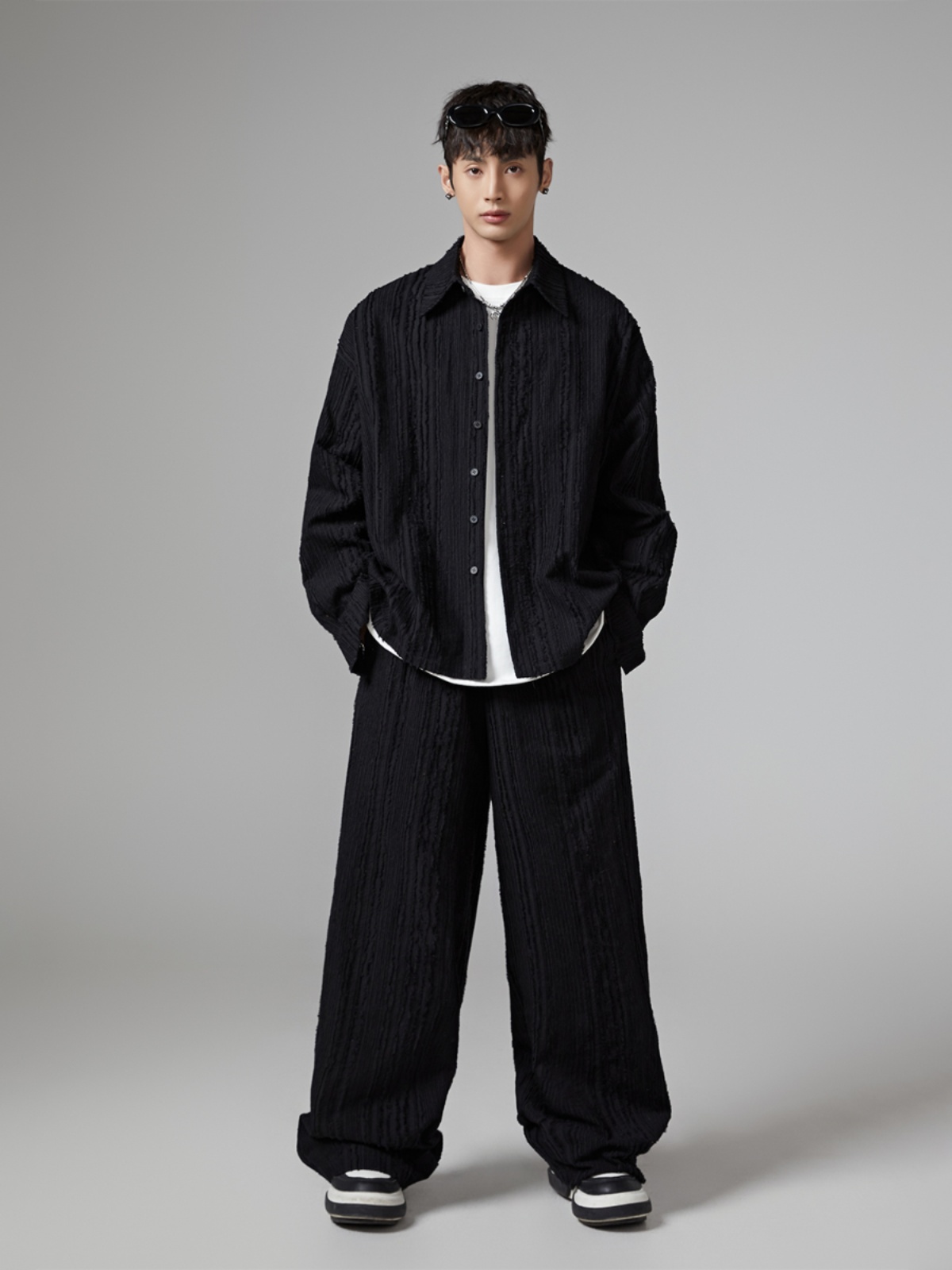 Fringe Pleats Oversize Long Sleeve Shirt & Wide Leg Pants Setup WN13336