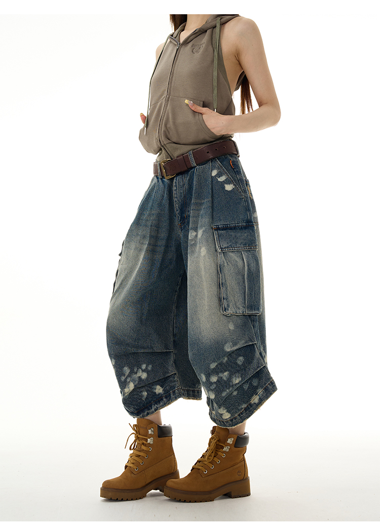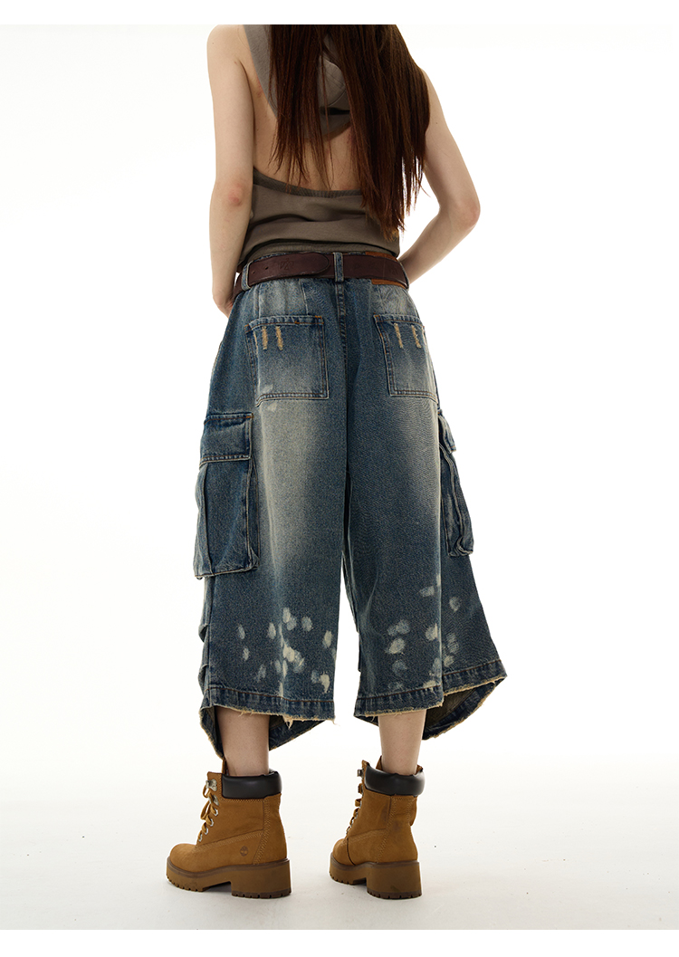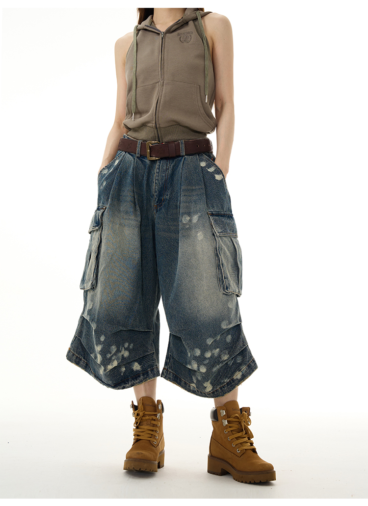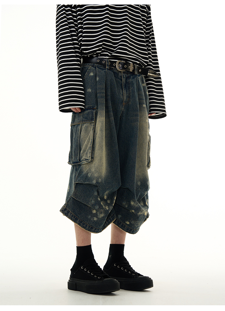 Multi-Pocket Pleats Draped Wide Leg Half Denim Jeans WN16381