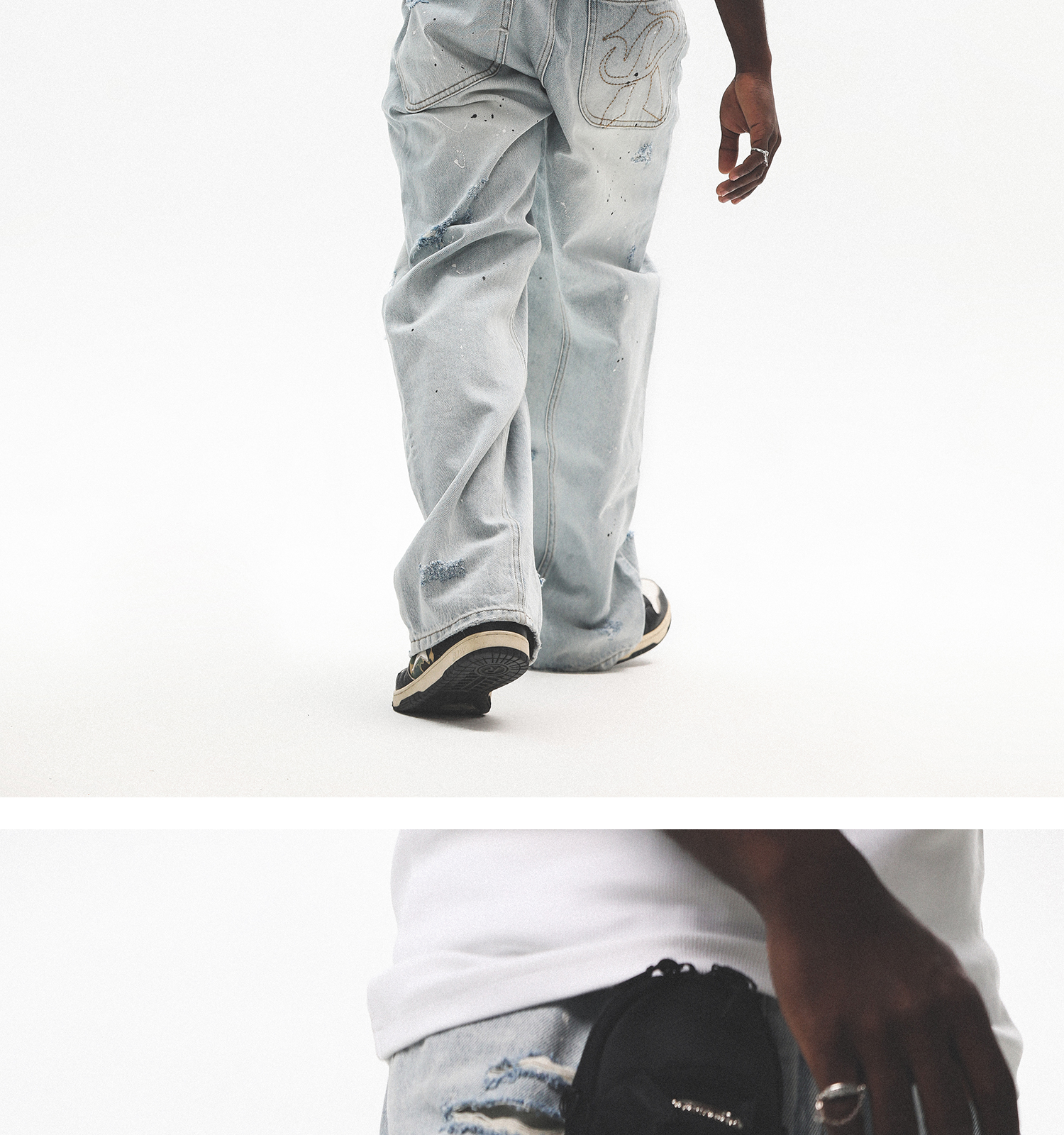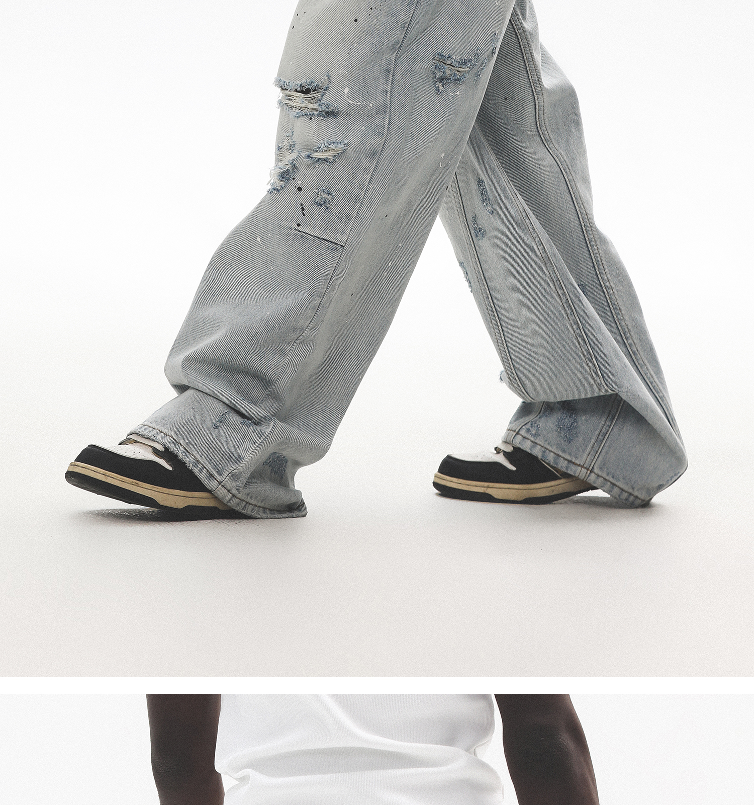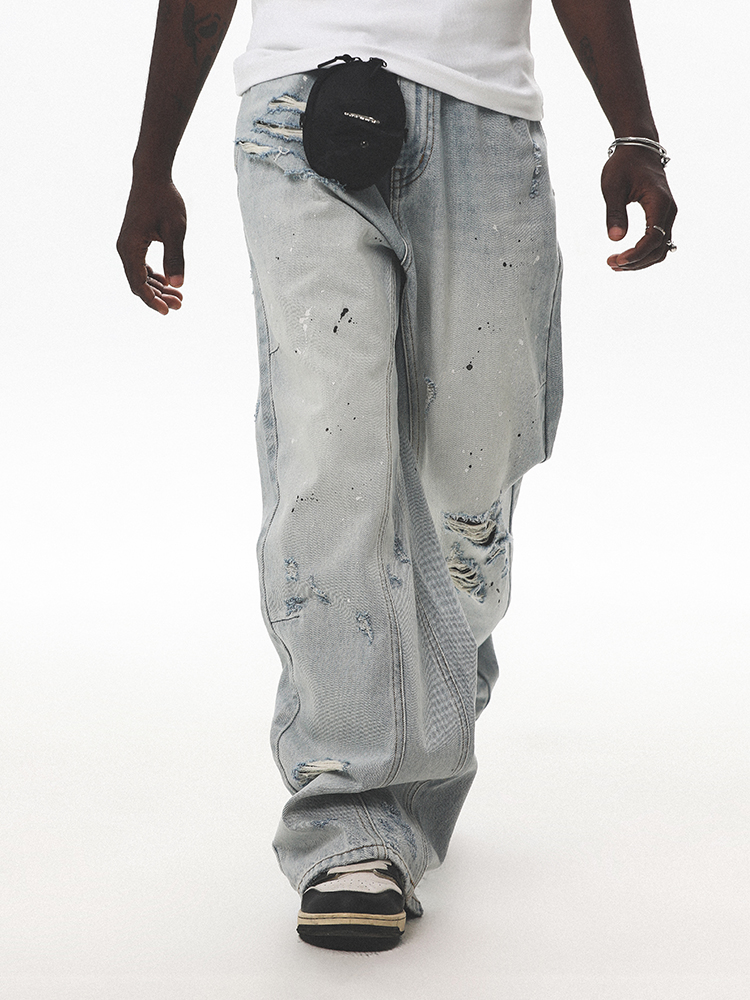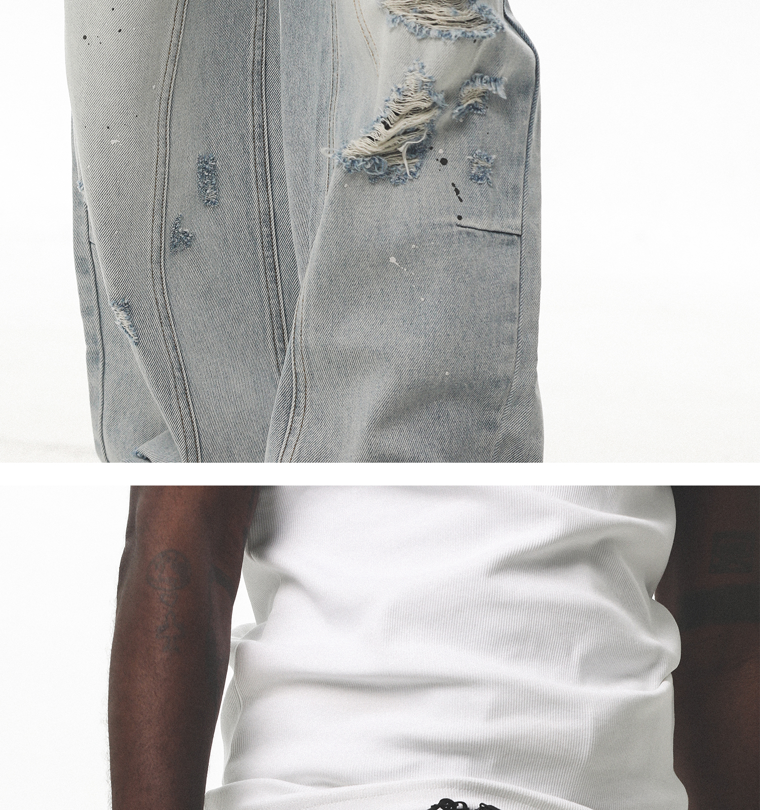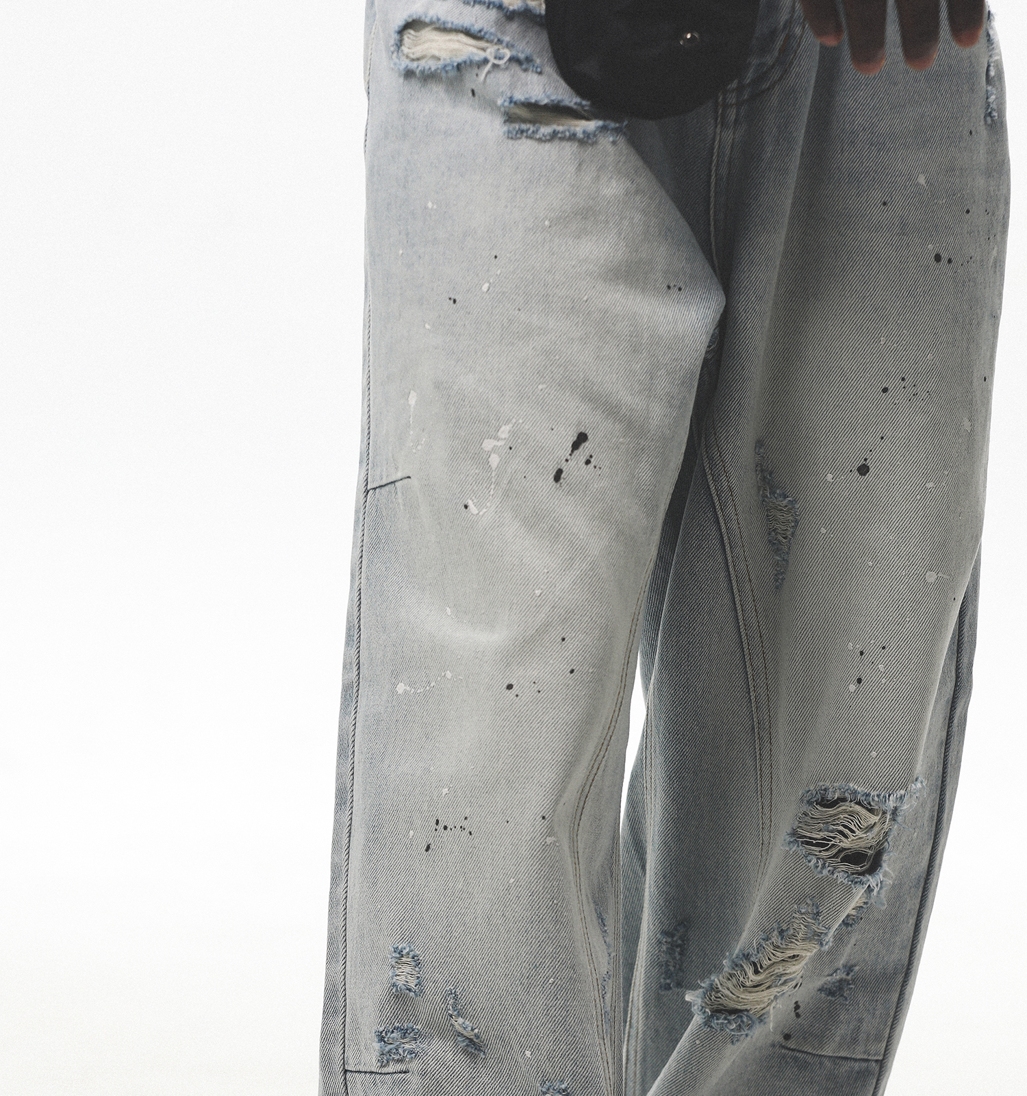 Damage Center Seam Washed Wide Leg Denim Jeans WN17791