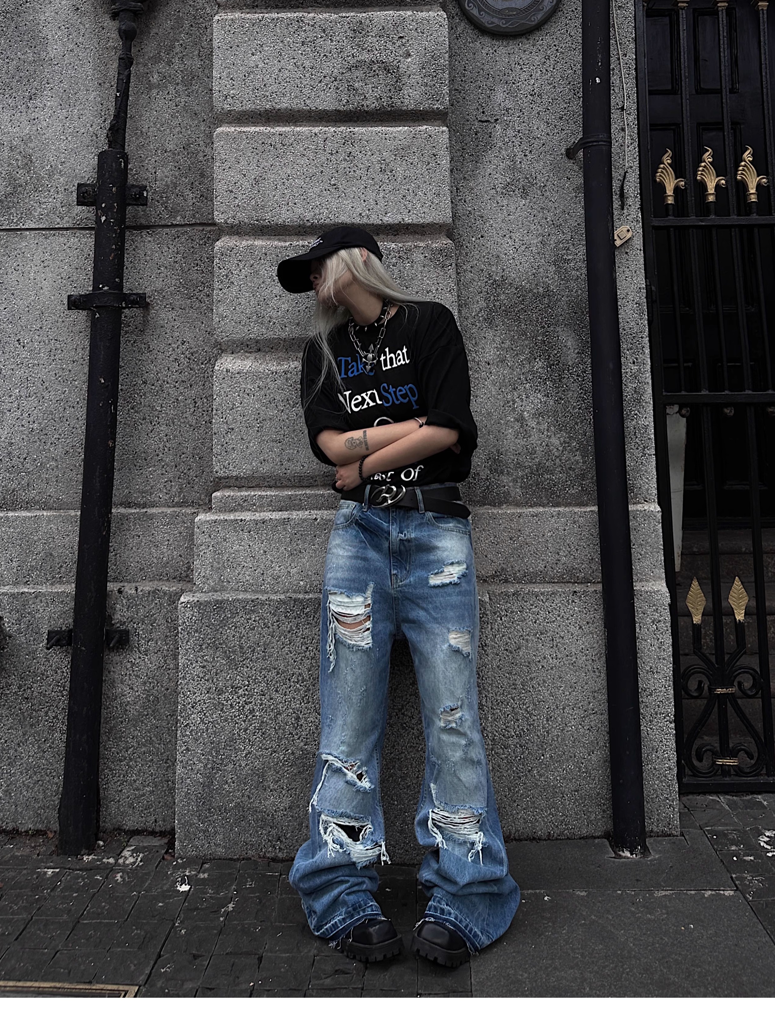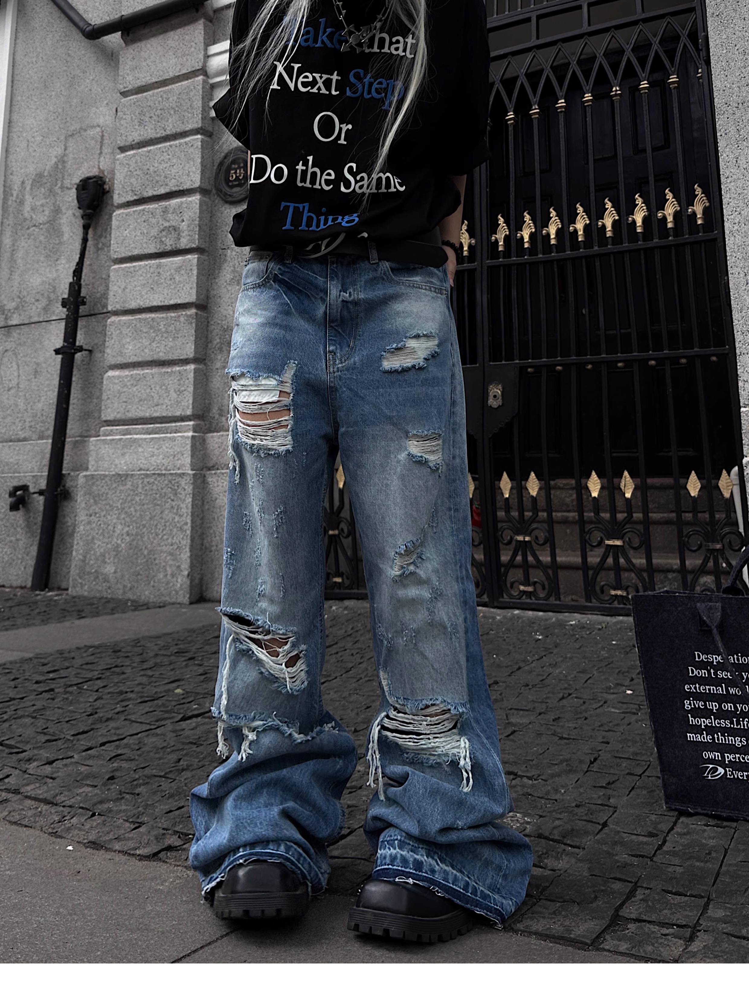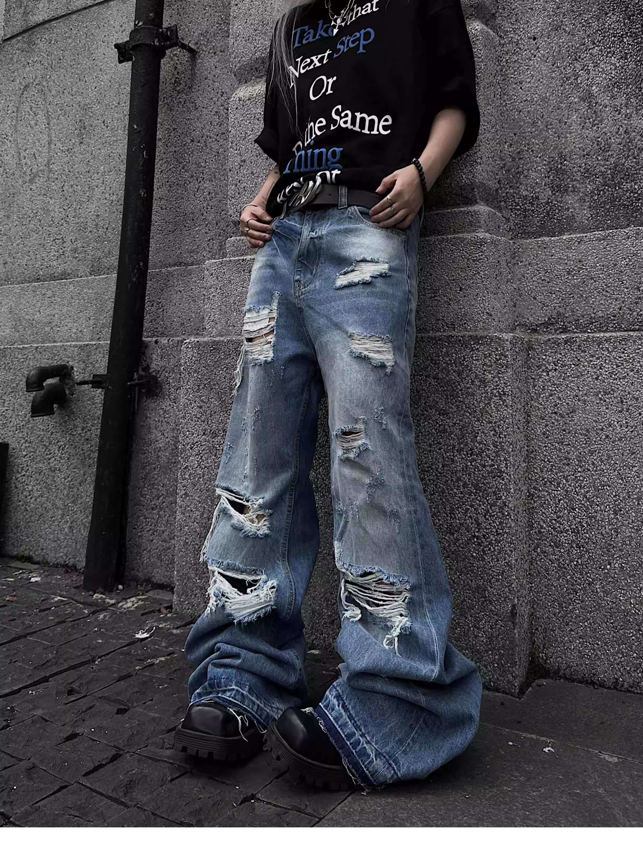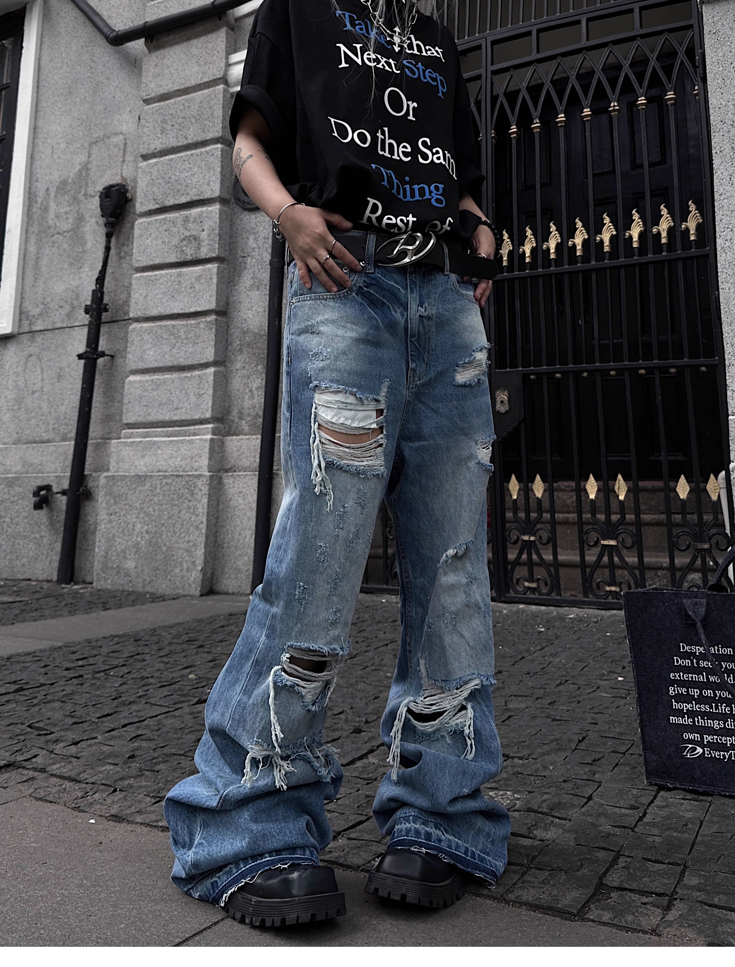 Washed Damage Fringe Whisker Stacked Flare Denim Jeans WN18146