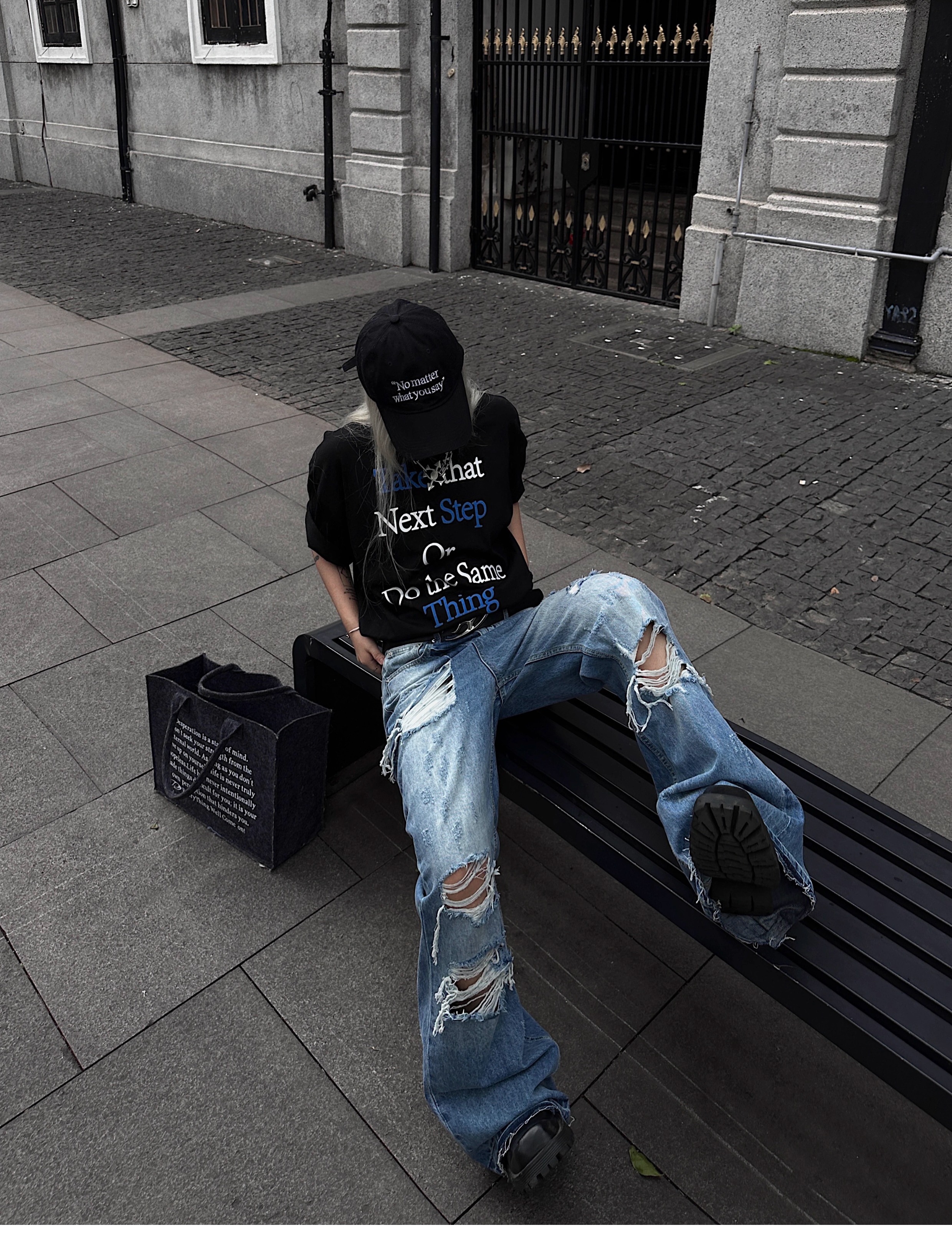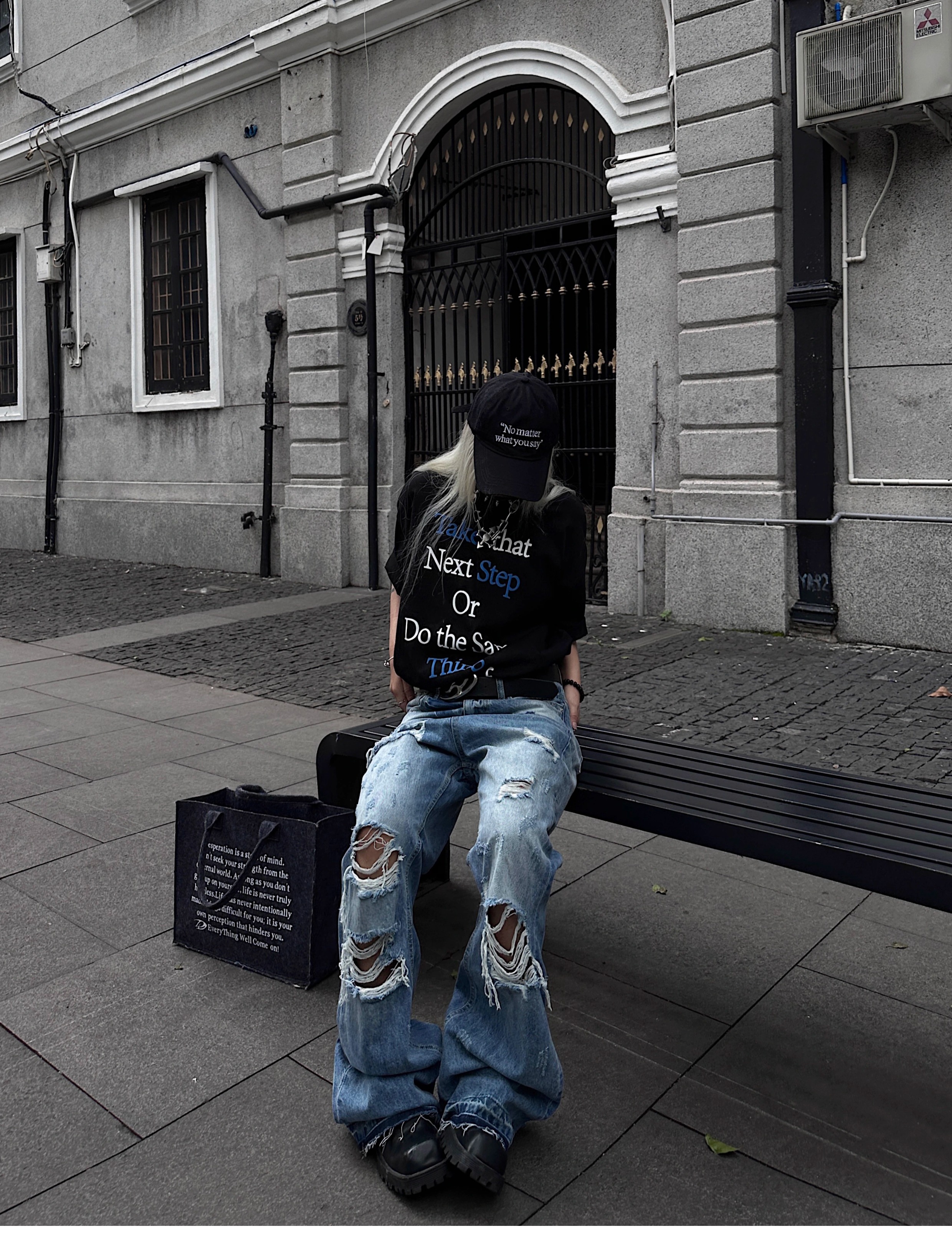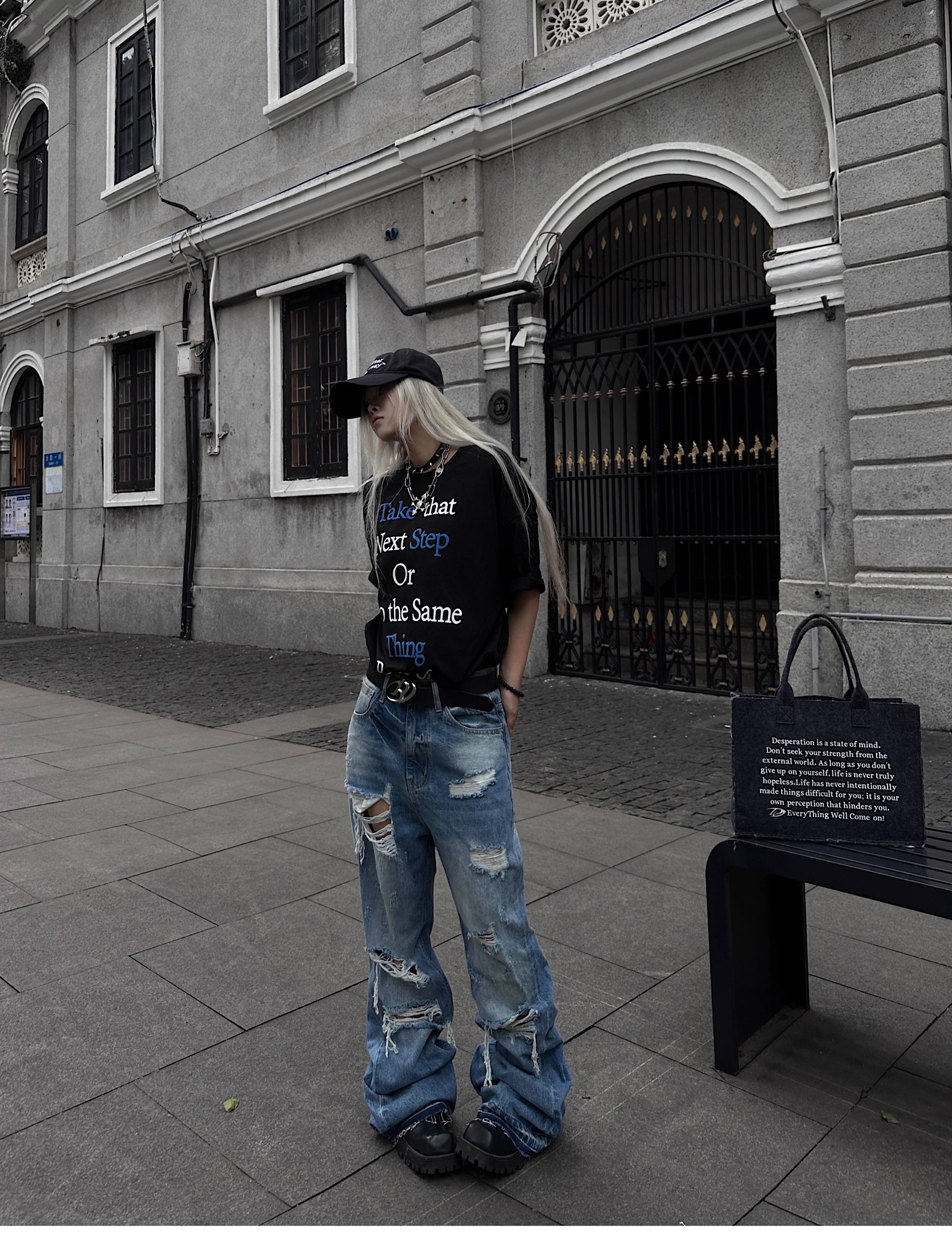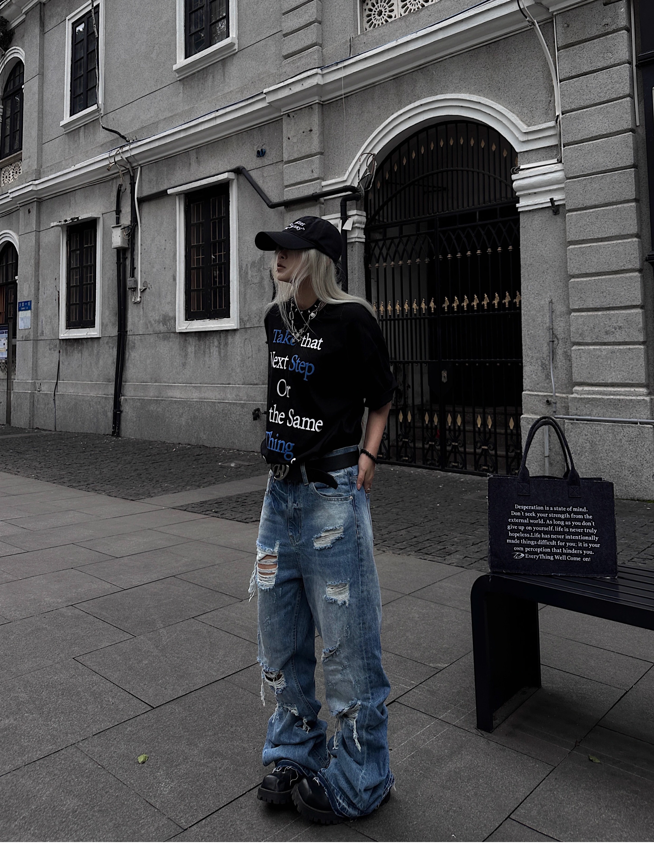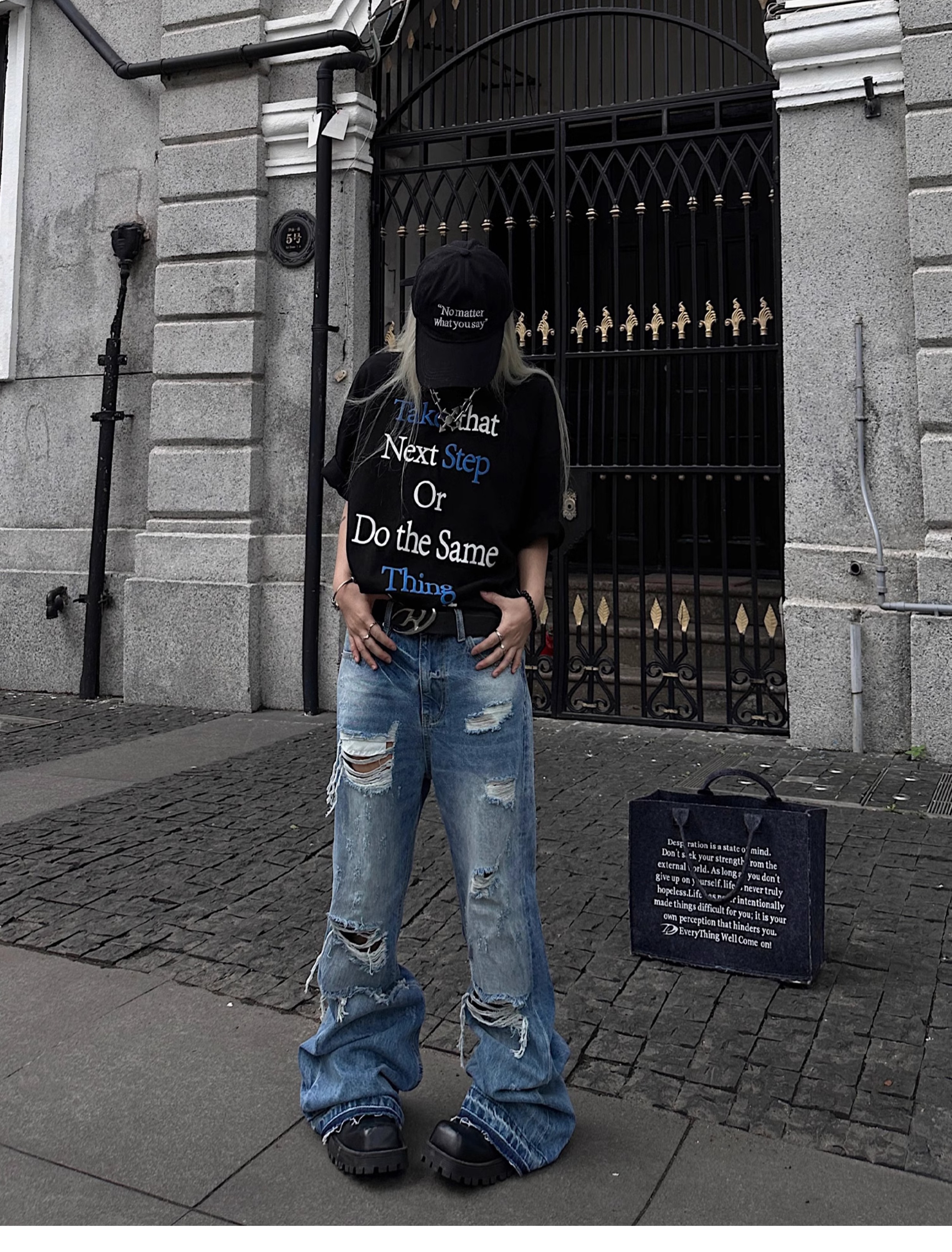 Washed Damage Fringe Whisker Stacked Flare Denim Jeans WN18146
