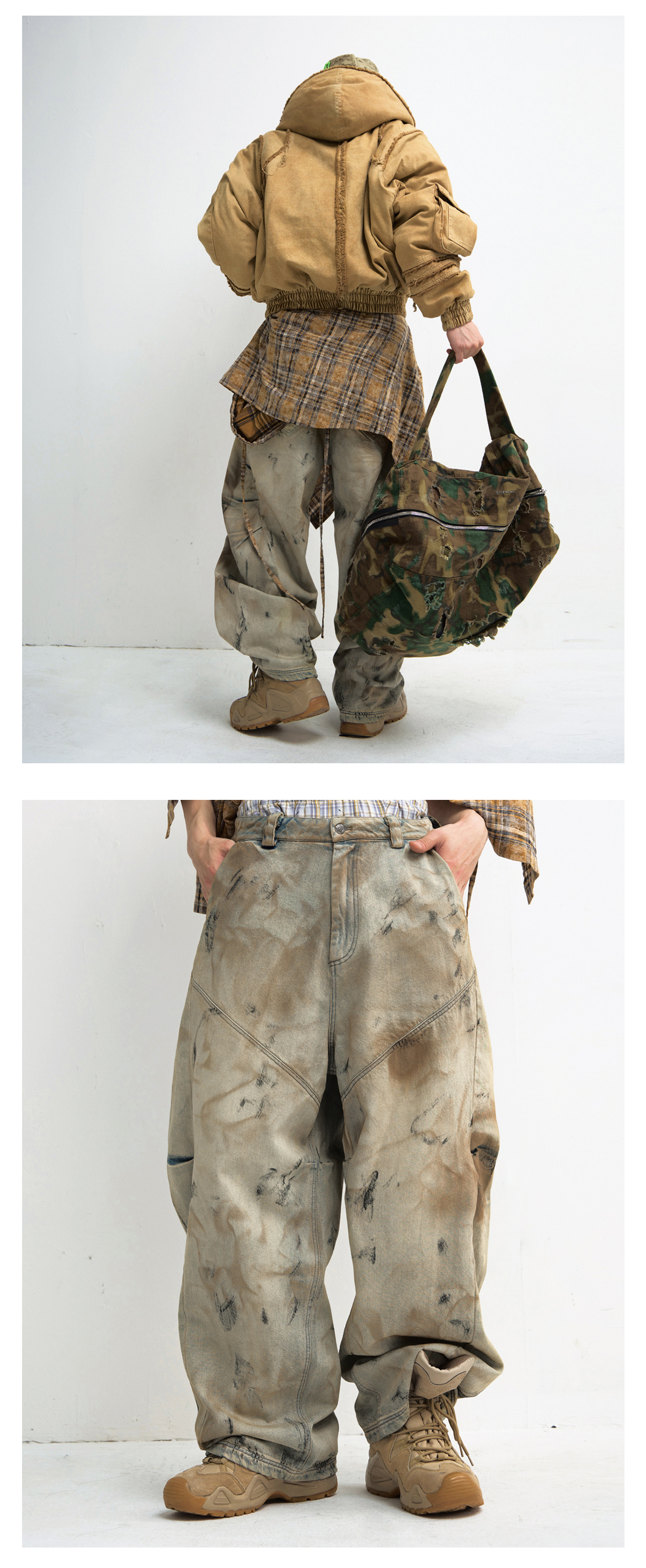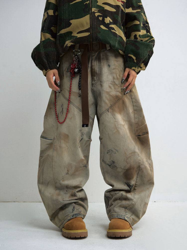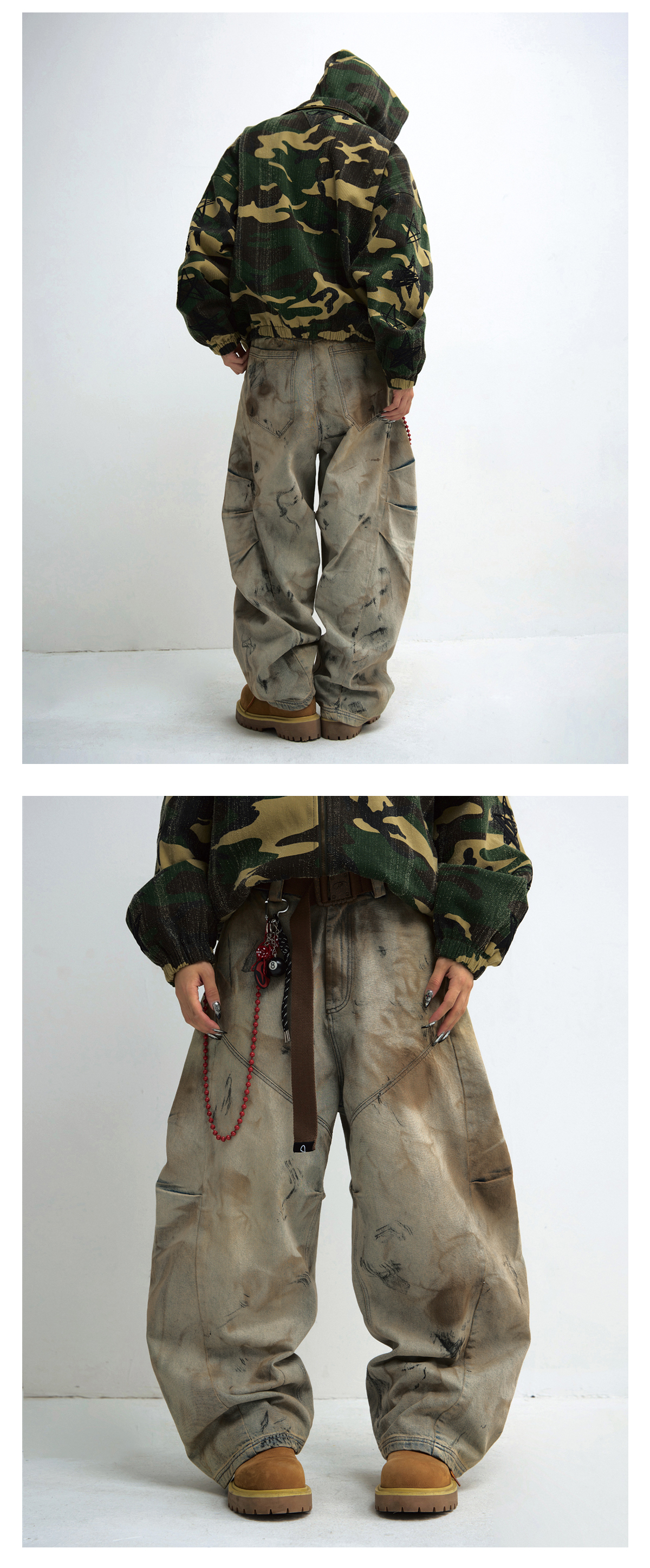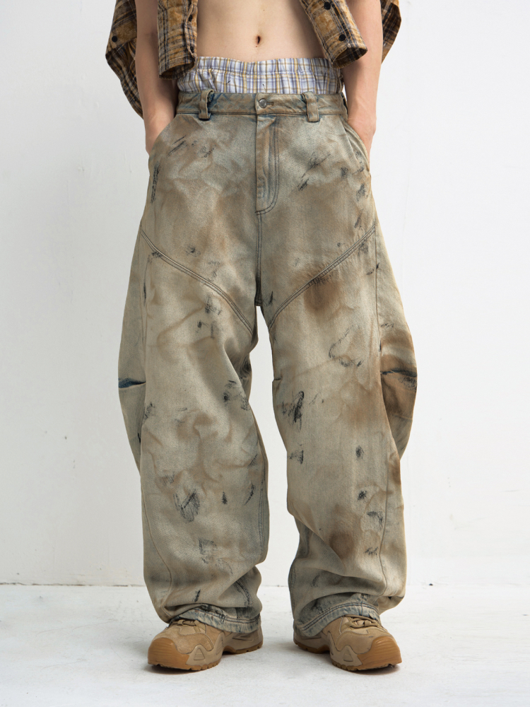 Mud Dye Heavy Wash Wide Leg Curved Hem Denim Jeans WN18178