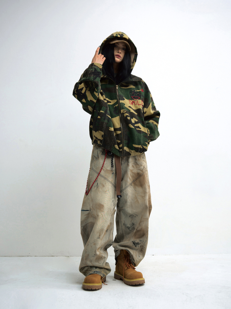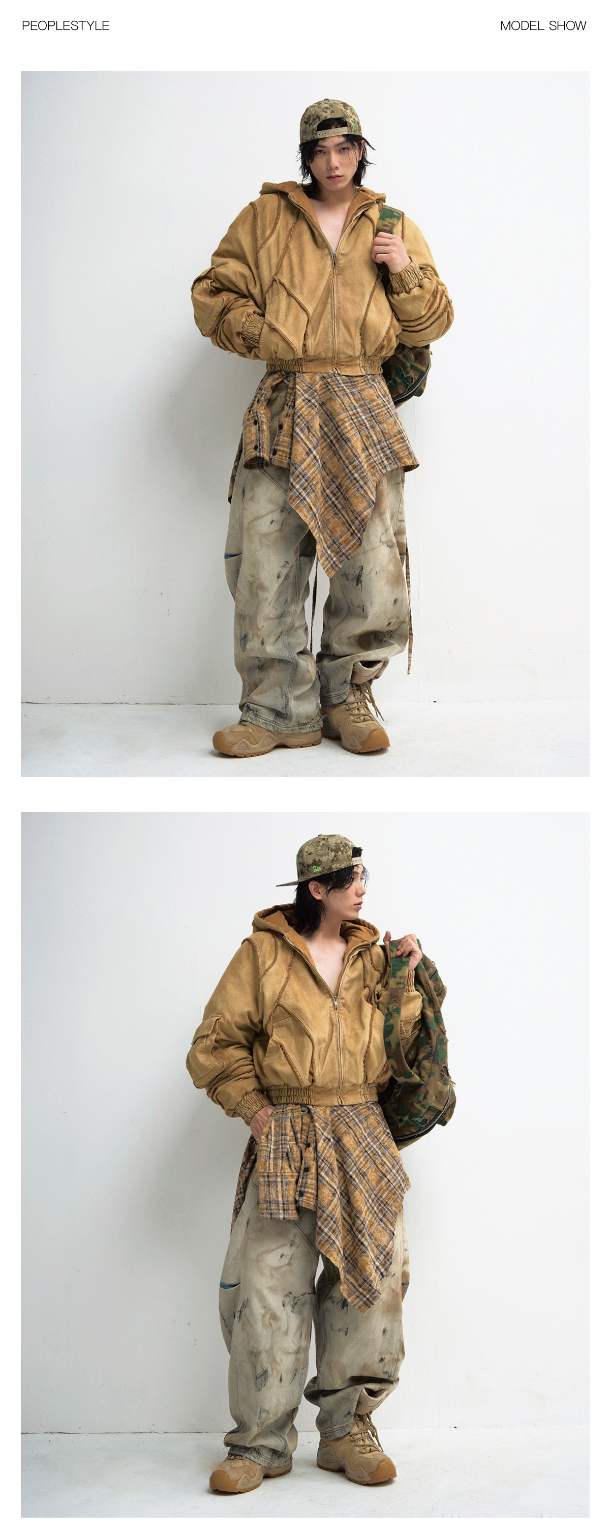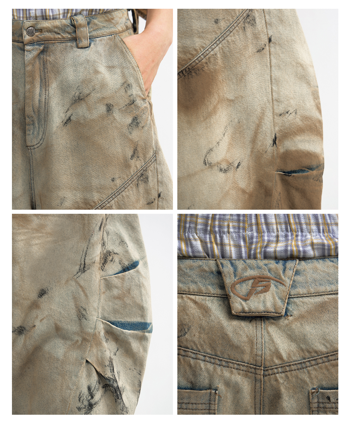 Mud Dye Heavy Wash Wide Leg Curved Hem Denim Jeans WN18178