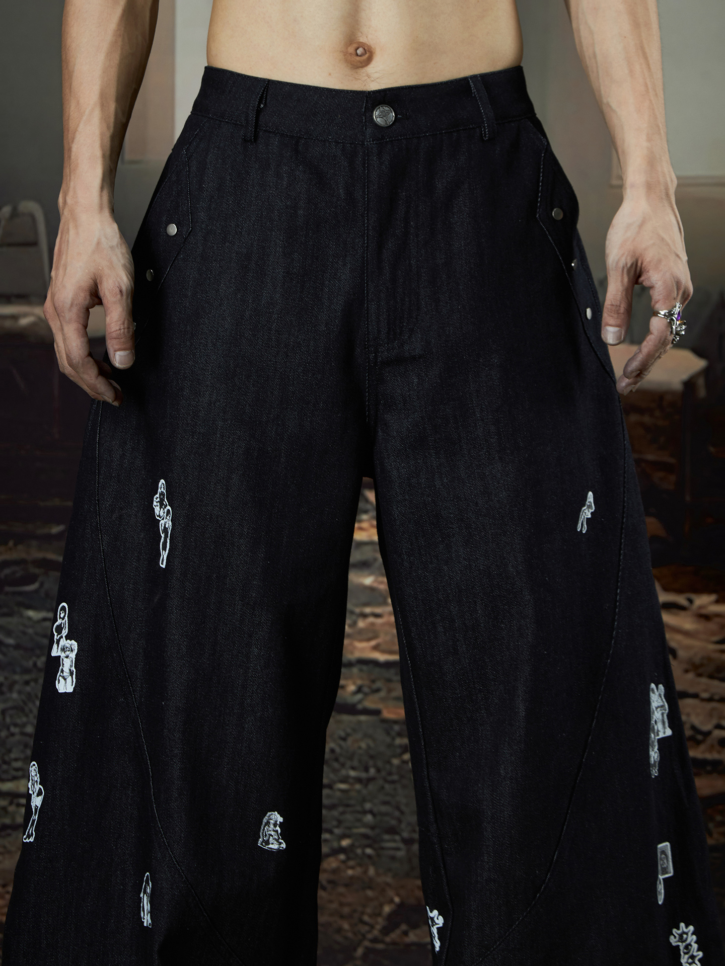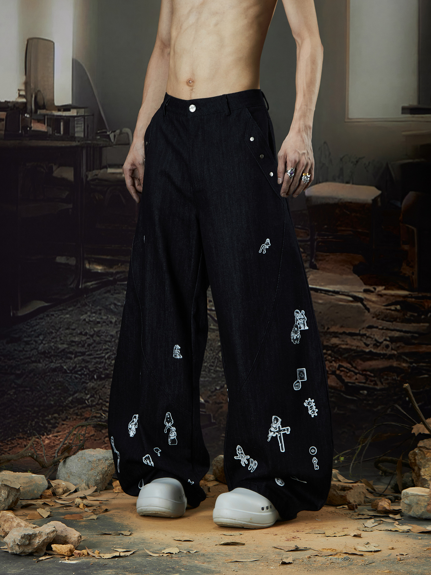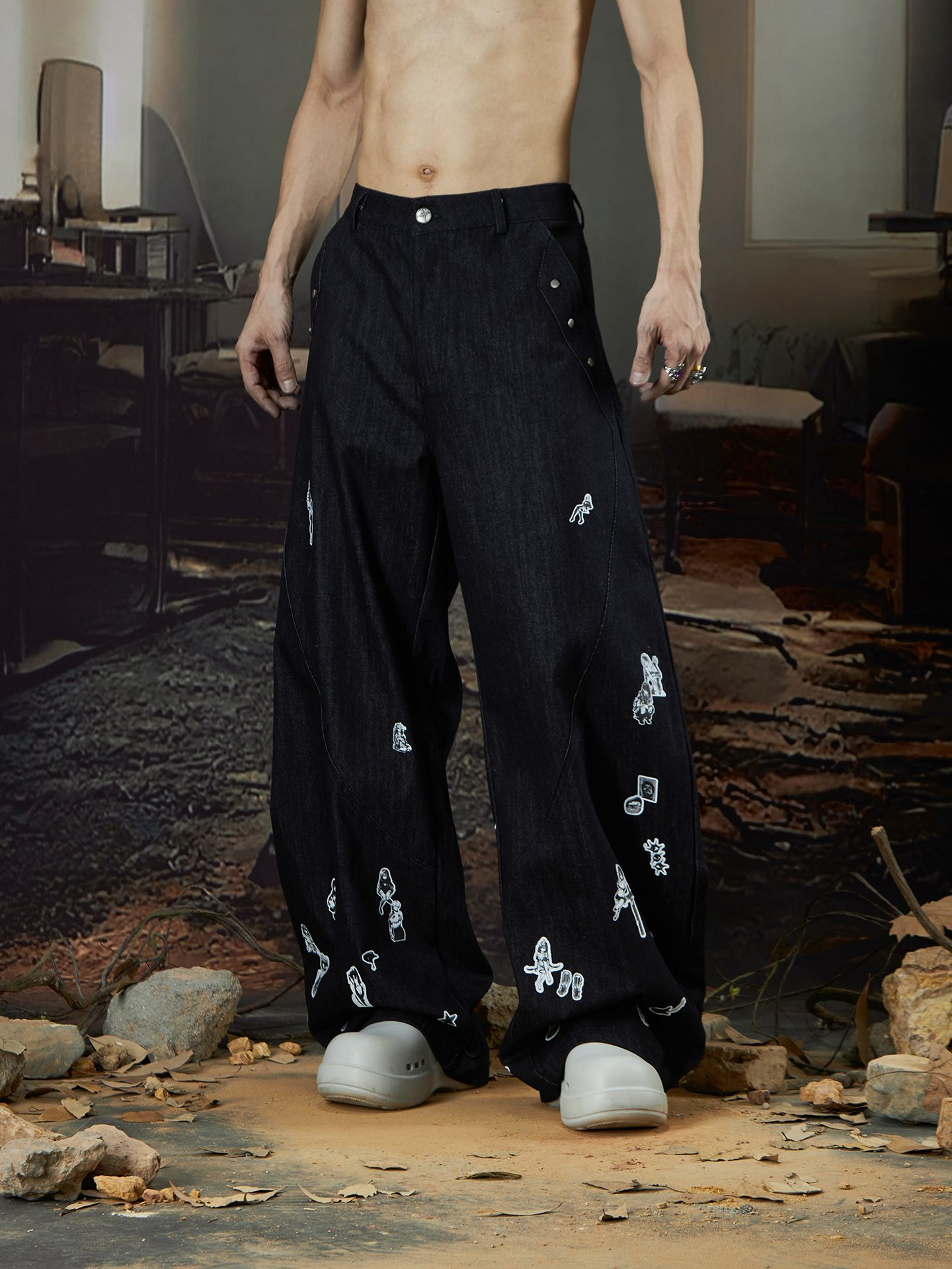 Fun Patch Embroidery Wide Leg Denim Jeans WN18424