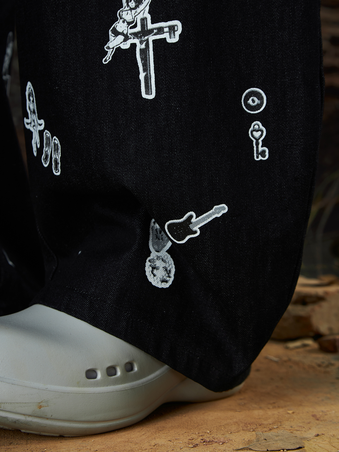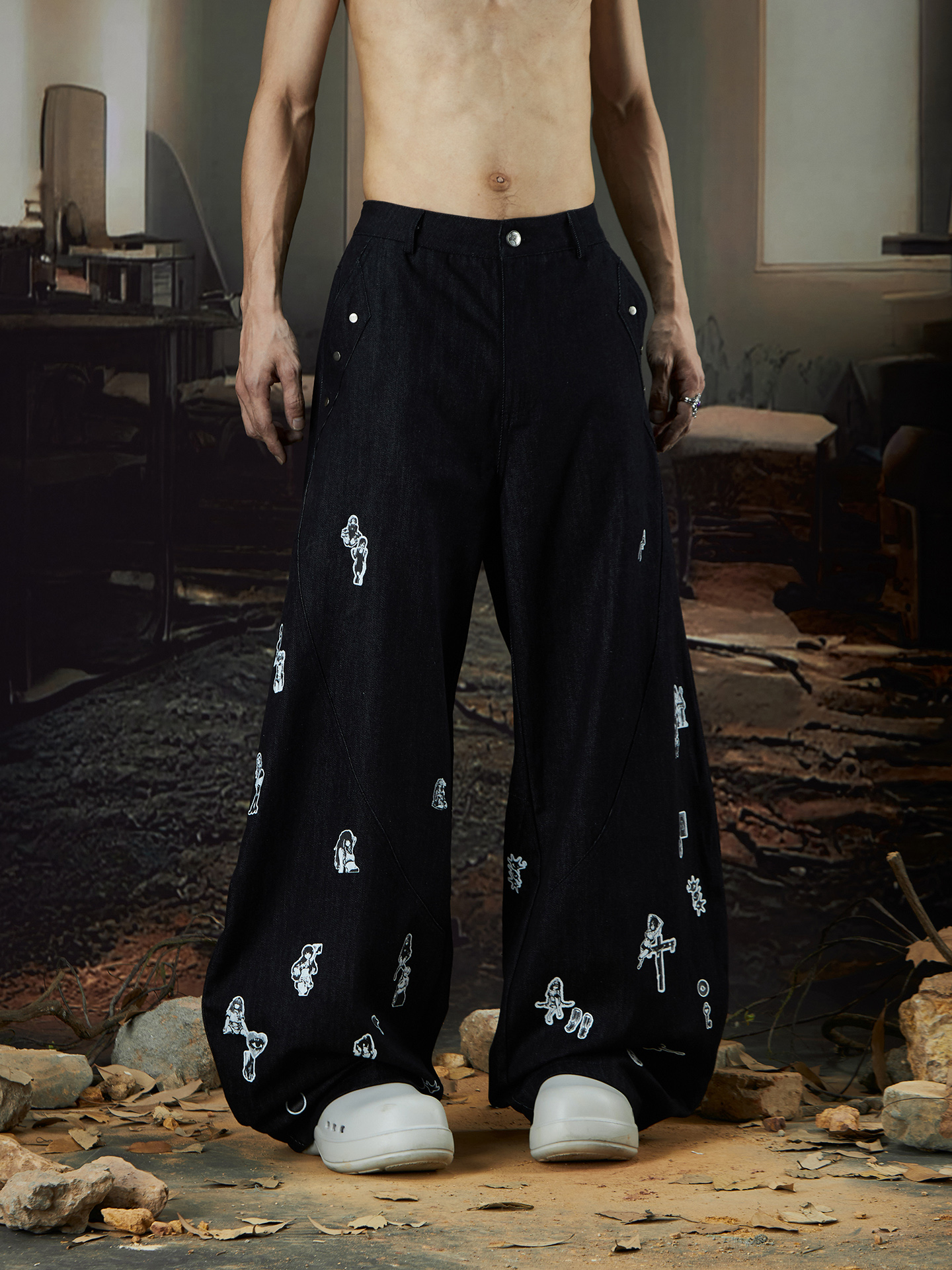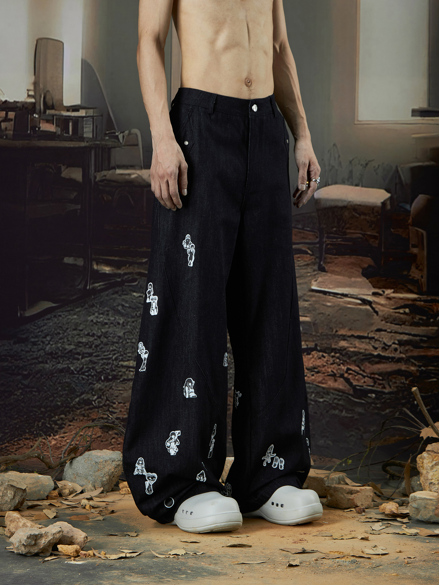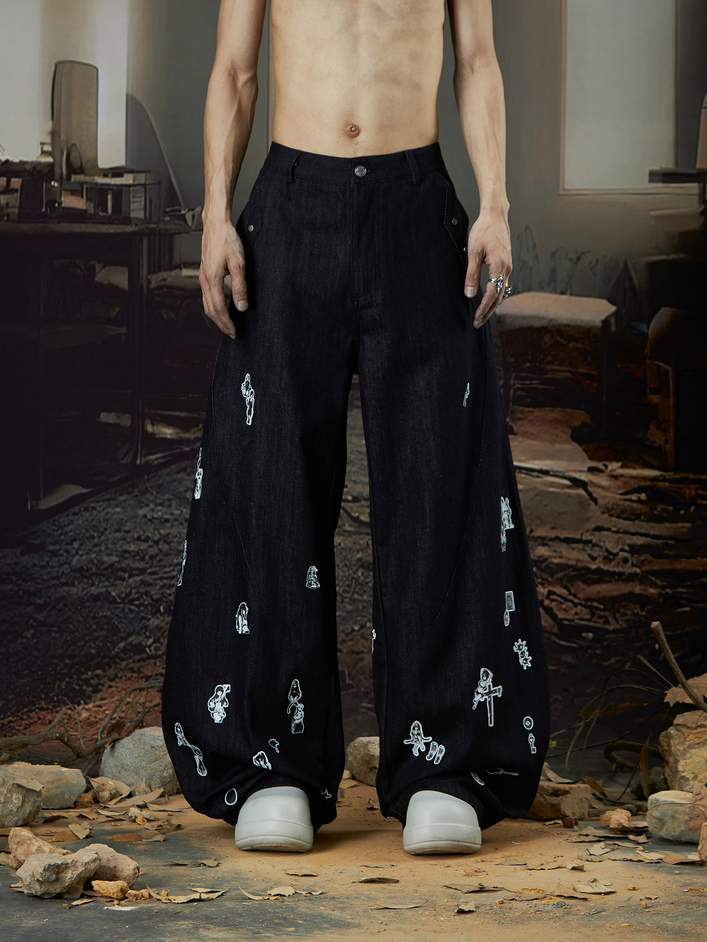 Fun Patch Embroidery Wide Leg Denim Jeans WN18424