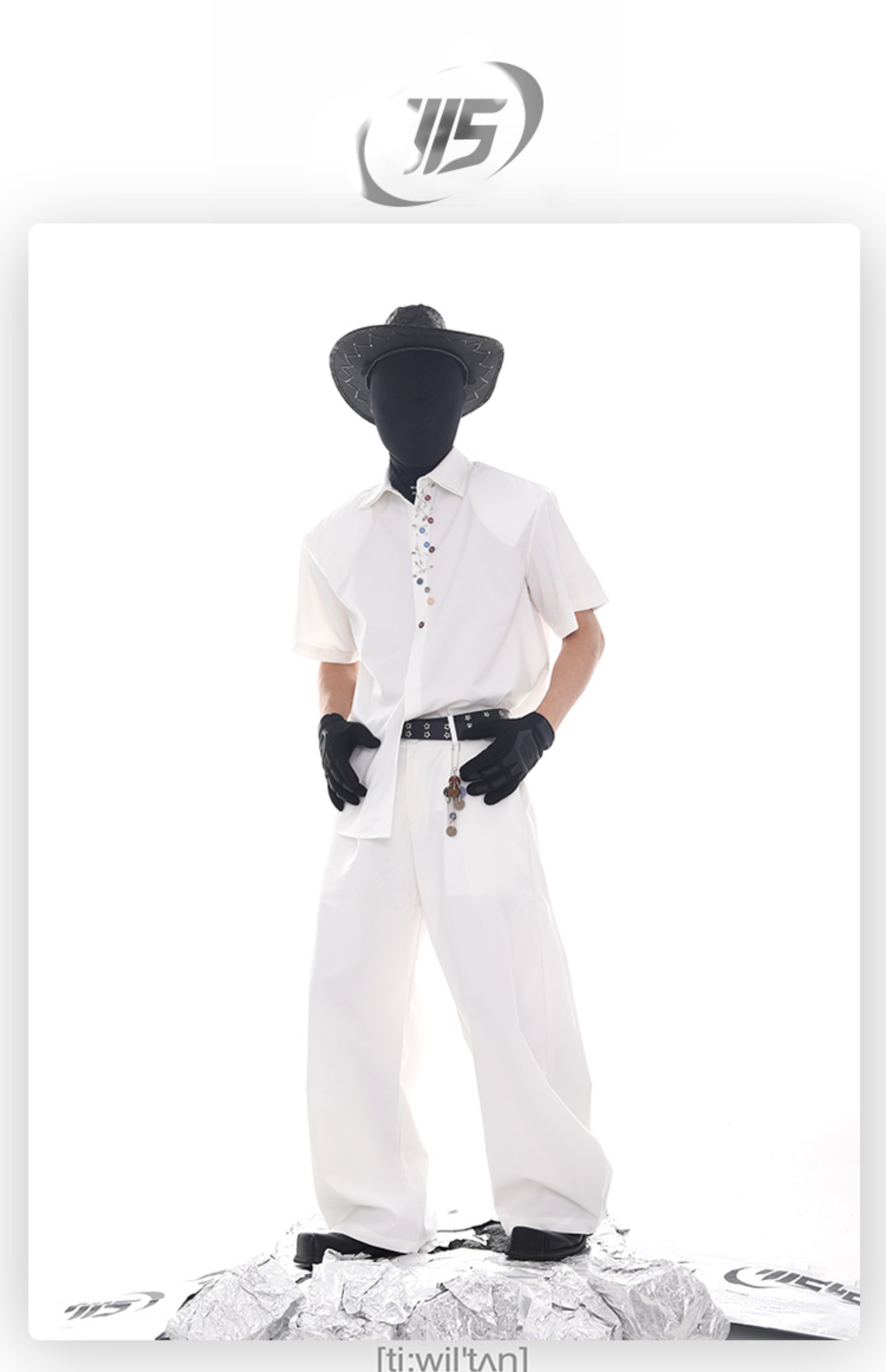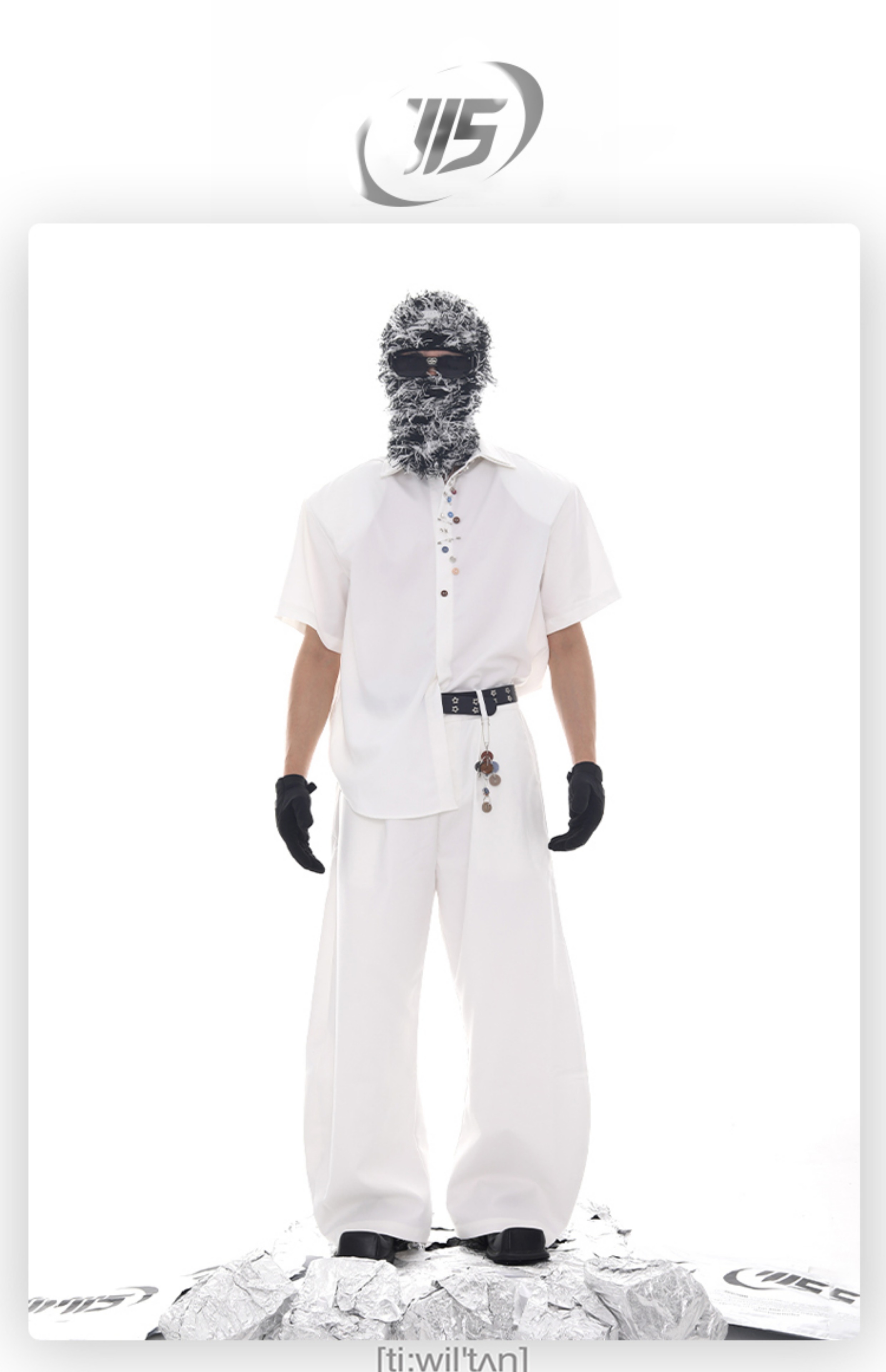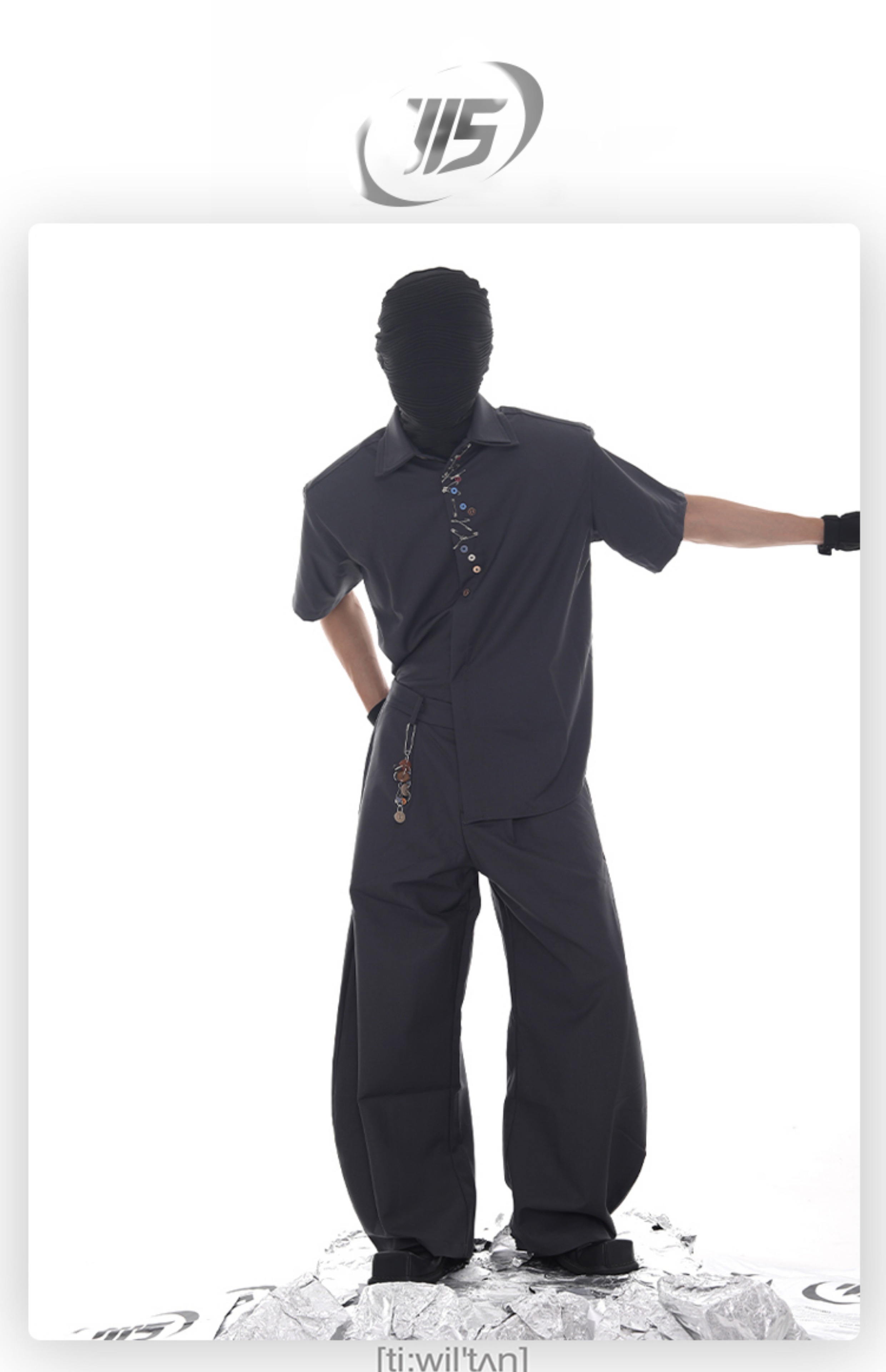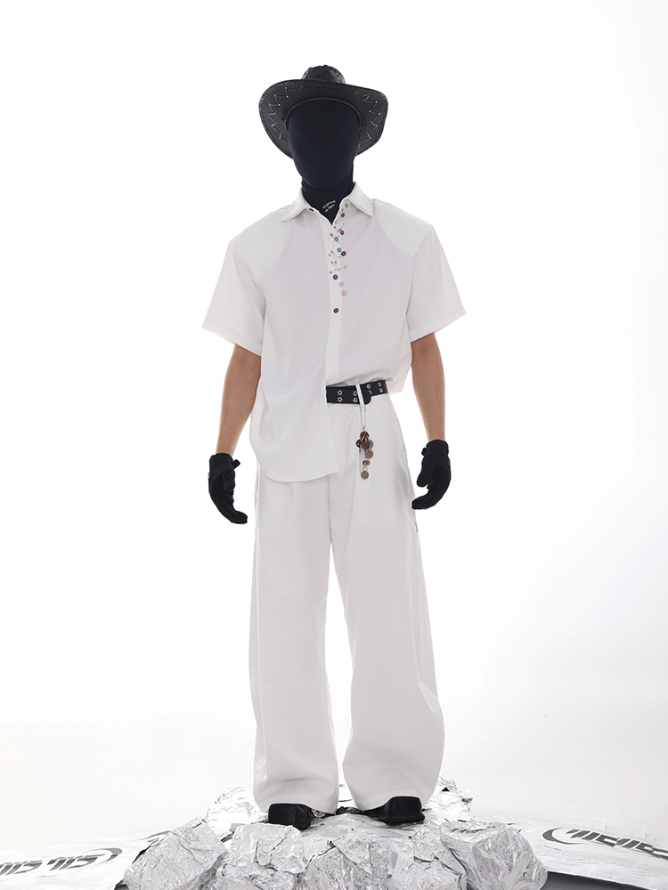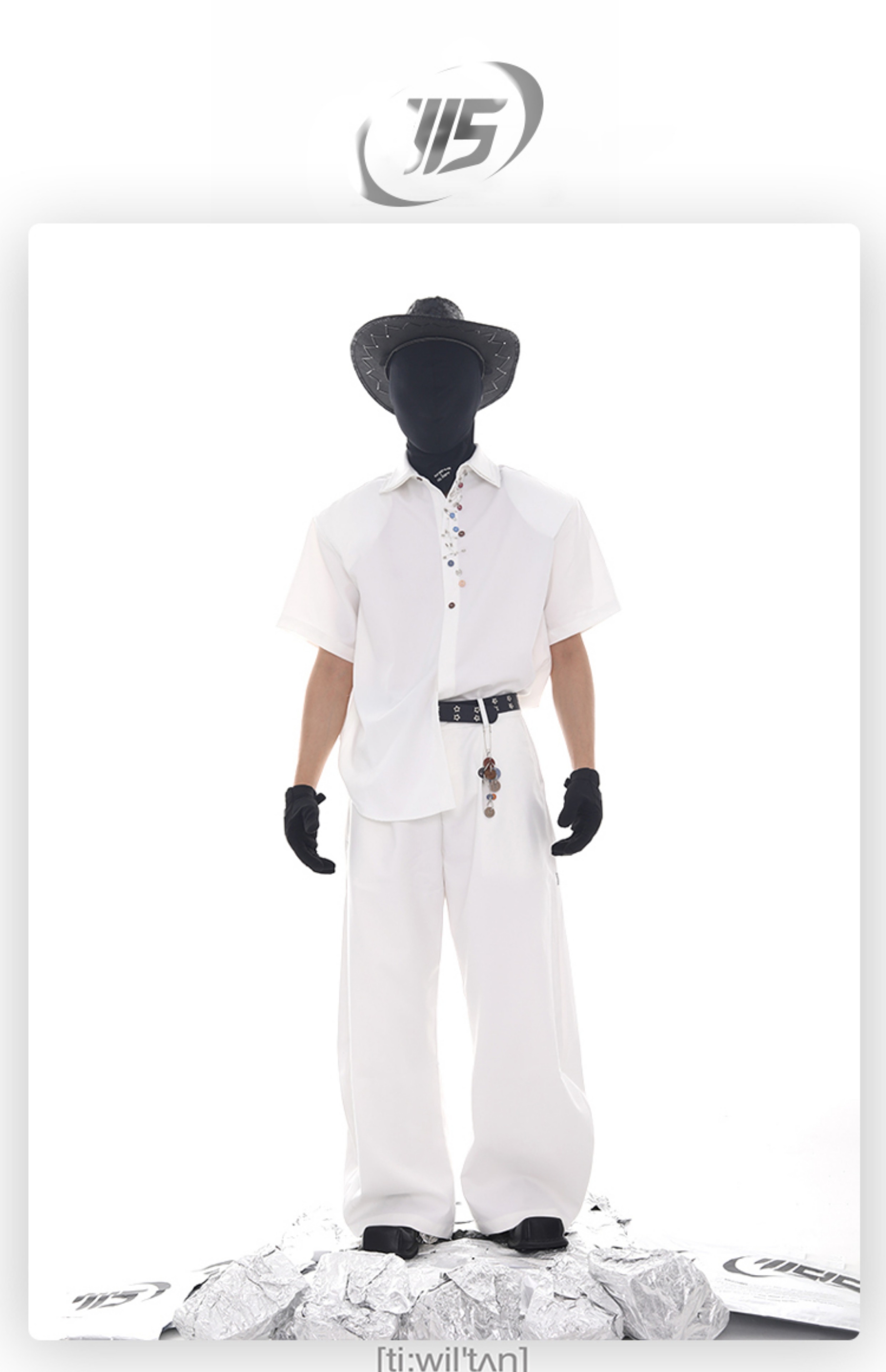 Double Collar Pin Decor Shoulder-Pad Short Sleeve Shirt & Ttrousers Setup WN18621