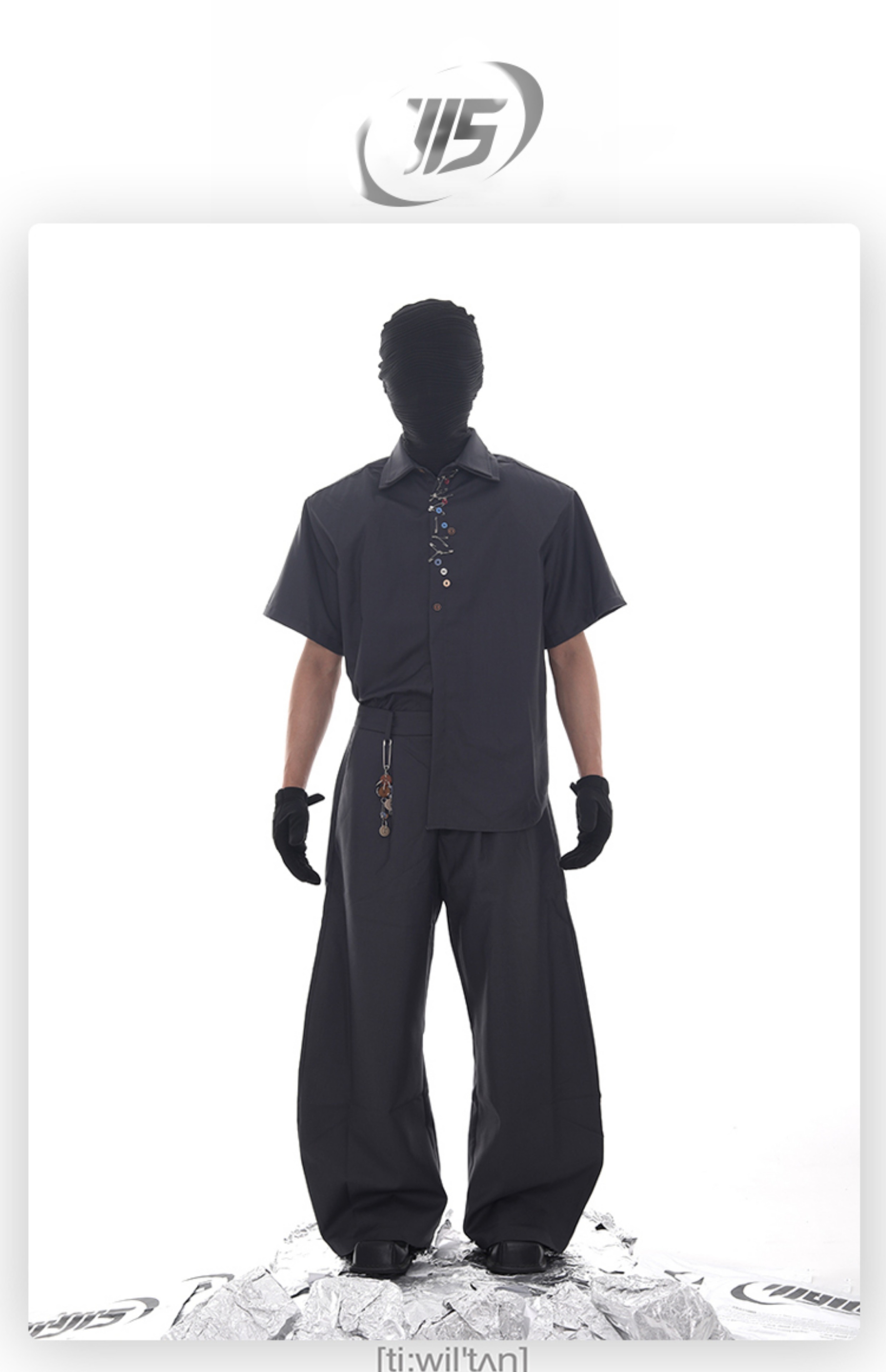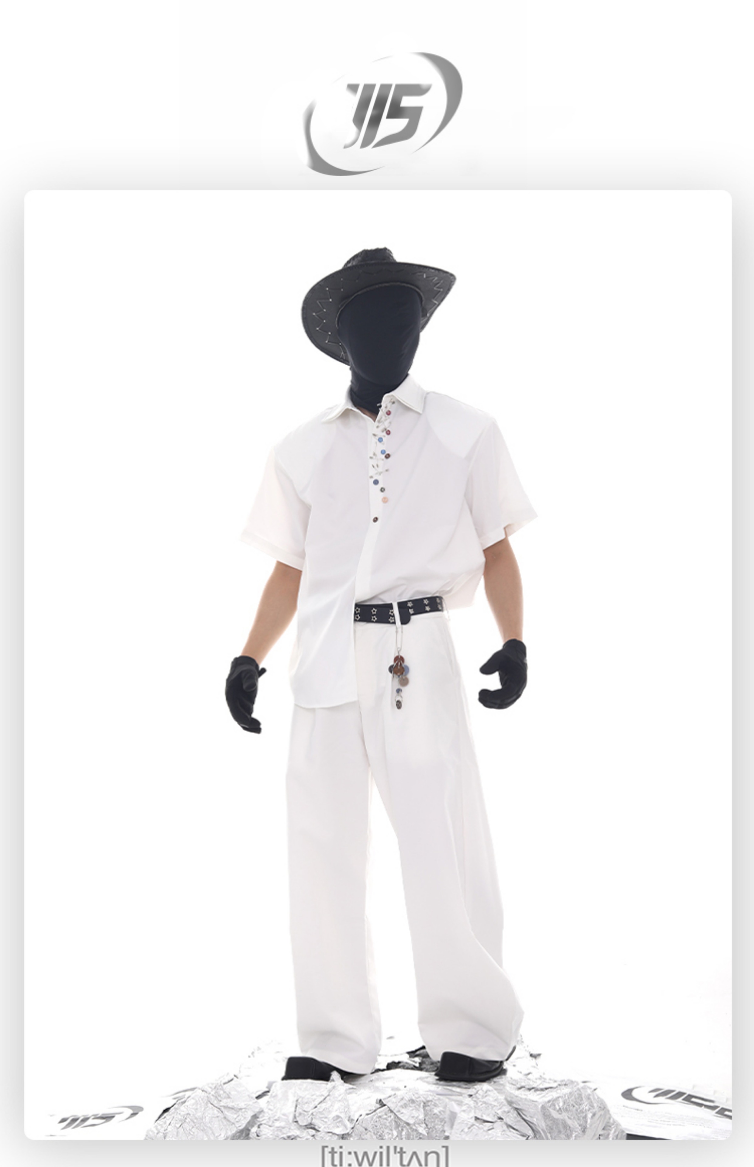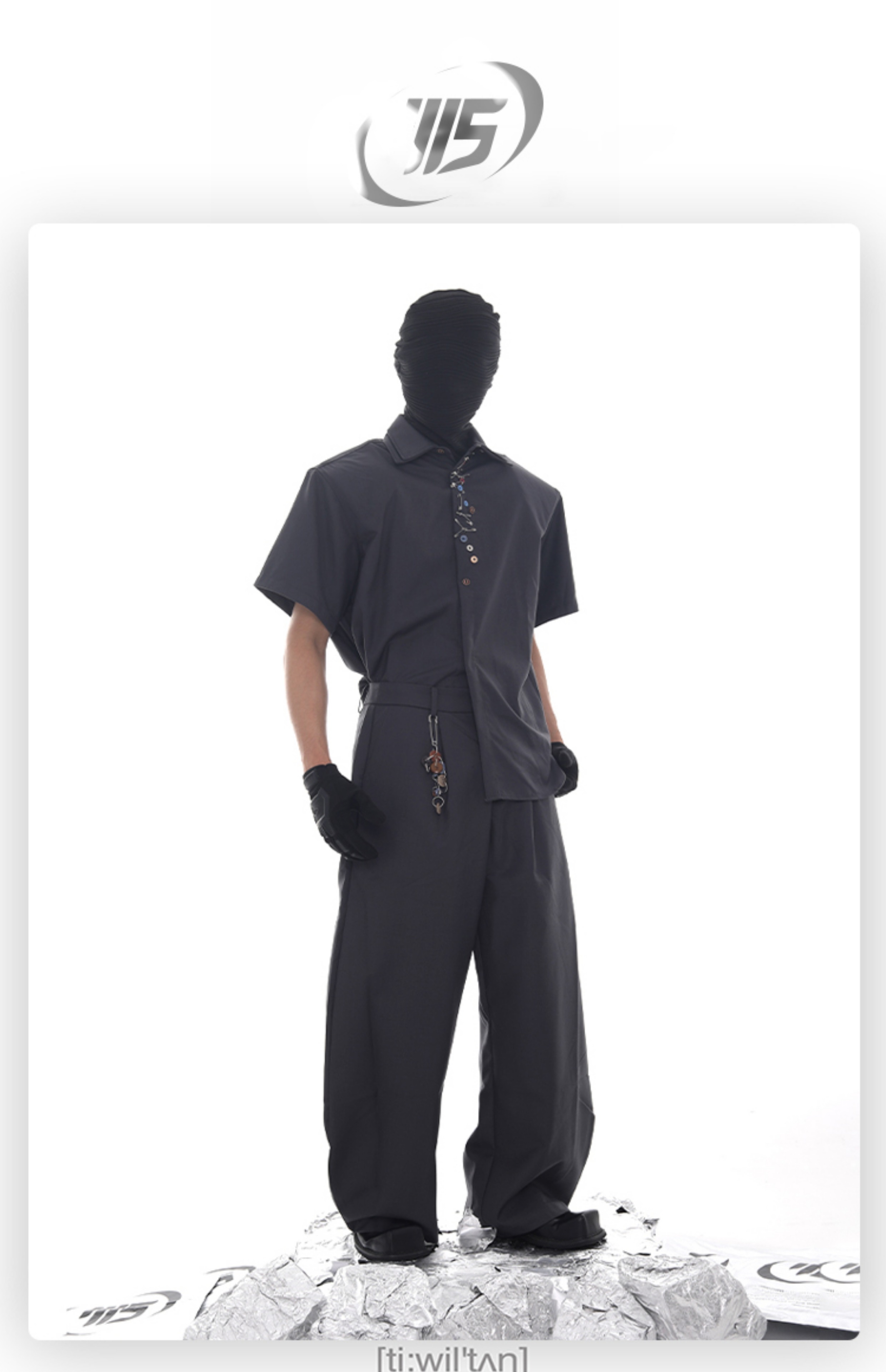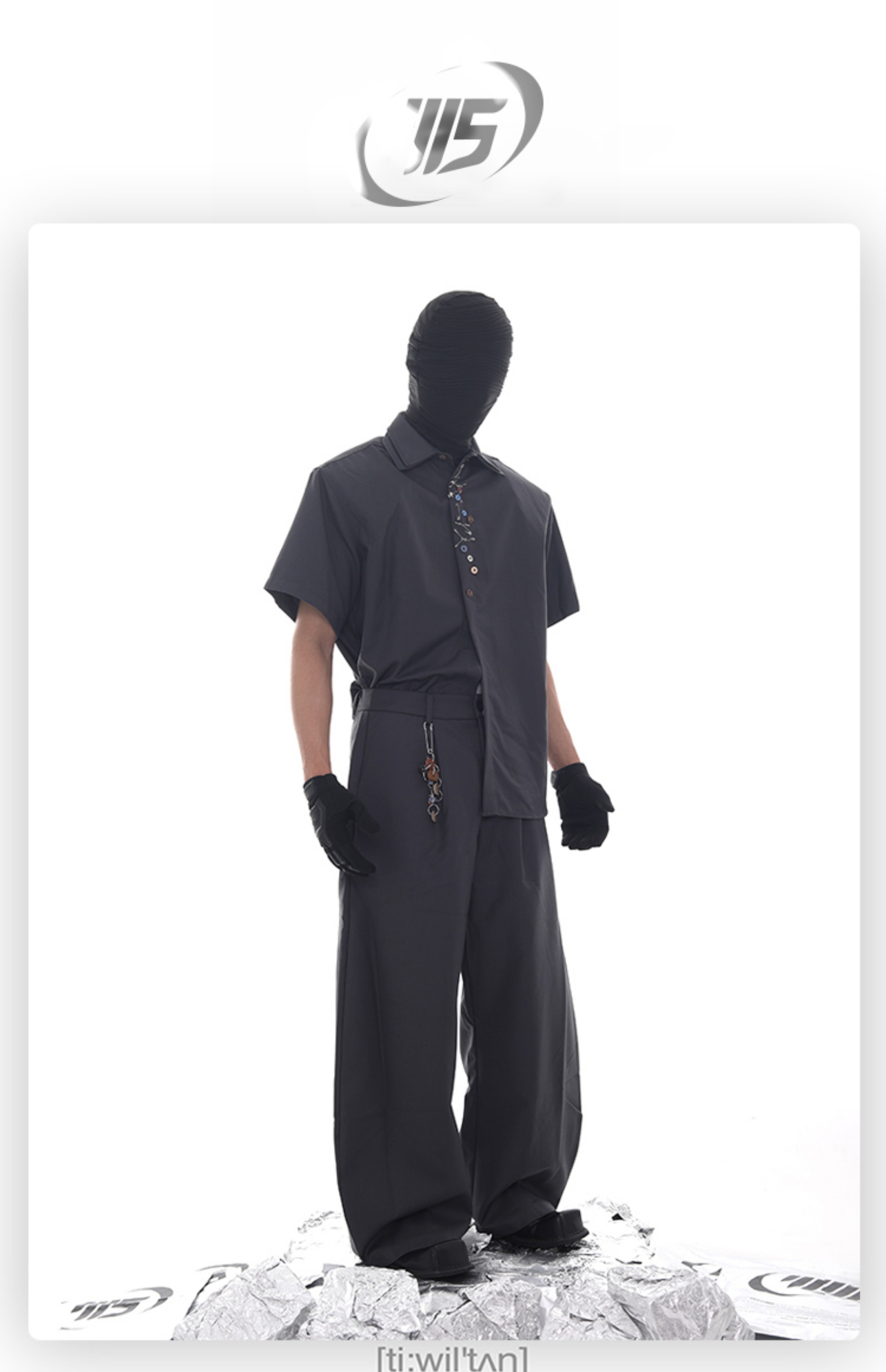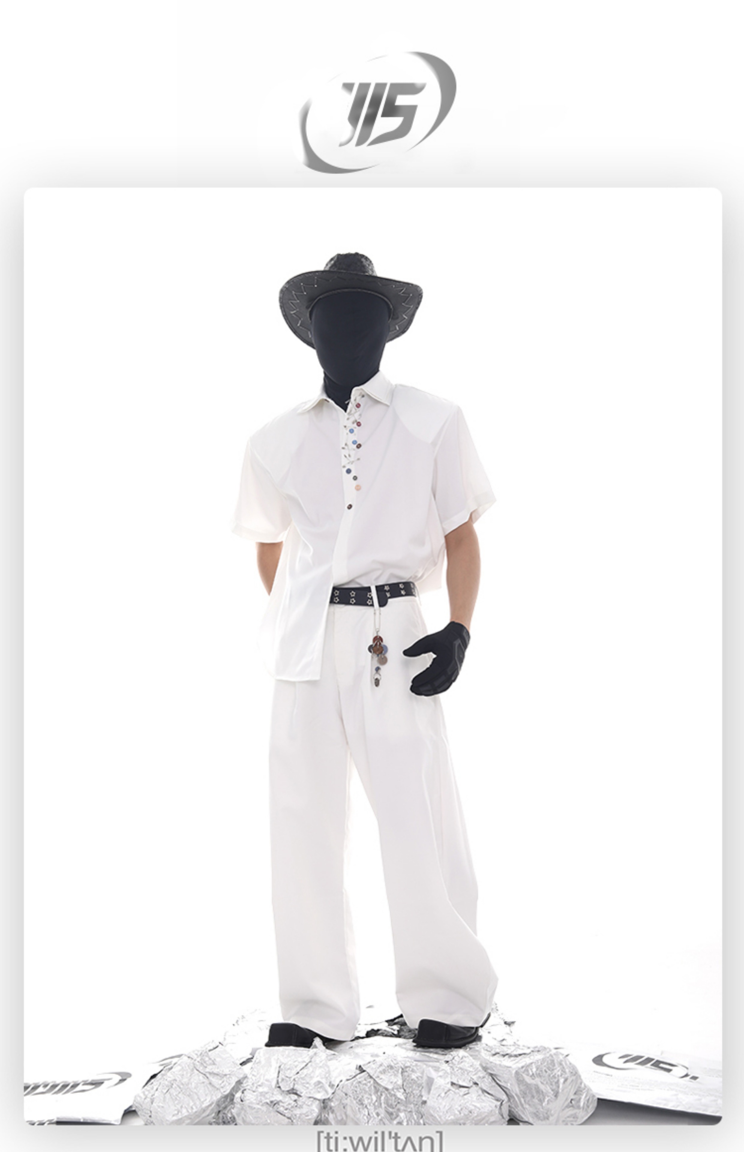 Double Collar Pin Decor Shoulder-Pad Short Sleeve Shirt & Ttrousers Setup WN18621