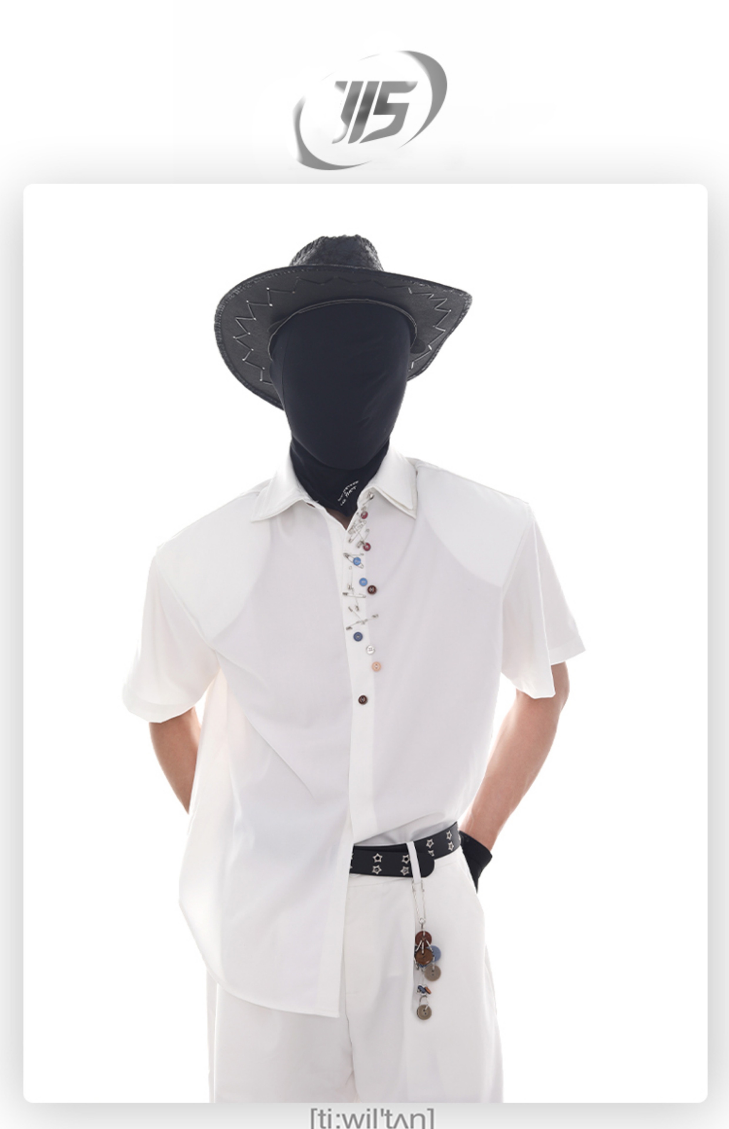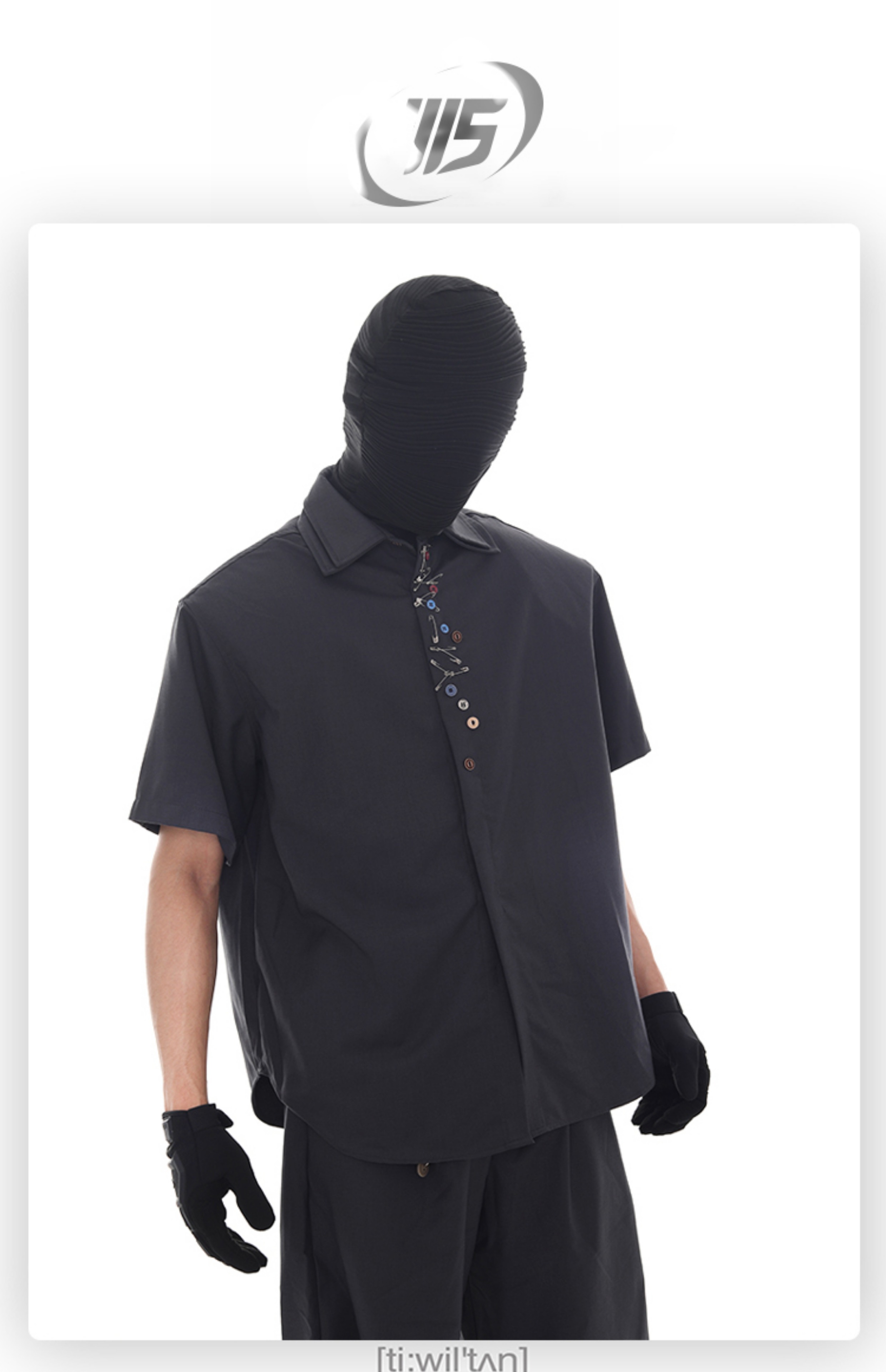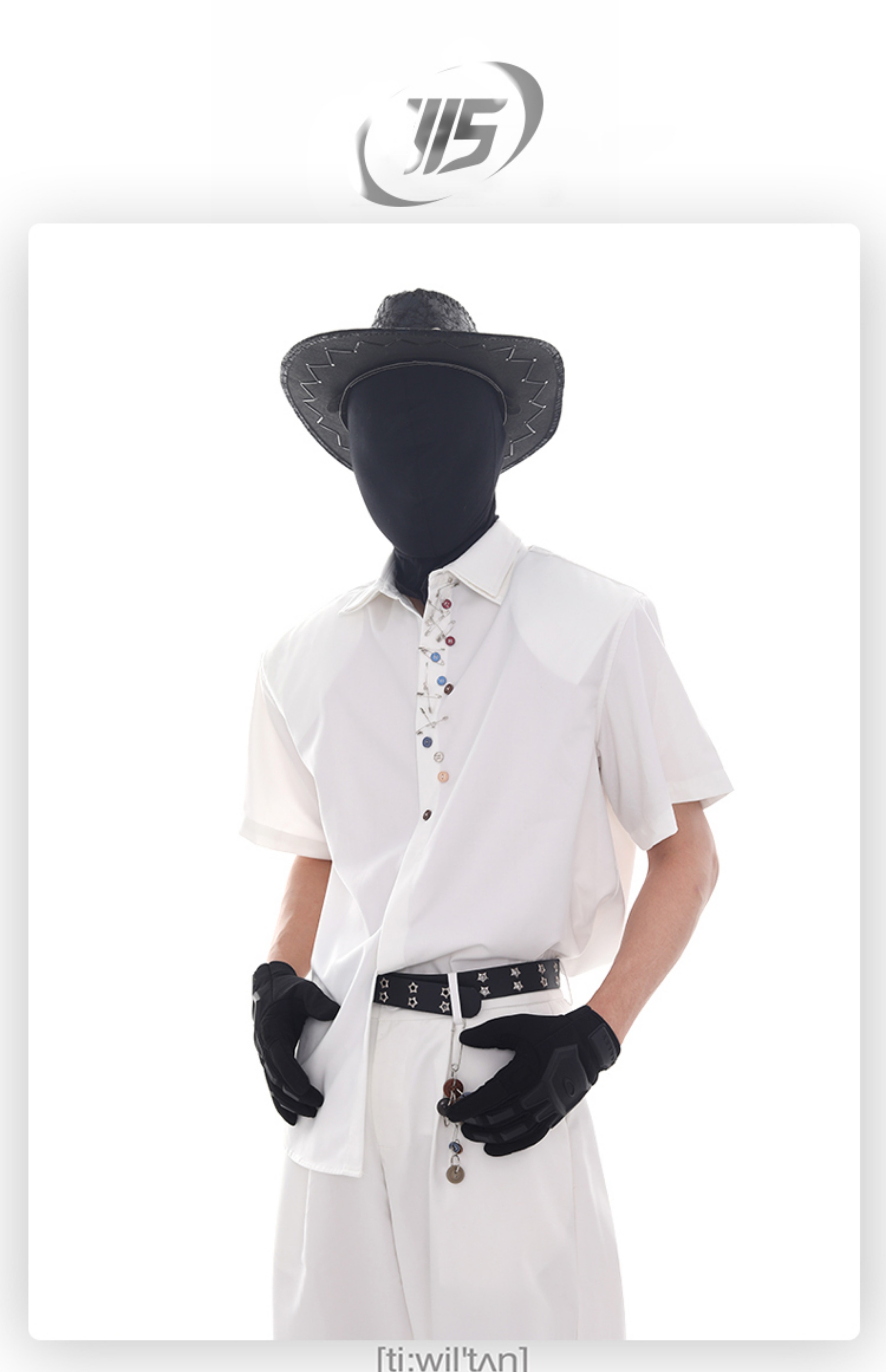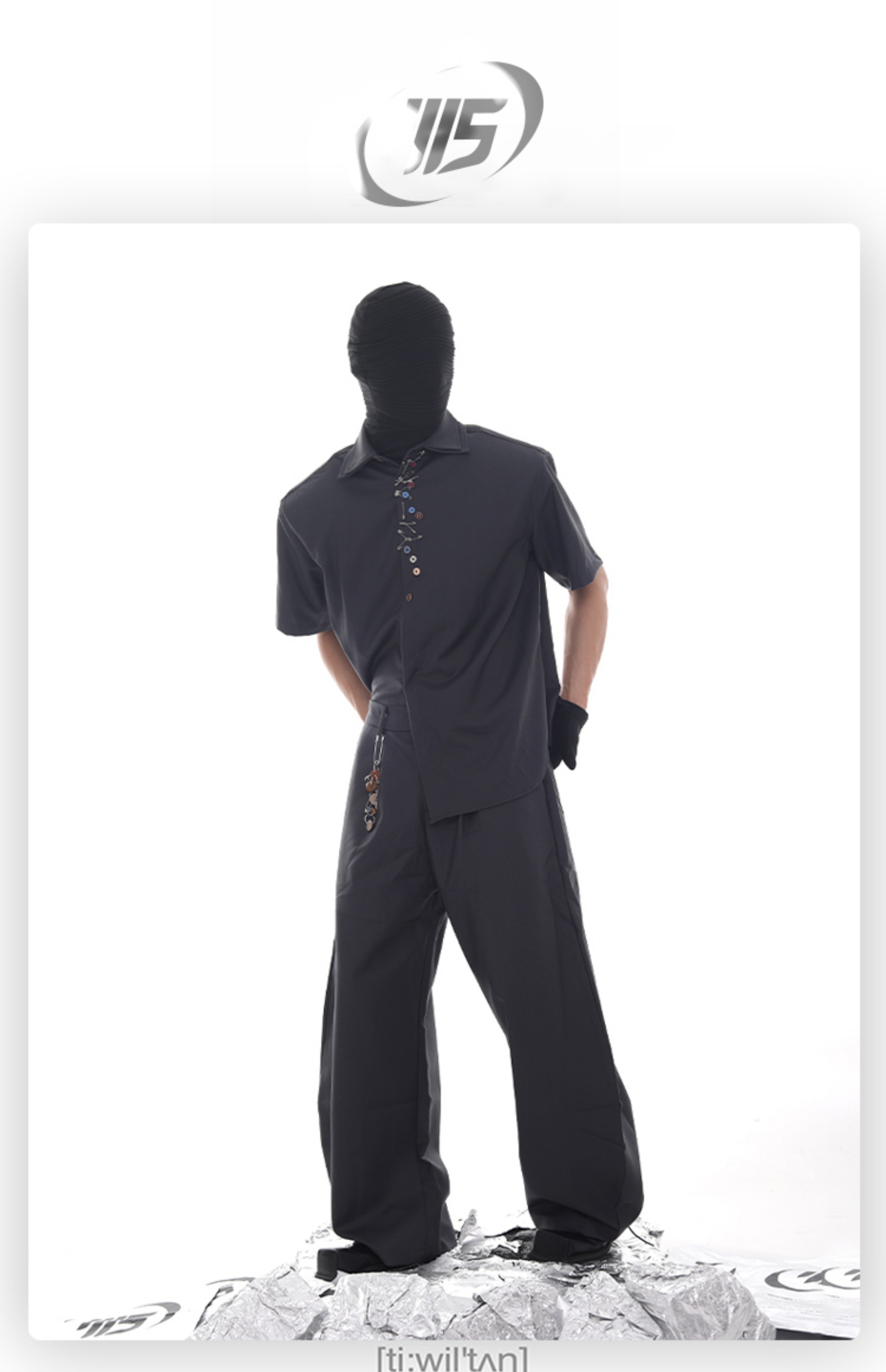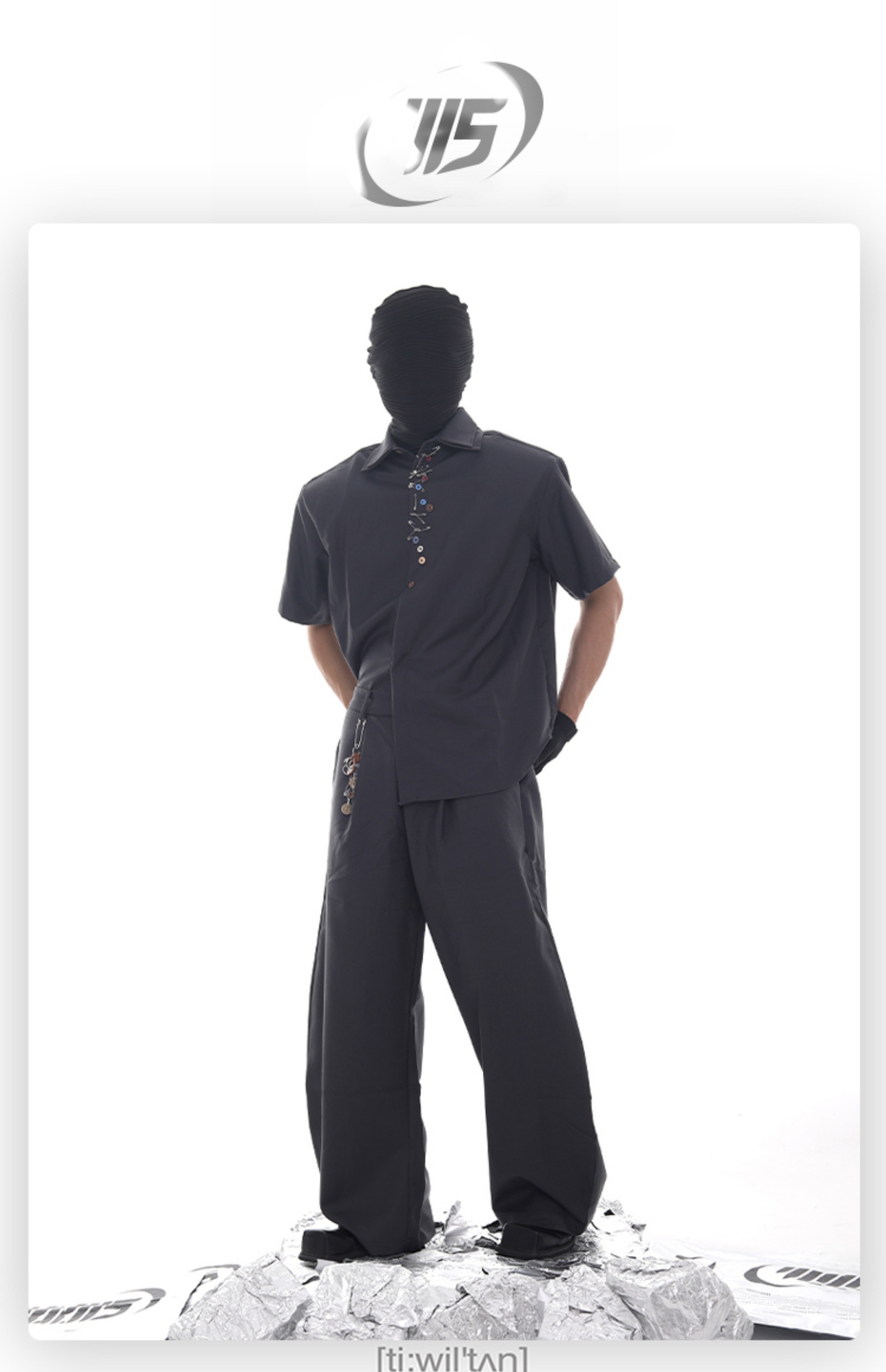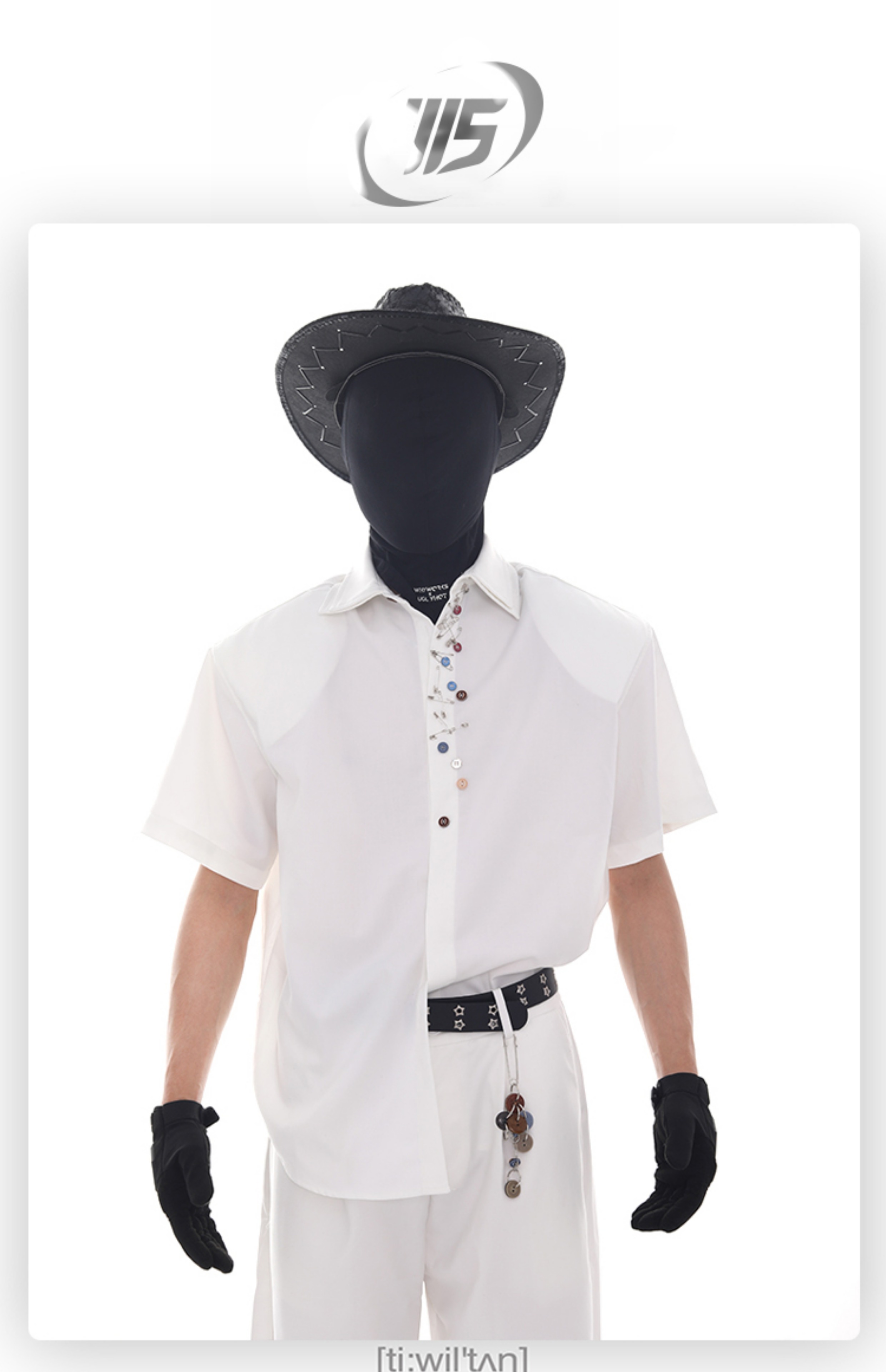 Double Collar Pin Decor Shoulder-Pad Short Sleeve Shirt & Ttrousers Setup WN18621