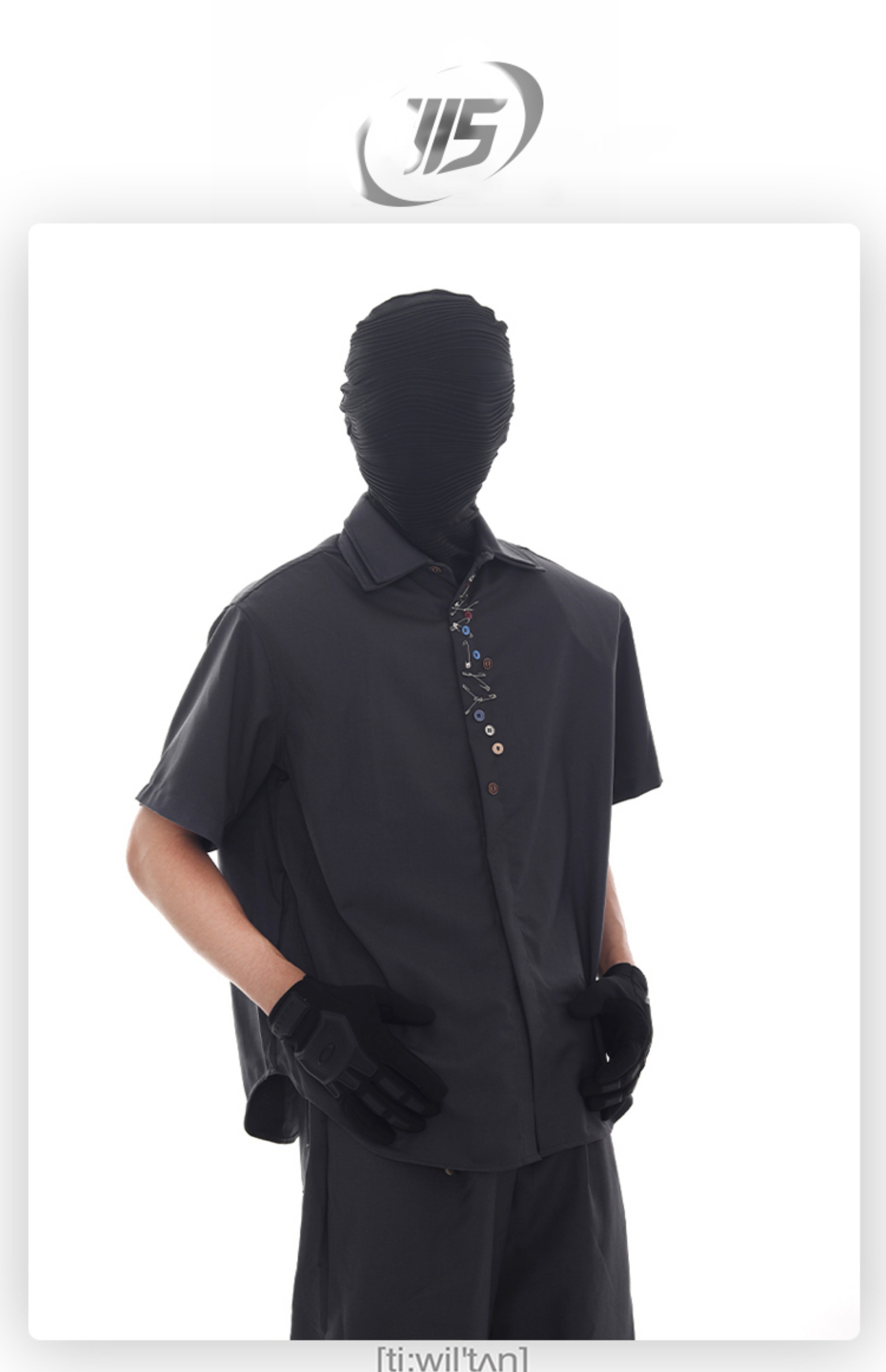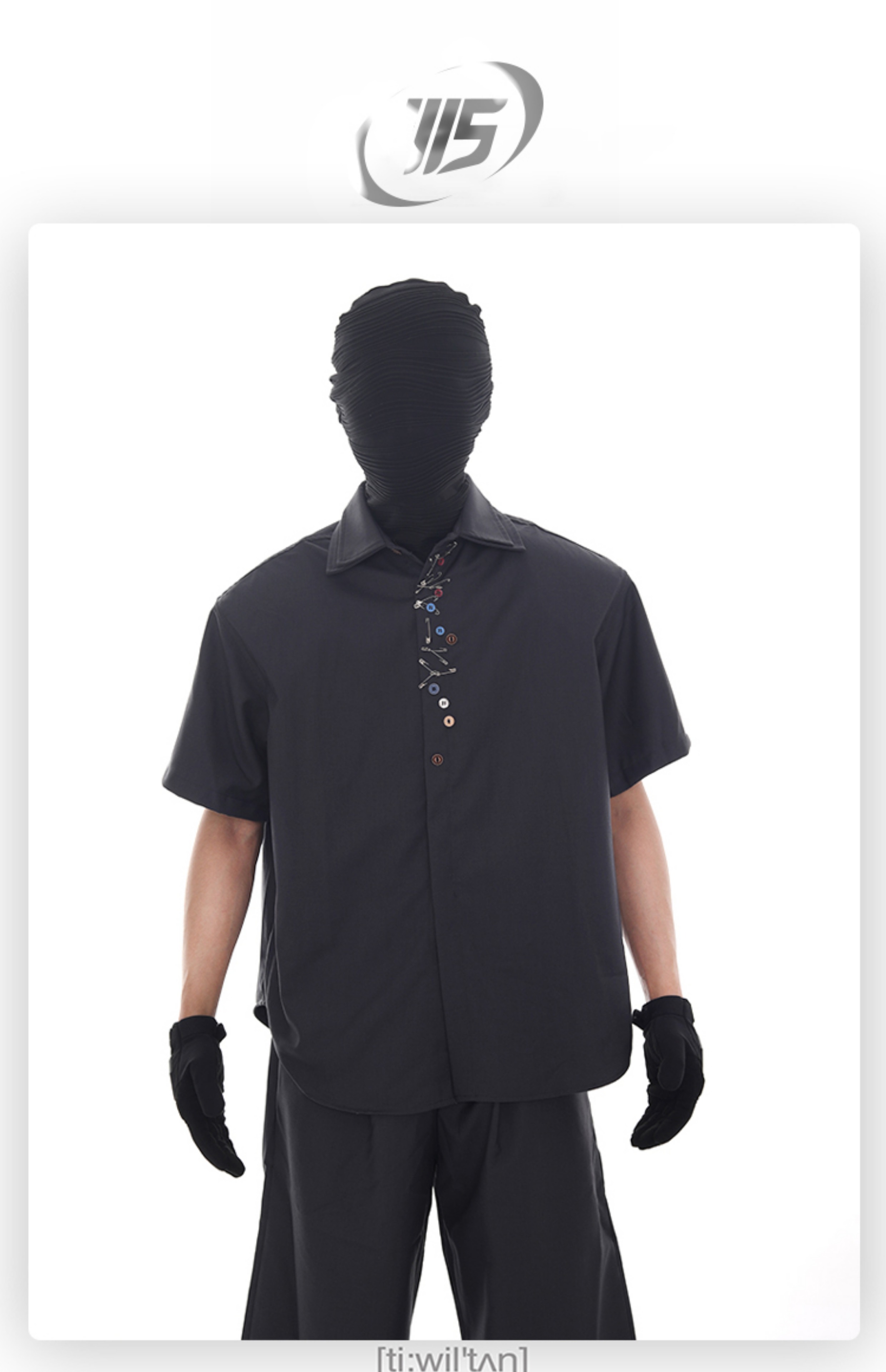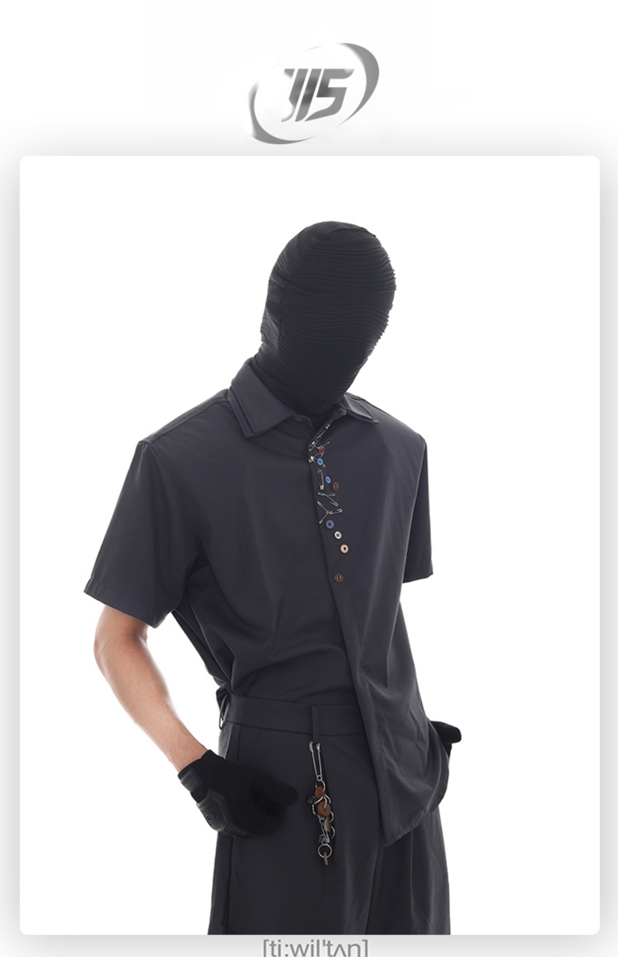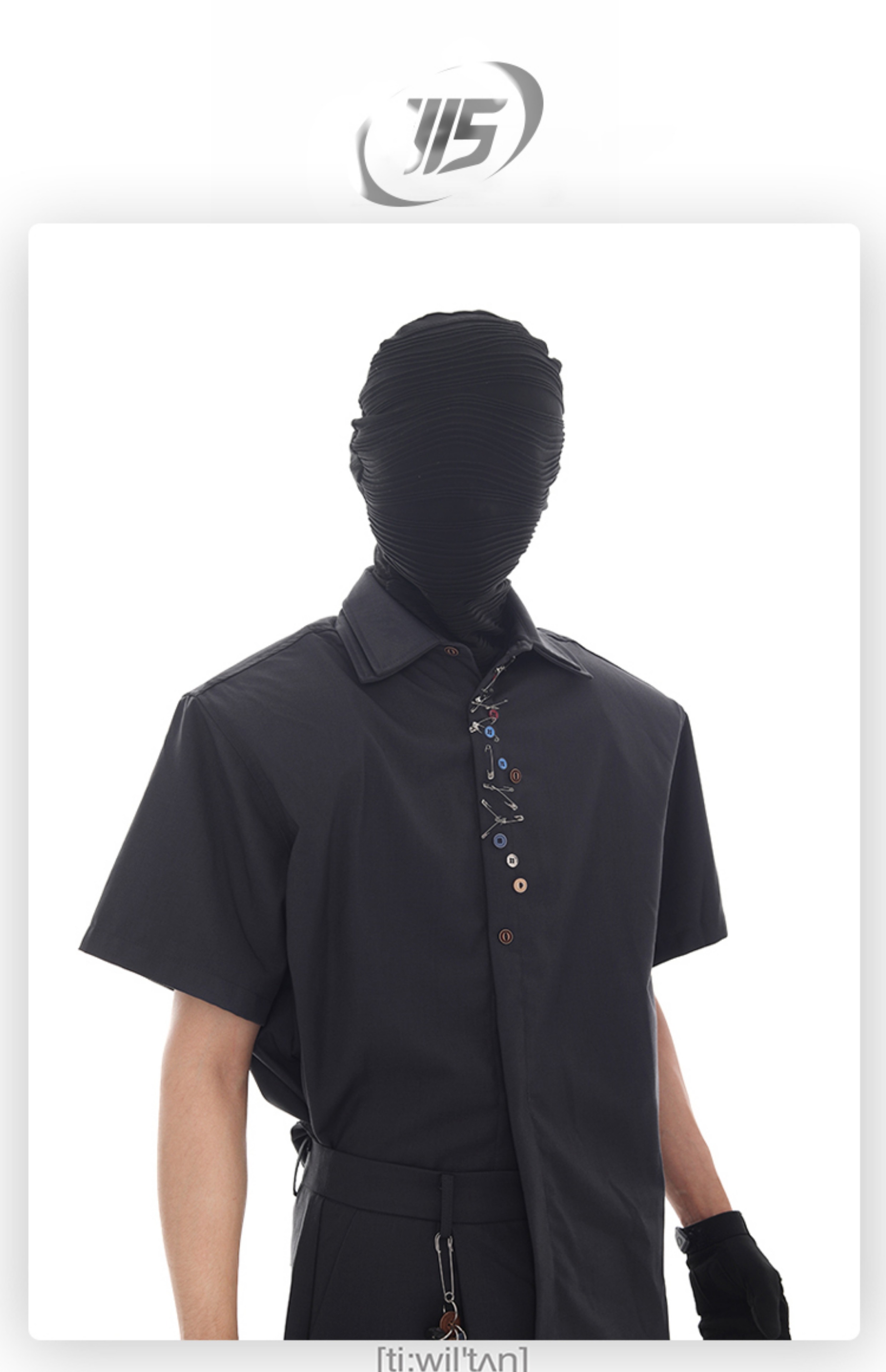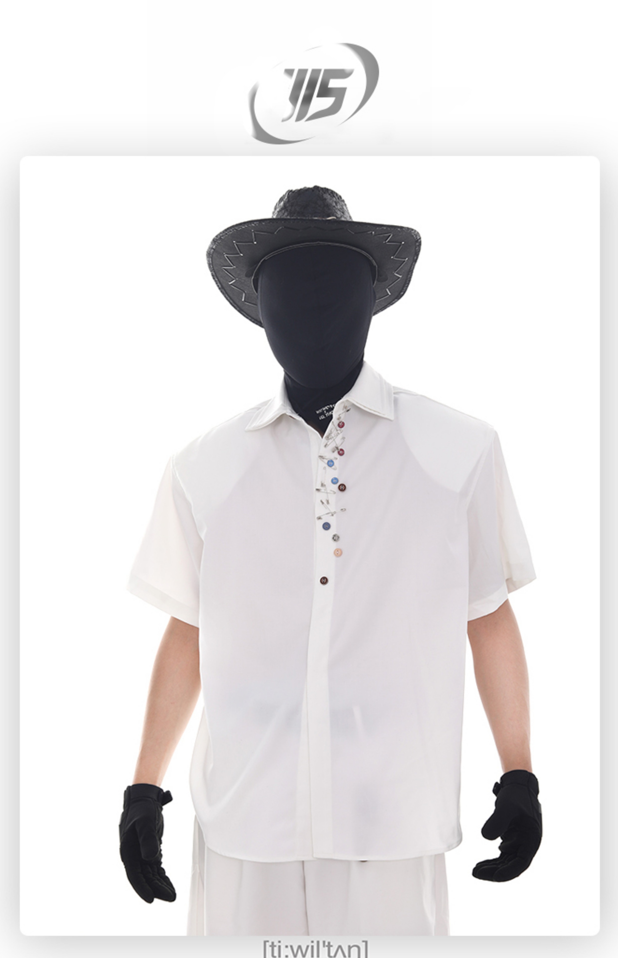 Double Collar Pin Decor Shoulder-Pad Short Sleeve Shirt & Ttrousers Setup WN18621