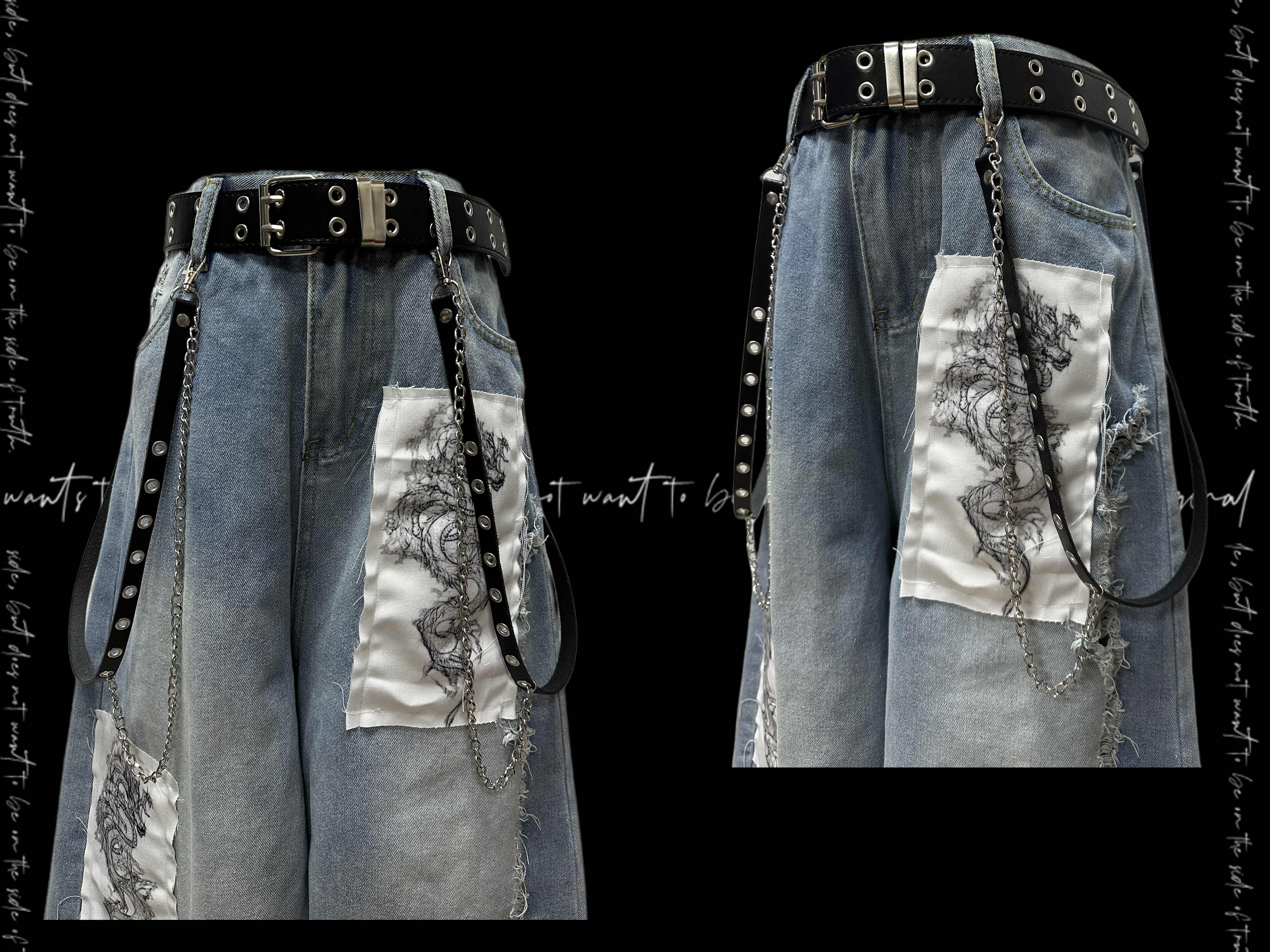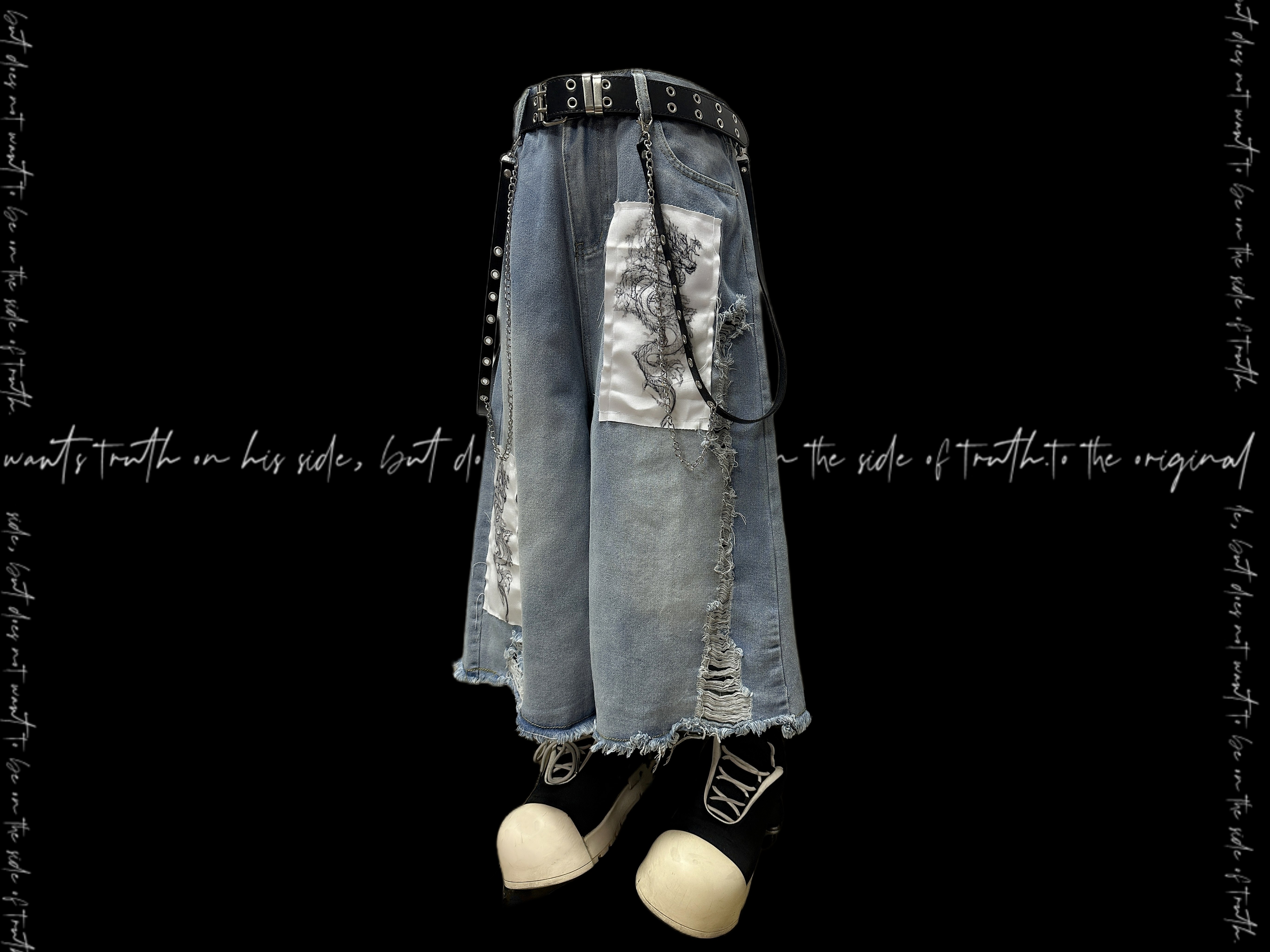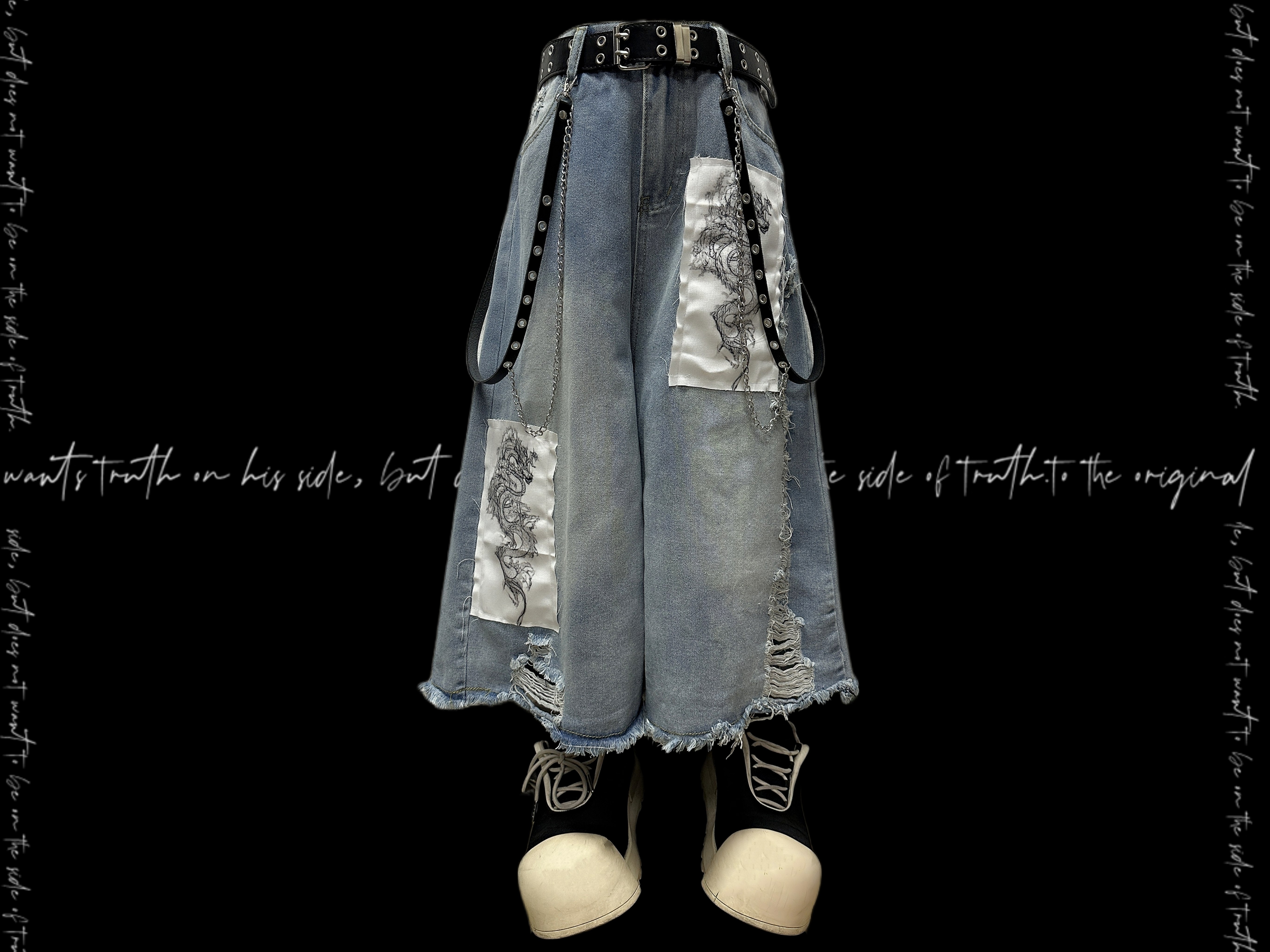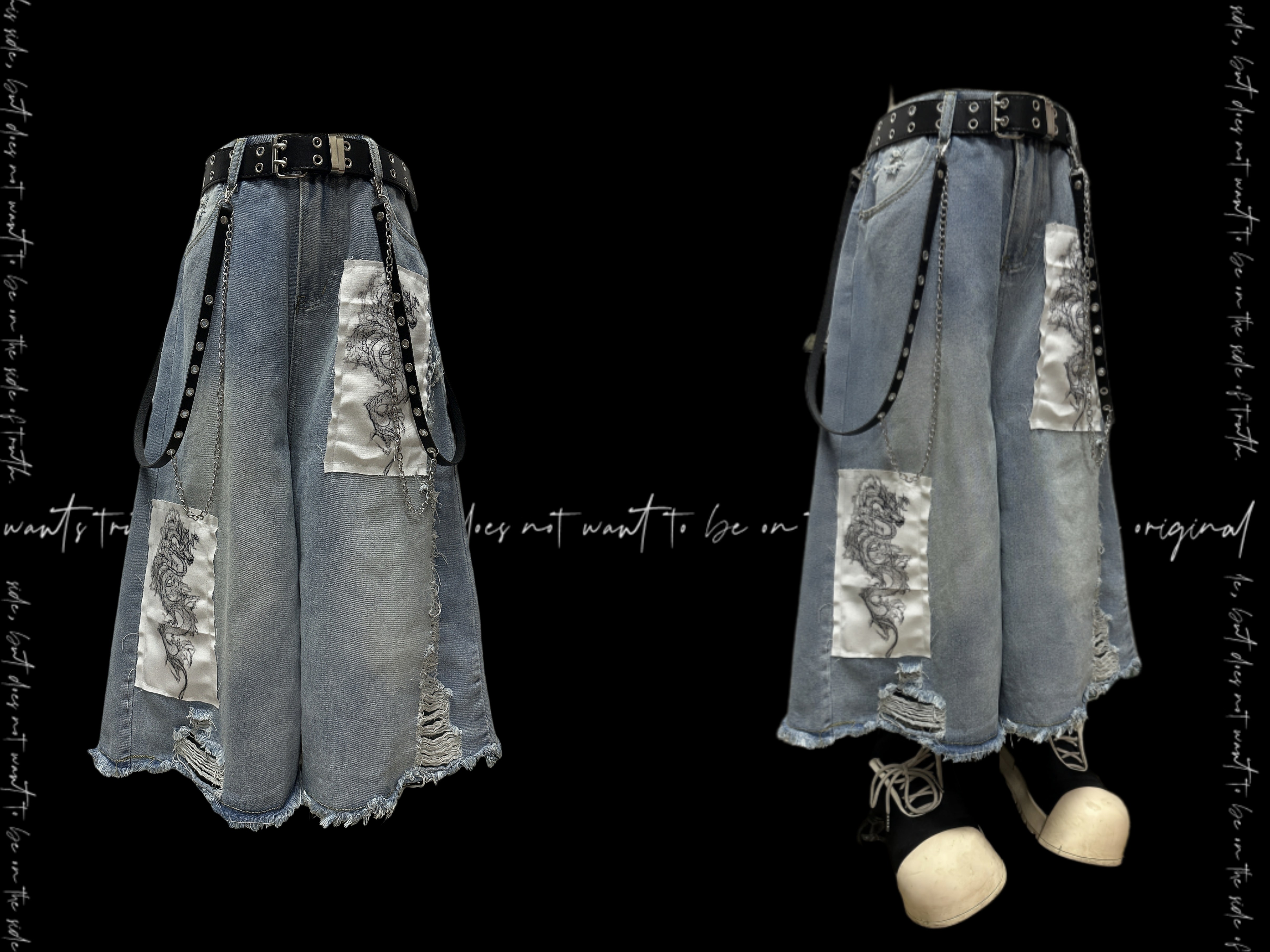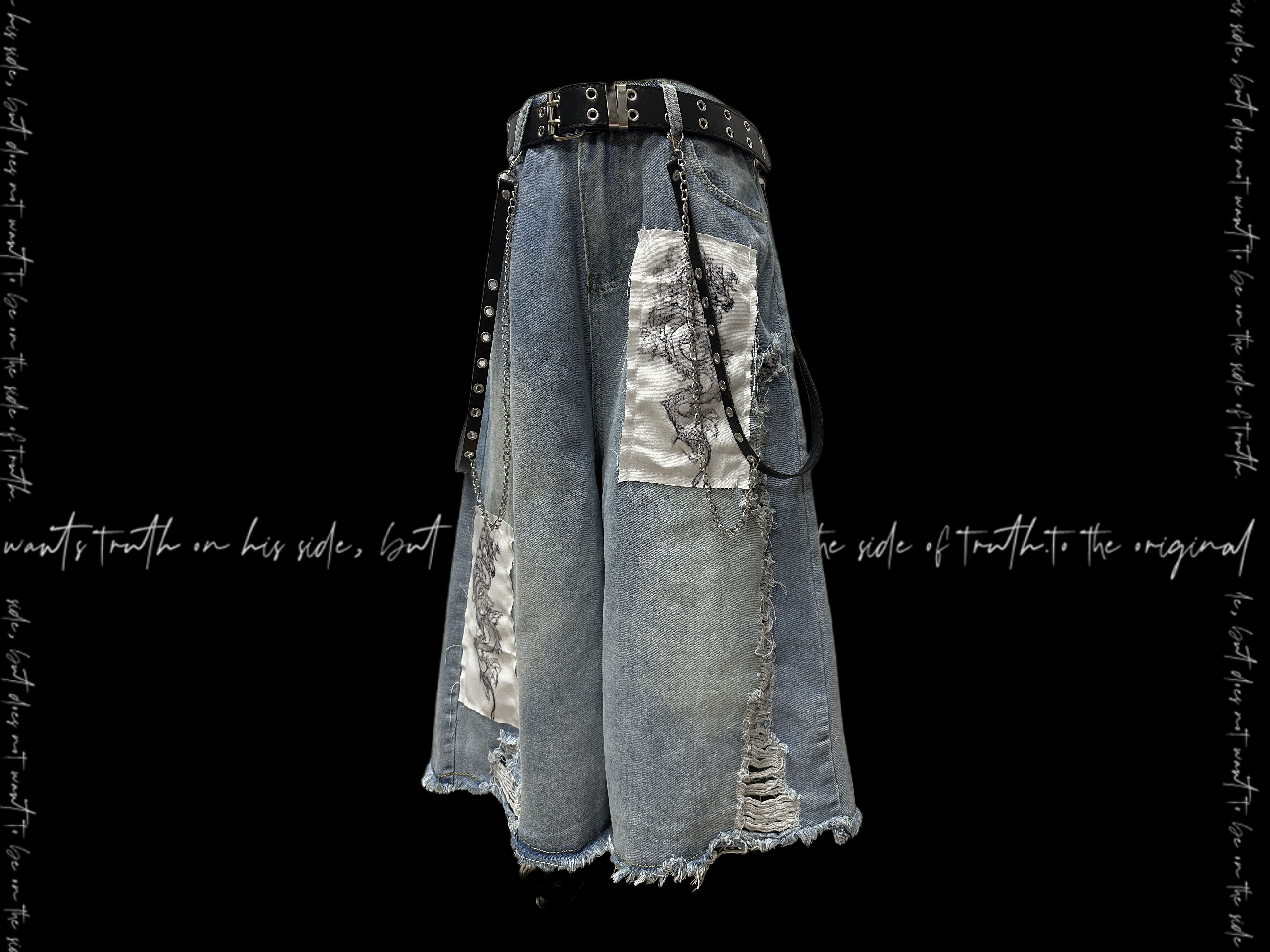Patchwork Design Wide Leg Denim Half Jeans & Belt & Chain WN20112