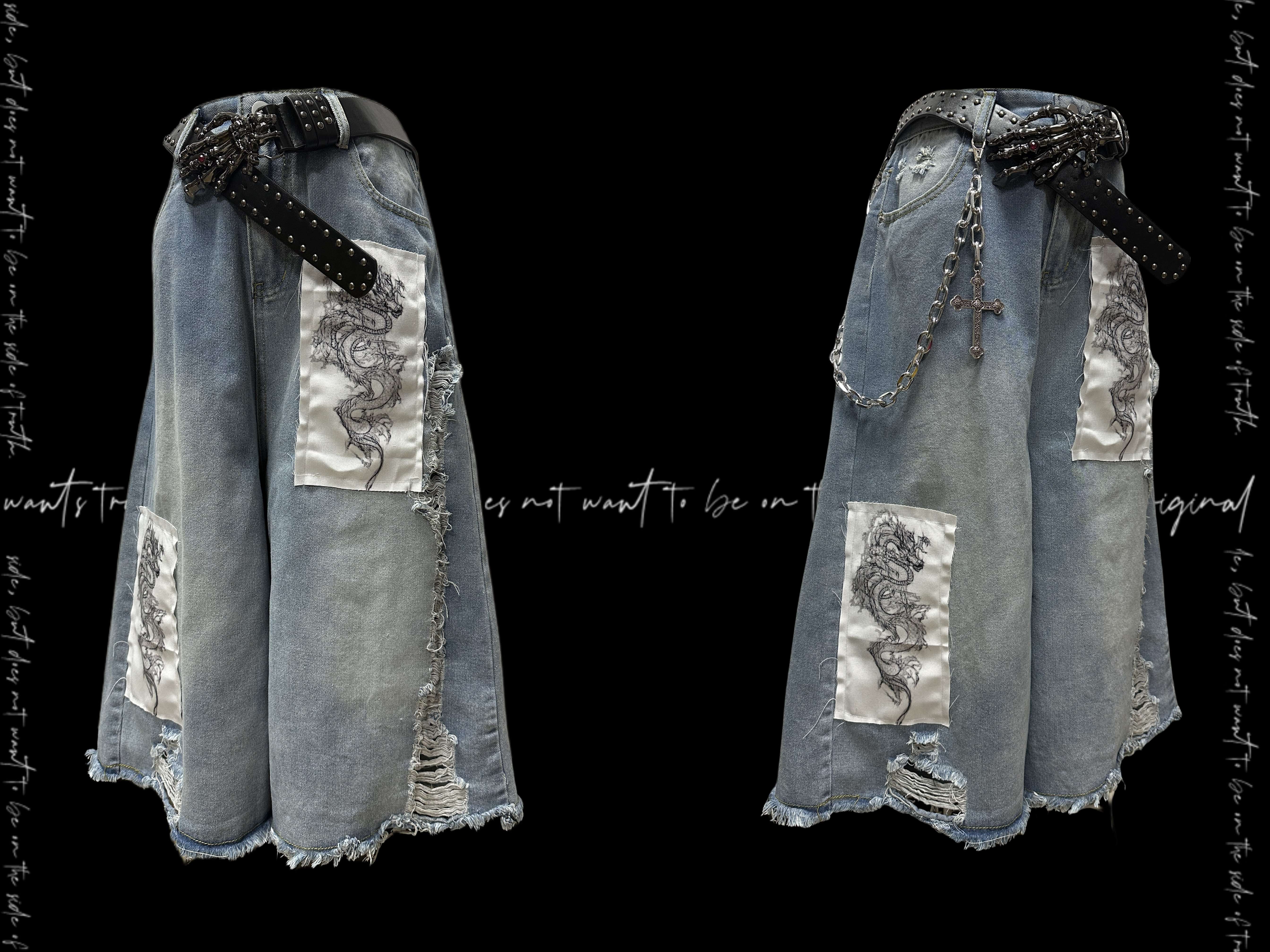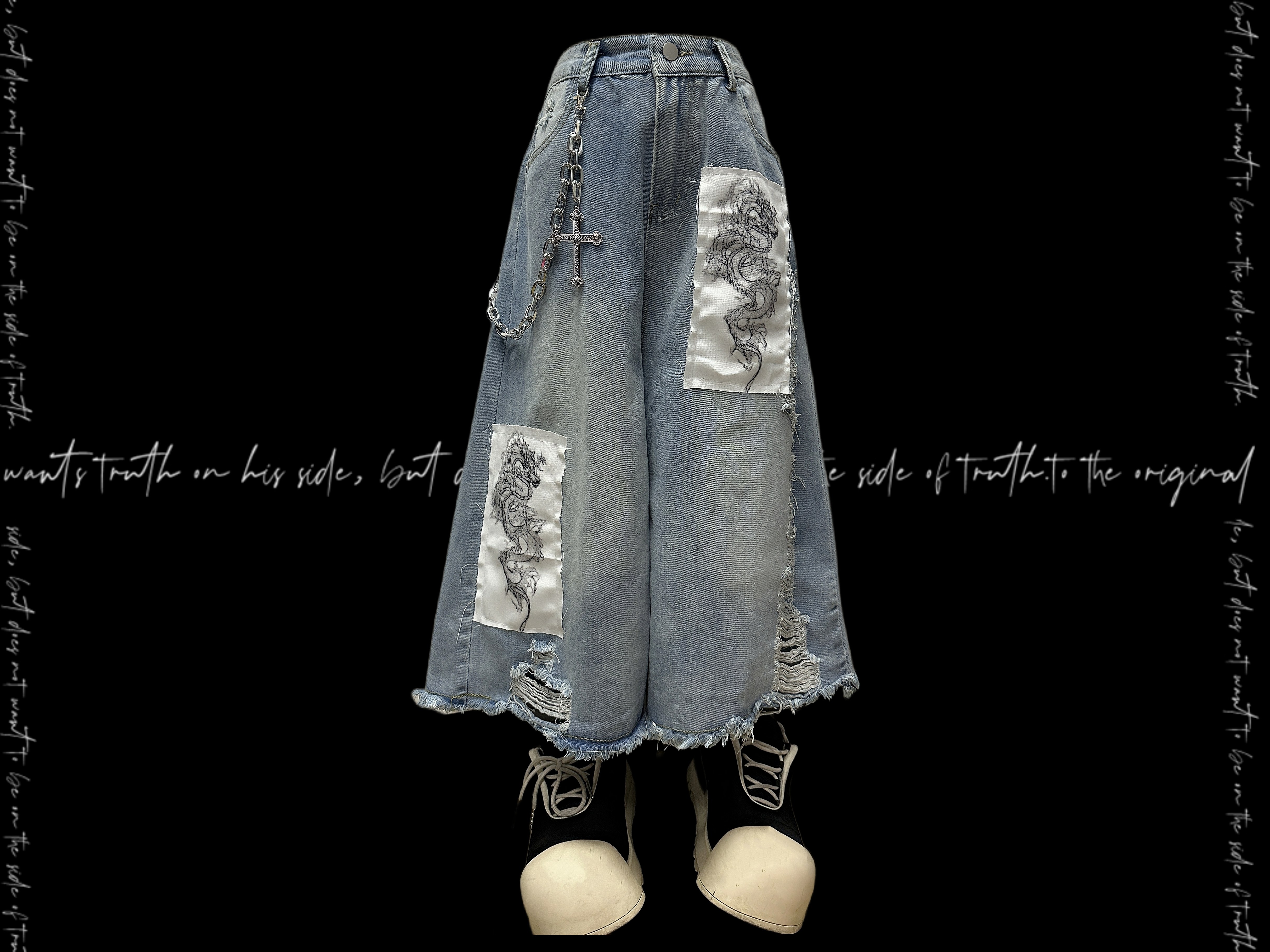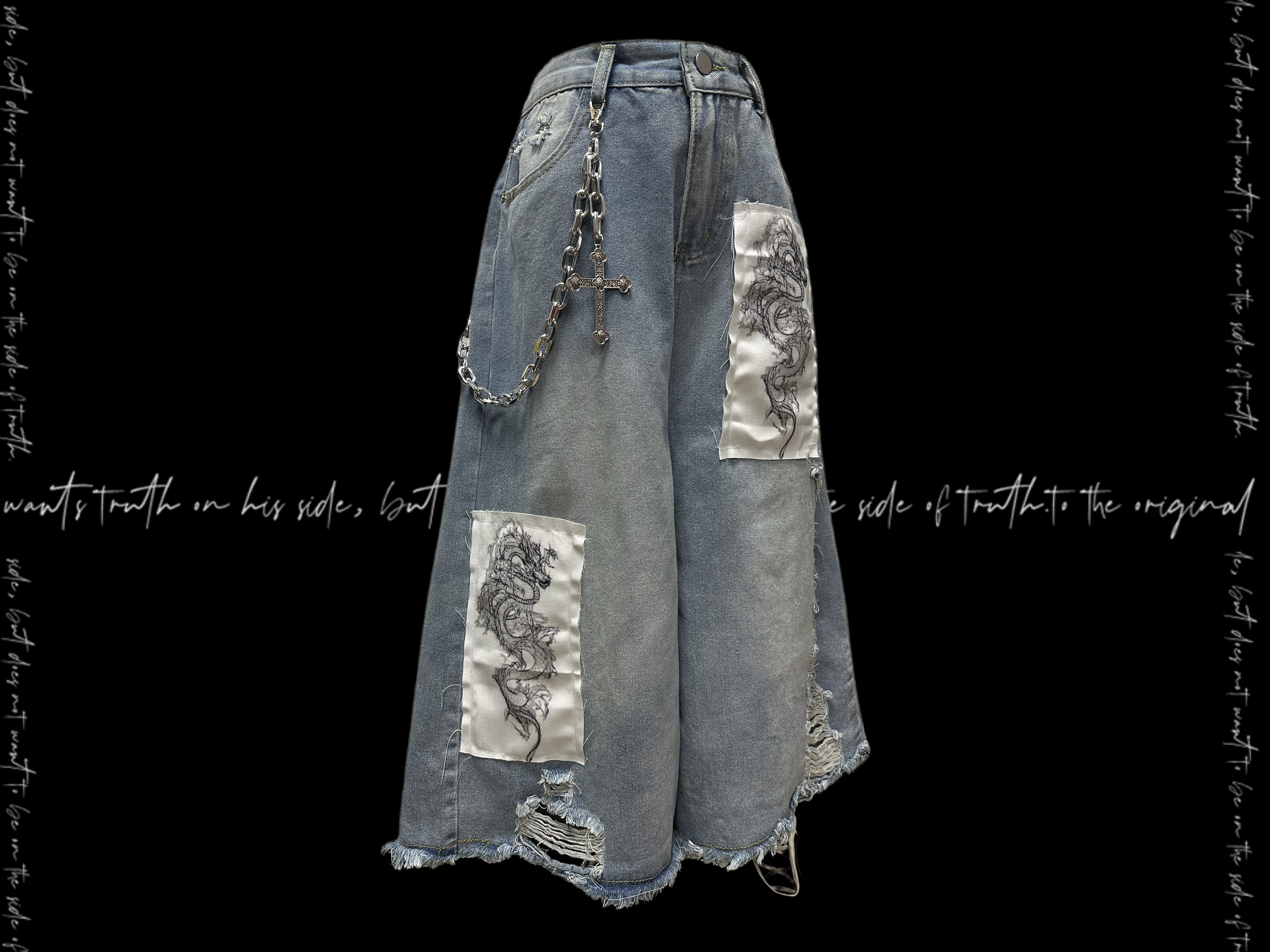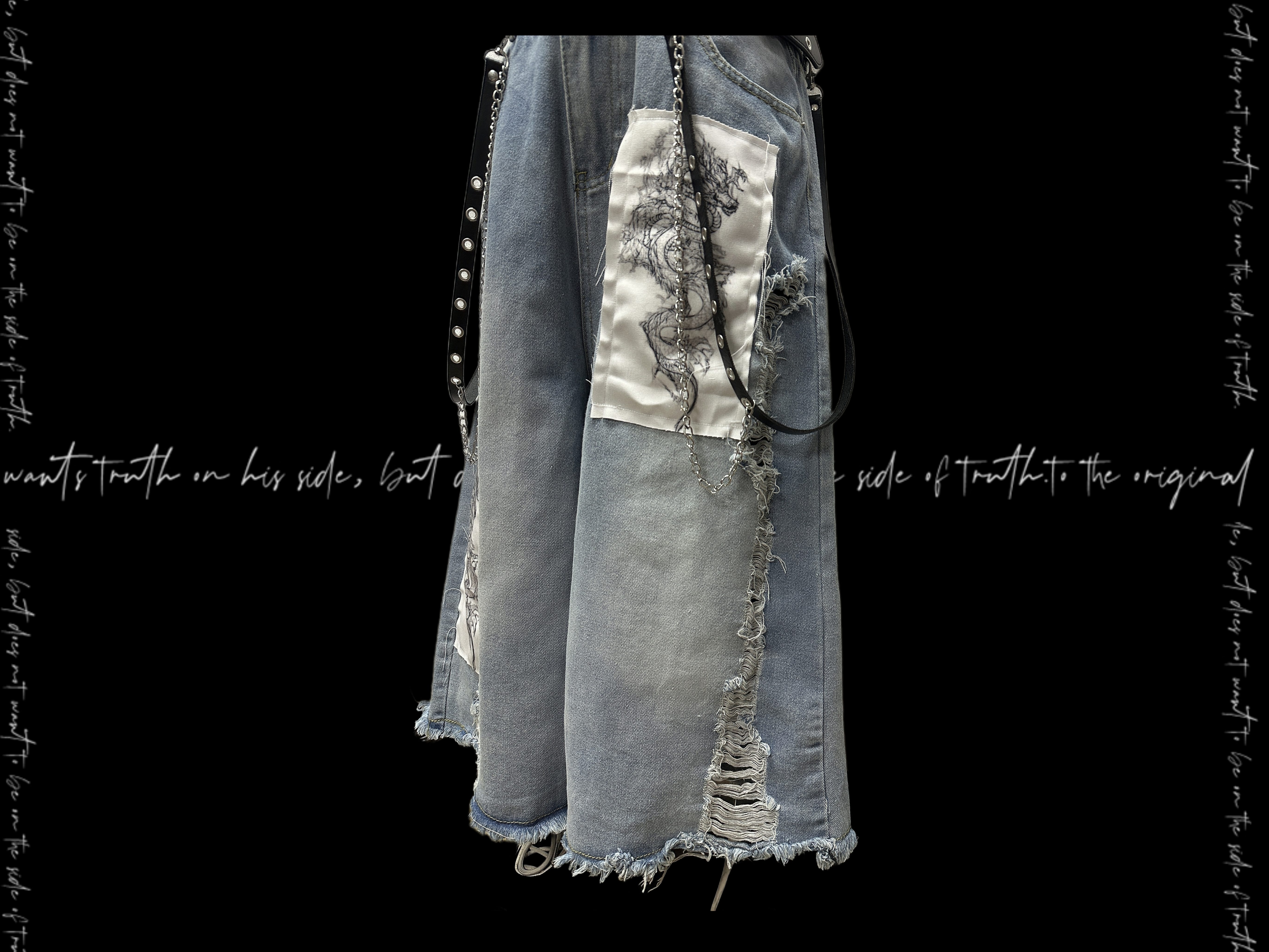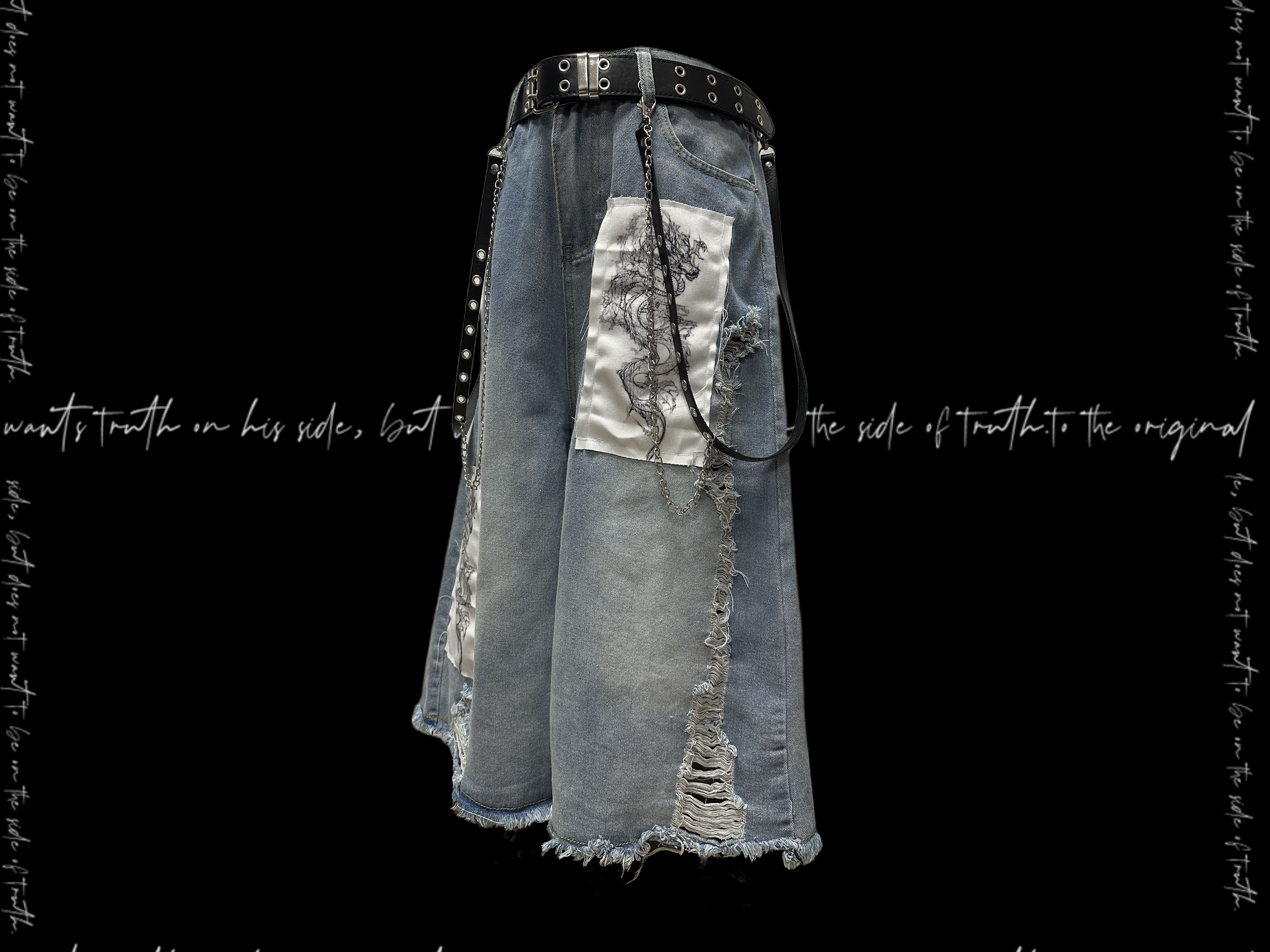 Patchwork Design Wide Leg Denim Half Jeans & Belt & Chain WN20112