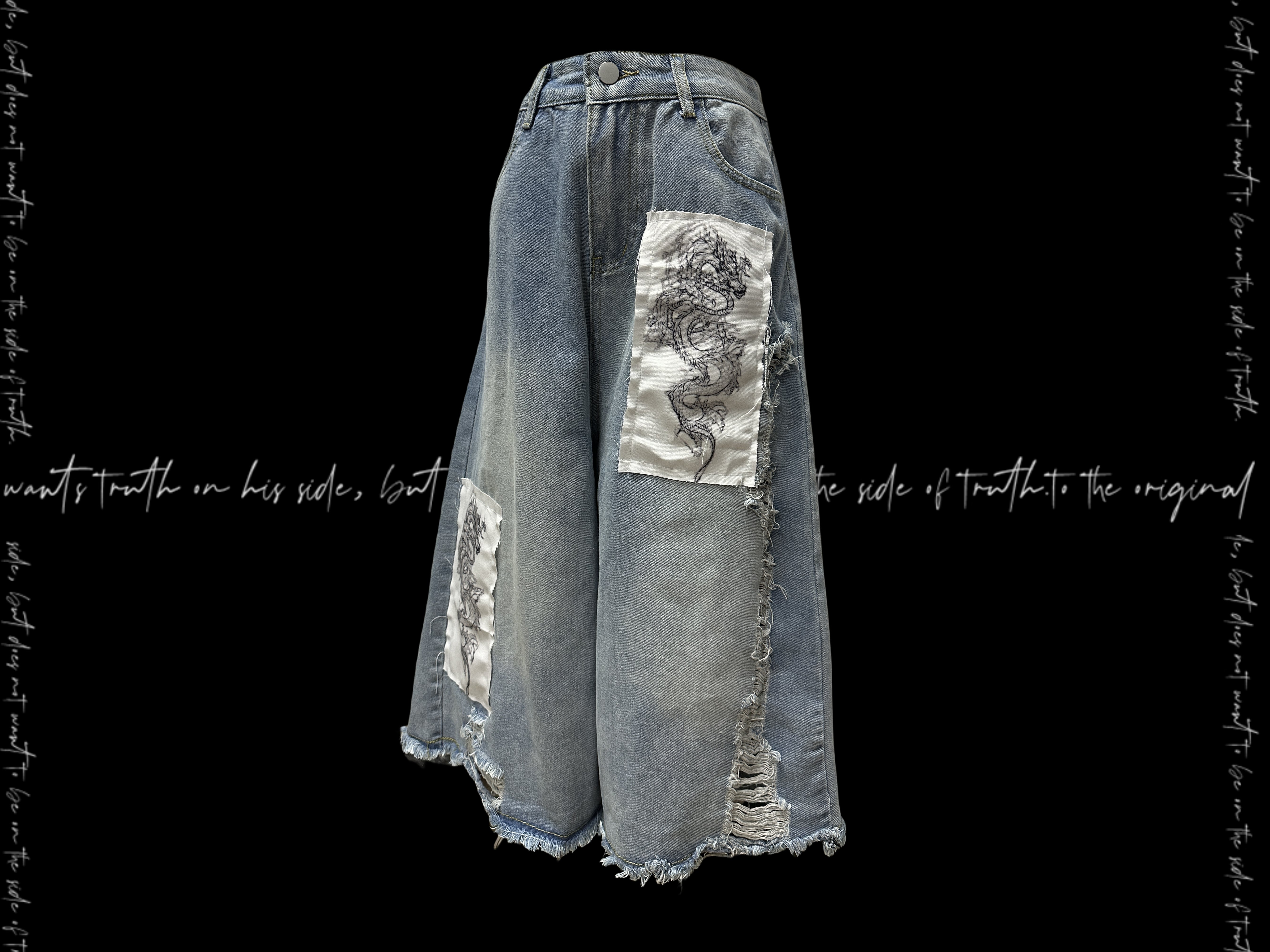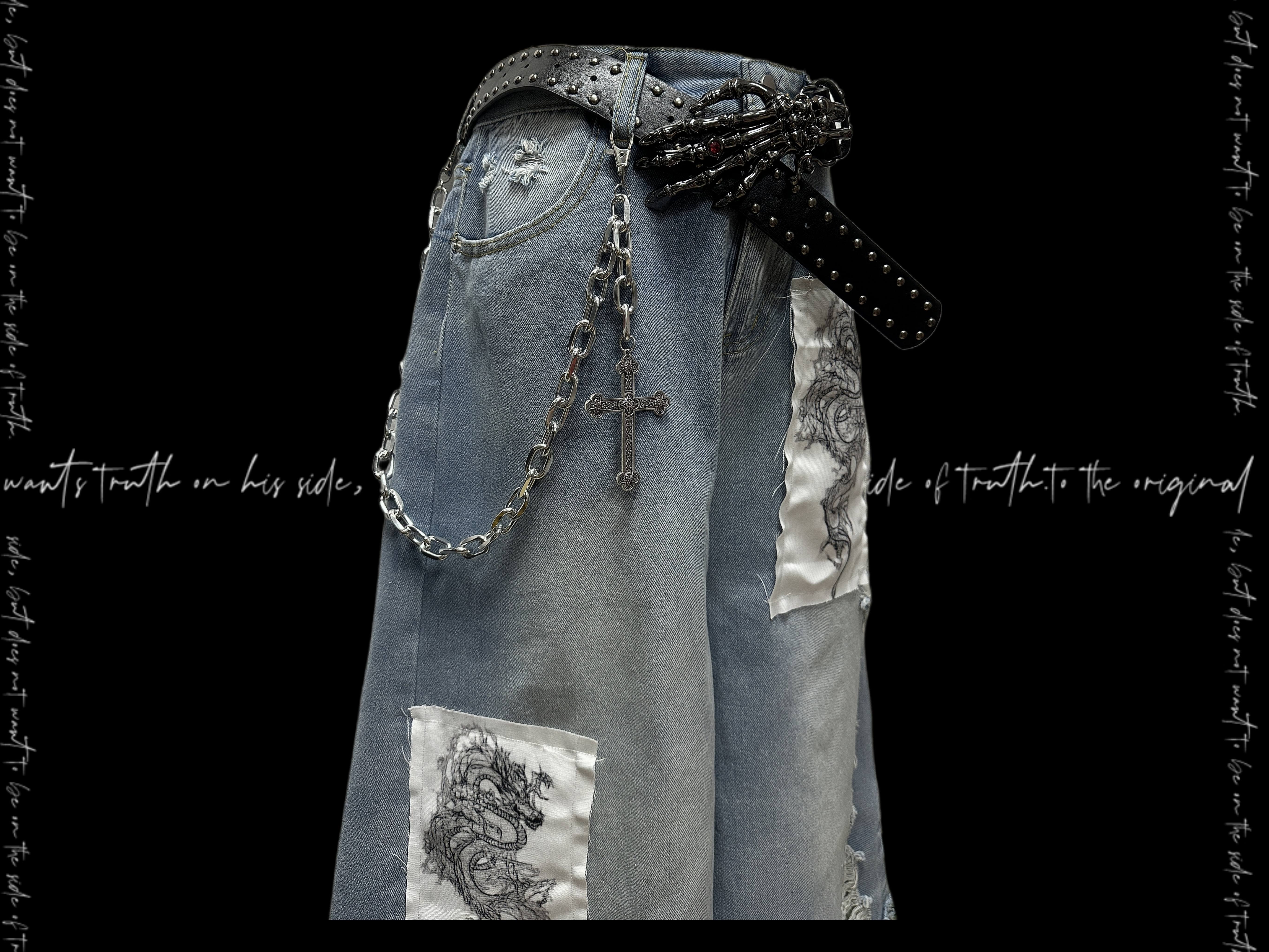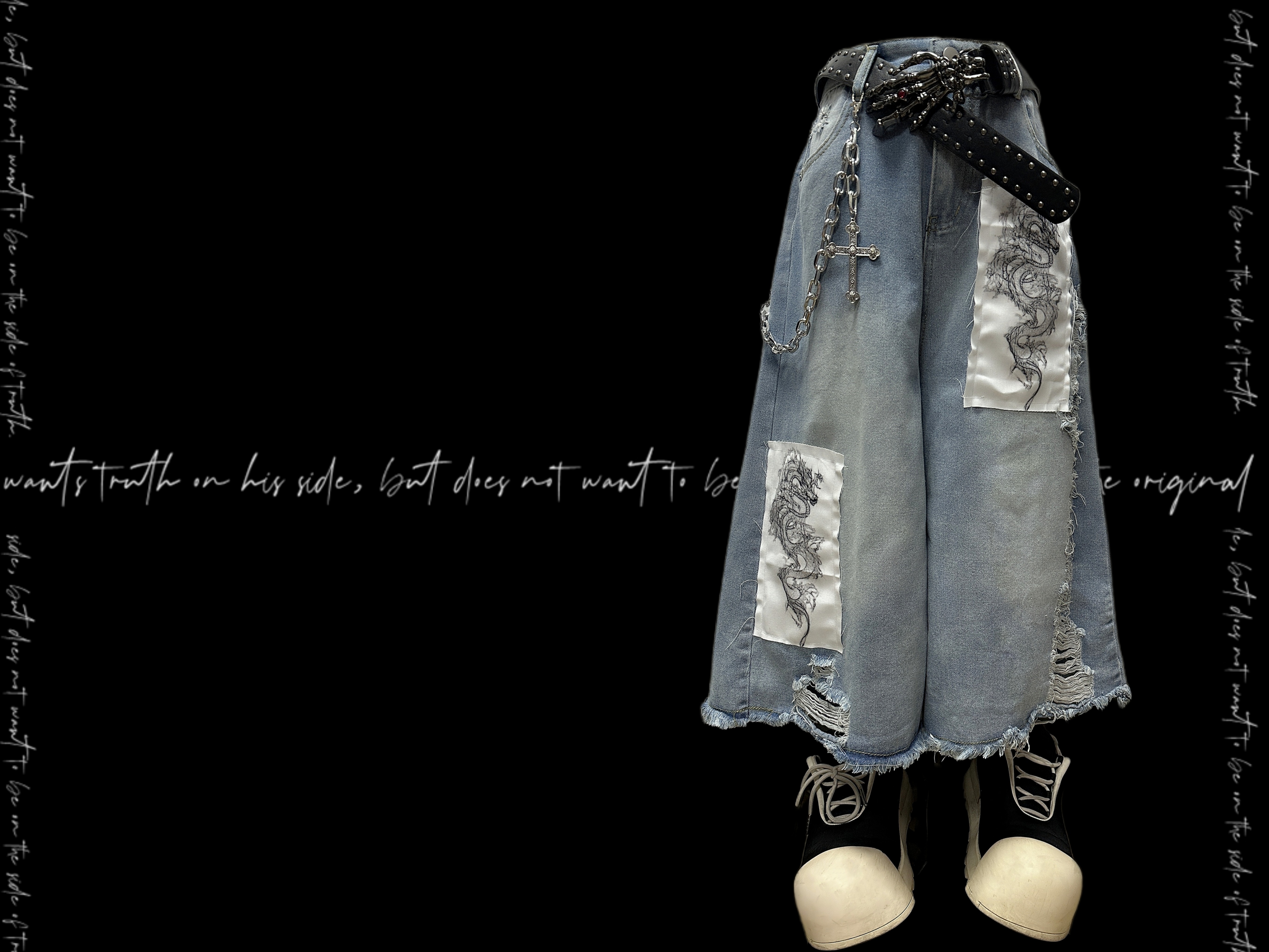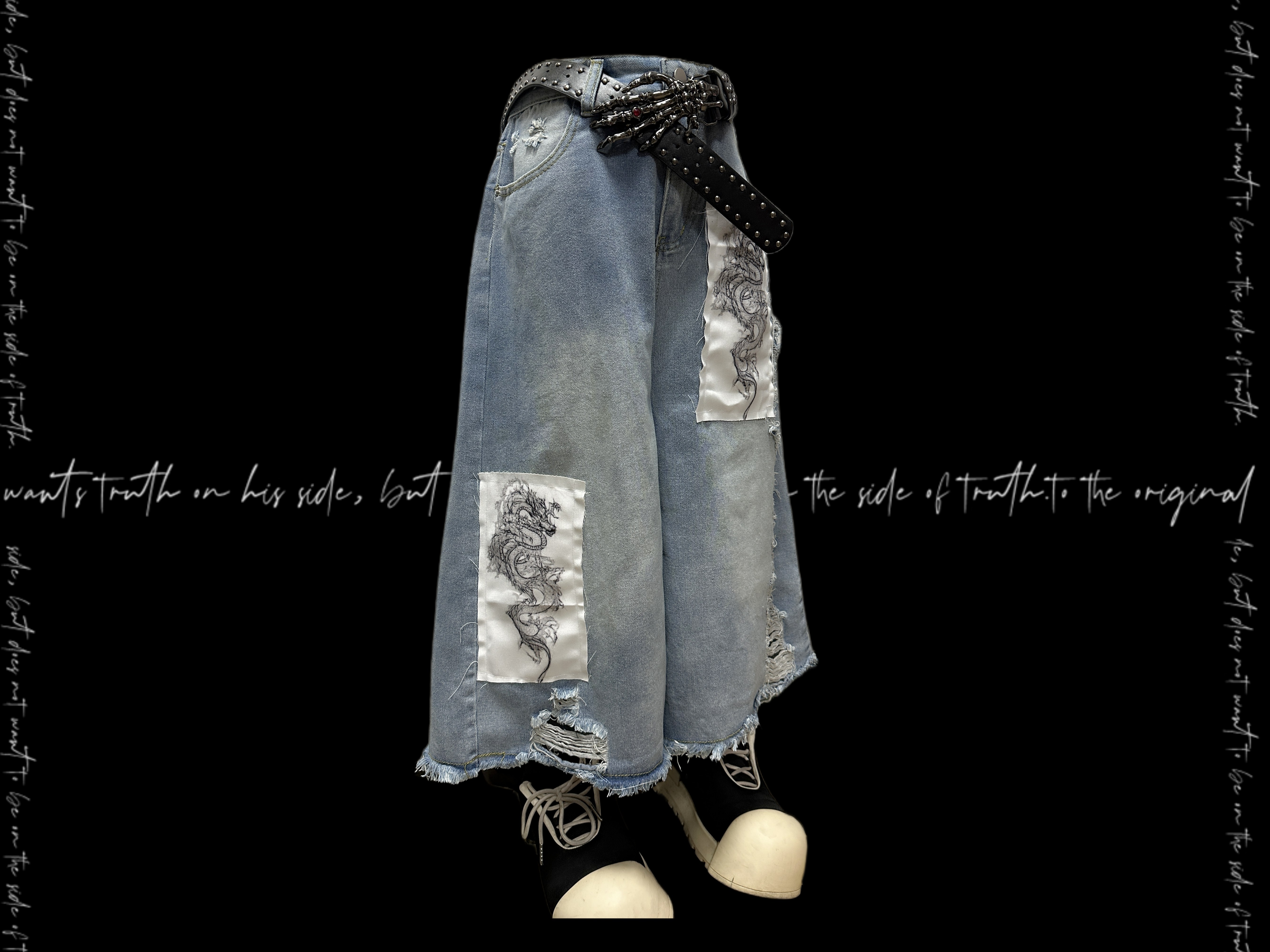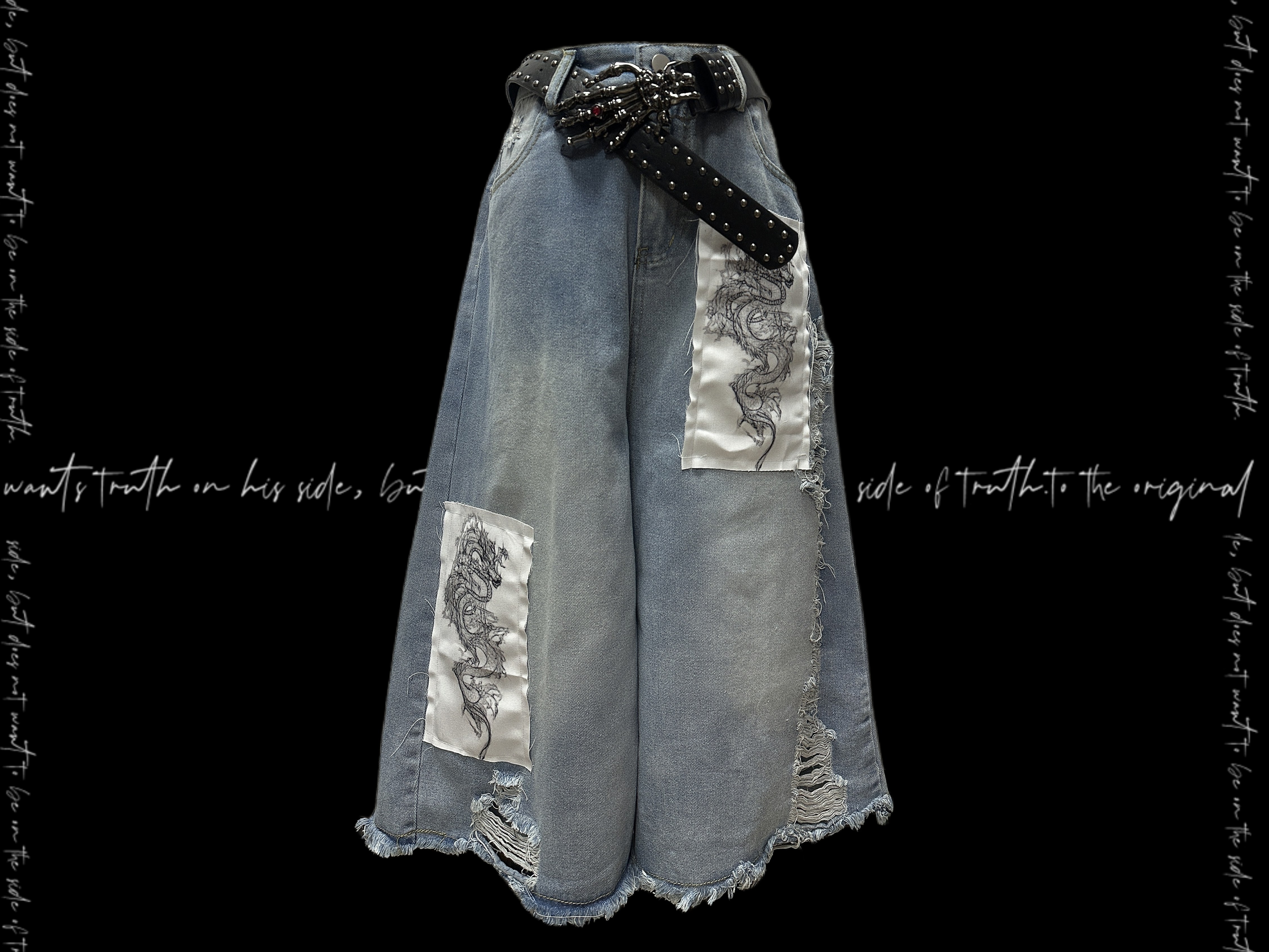 Patchwork Design Wide Leg Denim Half Jeans & Belt & Chain WN20112