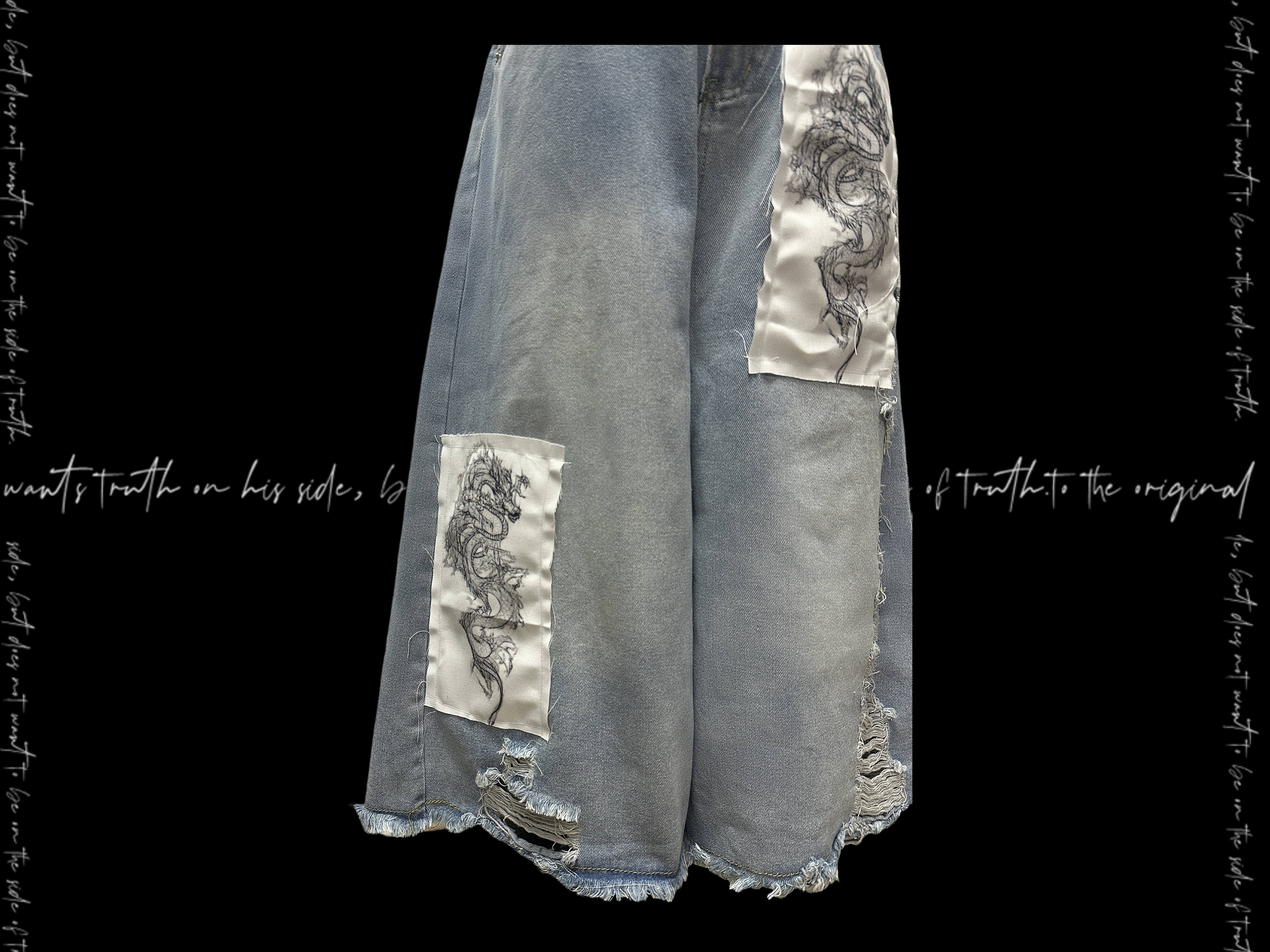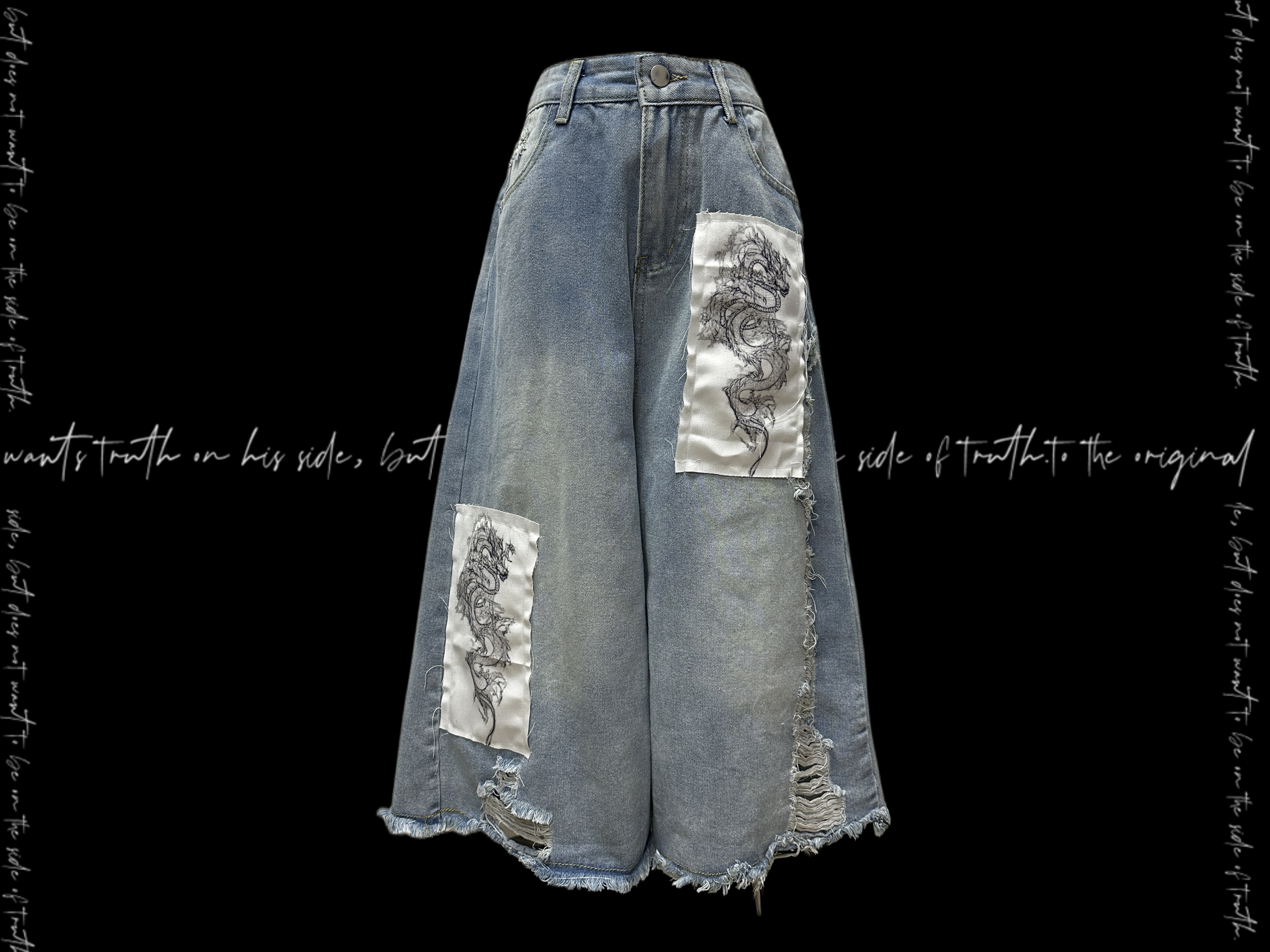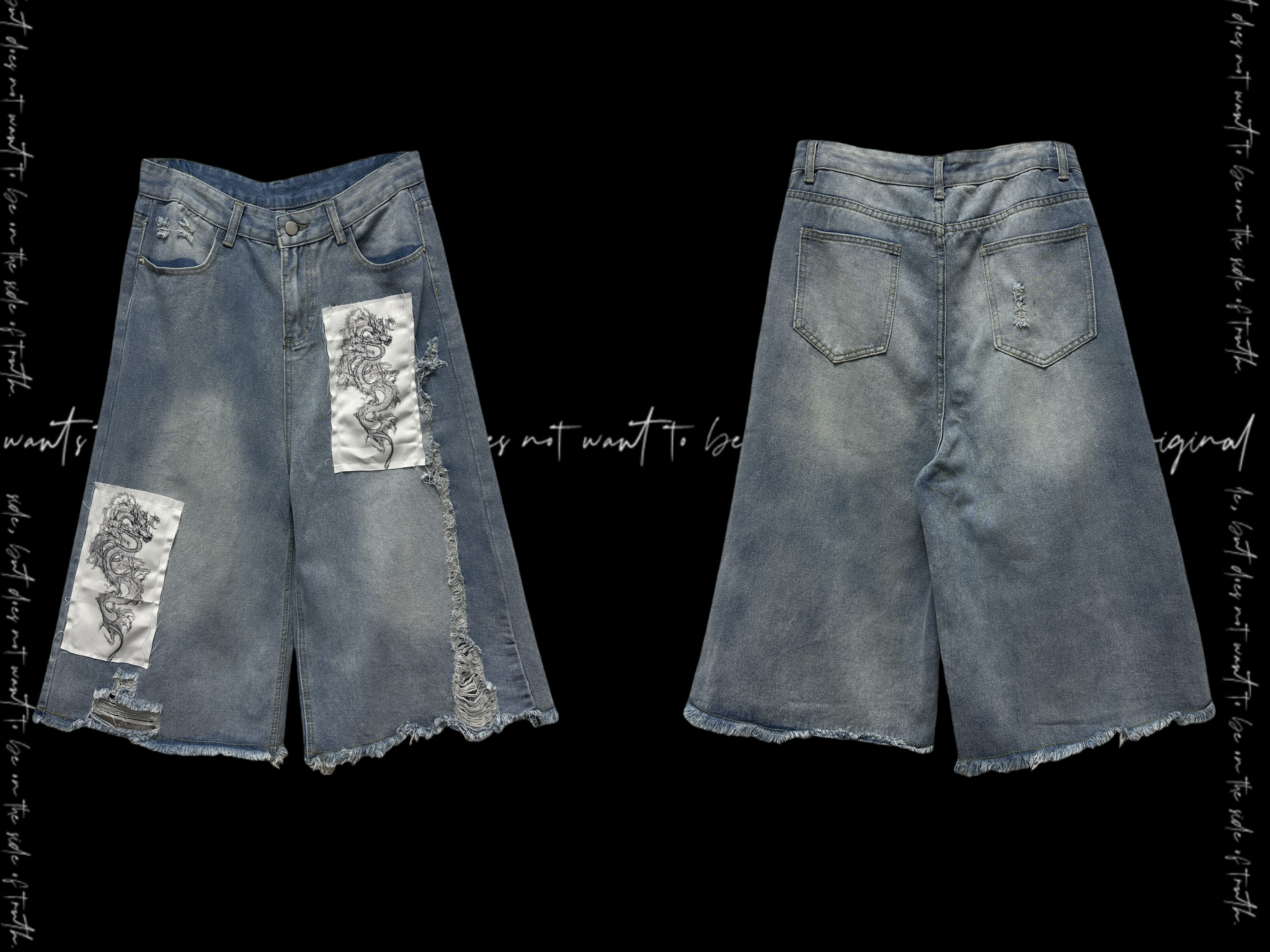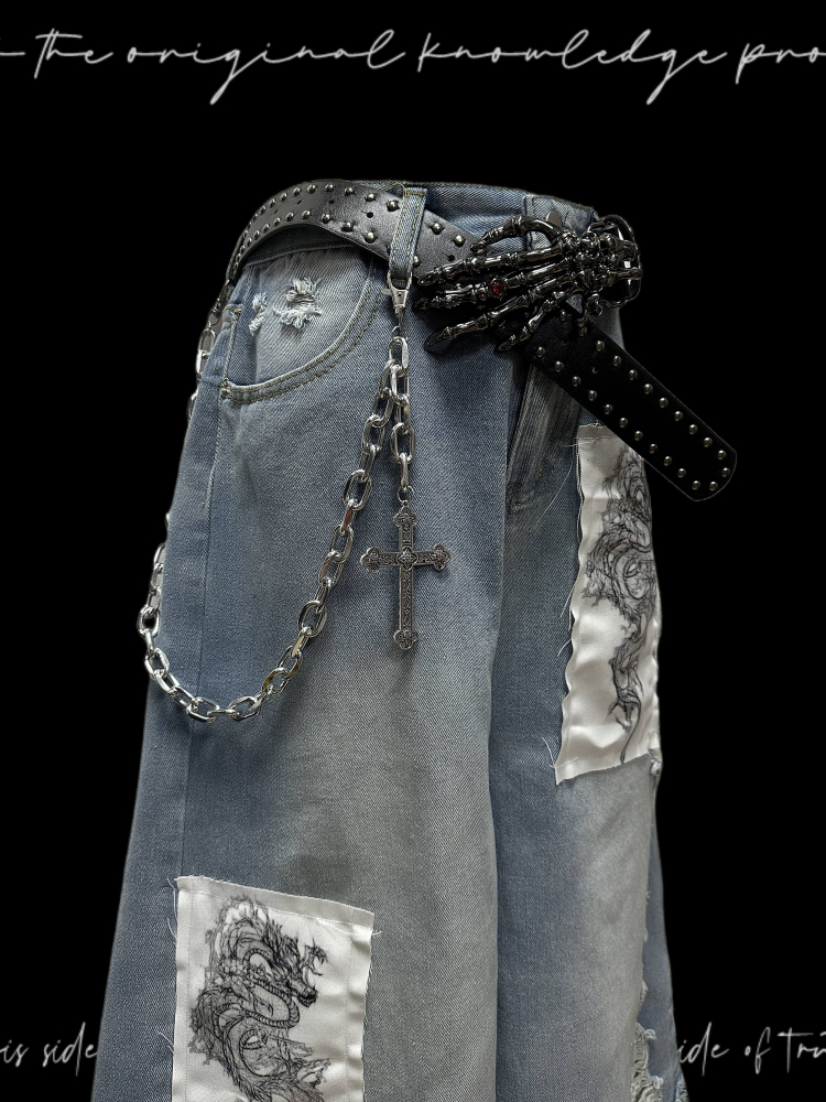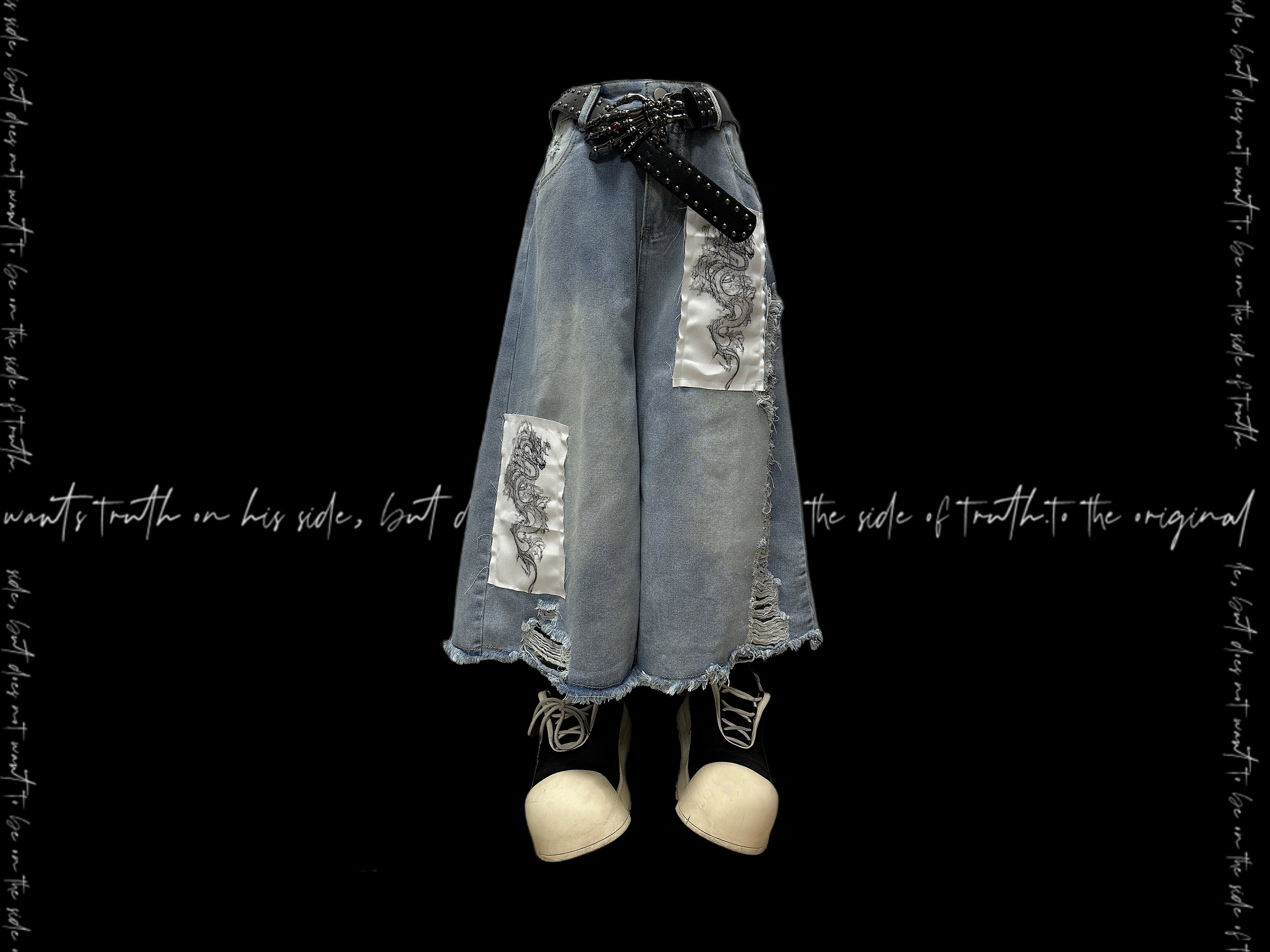 Patchwork Design Wide Leg Denim Half Jeans & Belt & Chain WN20112