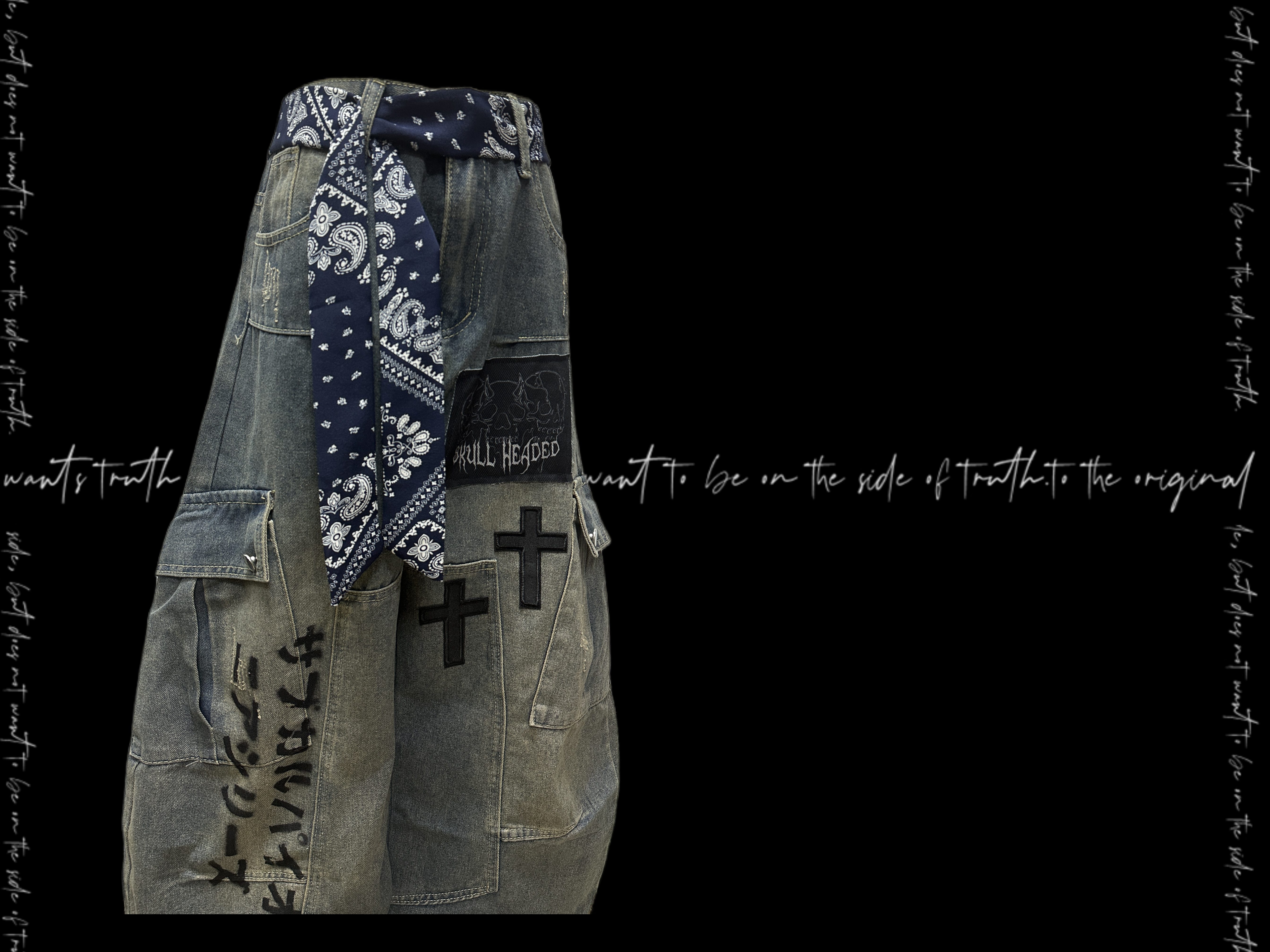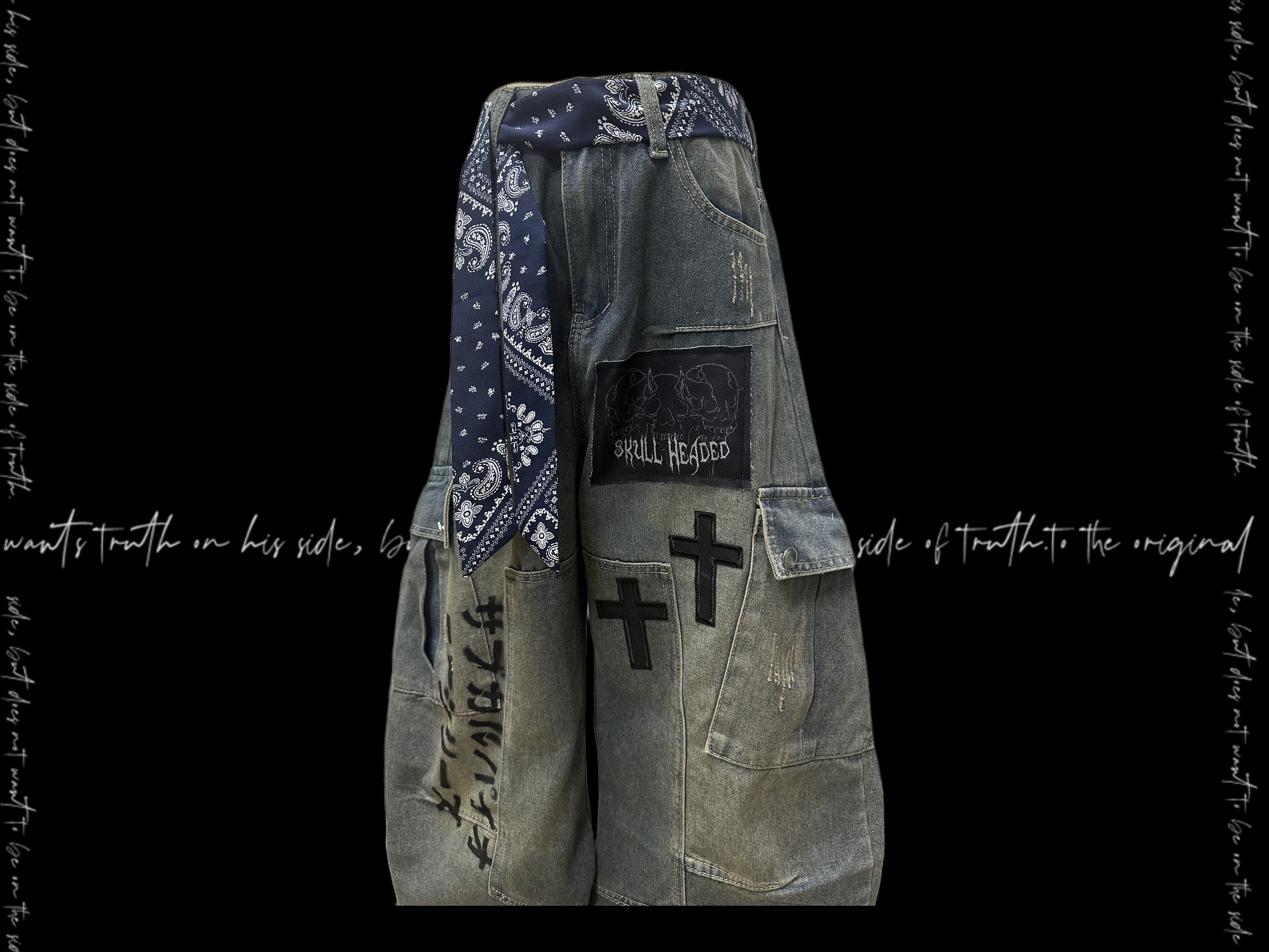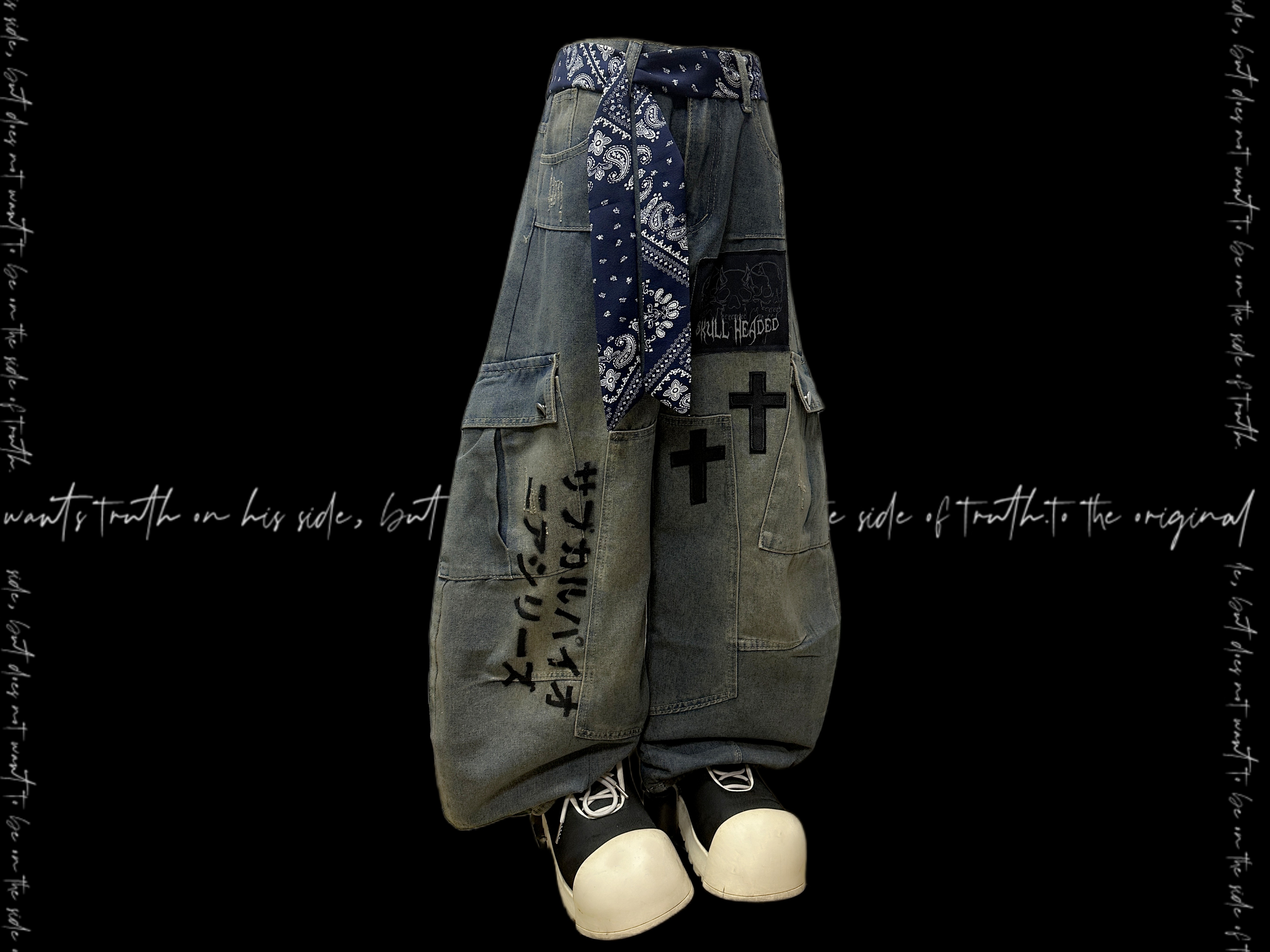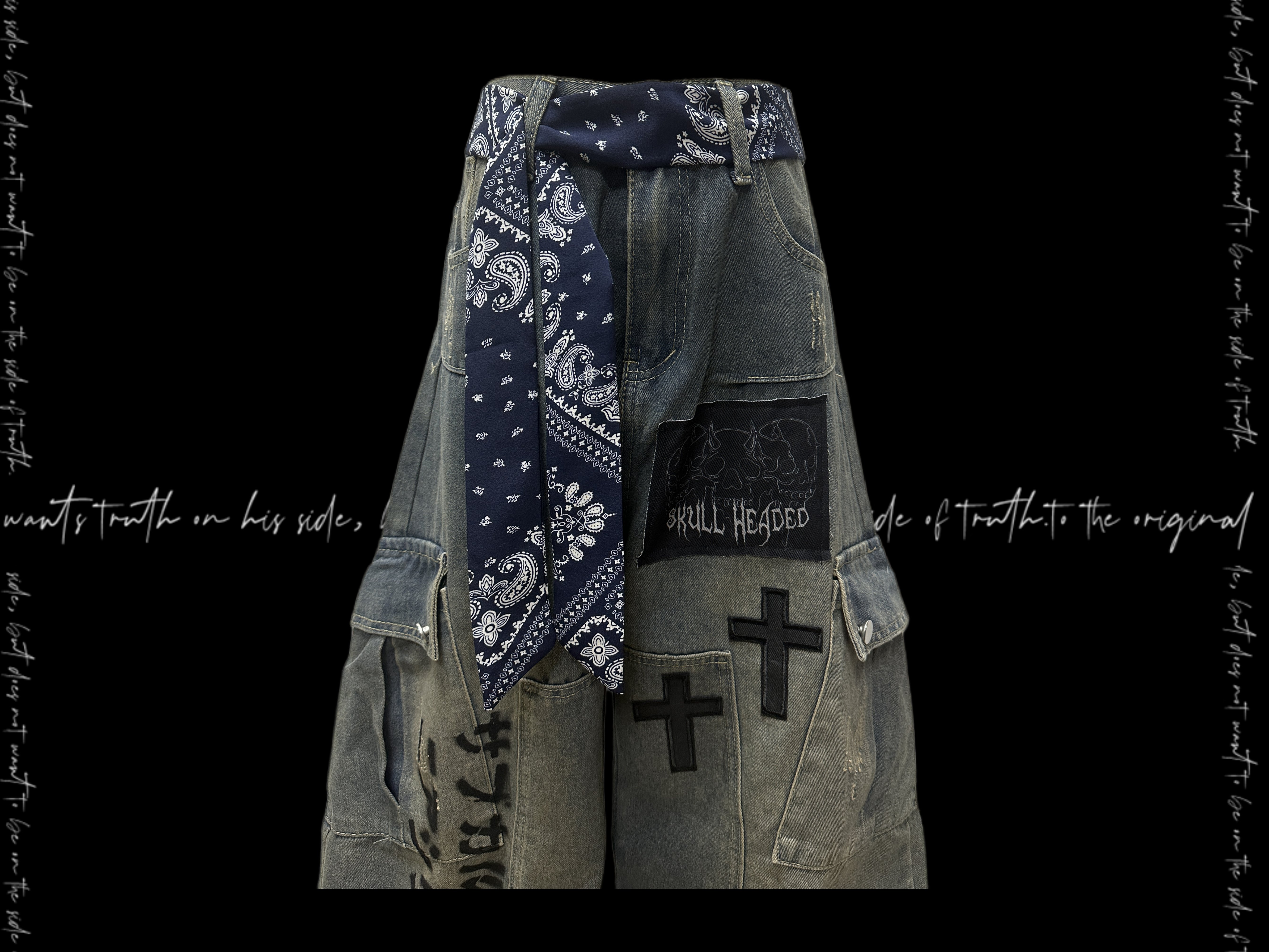 Letter Print Patchwork Cargo Wide Leg Denim Jeans & Belt & Chain & Scarf WN20123