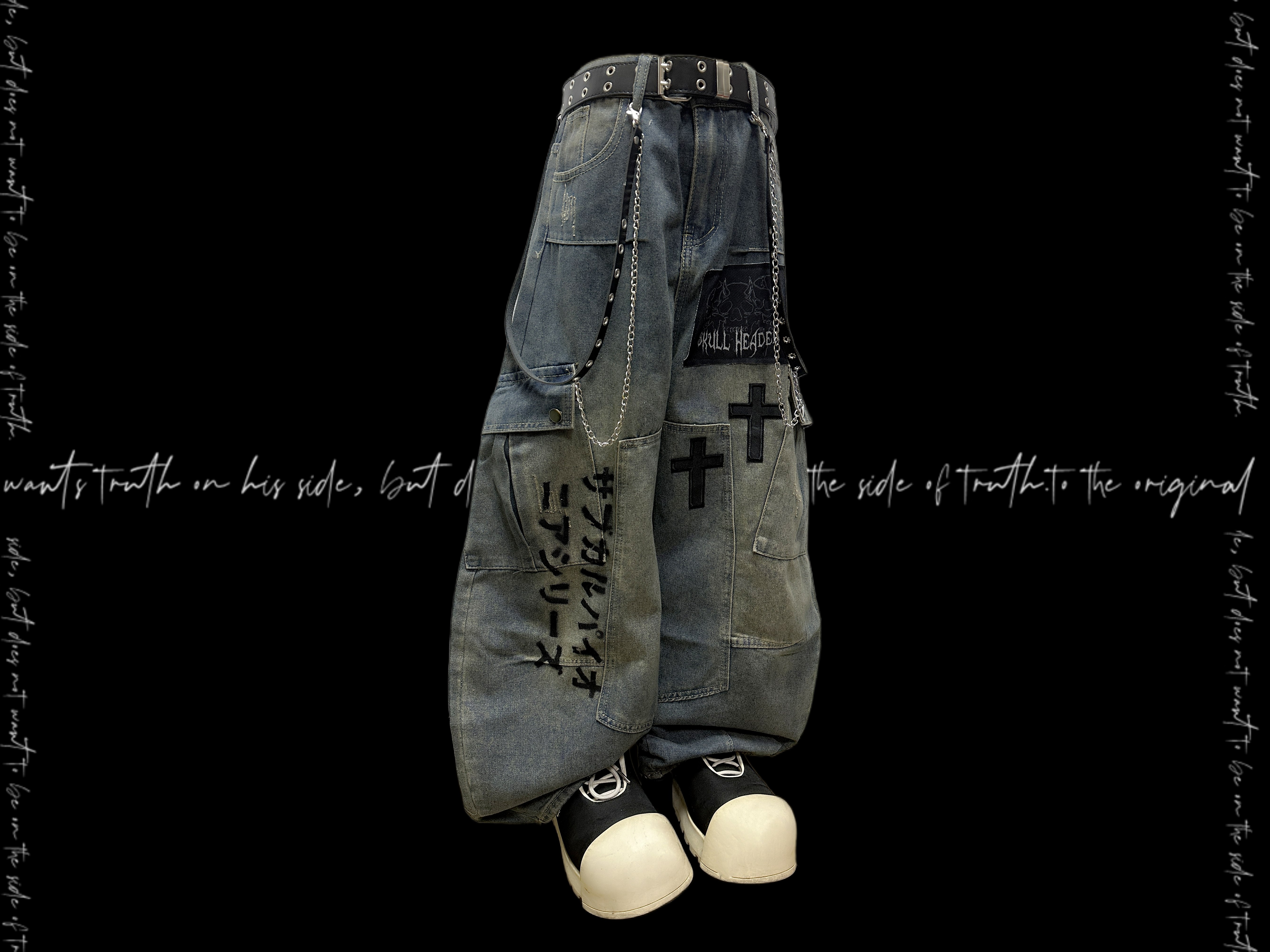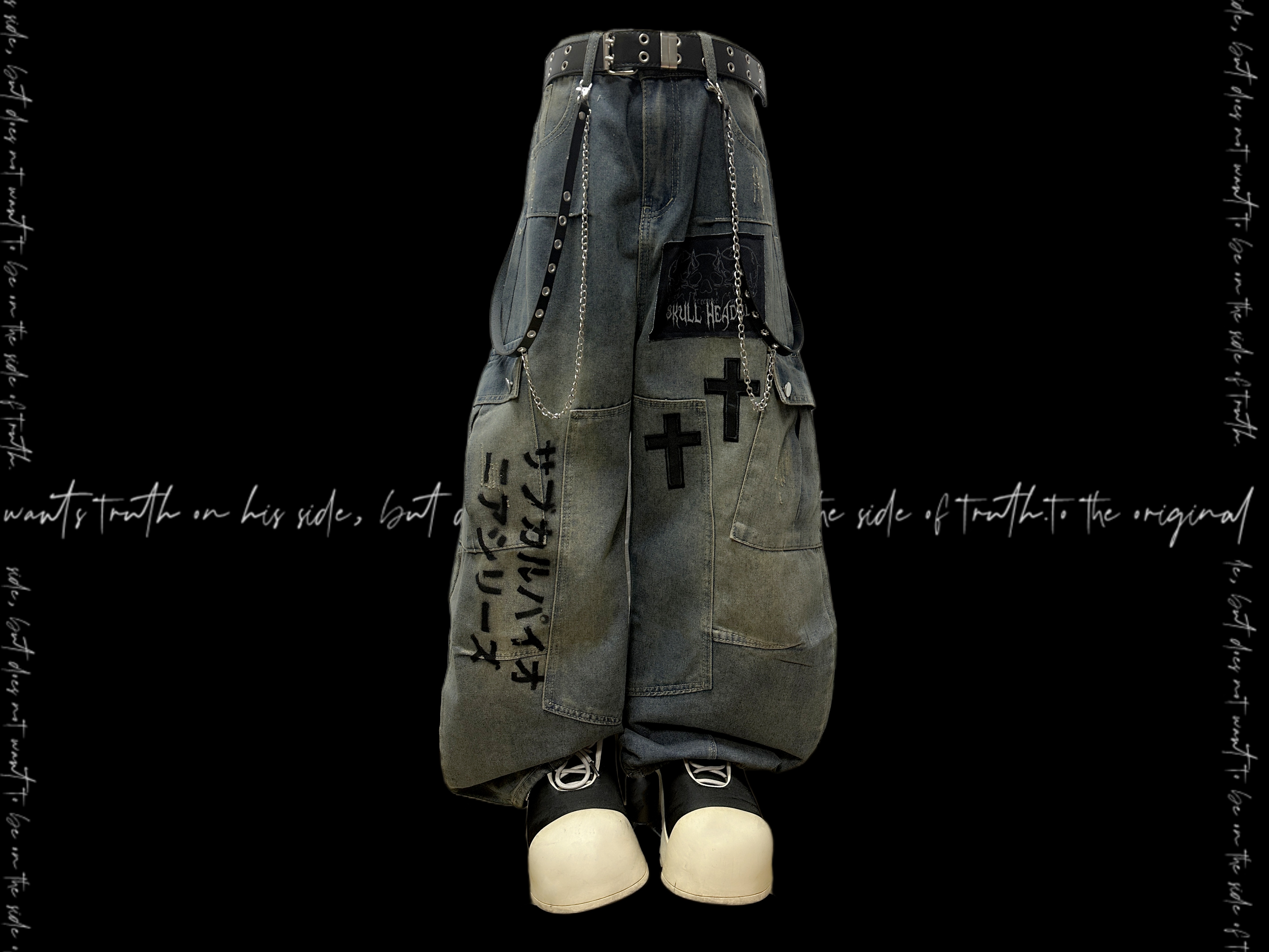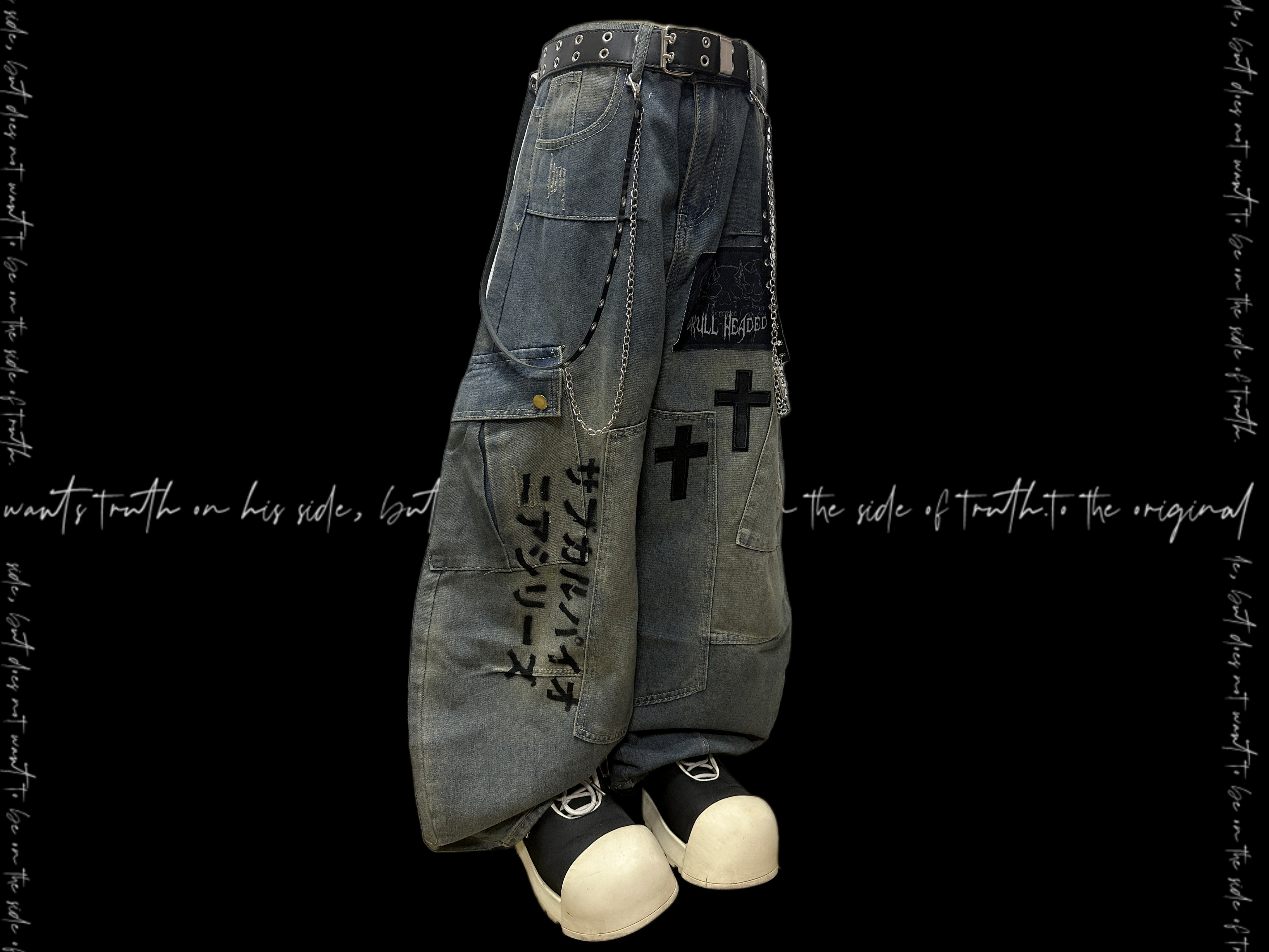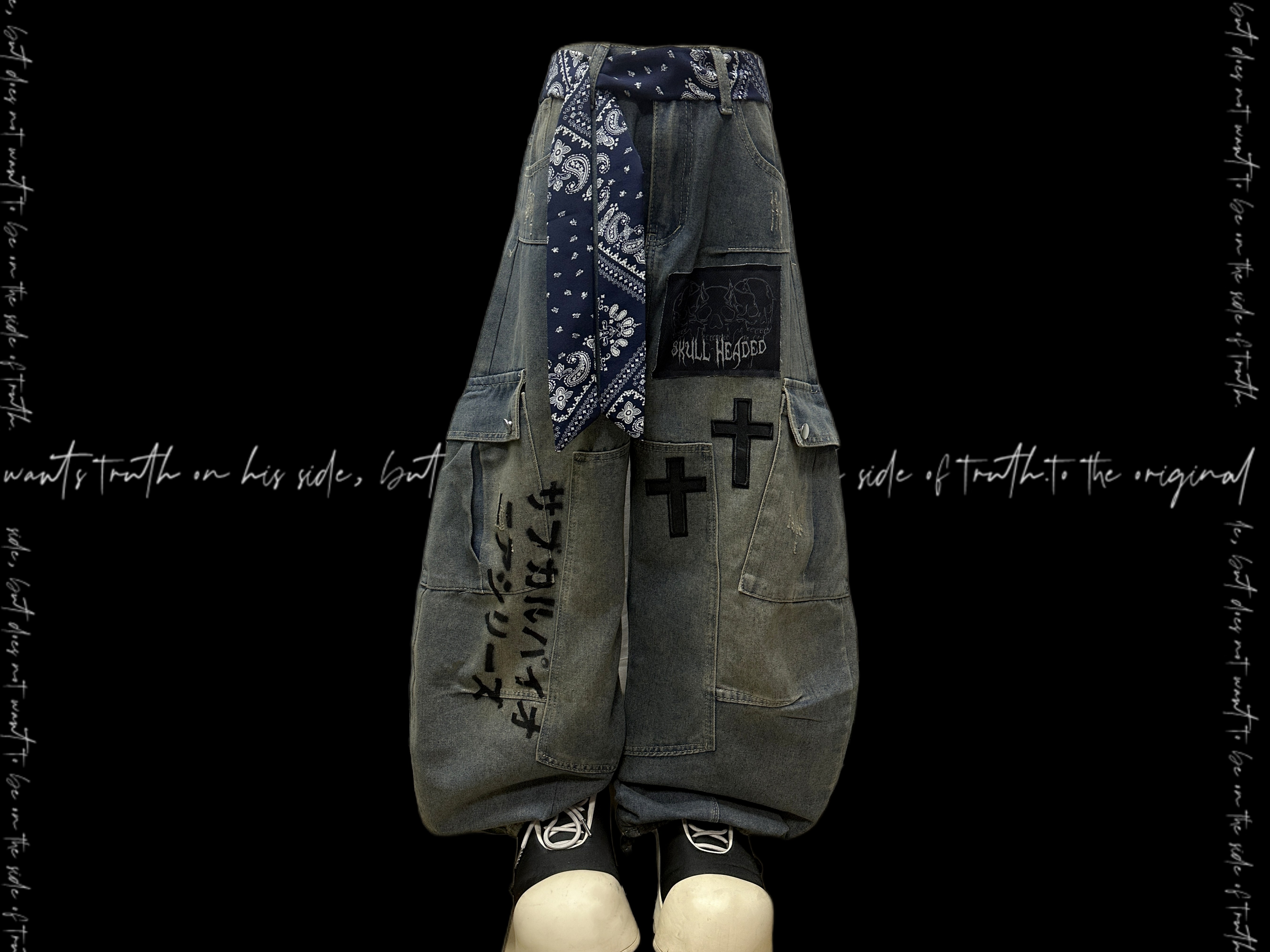 Letter Print Patchwork Cargo Wide Leg Denim Jeans & Belt & Chain & Scarf WN20123