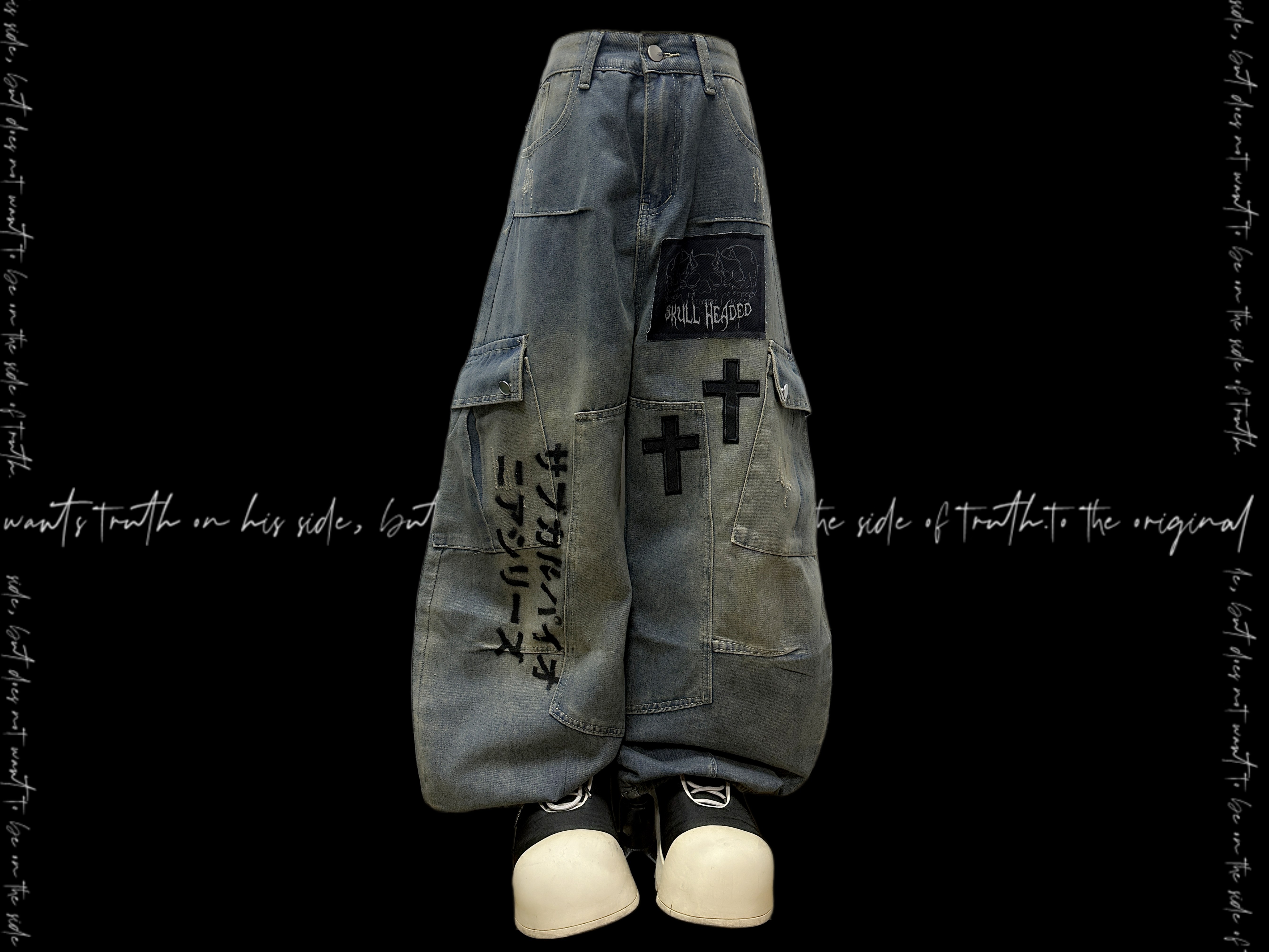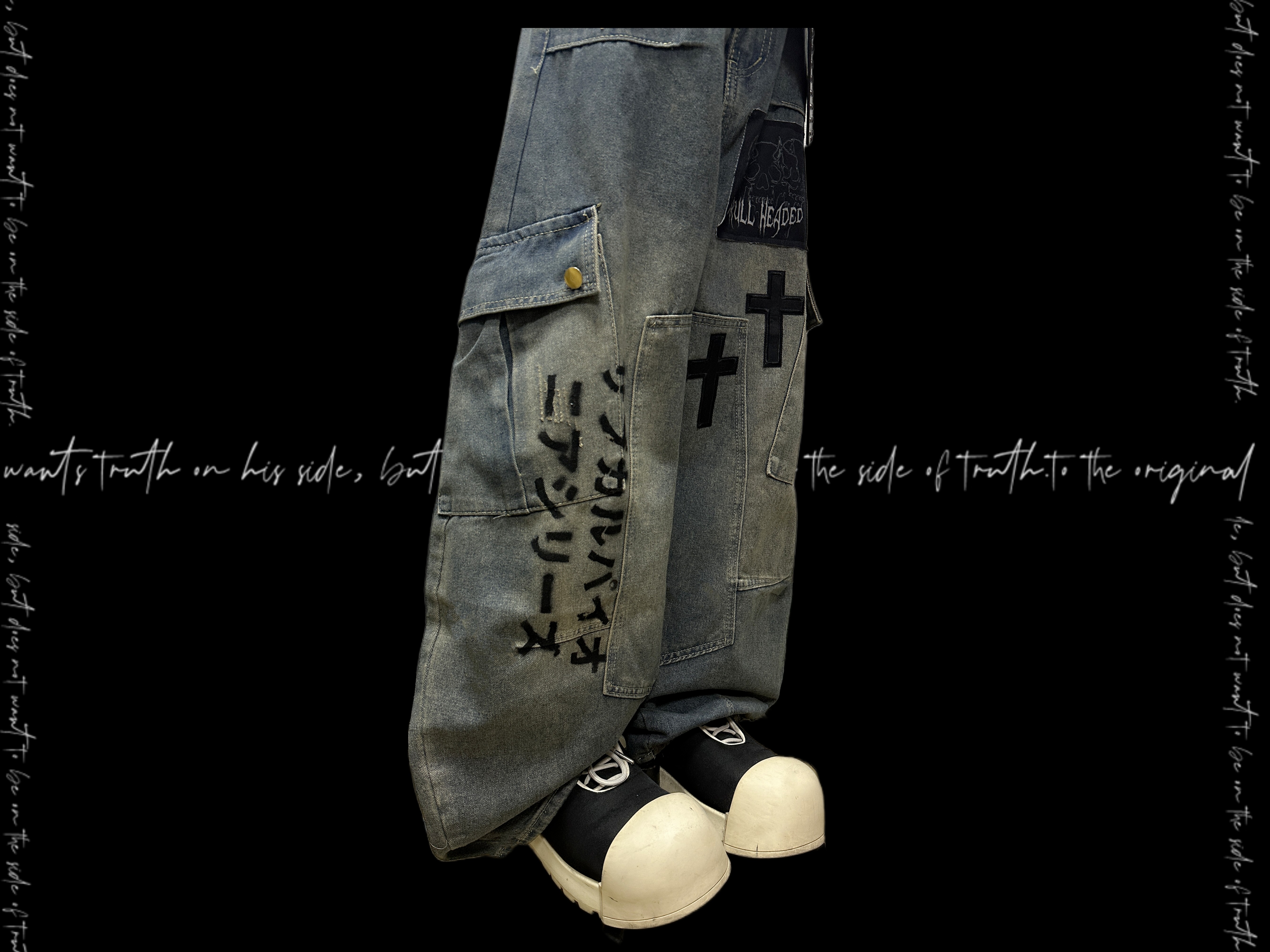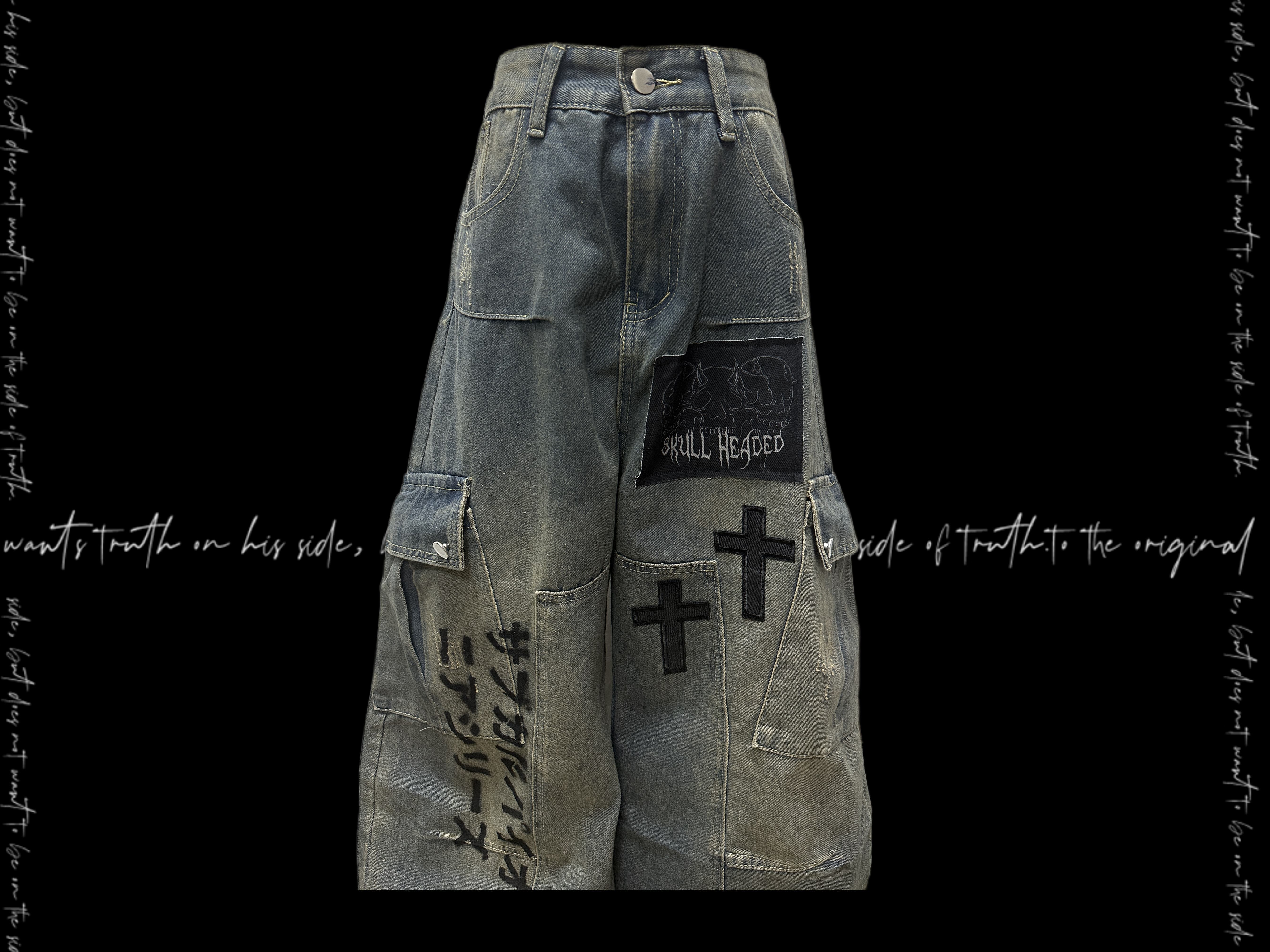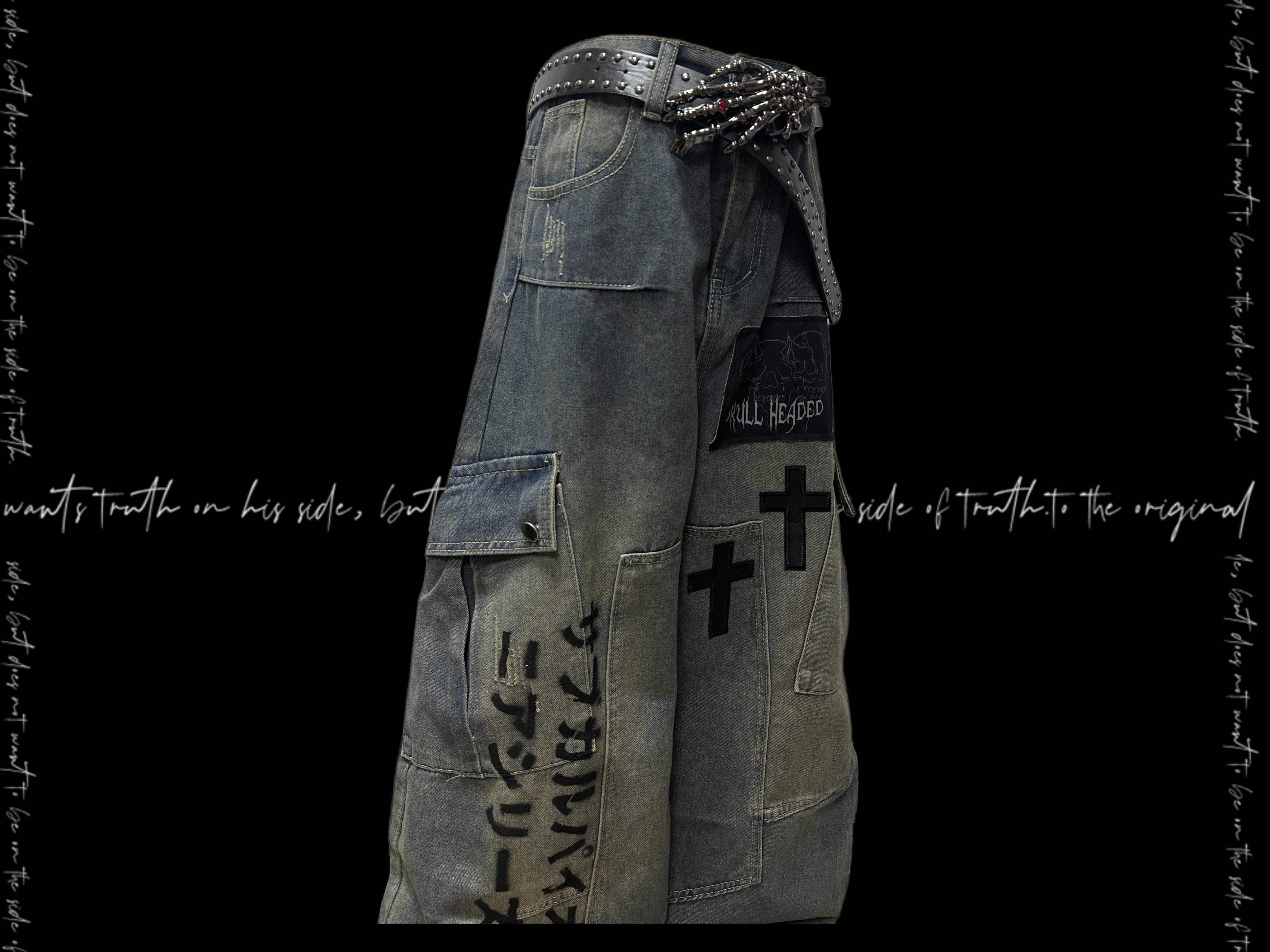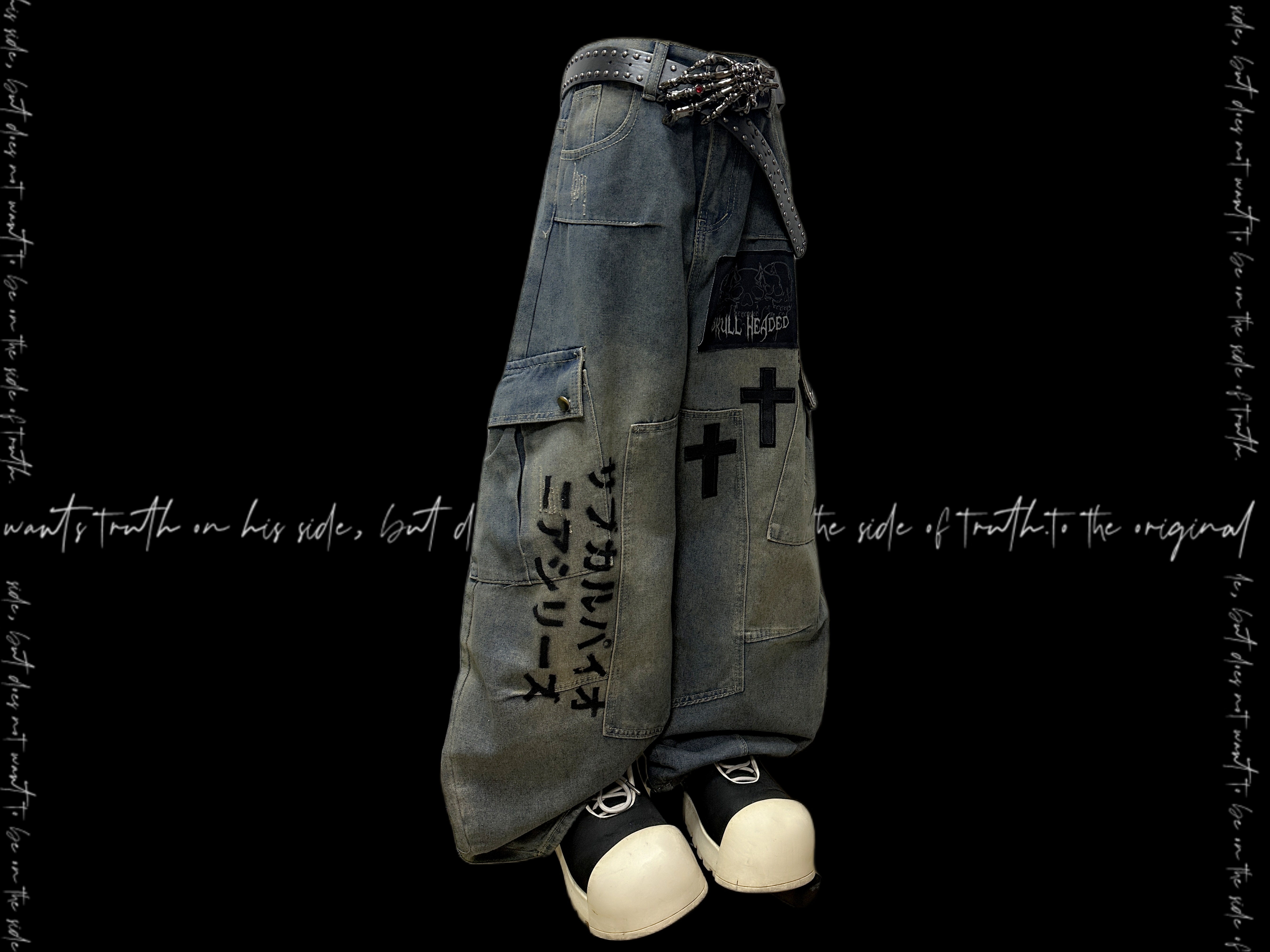 Letter Print Patchwork Cargo Wide Leg Denim Jeans & Belt & Chain & Scarf WN20123