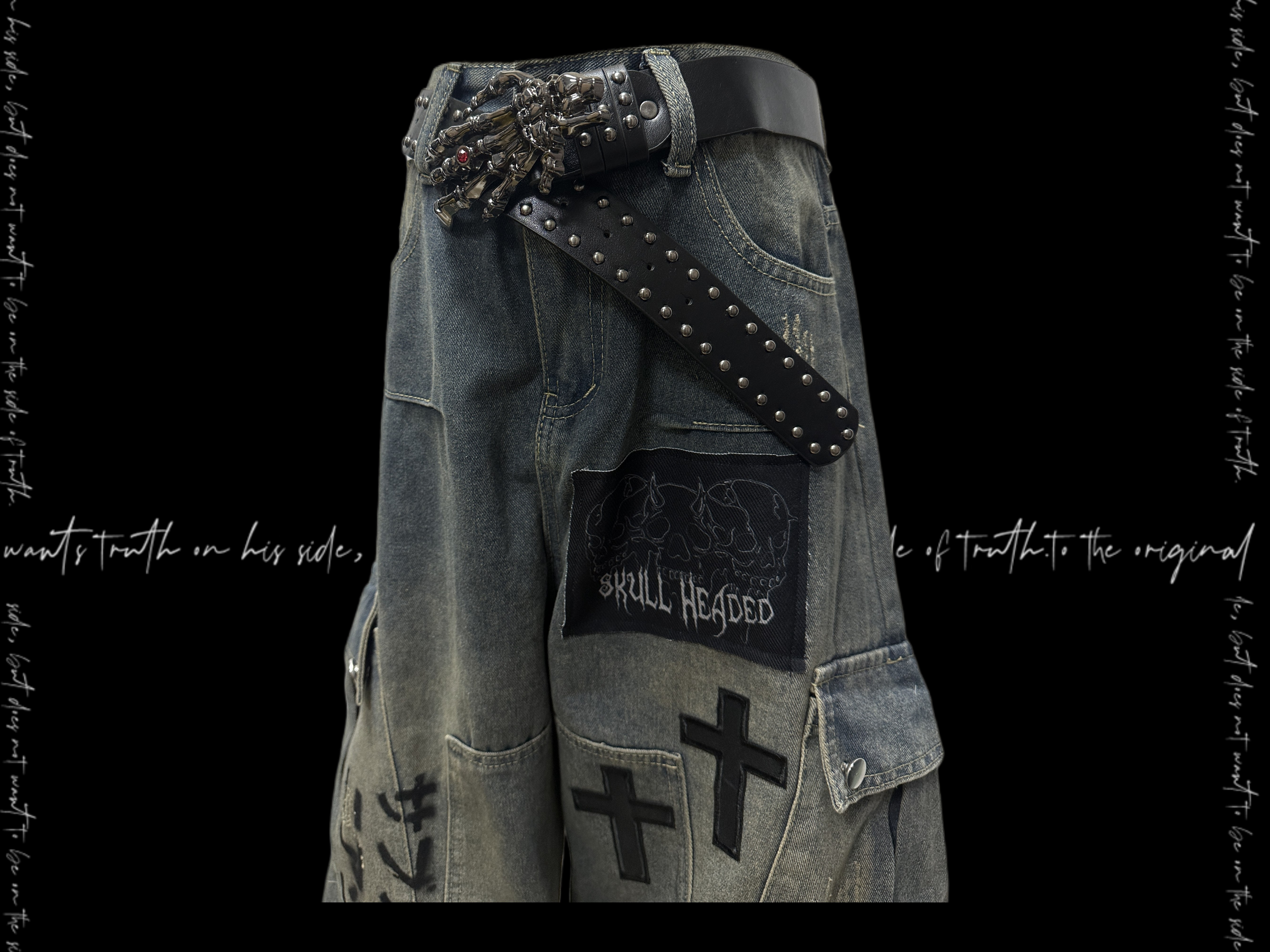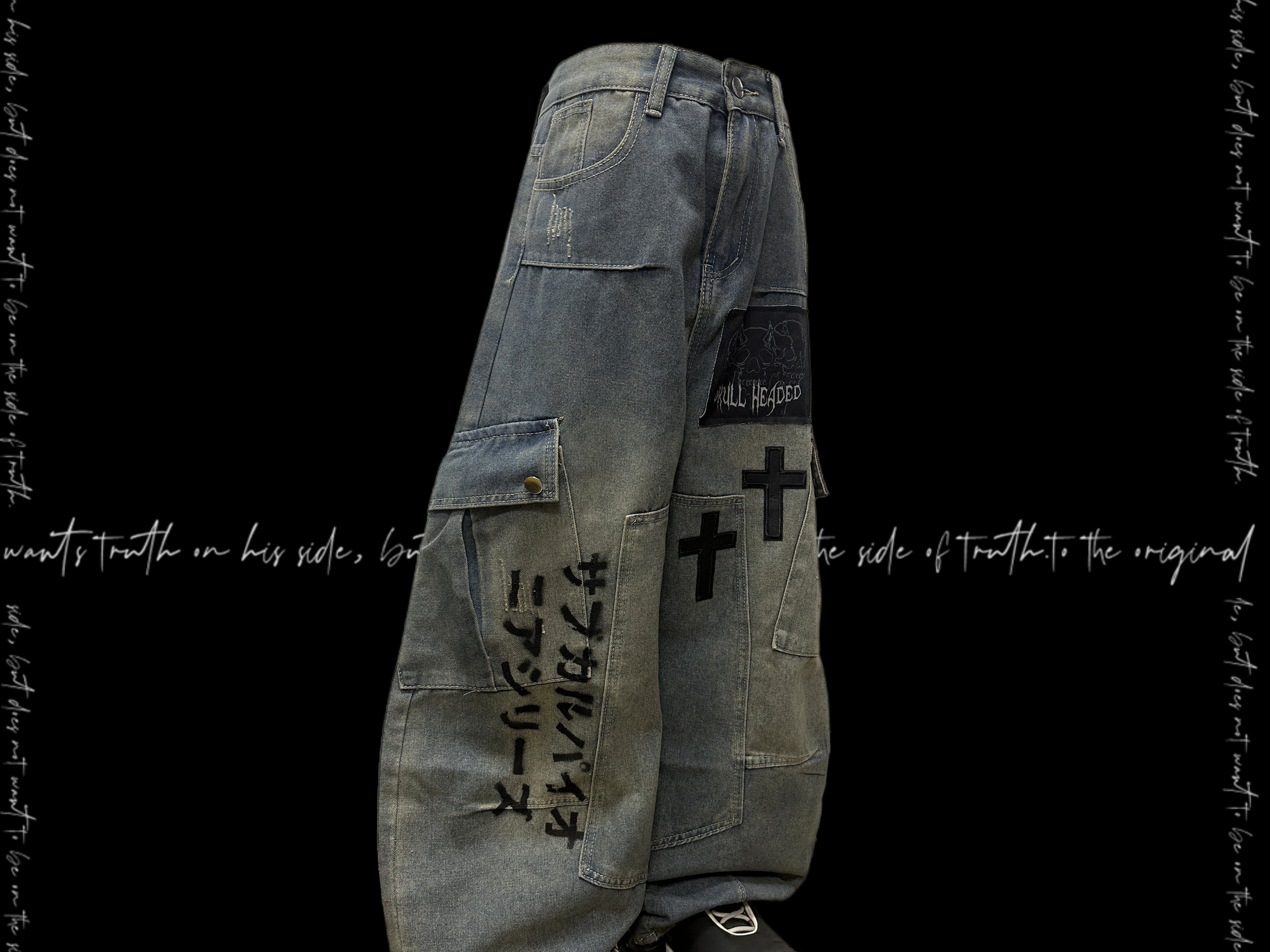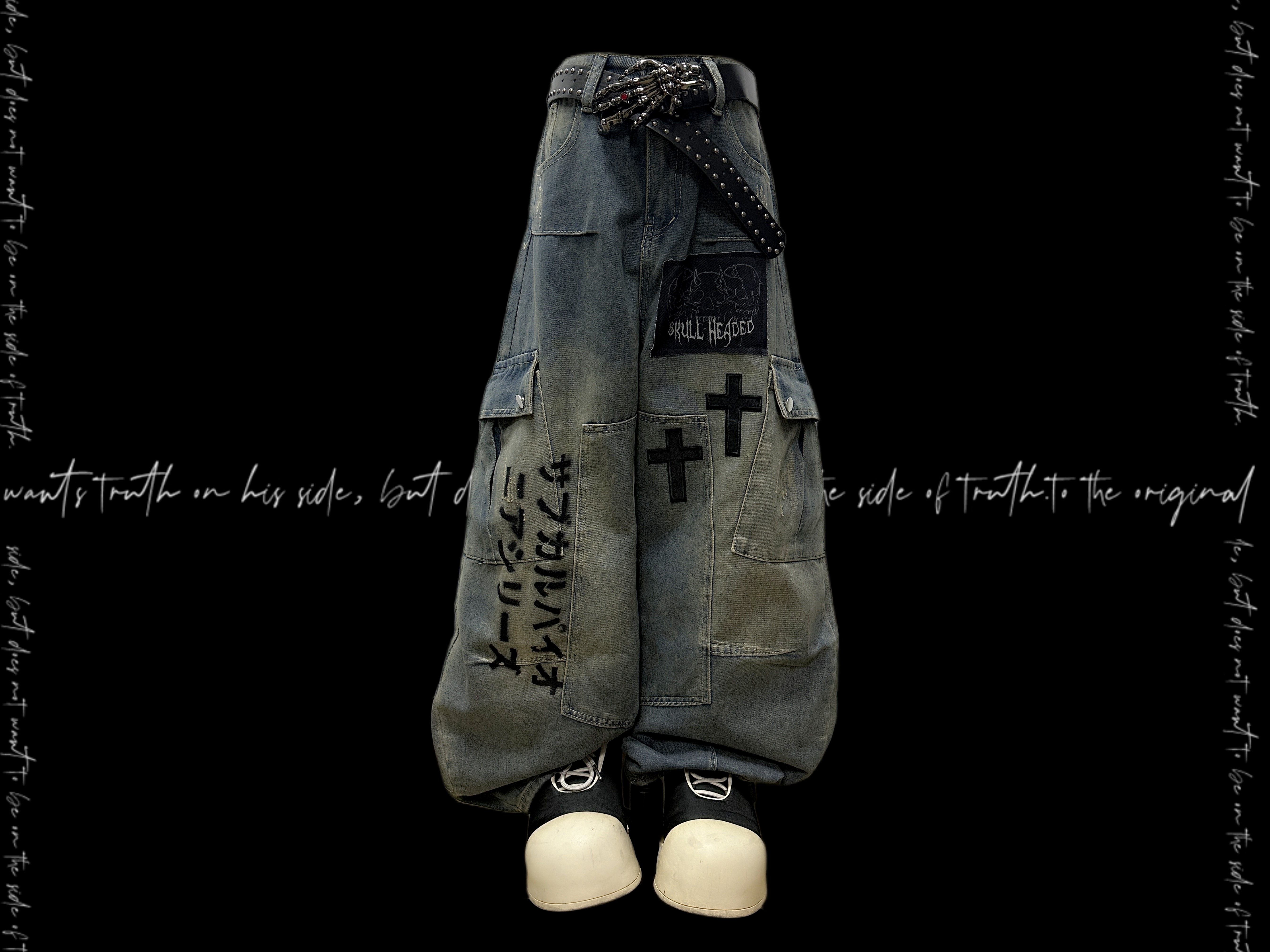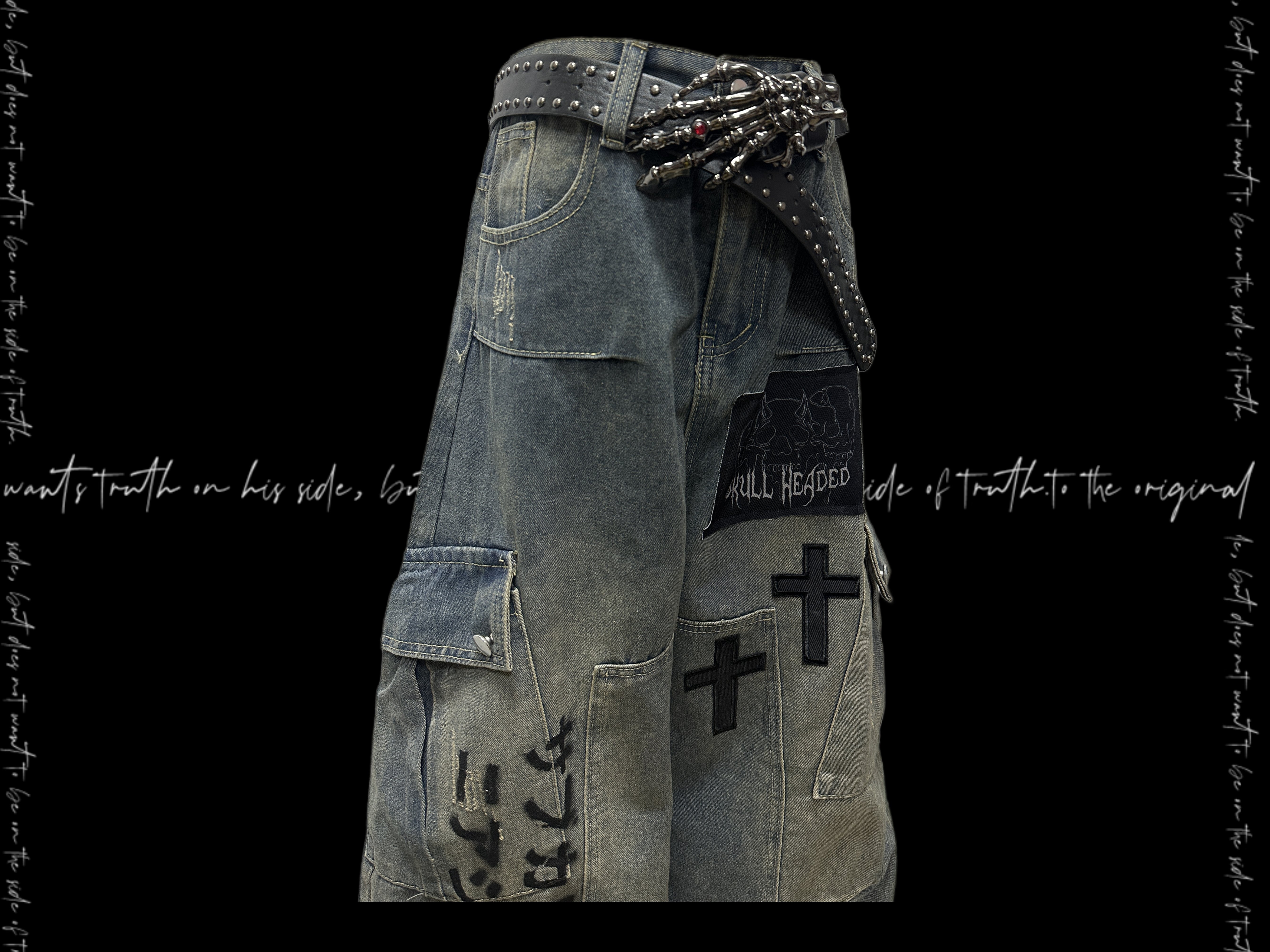 Letter Print Patchwork Cargo Wide Leg Denim Jeans & Belt & Chain & Scarf WN20123