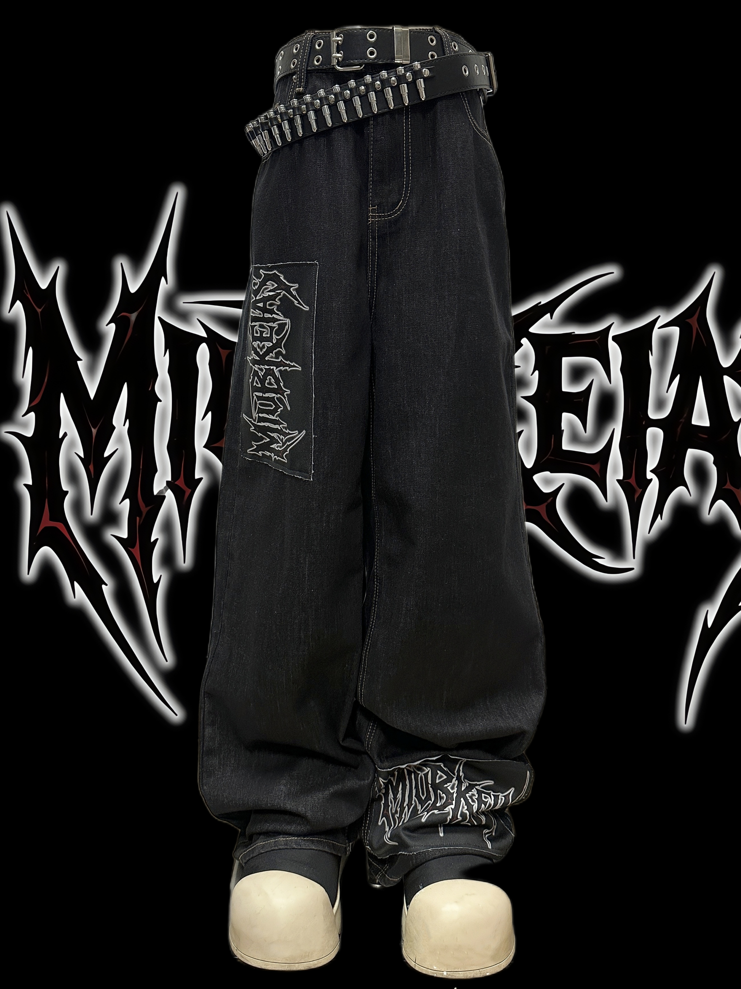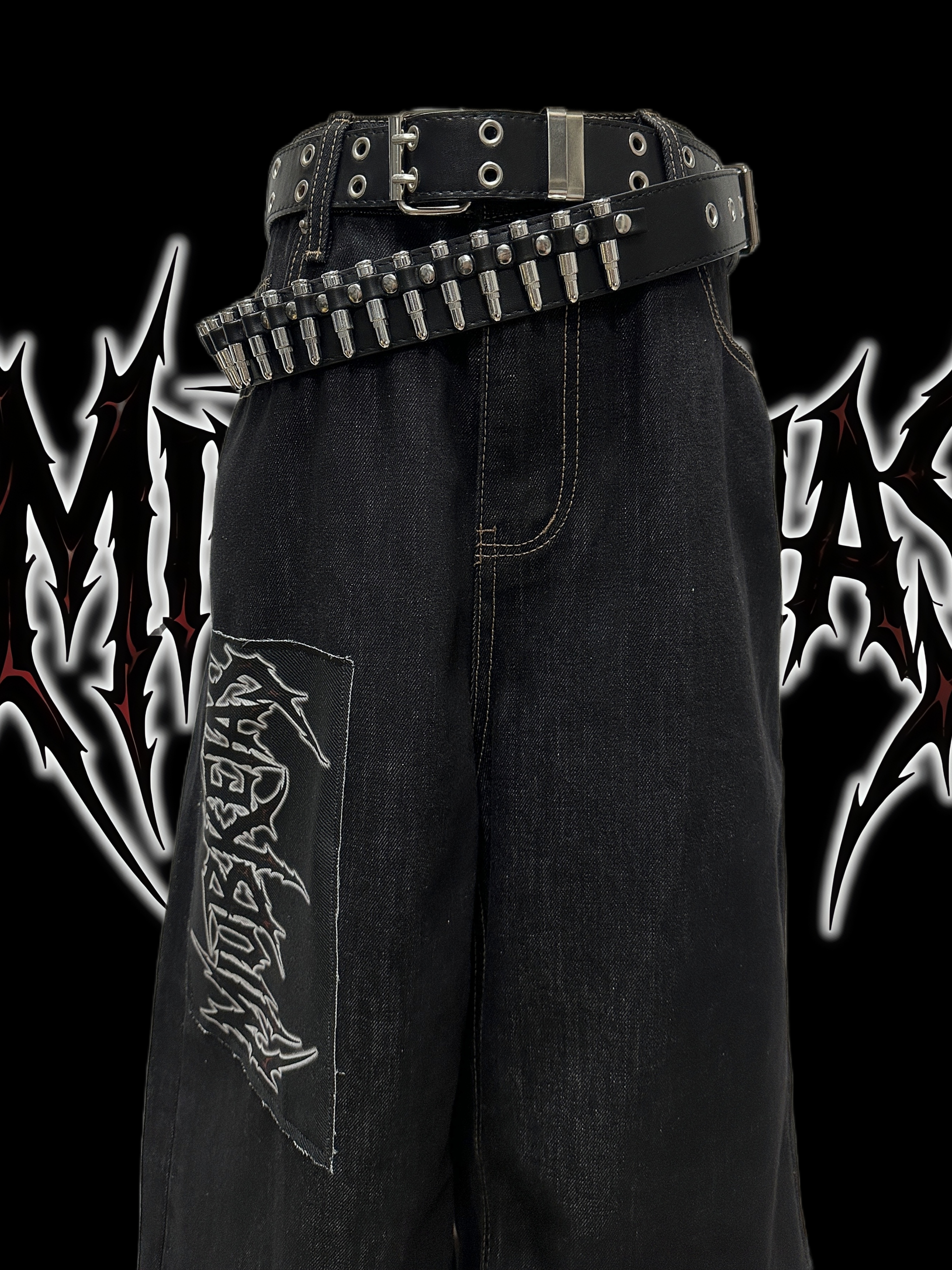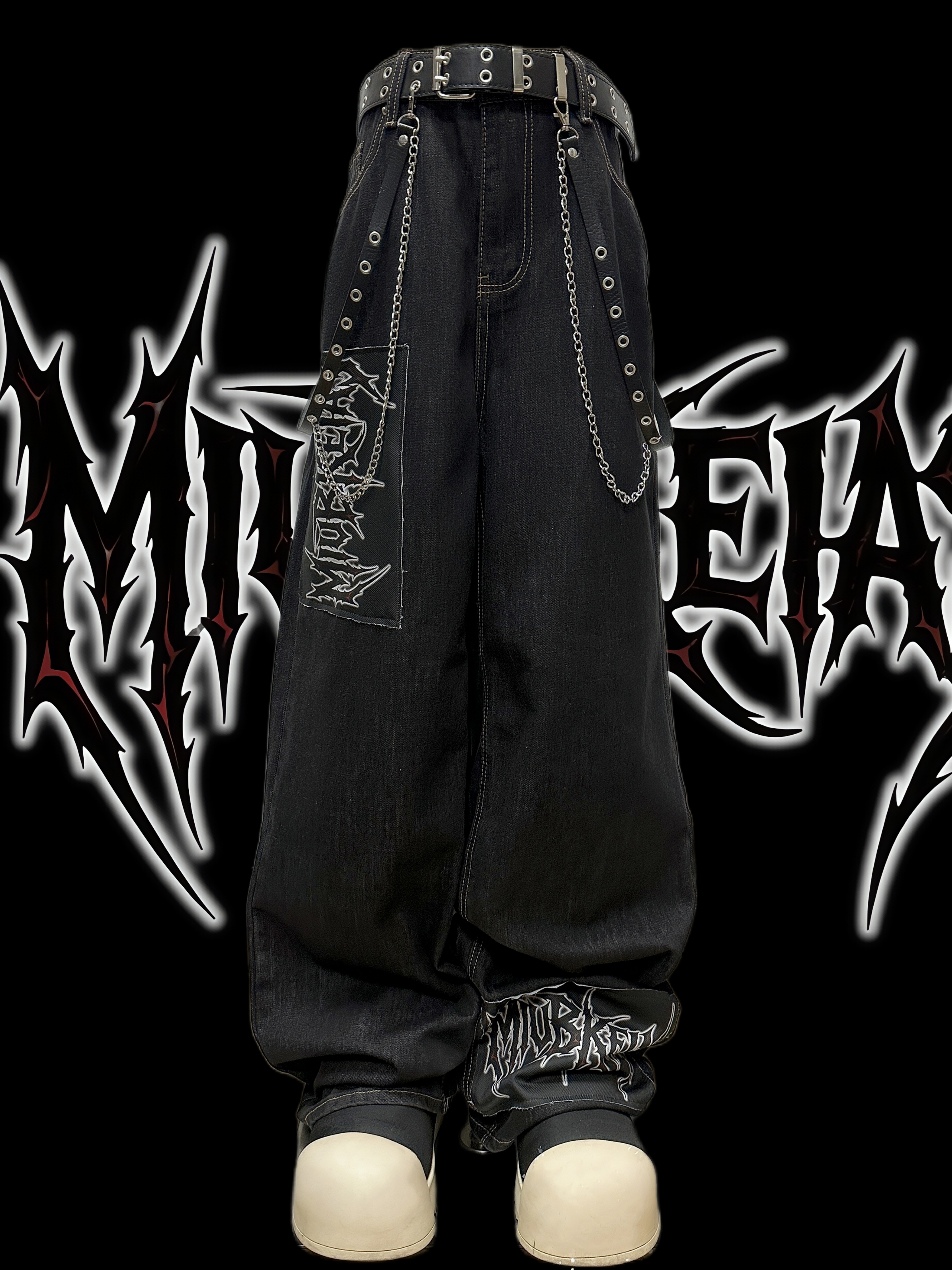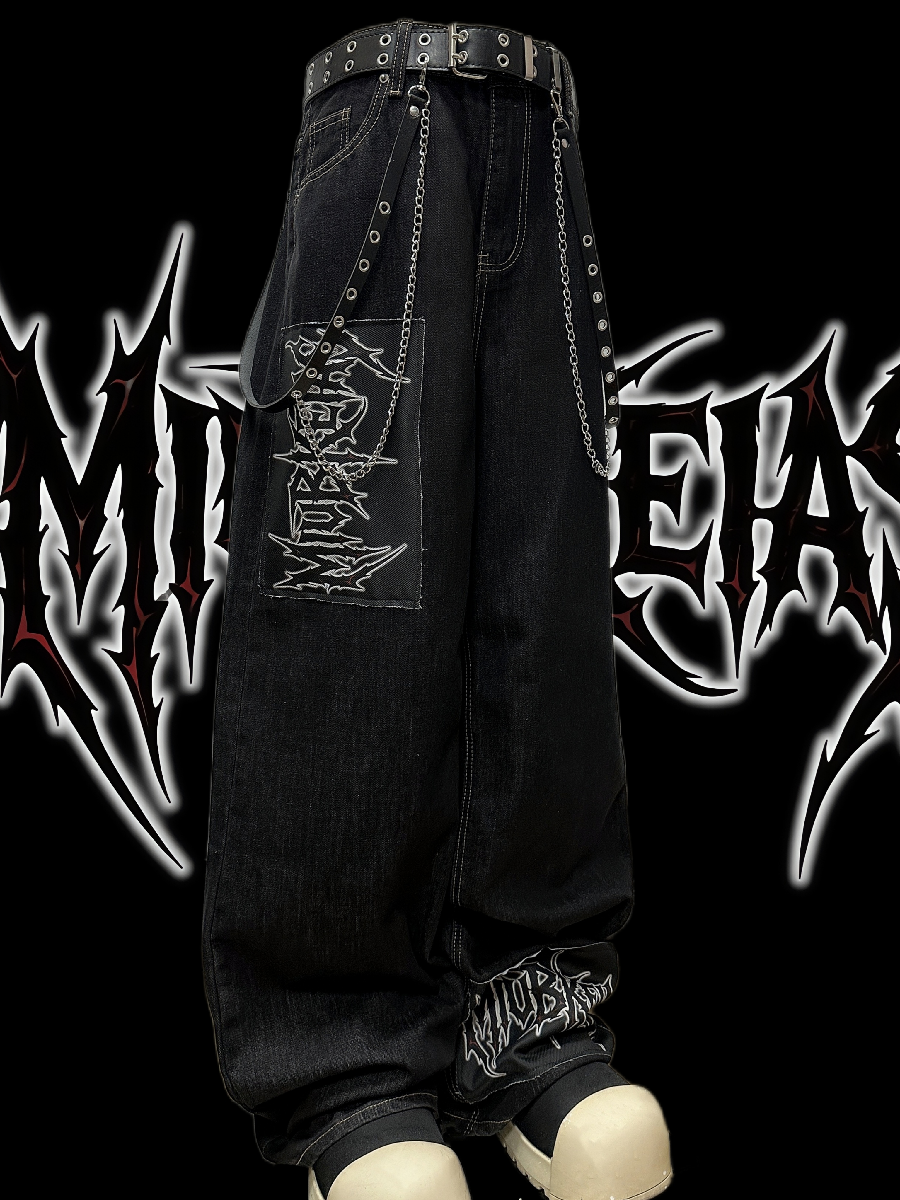 Graphic Letter Patchwork Wide Leg Denim Jeans & Belt & Chain WN20137