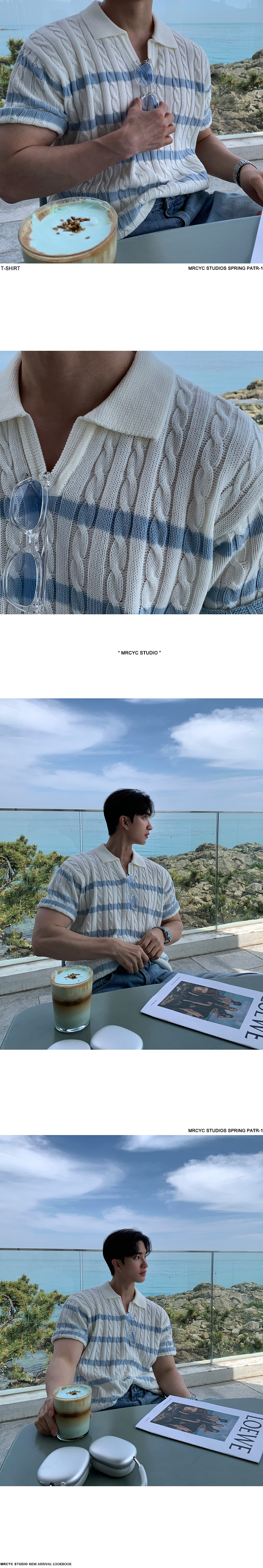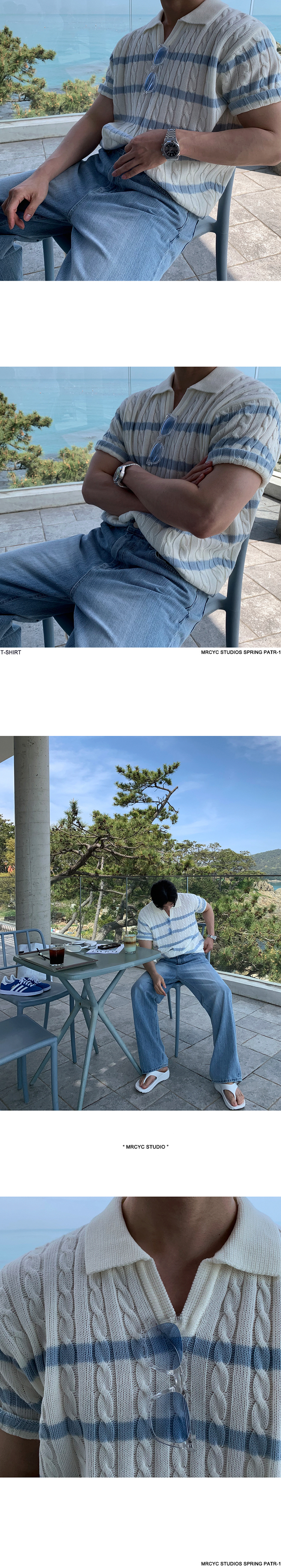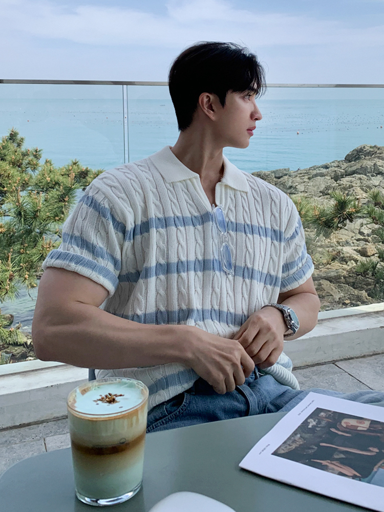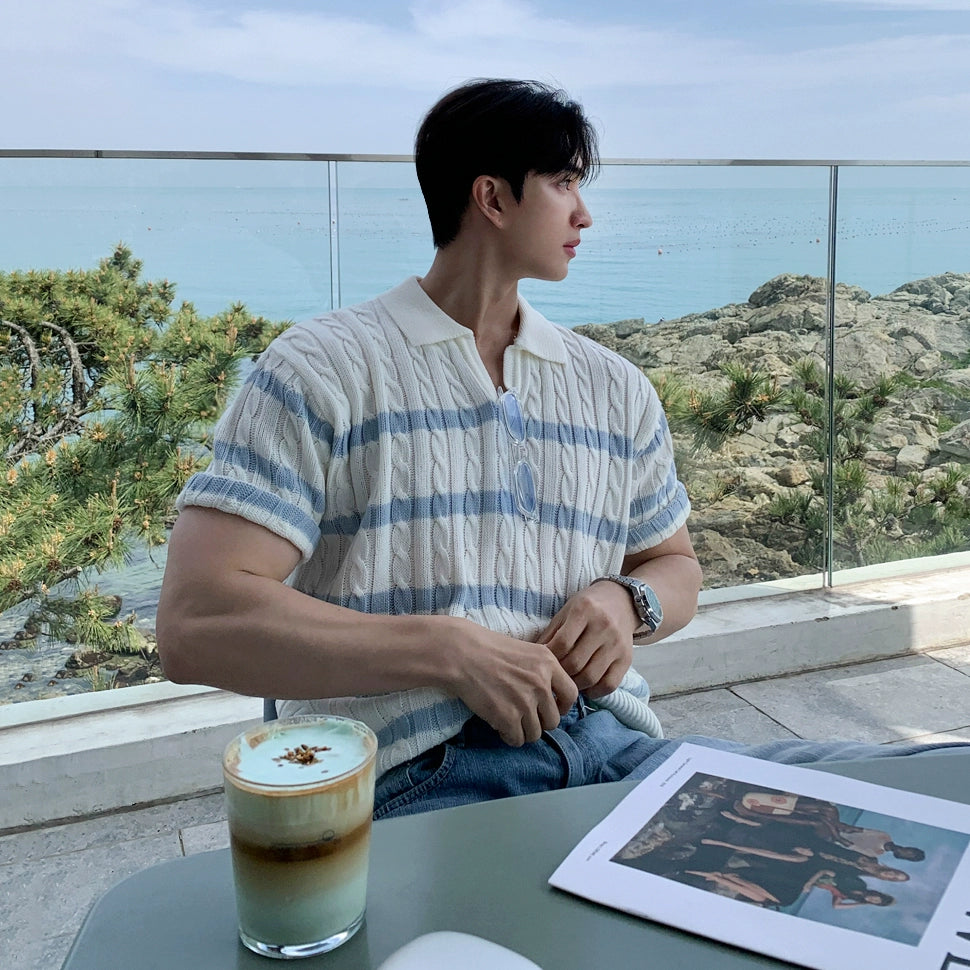 Cable Stripe Knit Lapel Short Sleeve Polo Shirt WN20322