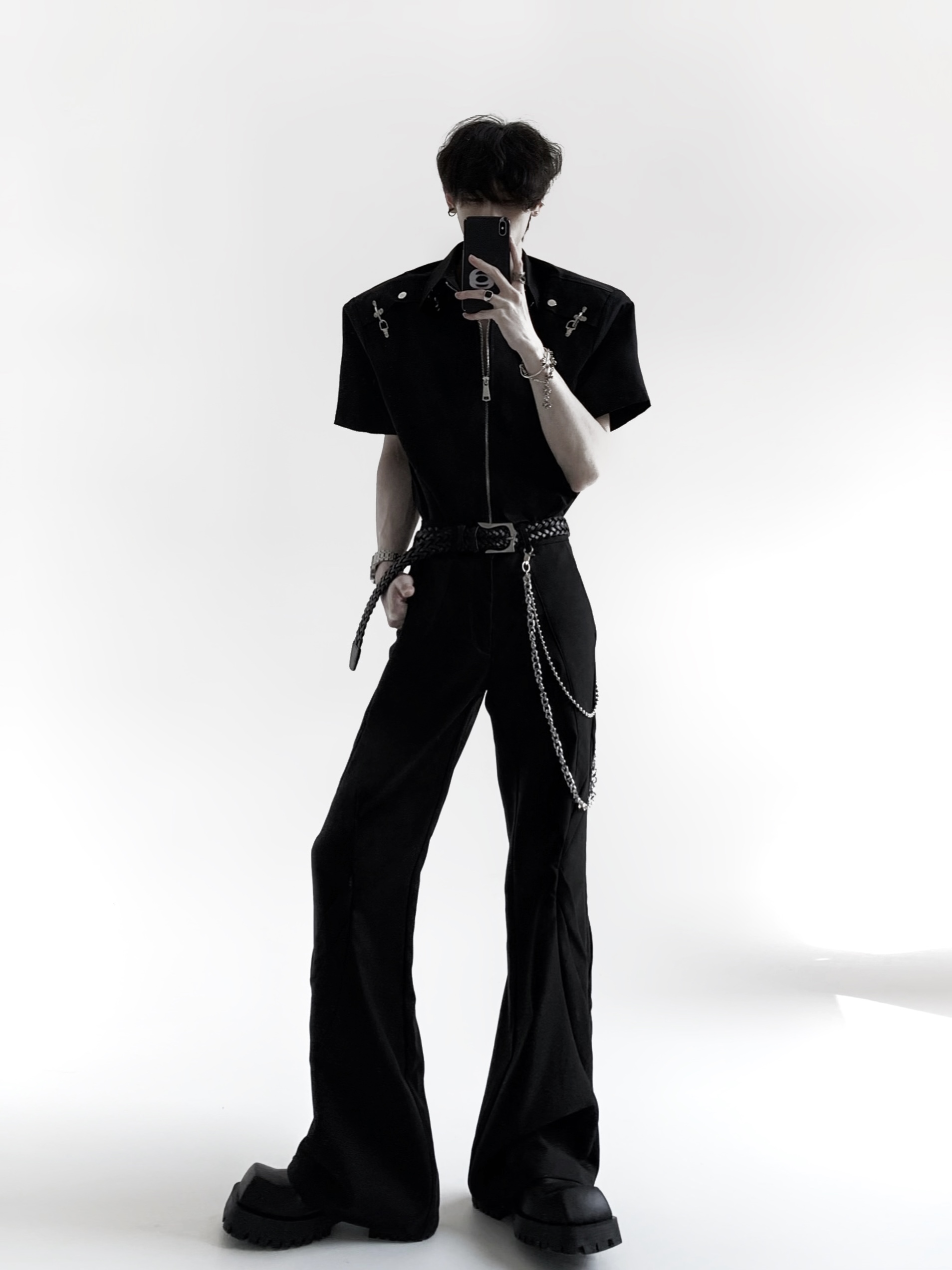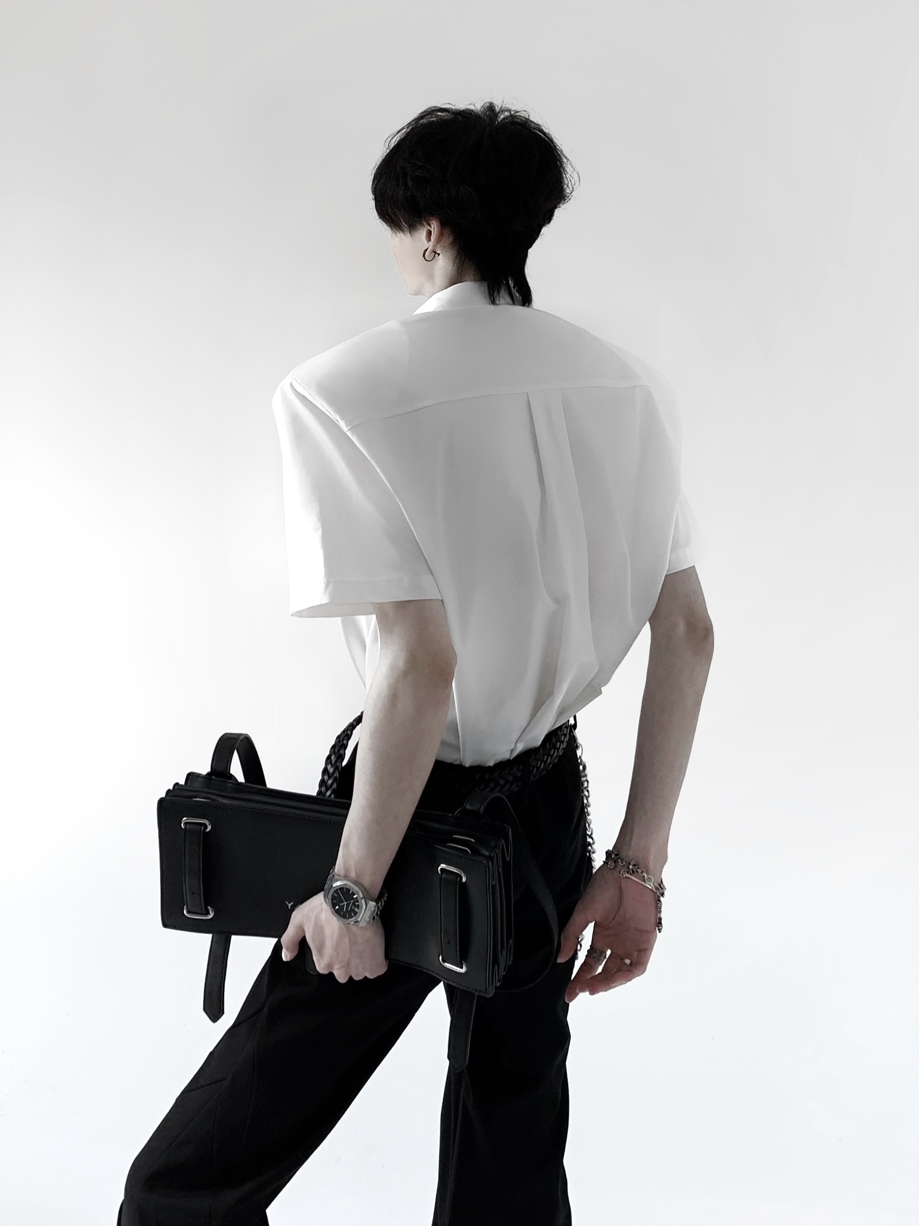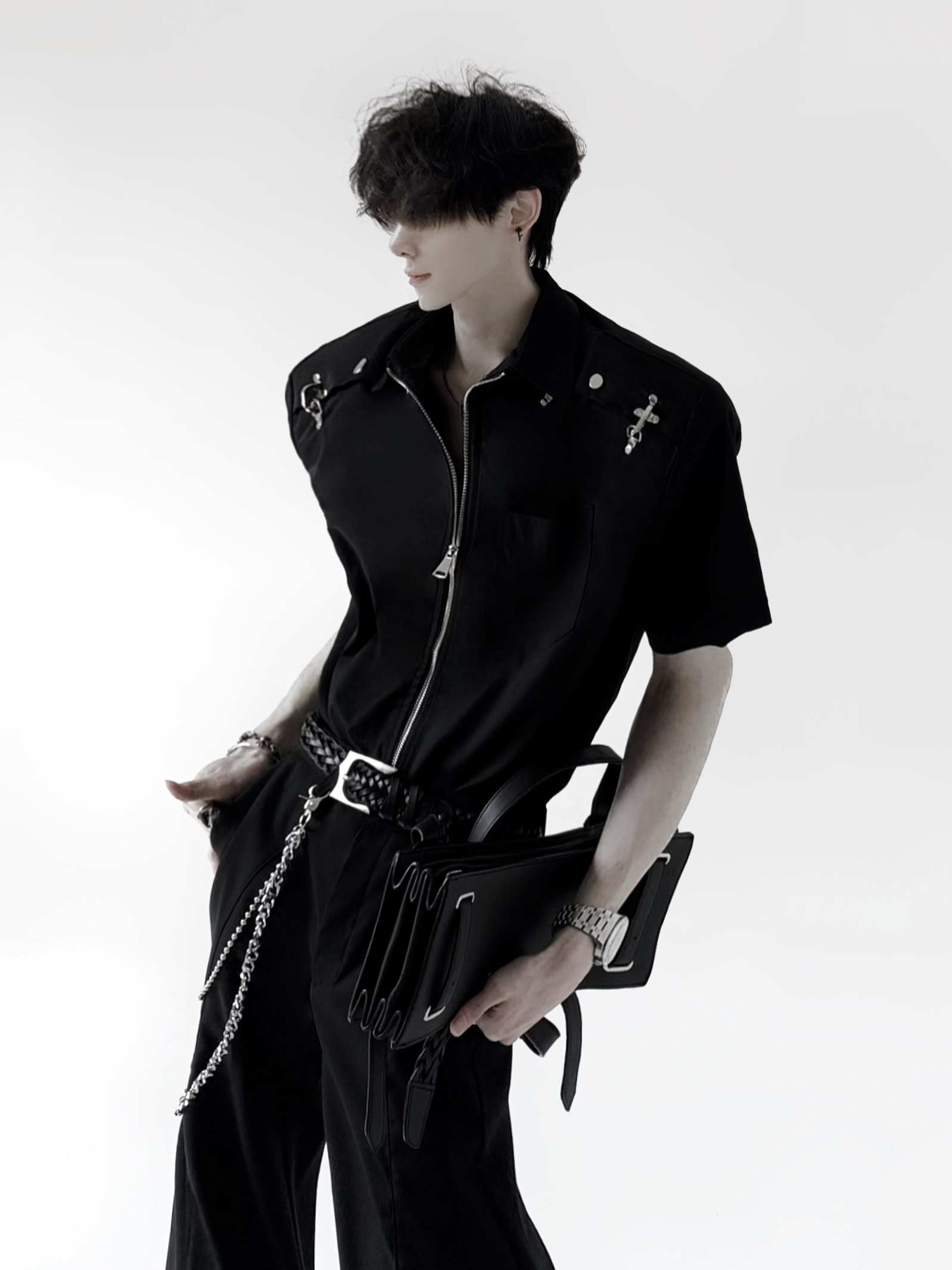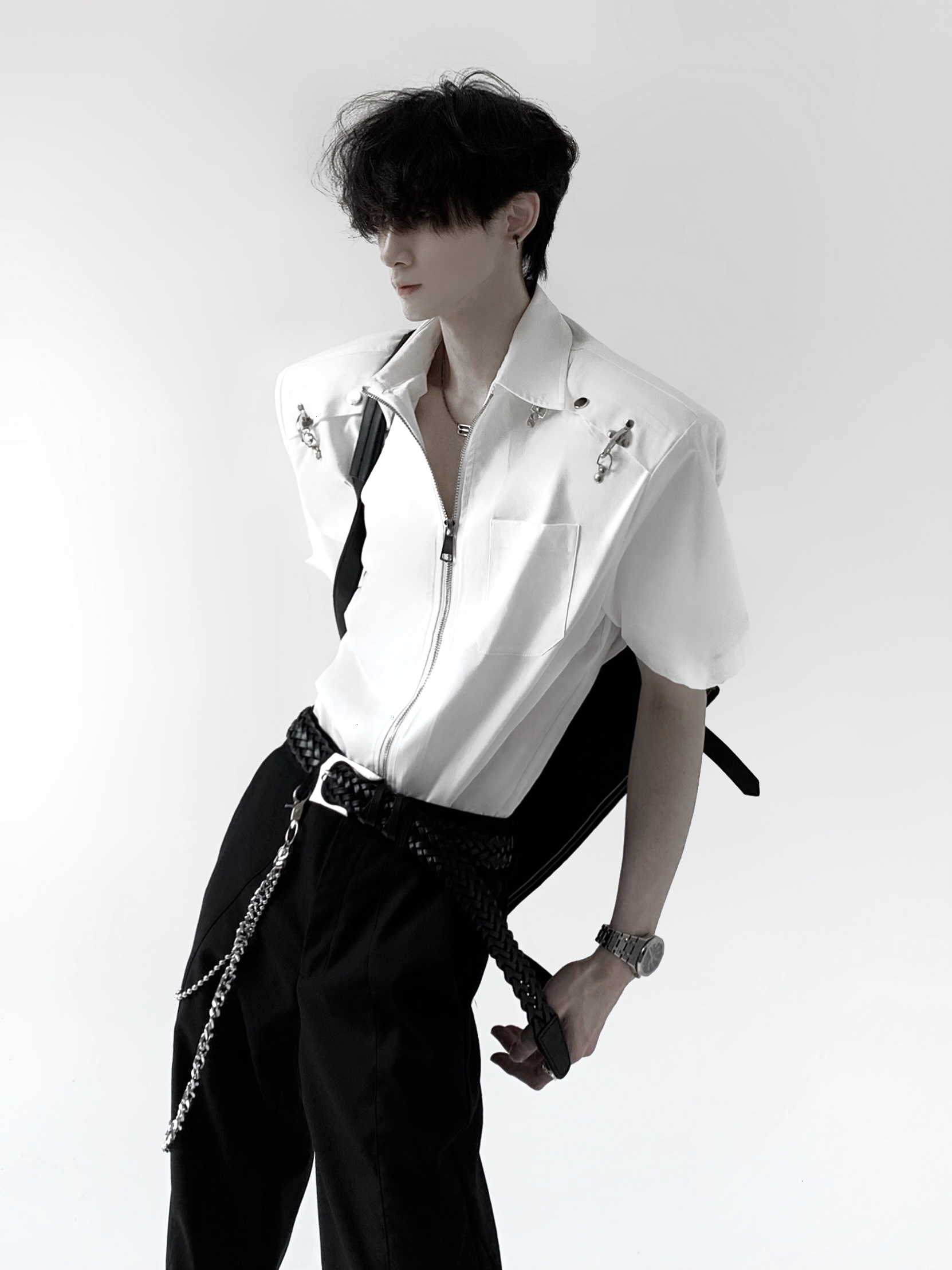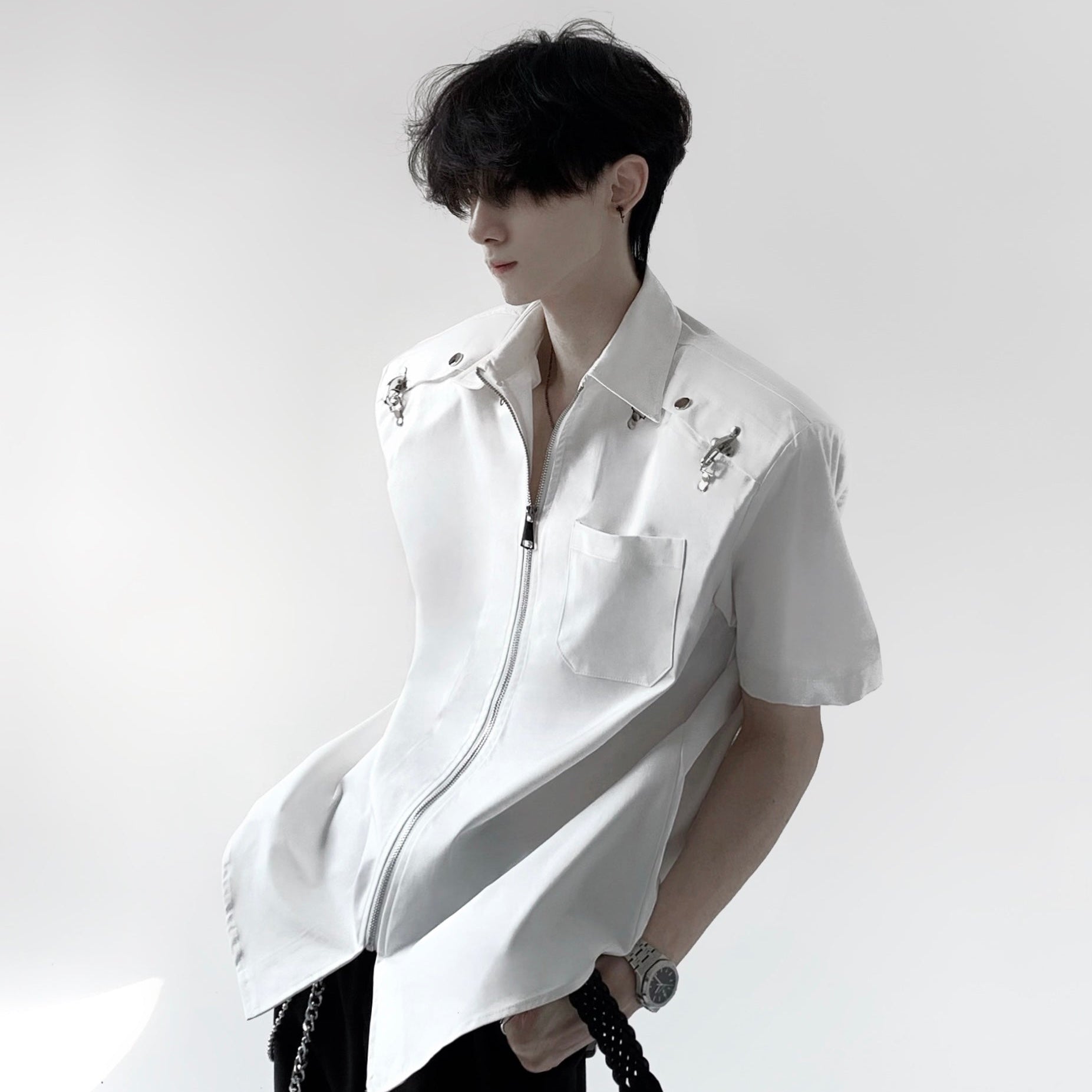 Metal Deconstruction Shoulder-Pad Zipper Short Sleeve Shirt WN20334