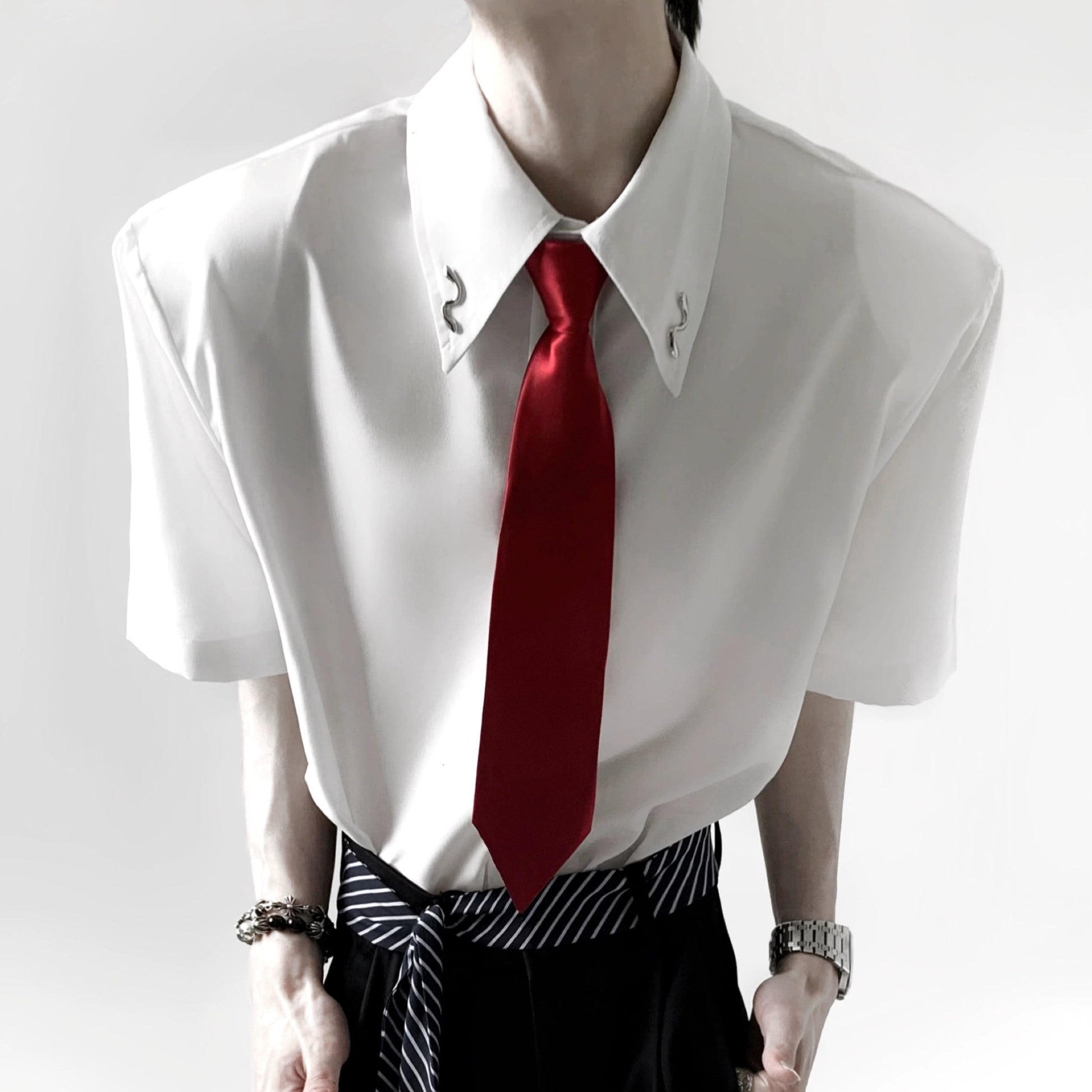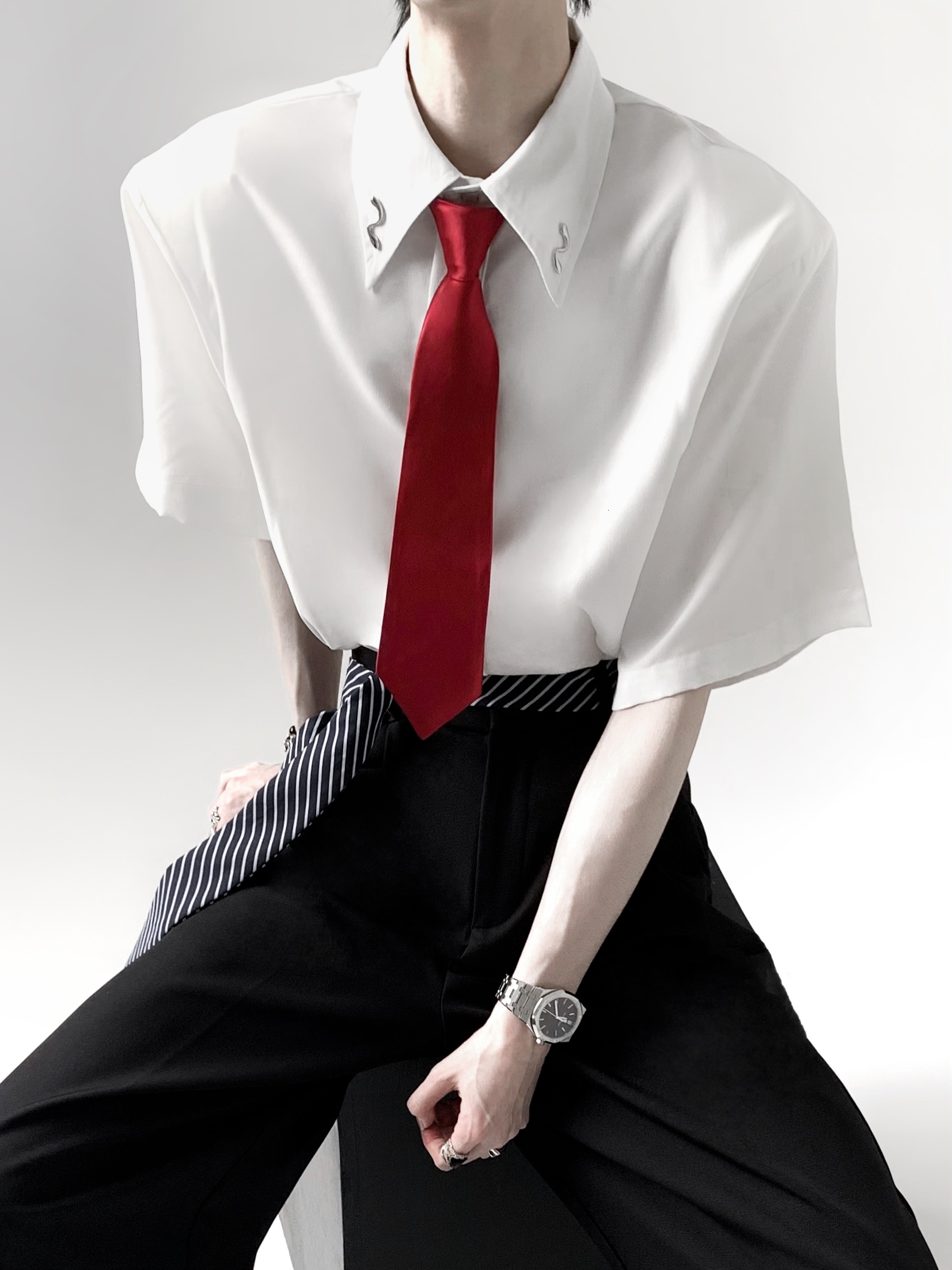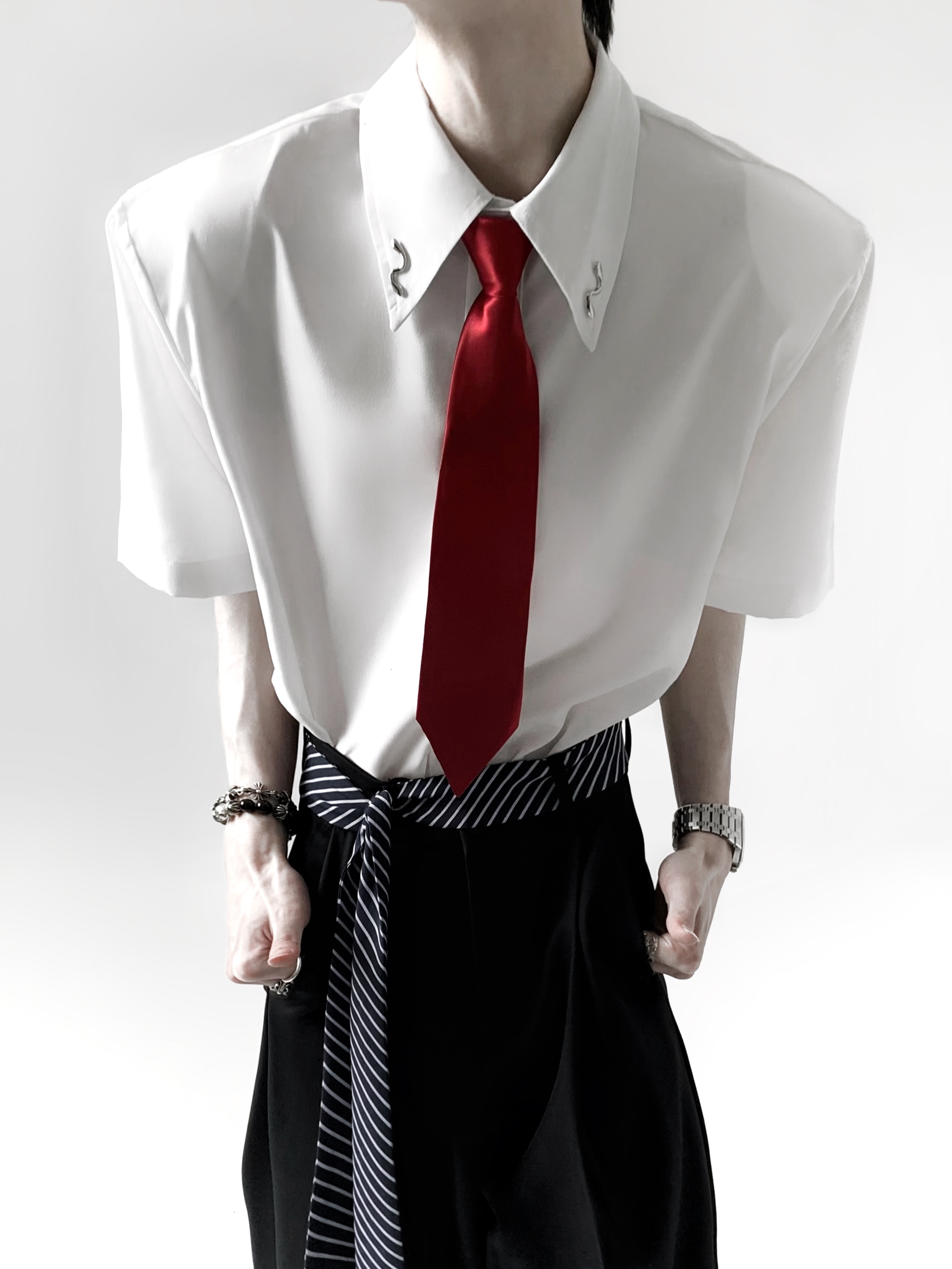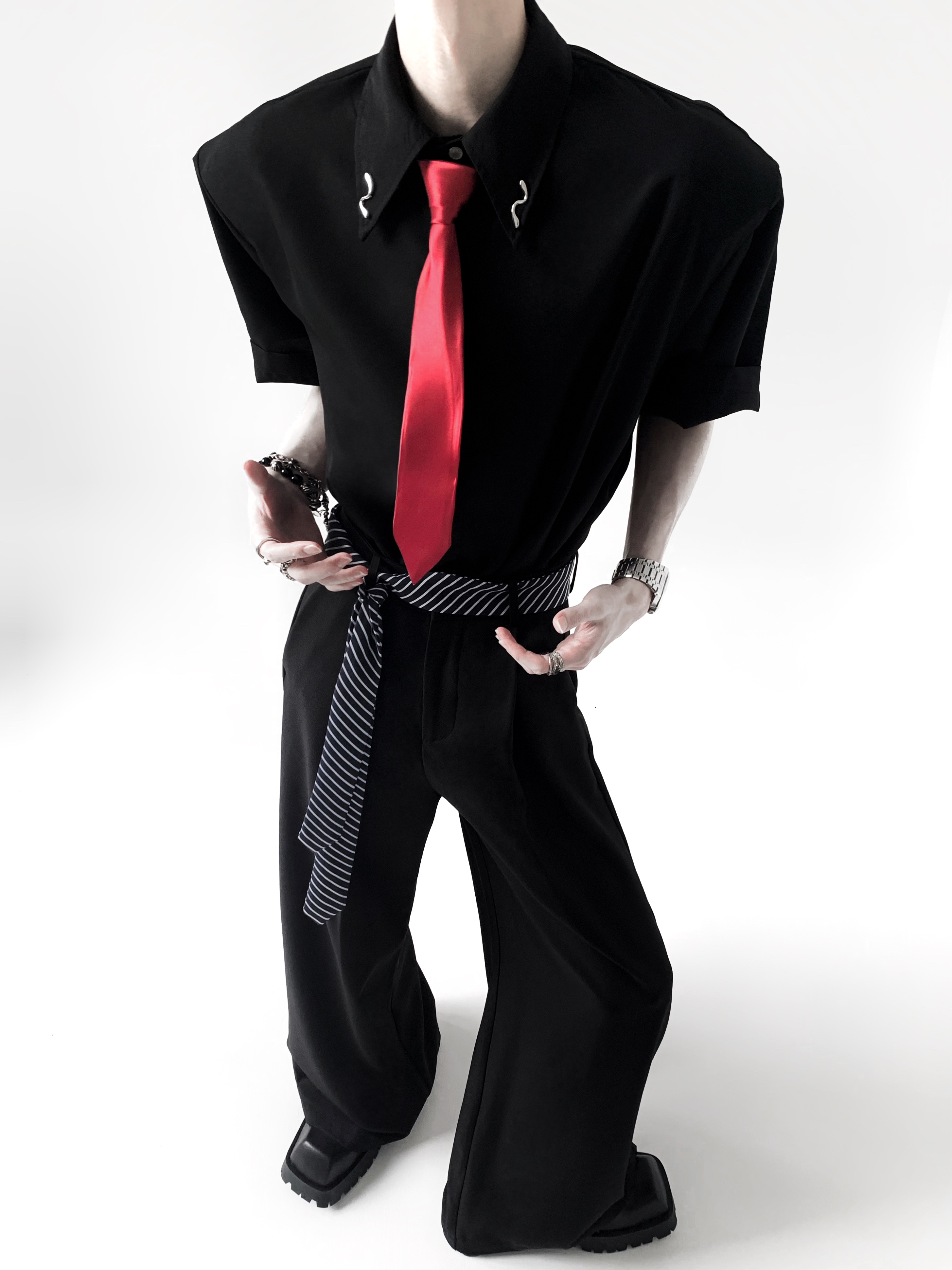 Metal Detail Shoulder-pad Short Sleeve Shirt & Tie WN20346