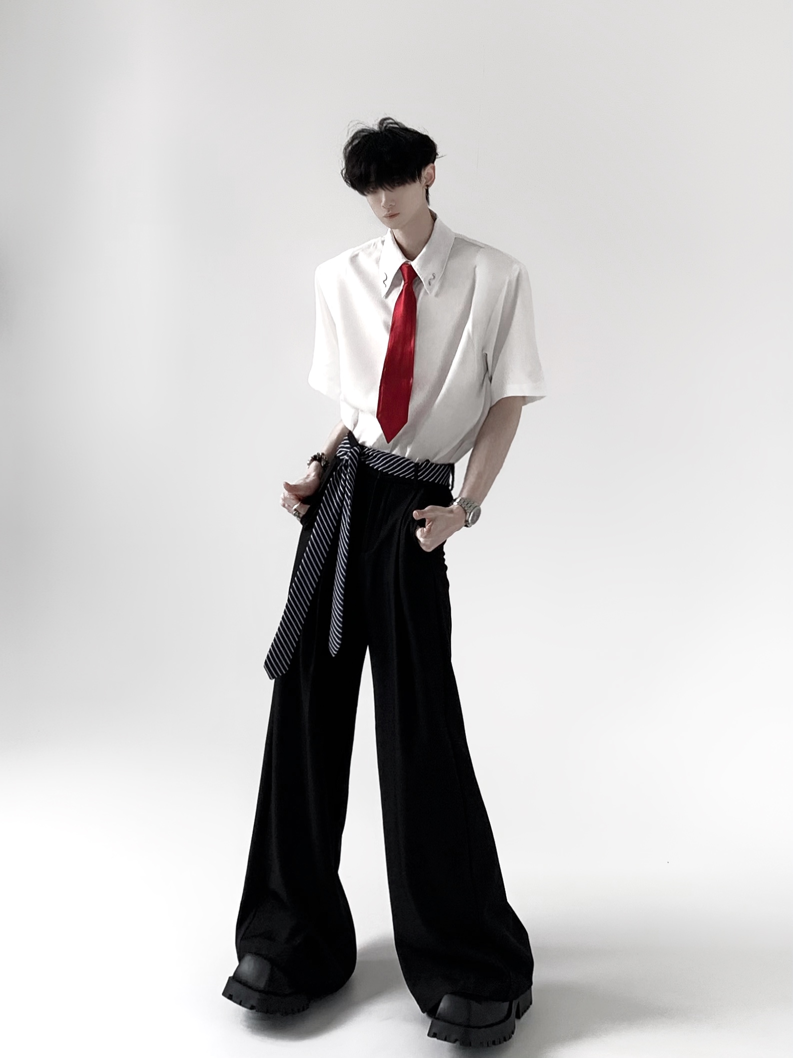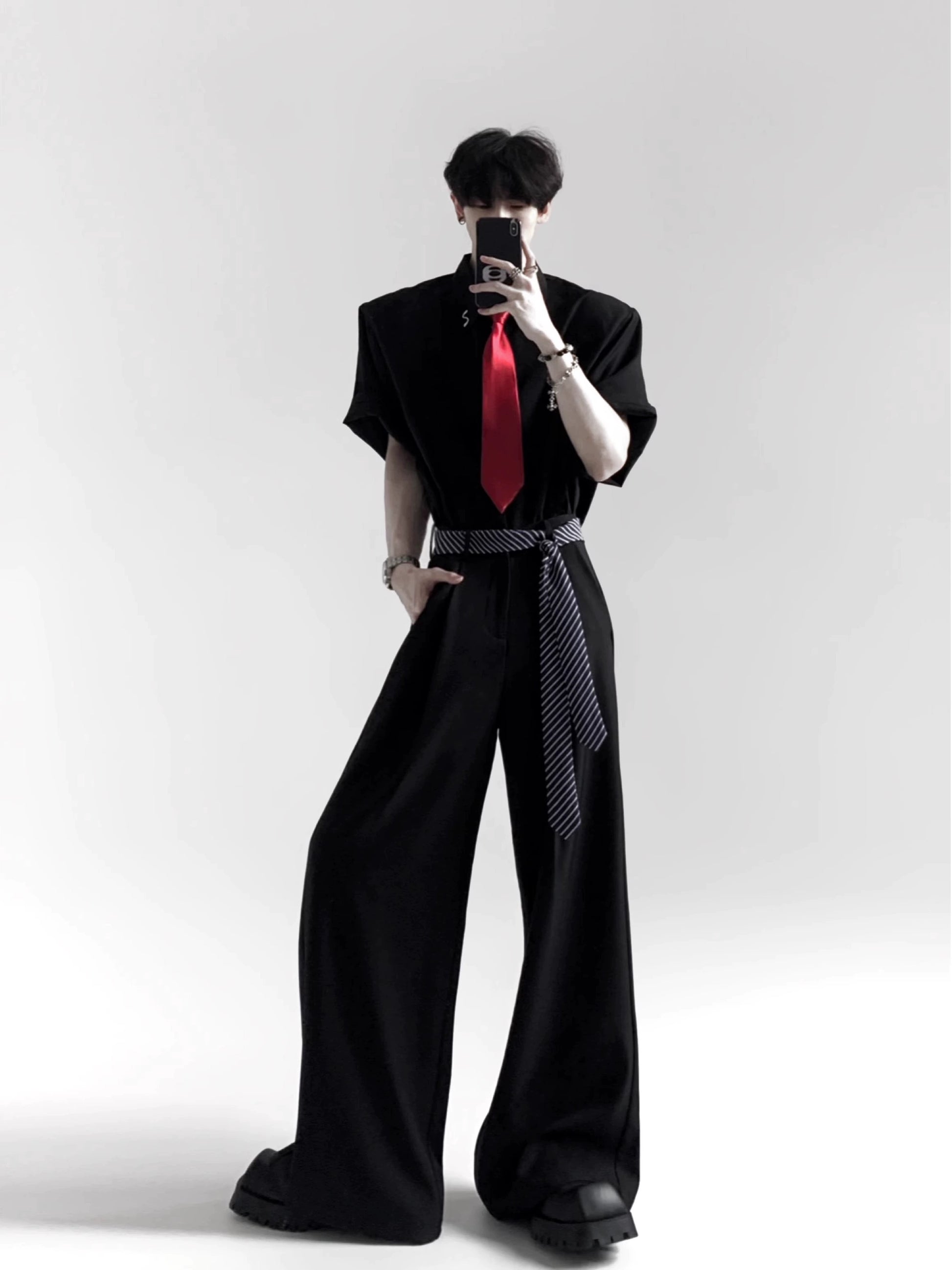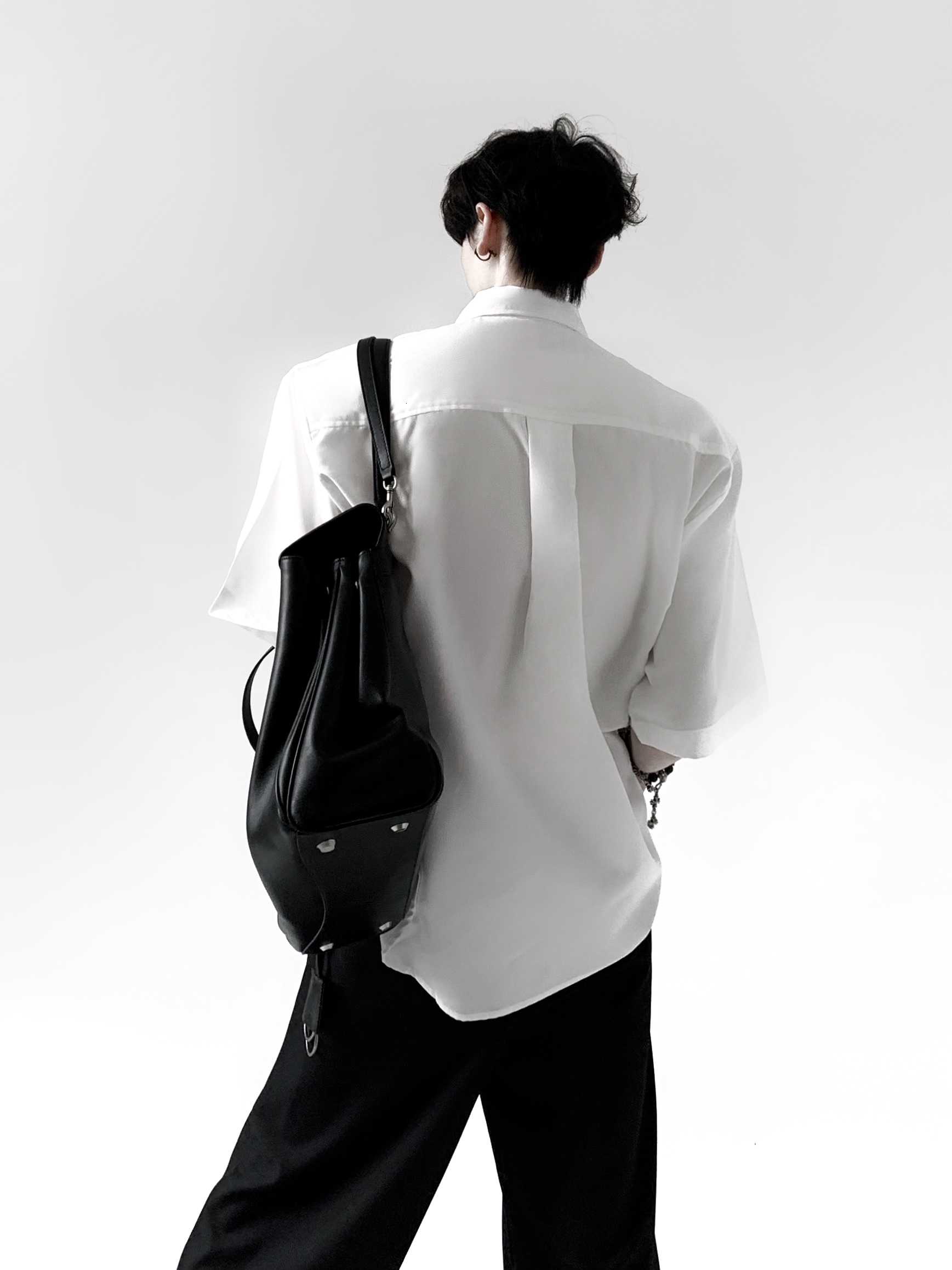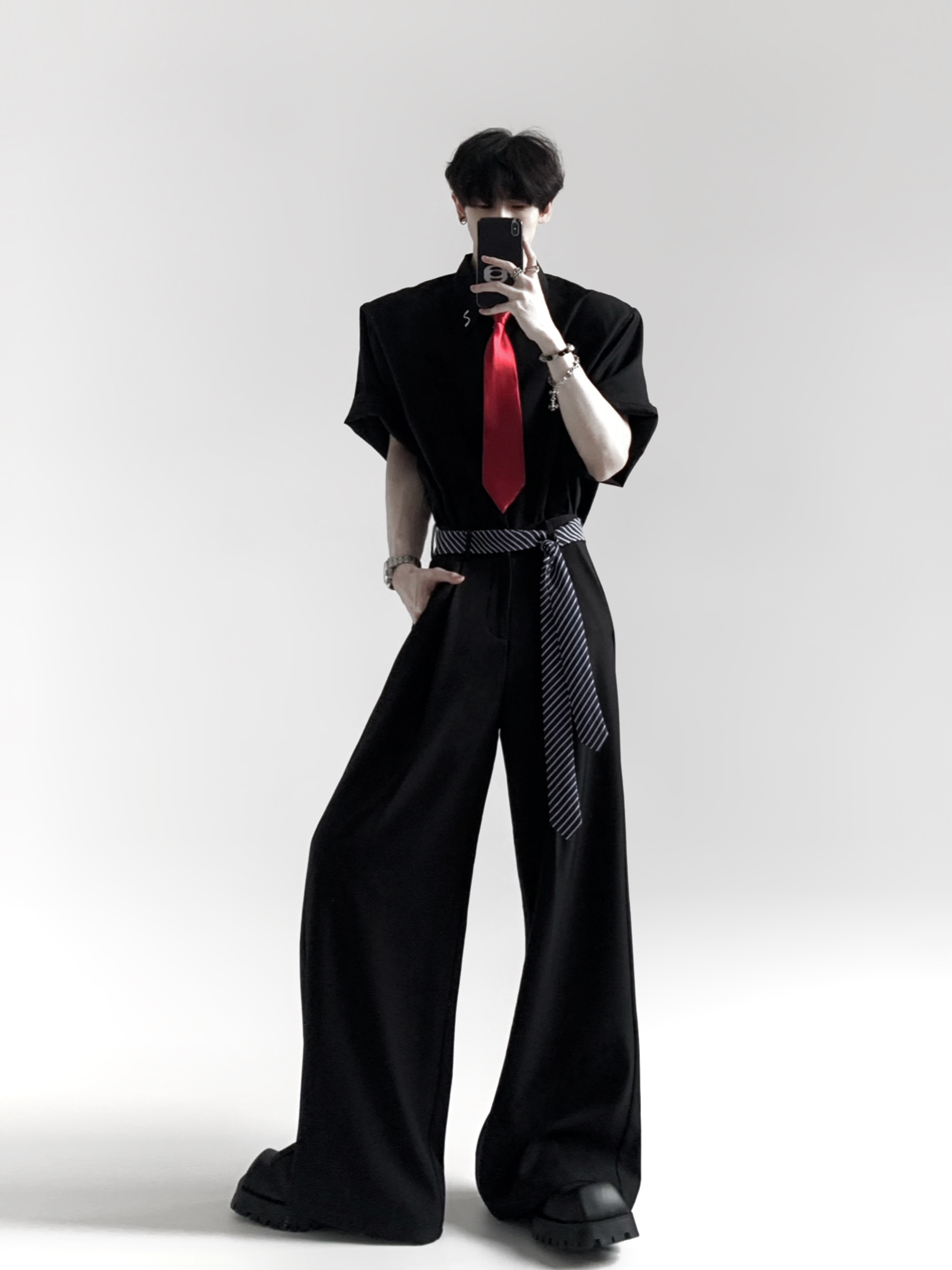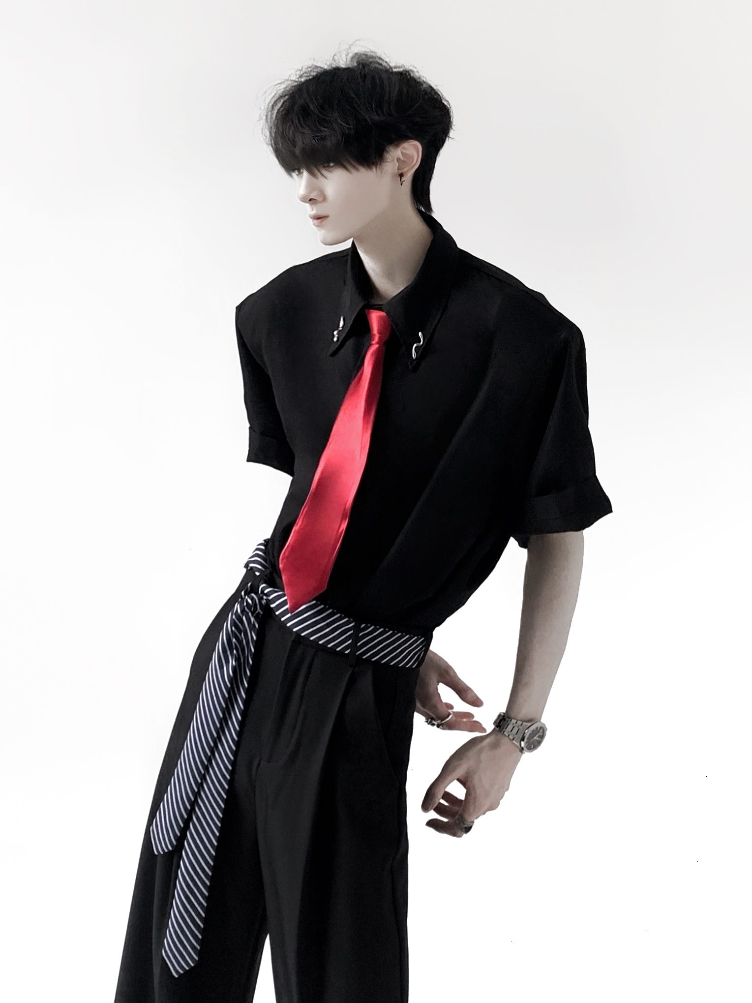 Metal Detail Shoulder-pad Short Sleeve Shirt & Tie WN20346