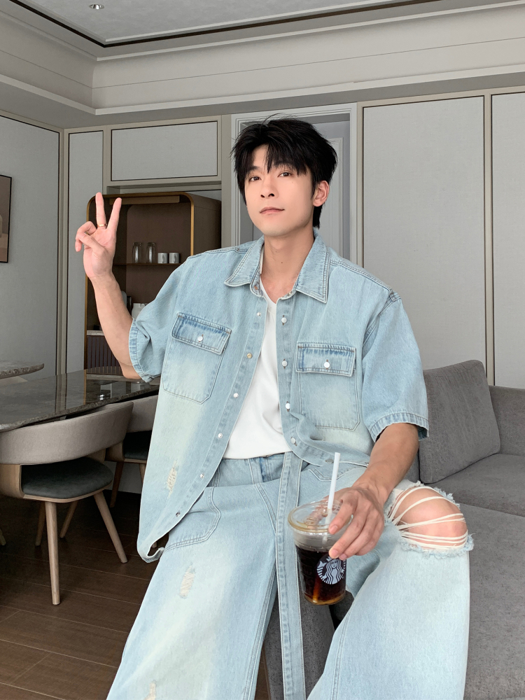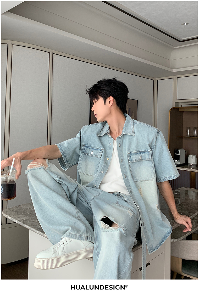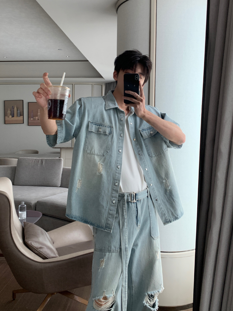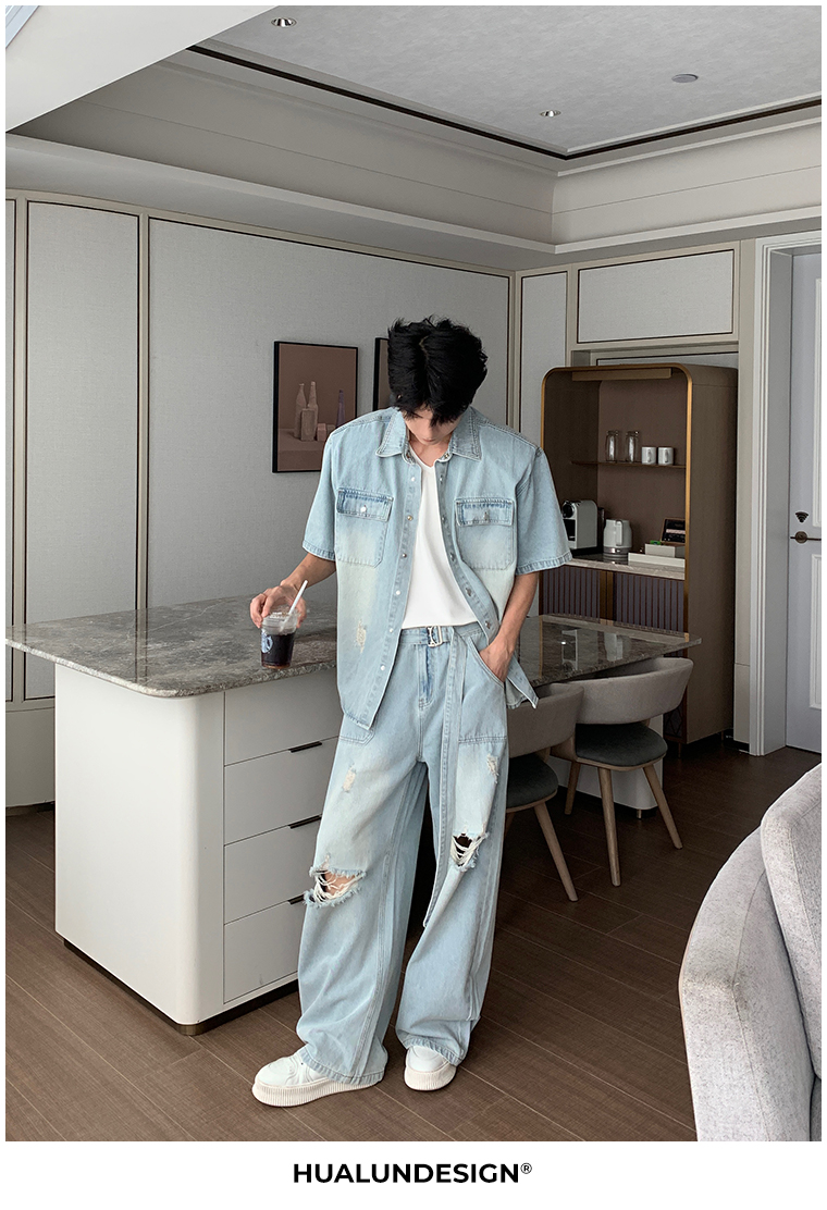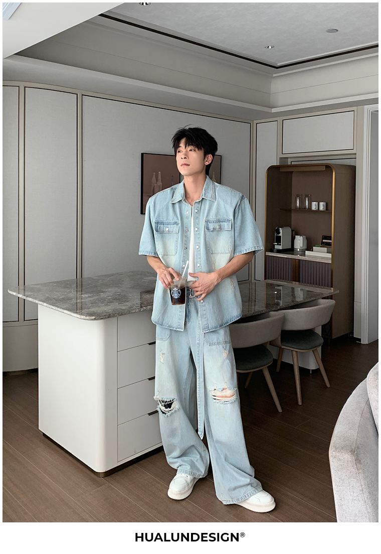 Damage Denim Short Sleeve Shirt & Denim Jeans Setup WN20423