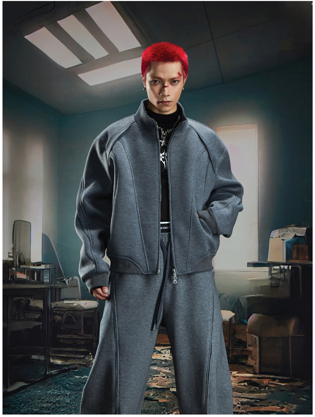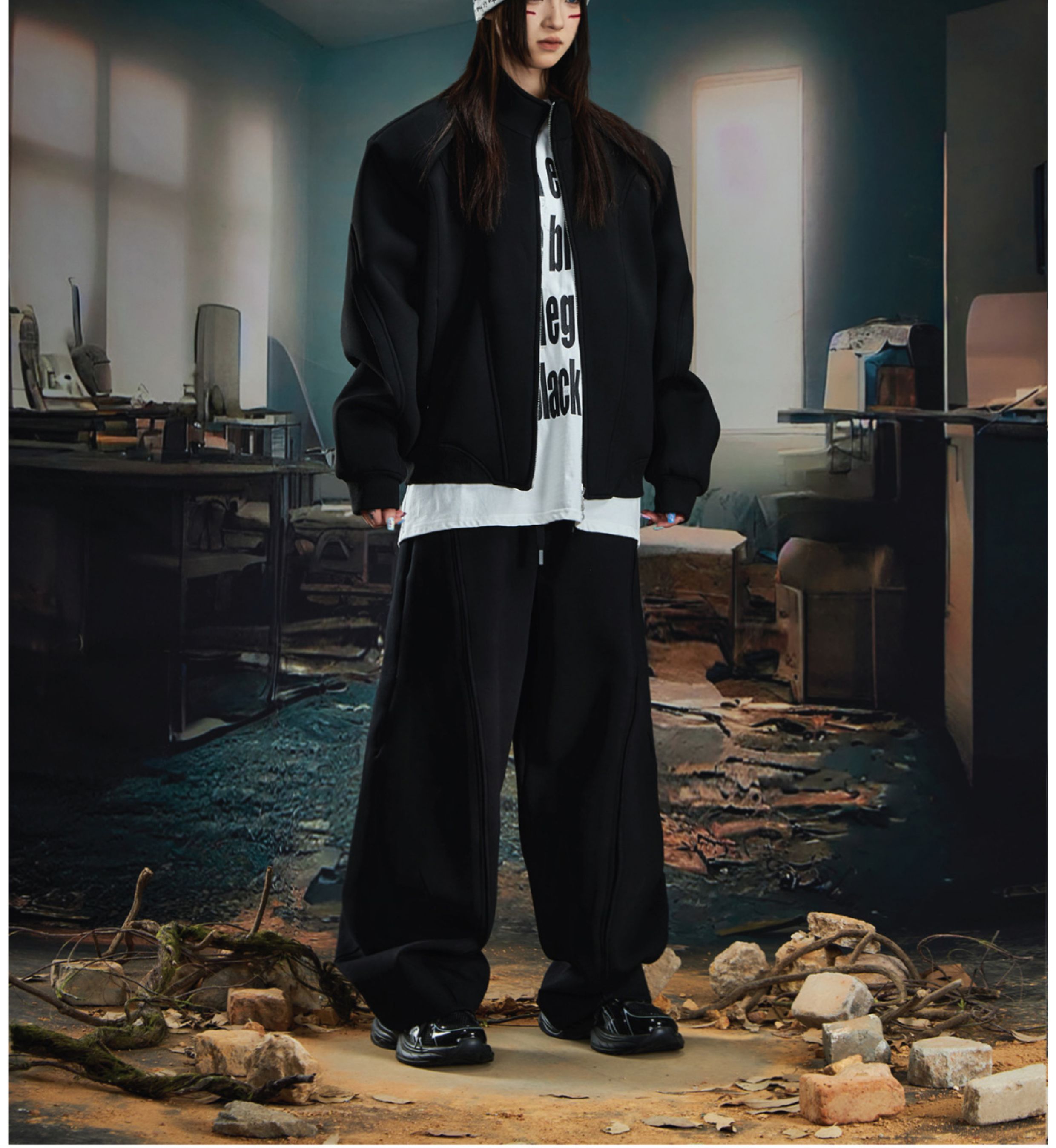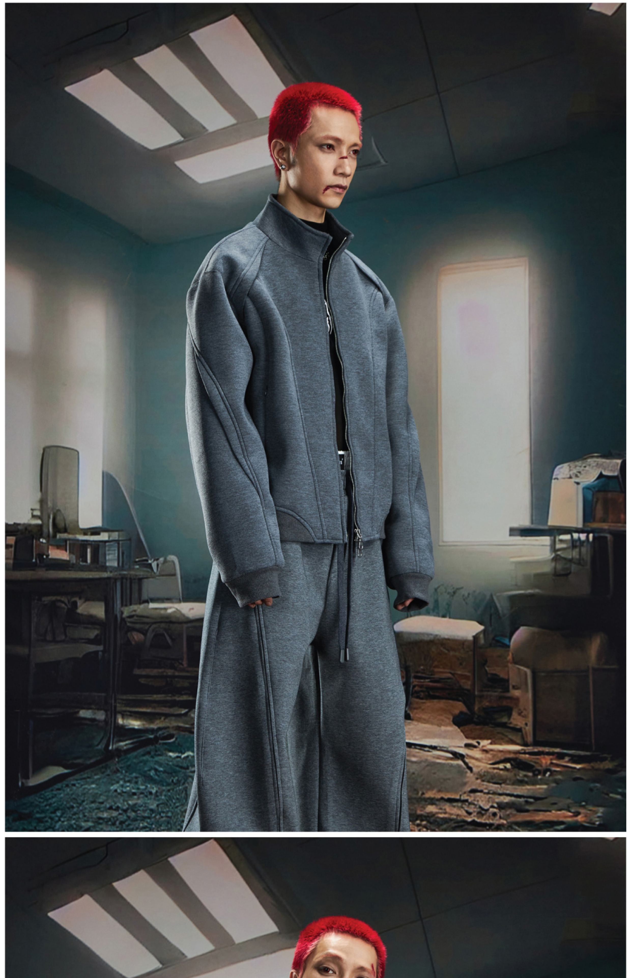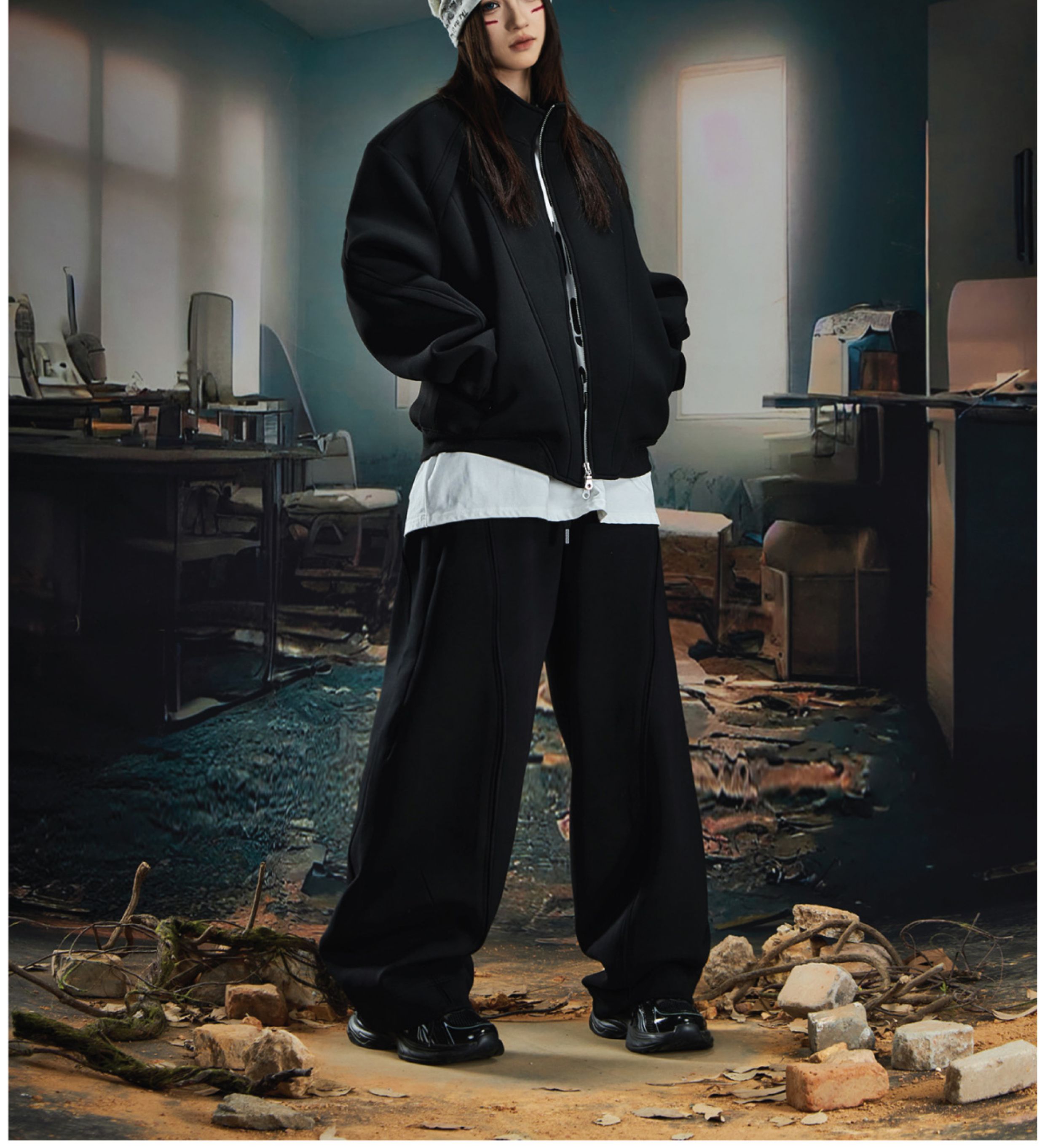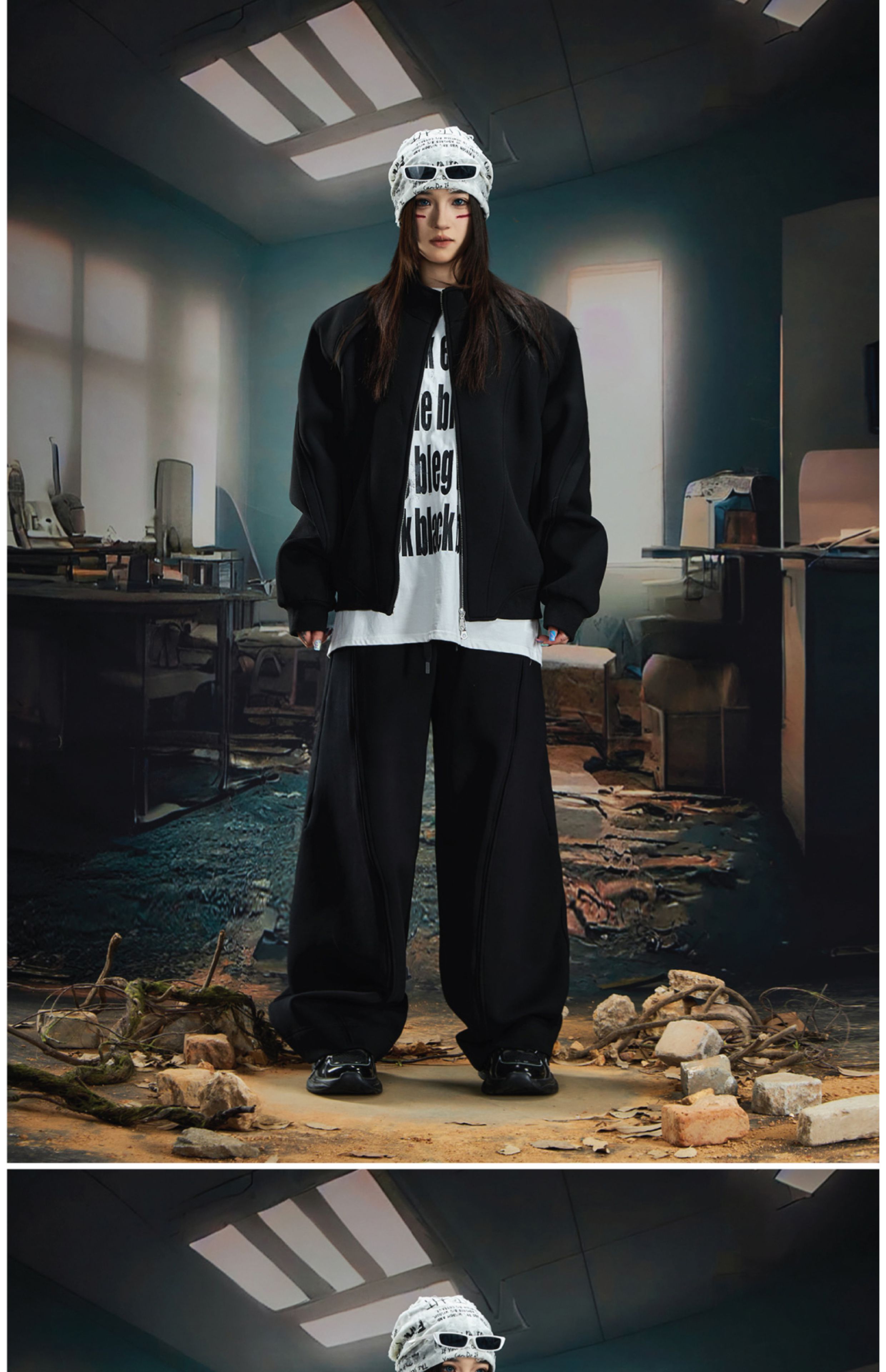 Deconstructed Oversize Zipper Stand Neck Jacket & Wide Leg Pants Setup WN20586