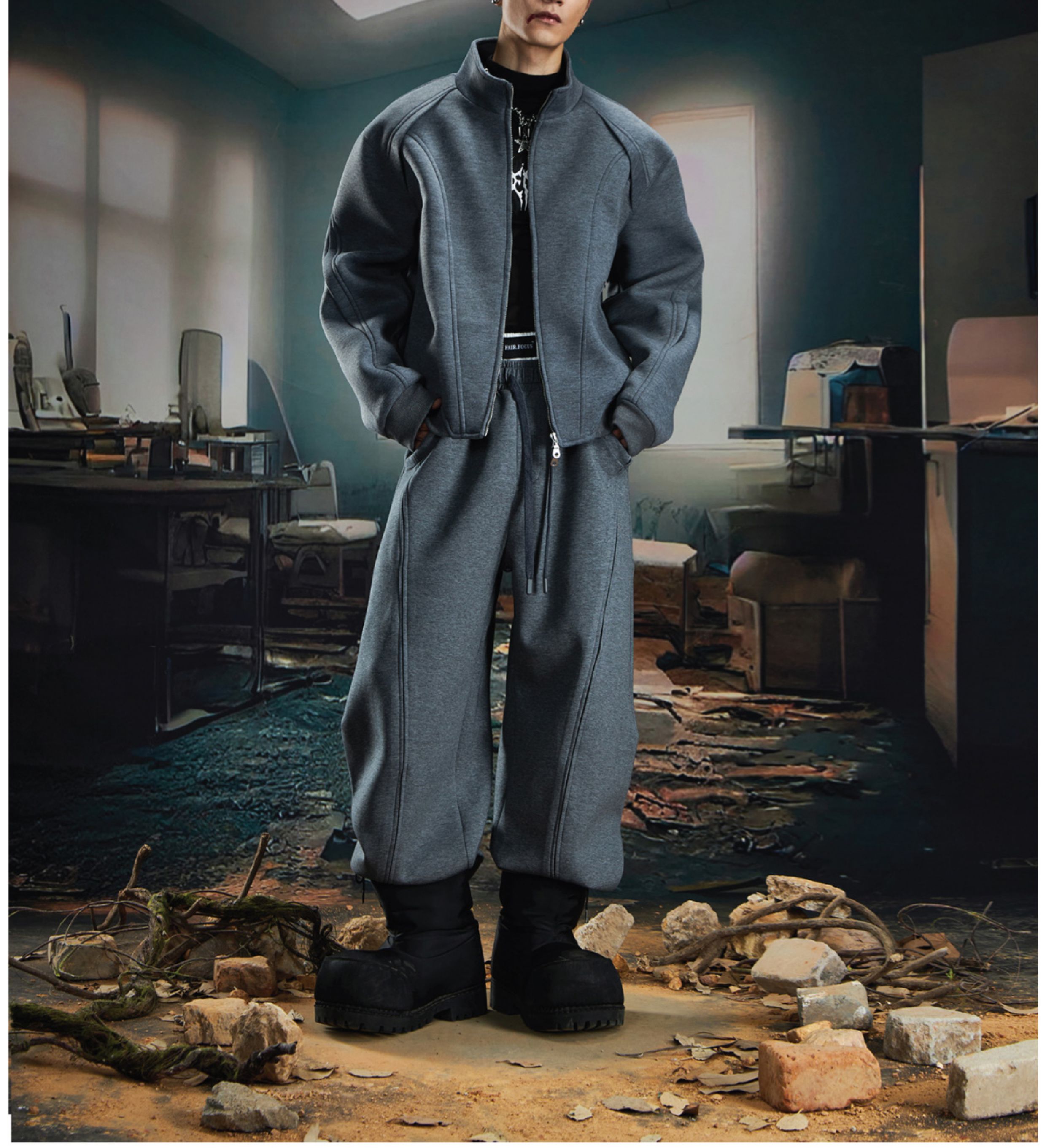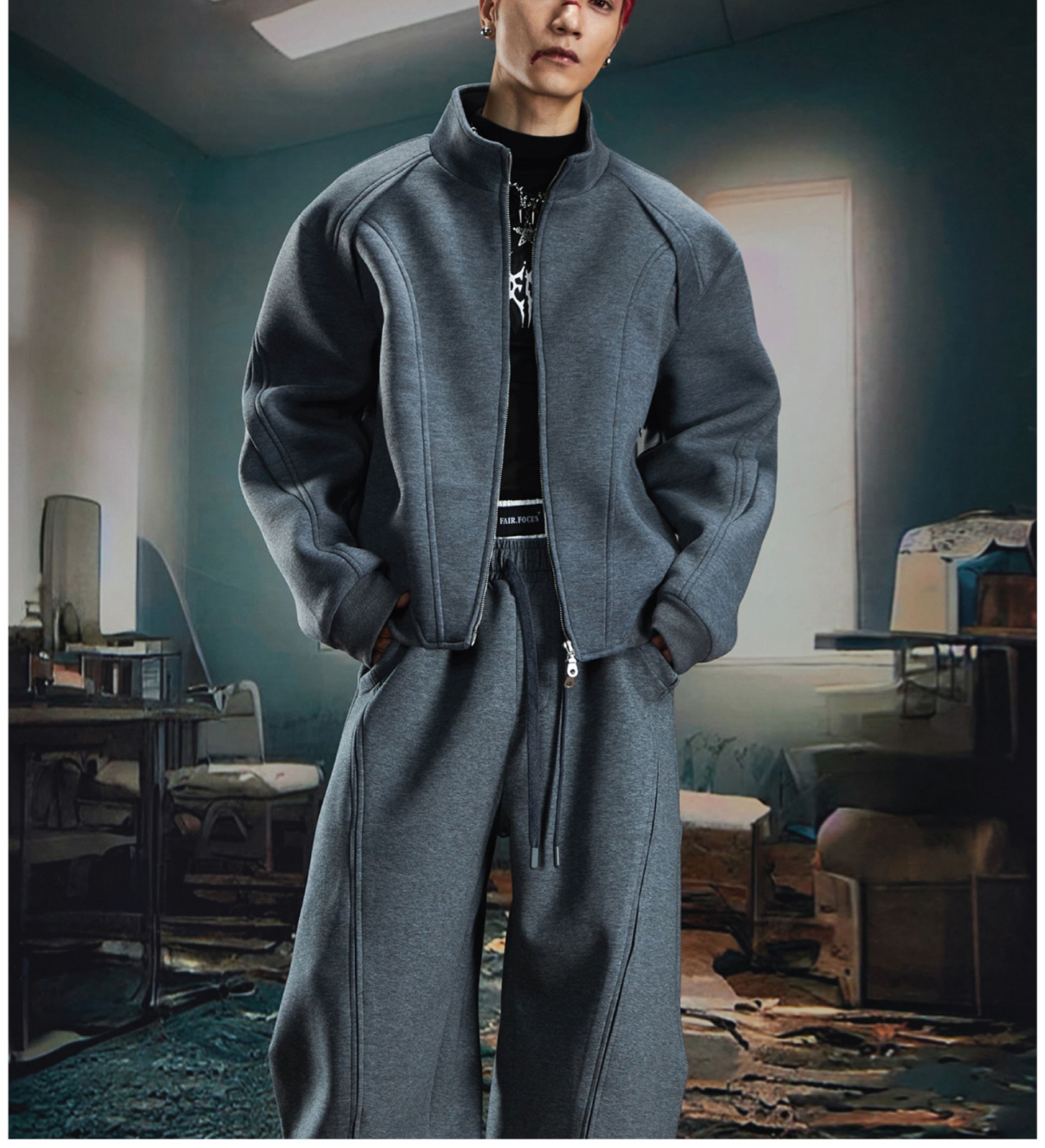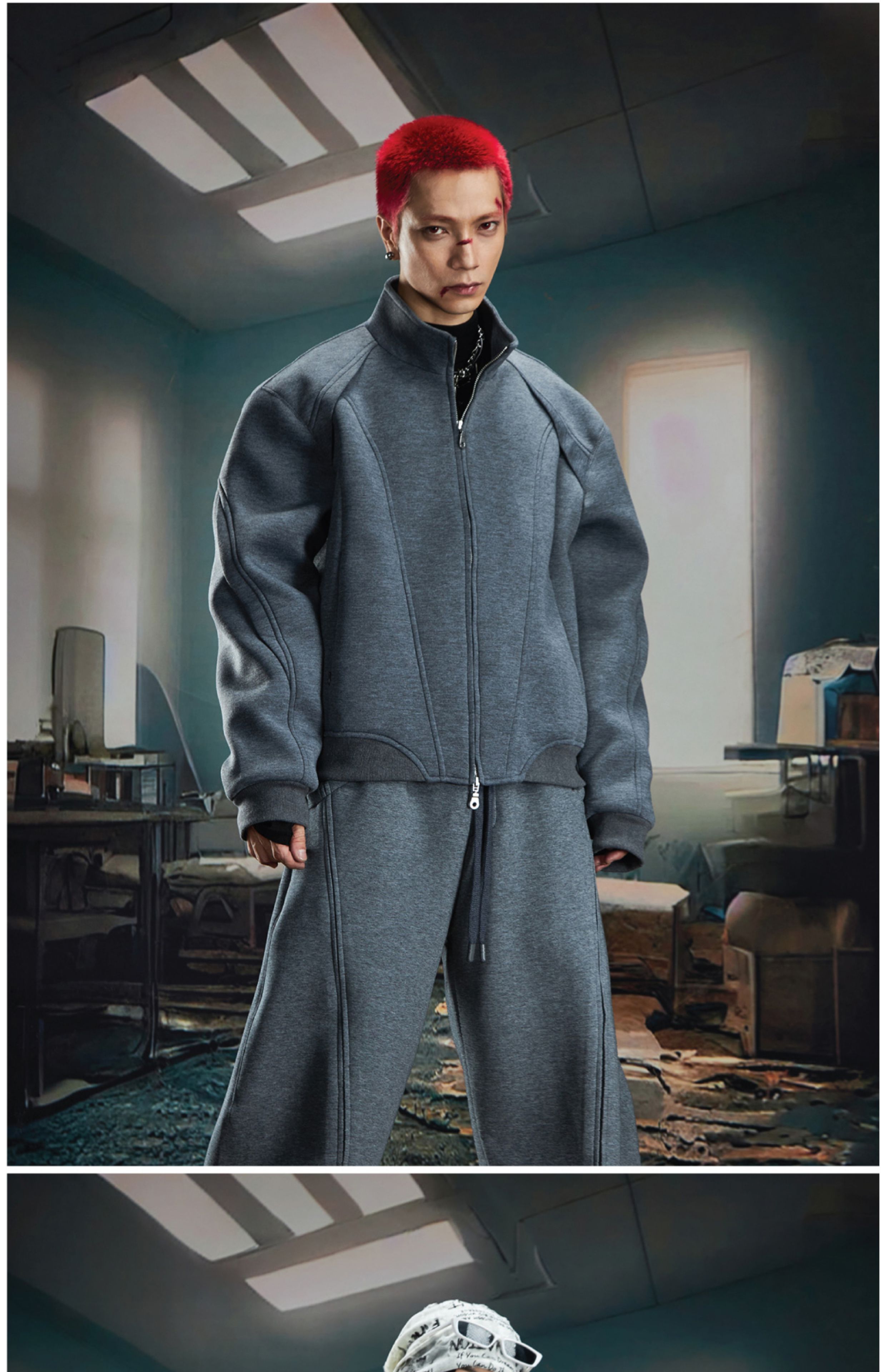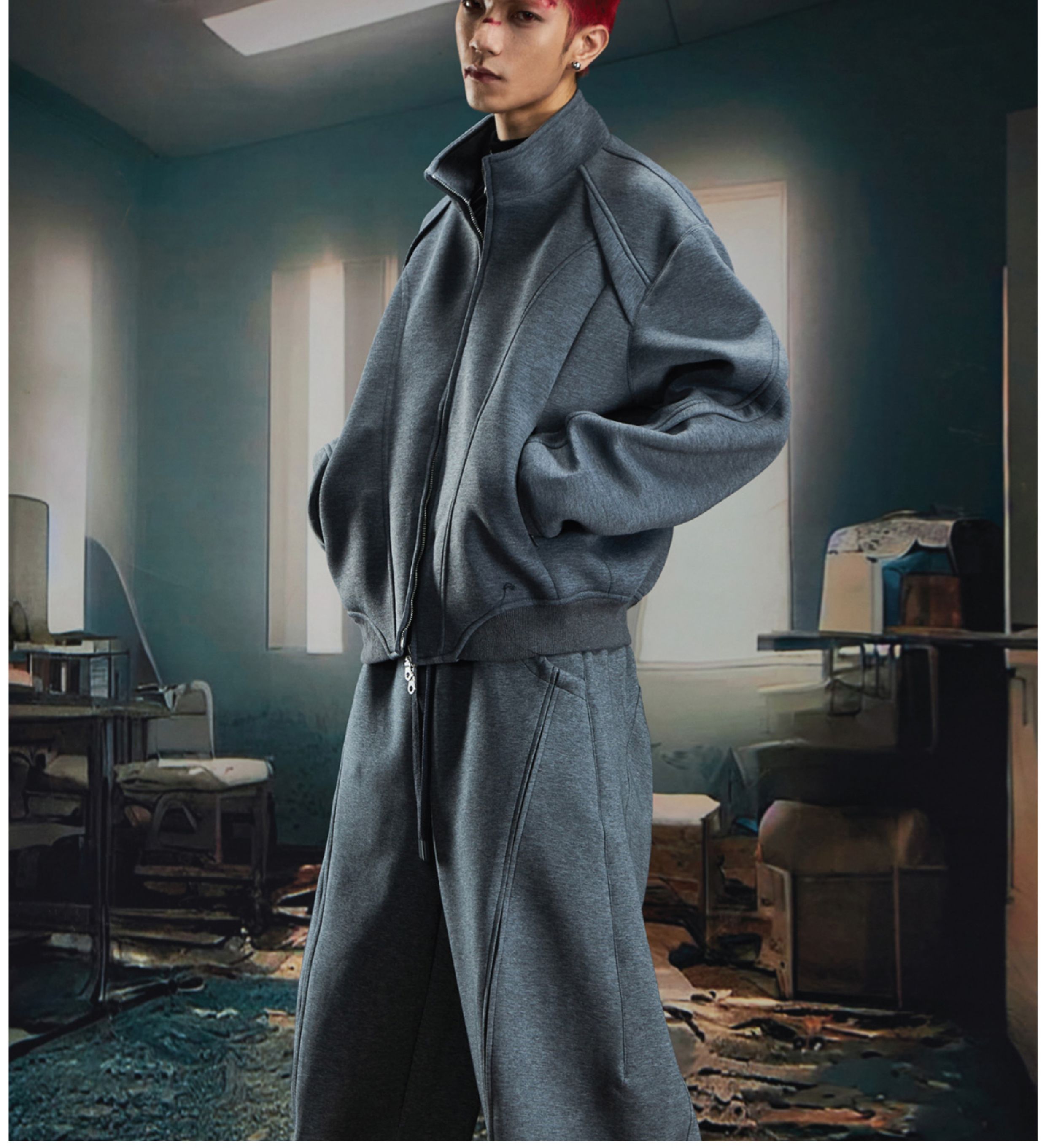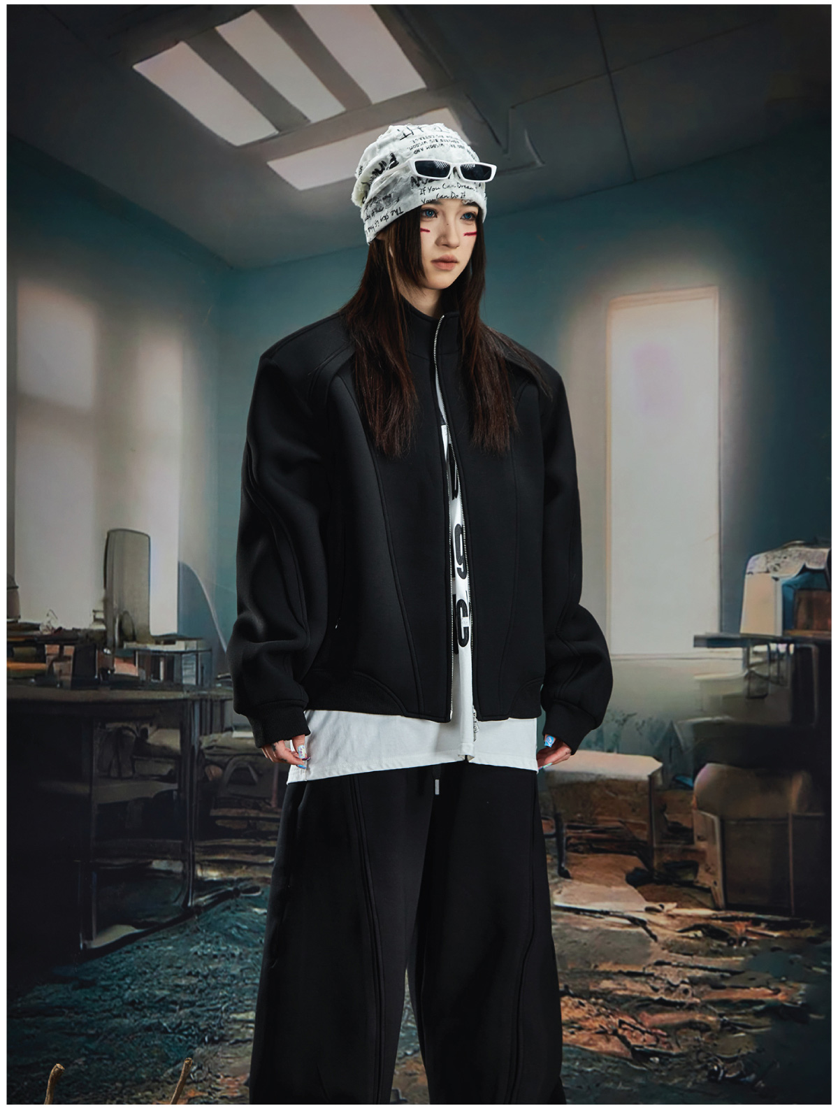 Deconstructed Oversize Zipper Stand Neck Jacket & Wide Leg Pants Setup WN20586