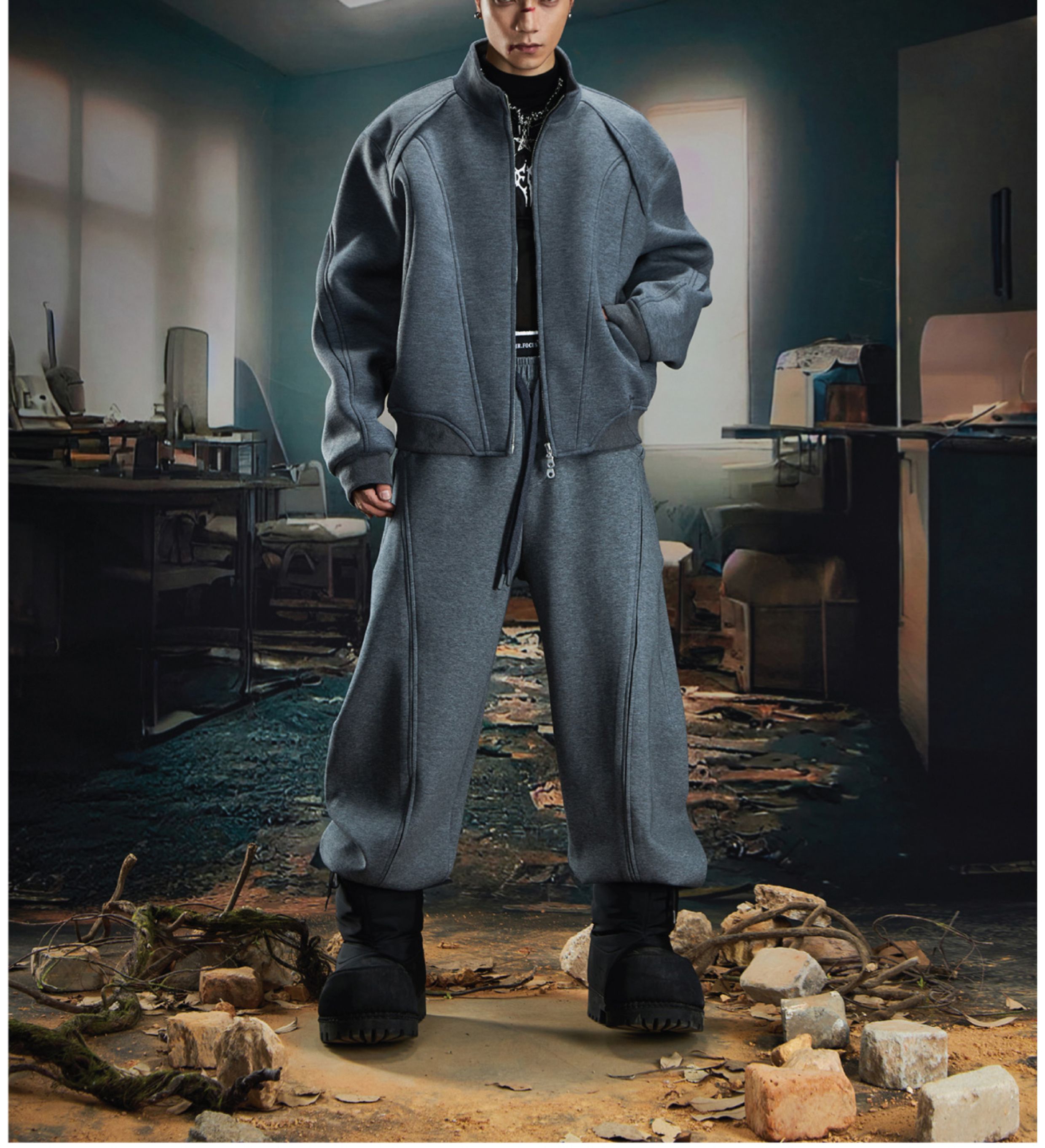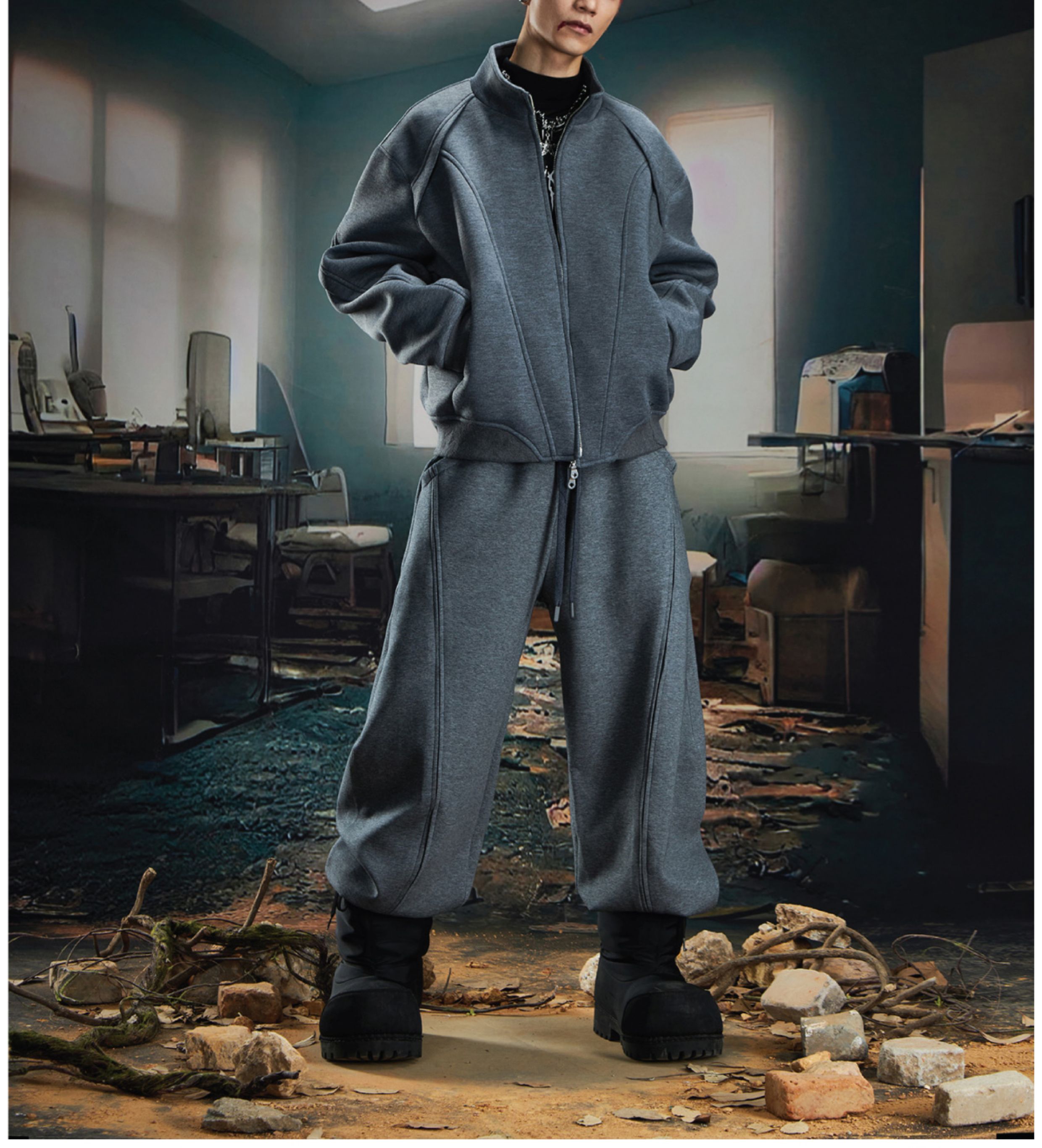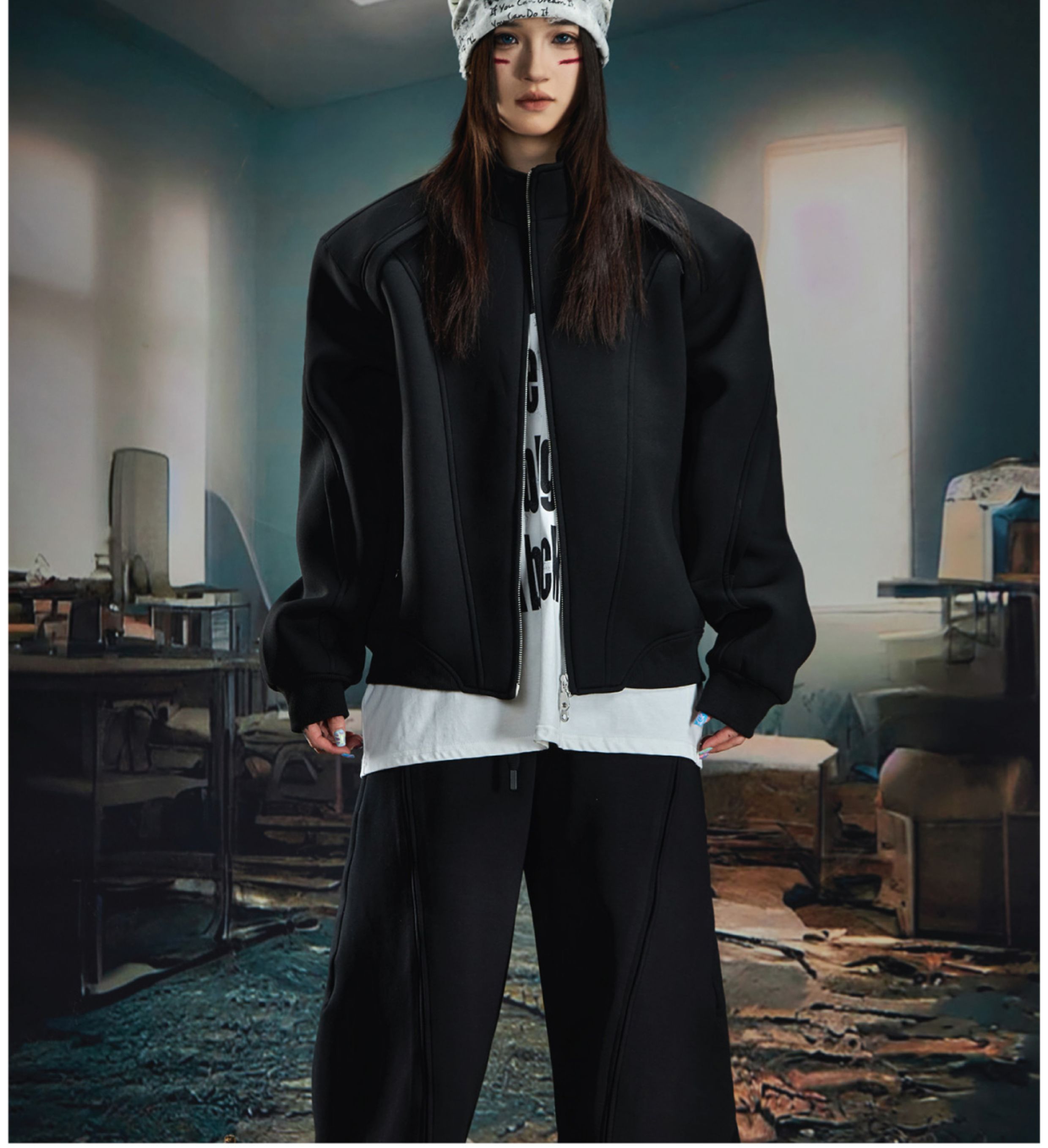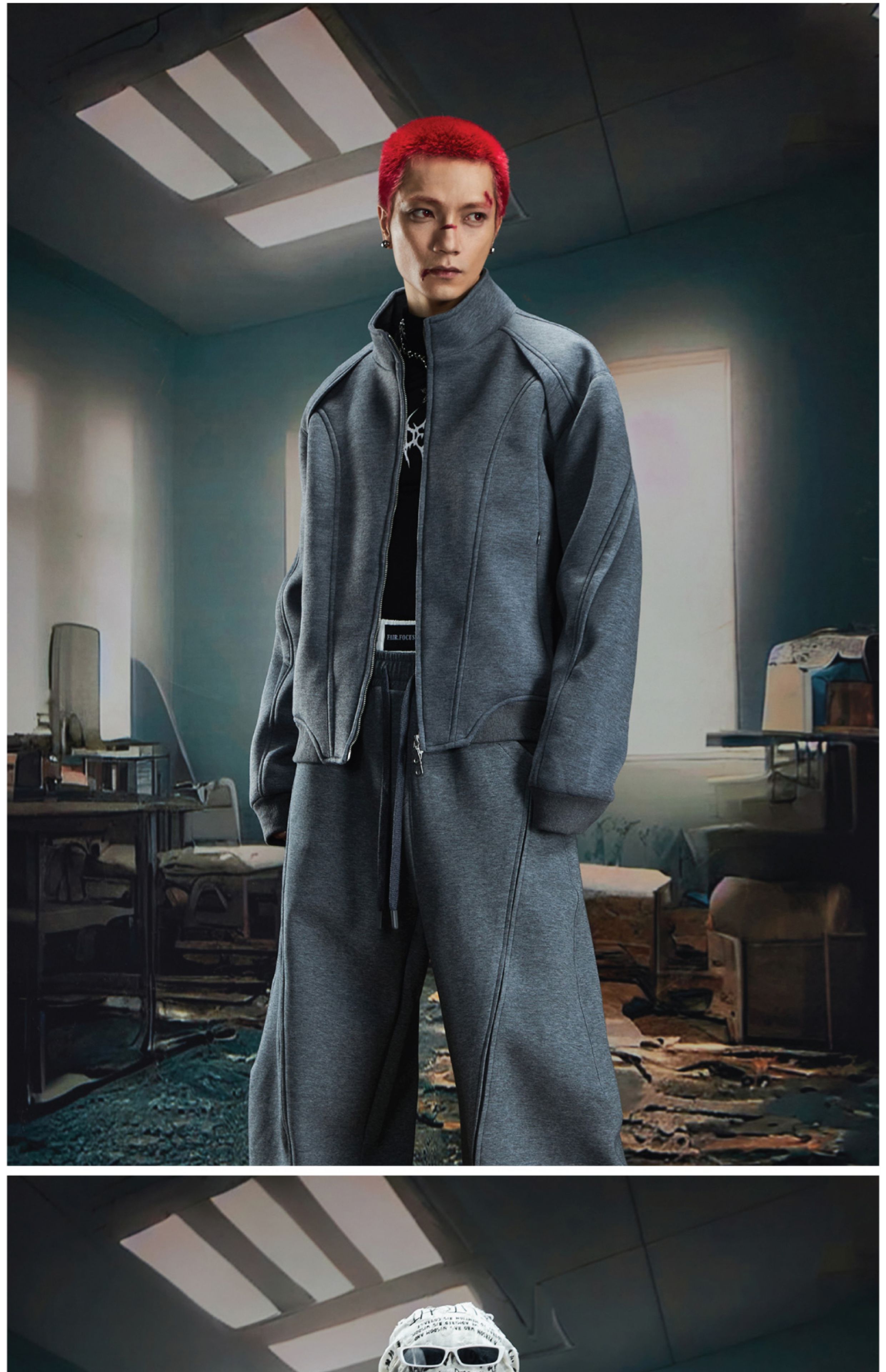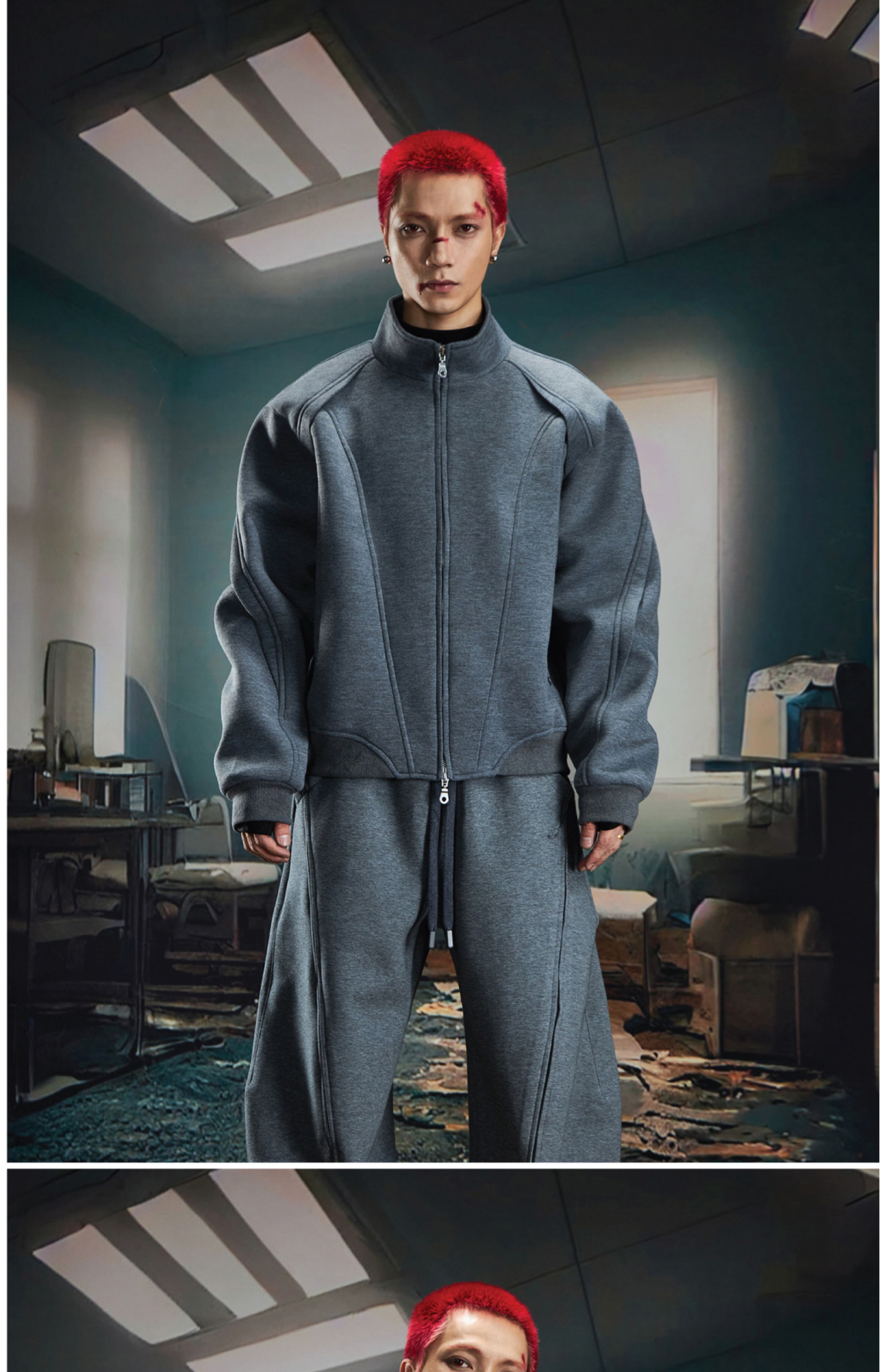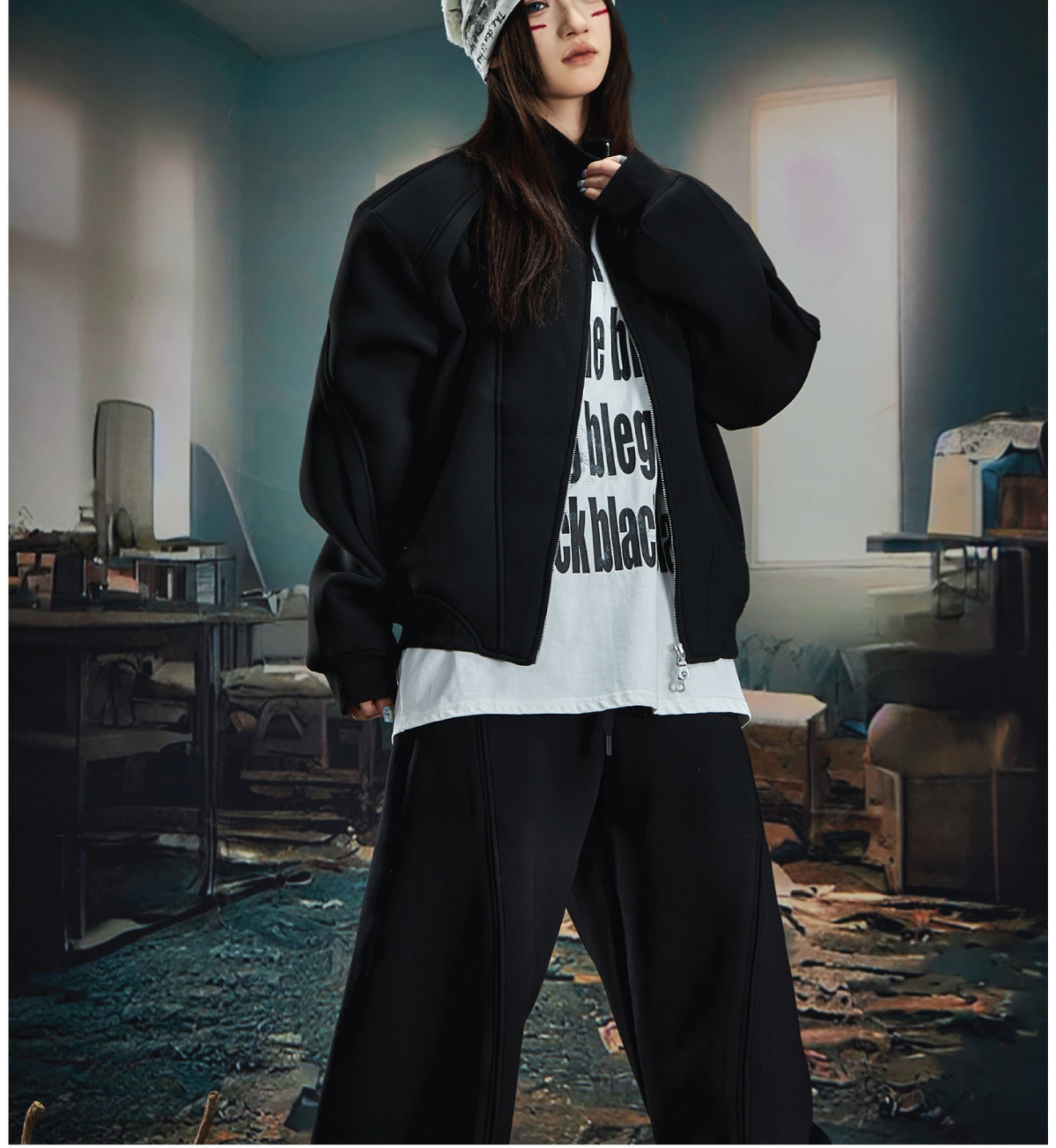 Deconstructed Oversize Zipper Stand Neck Jacket & Wide Leg Pants Setup WN20586