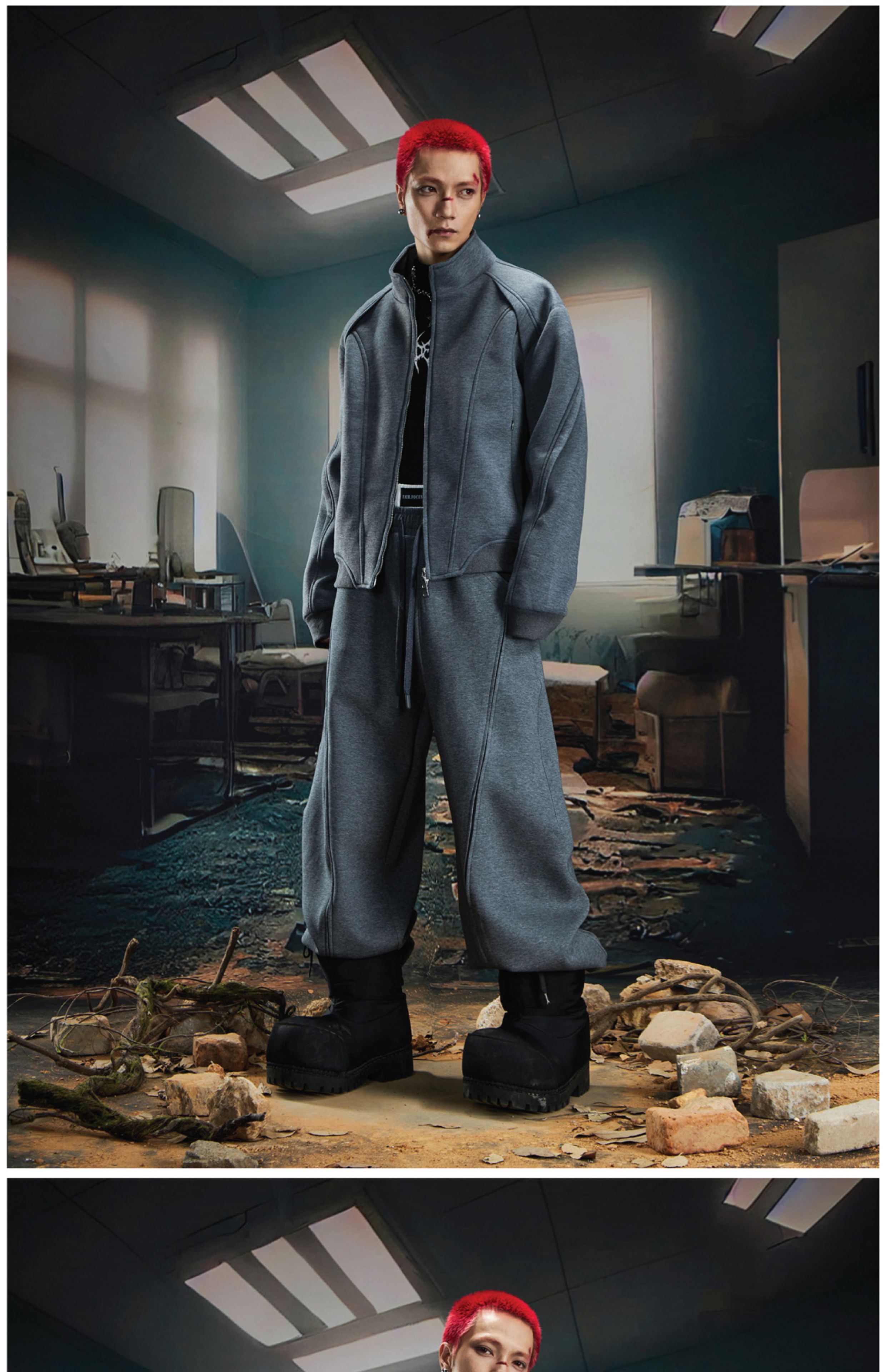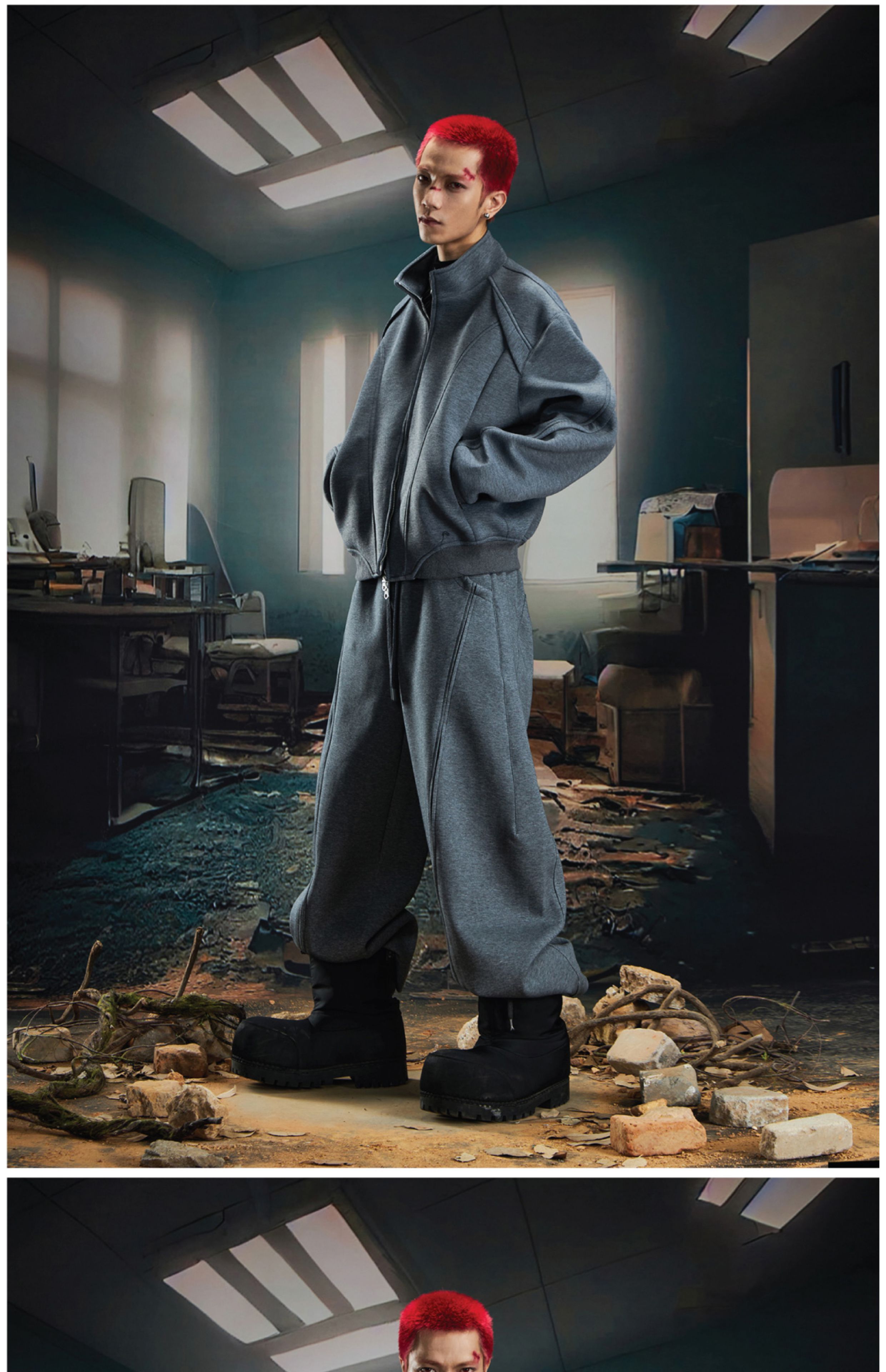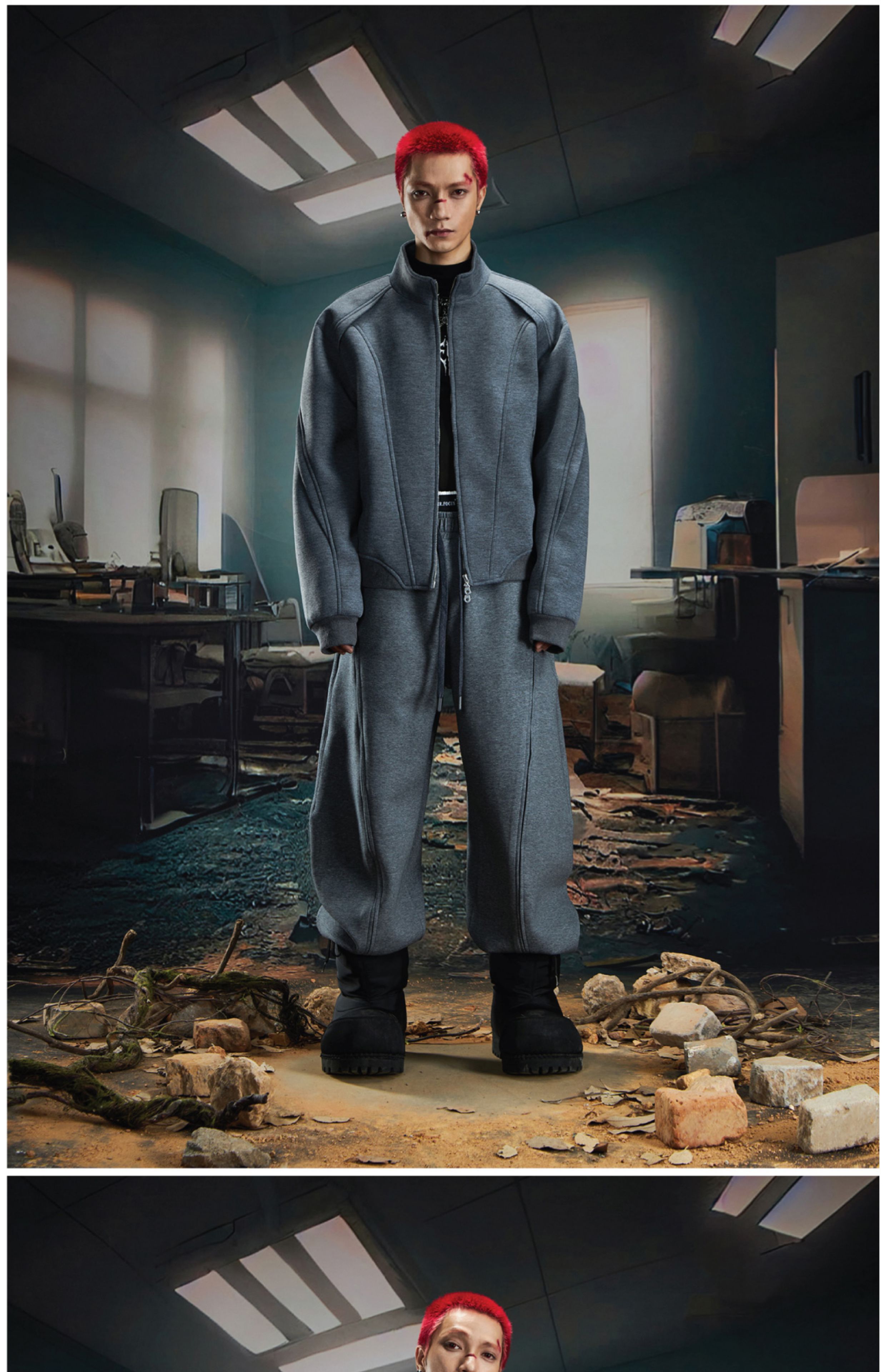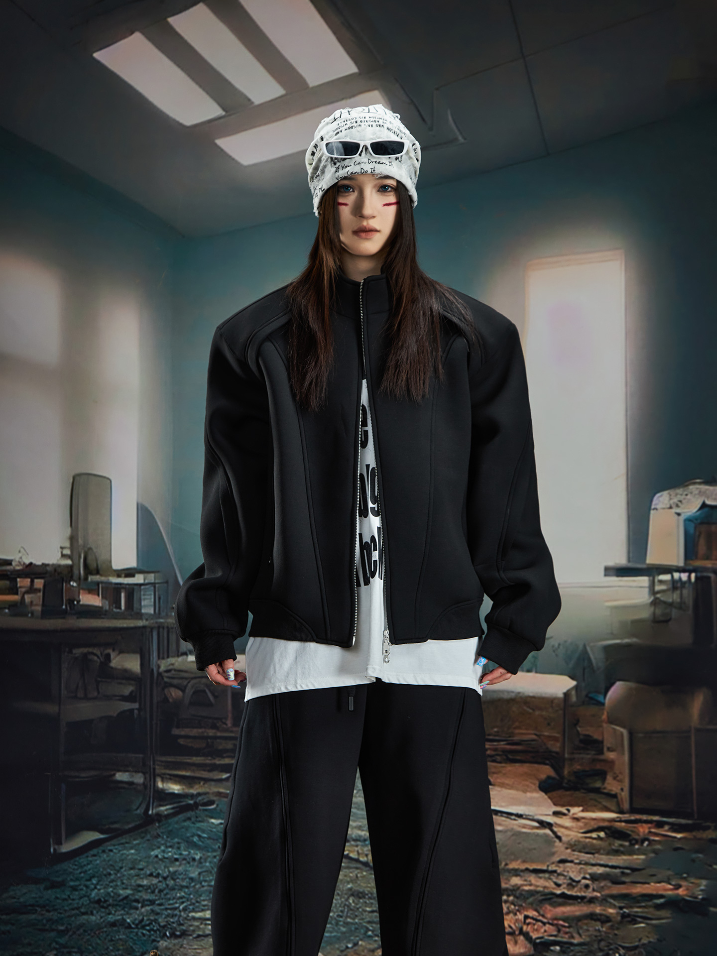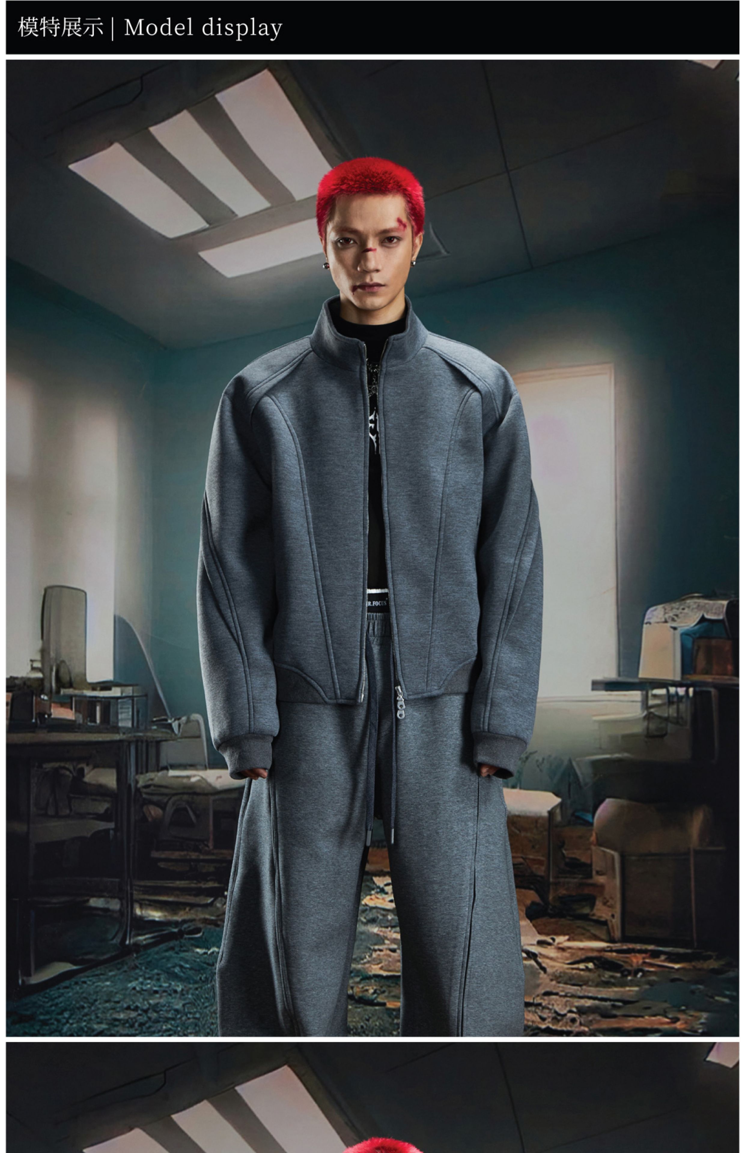 Deconstructed Oversize Zipper Stand Neck Jacket & Wide Leg Pants Setup WN20586