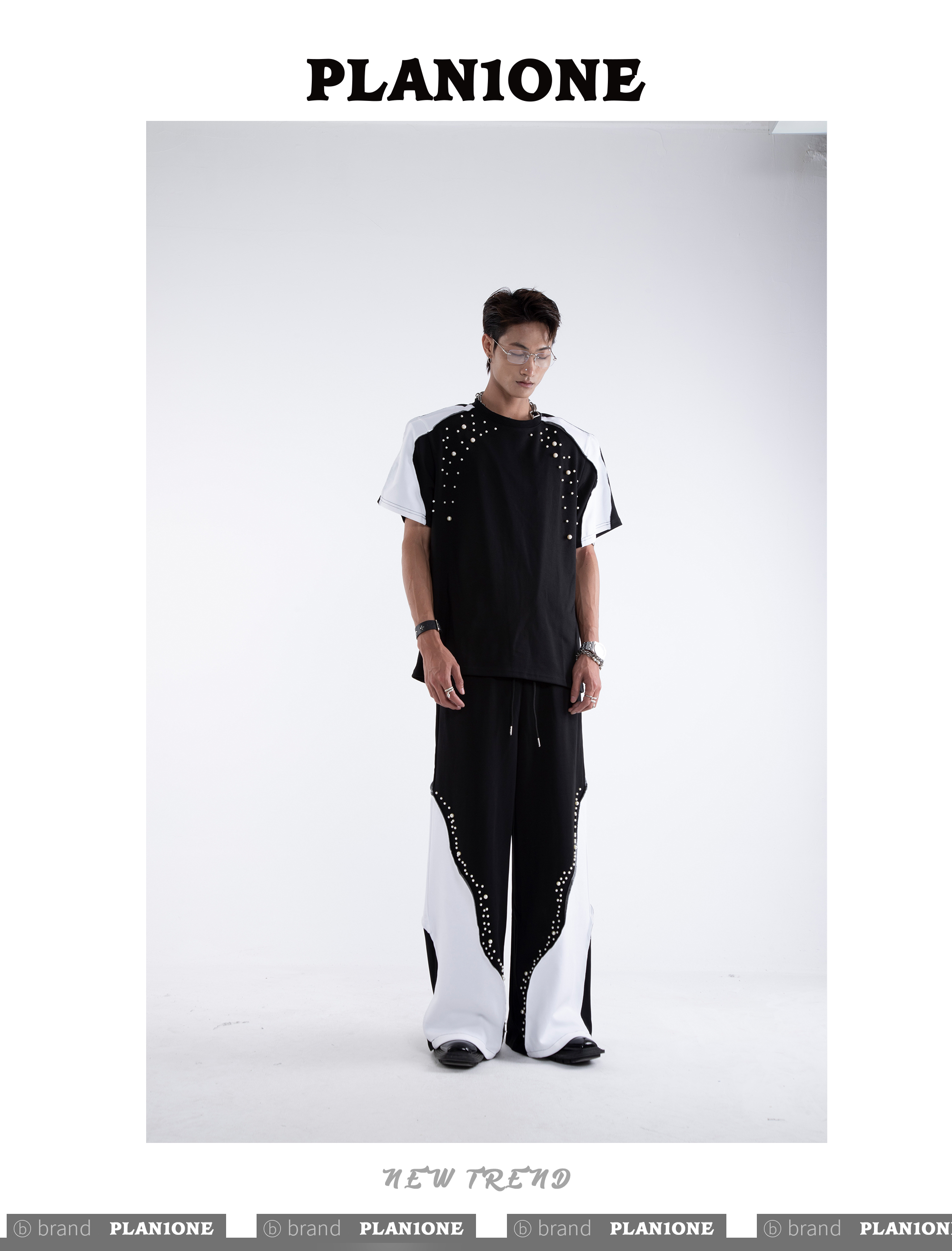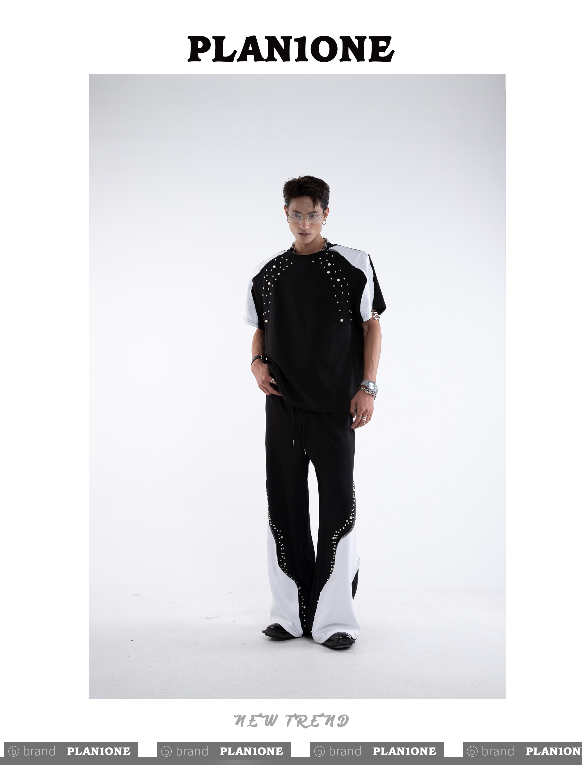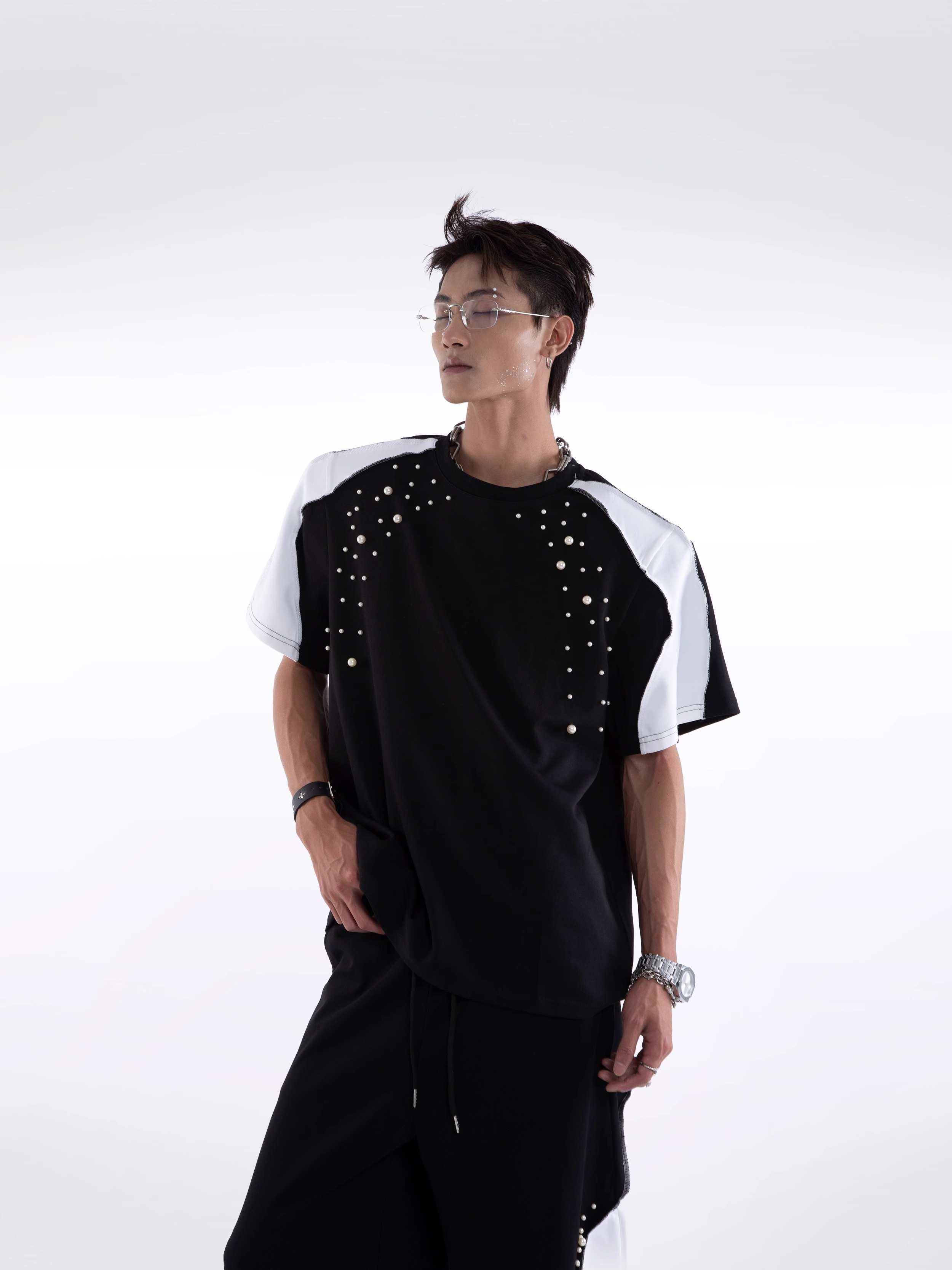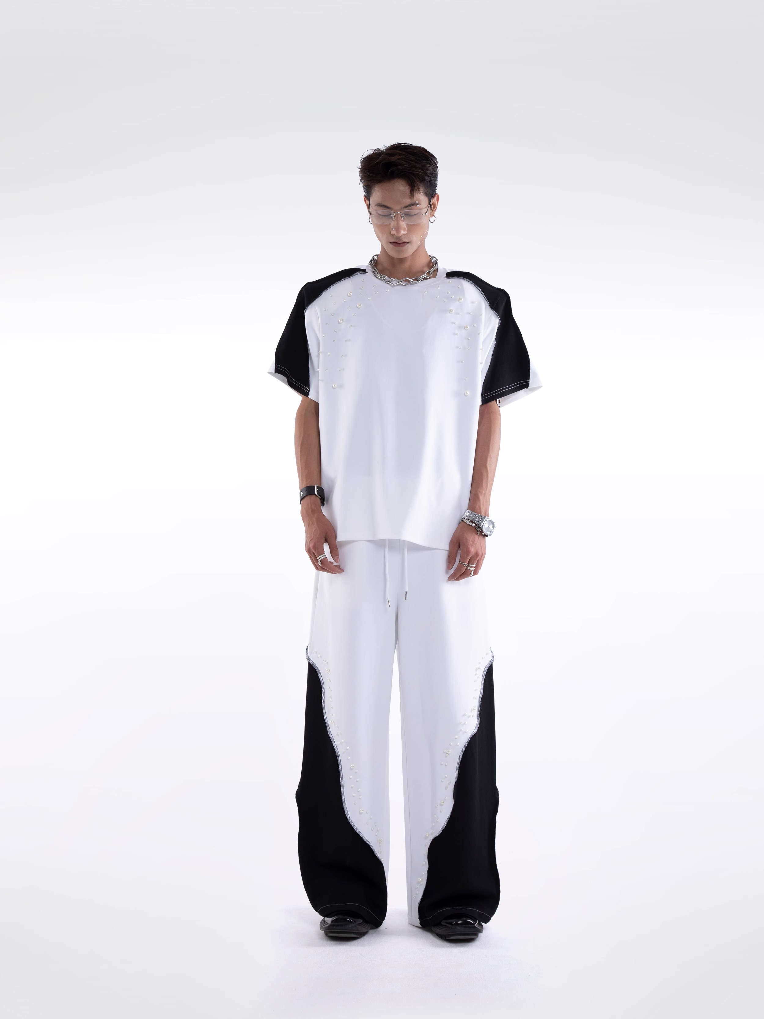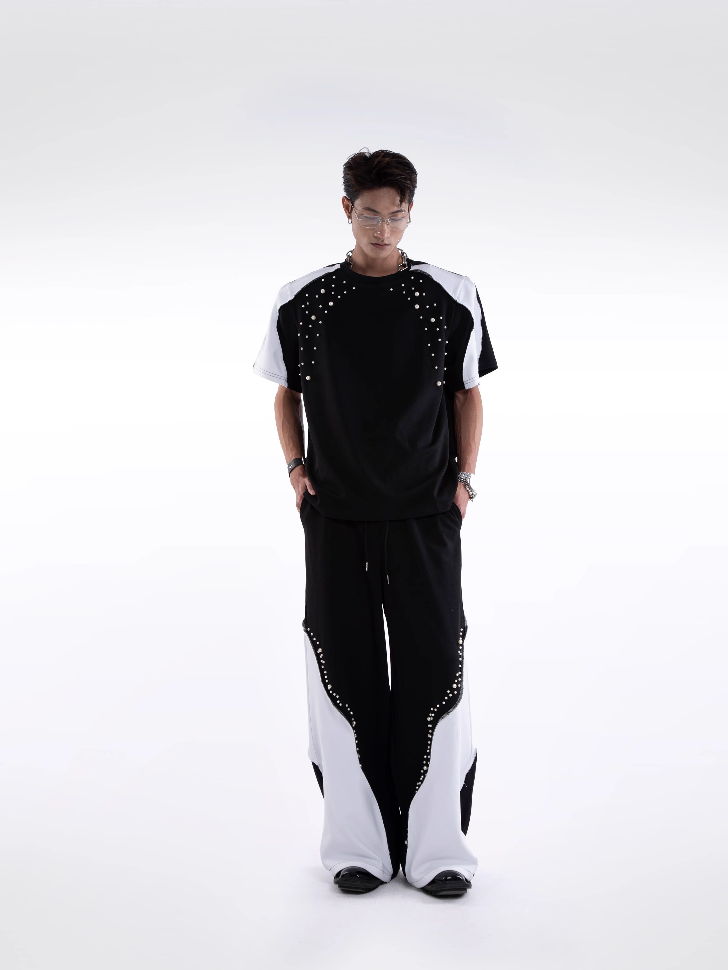 Beading Paint Shoulder-Pad Short Sleeve T-Shirt & Wide Leg Pants Setup WN20640