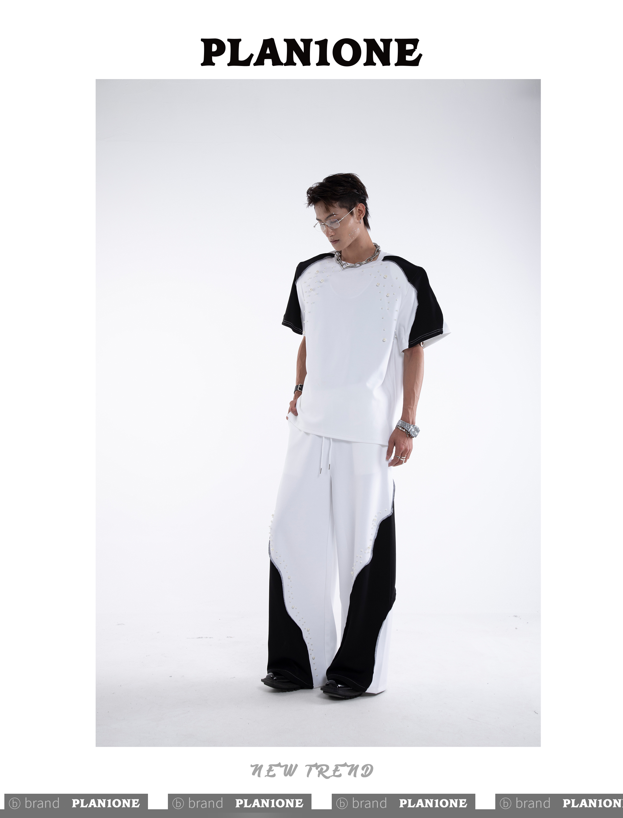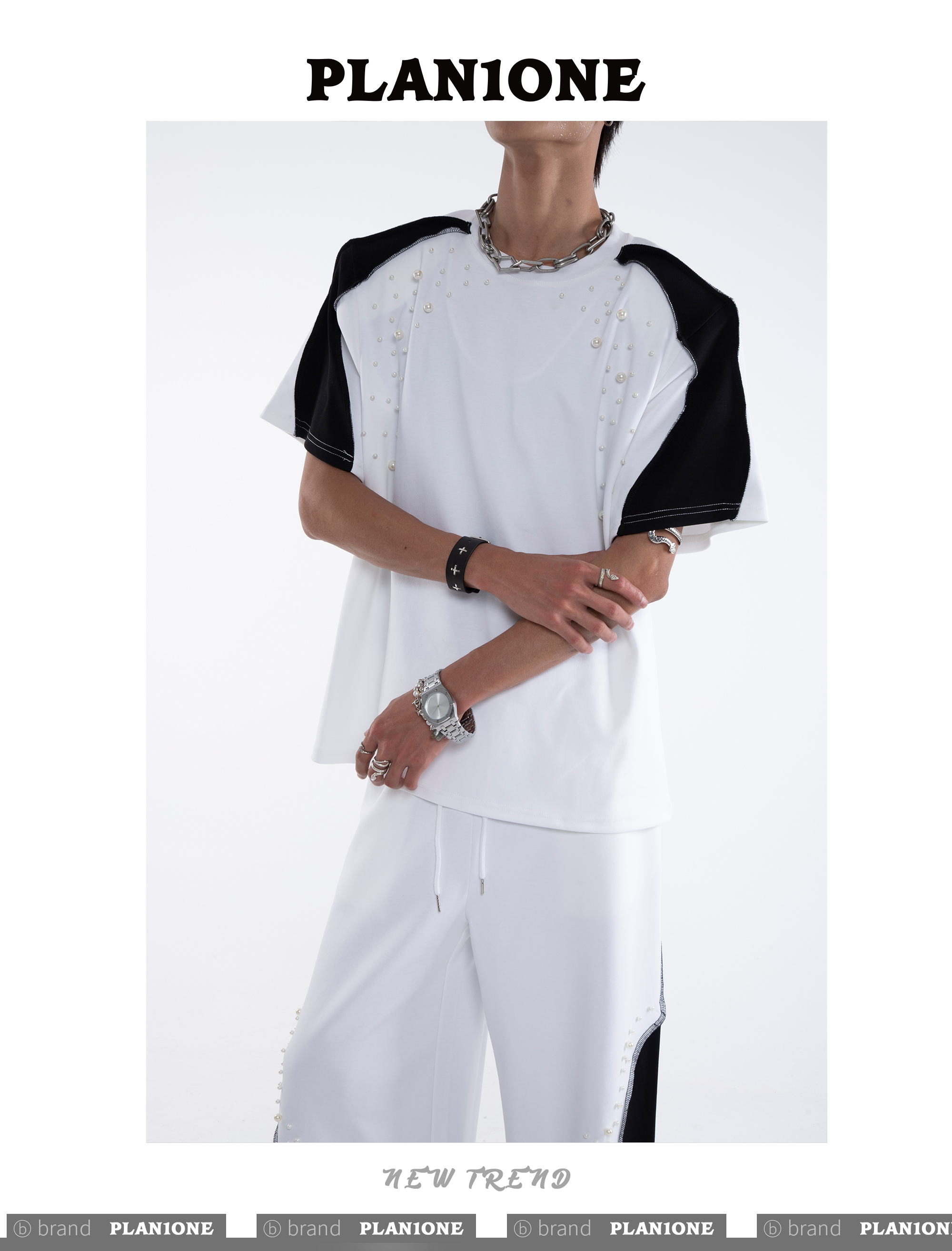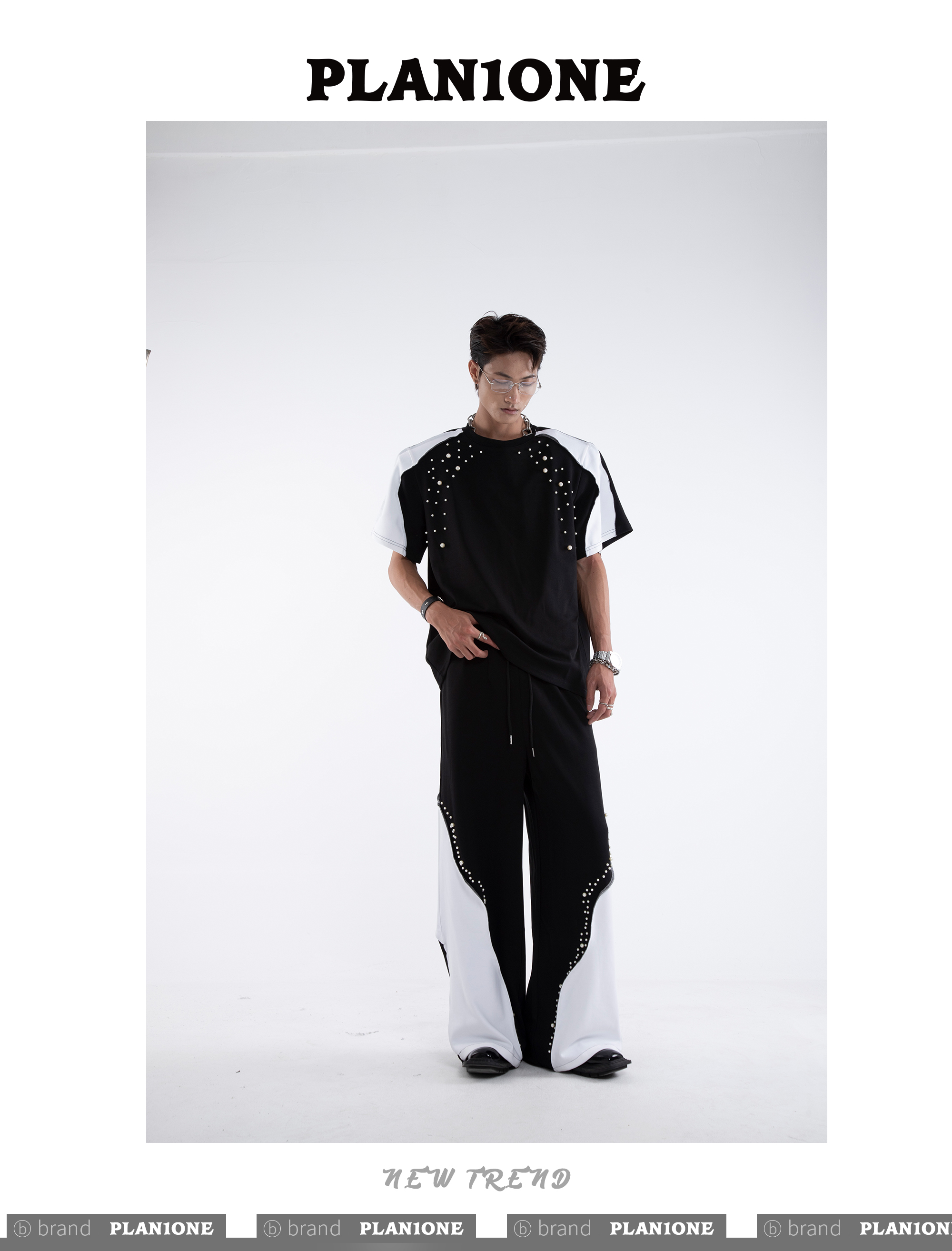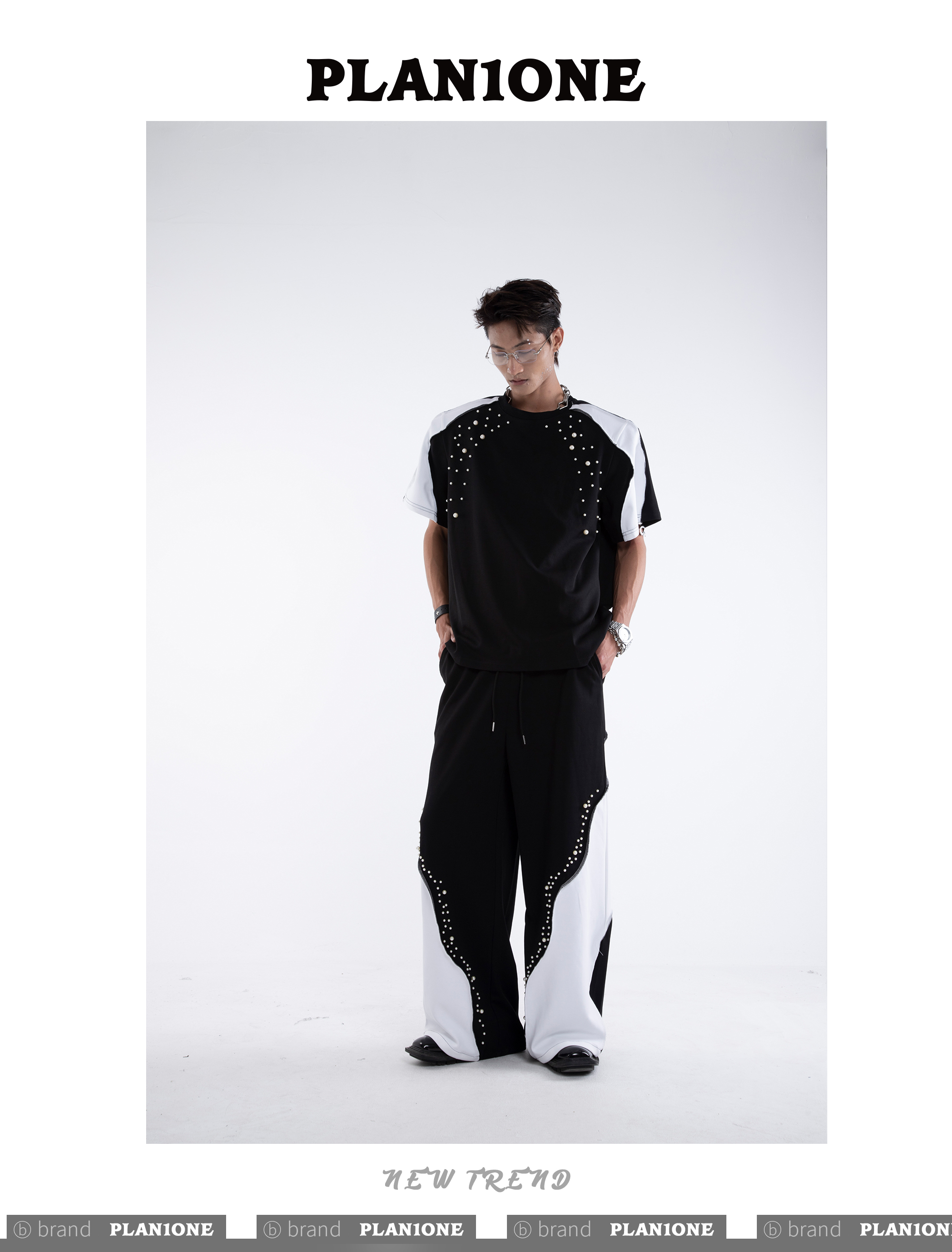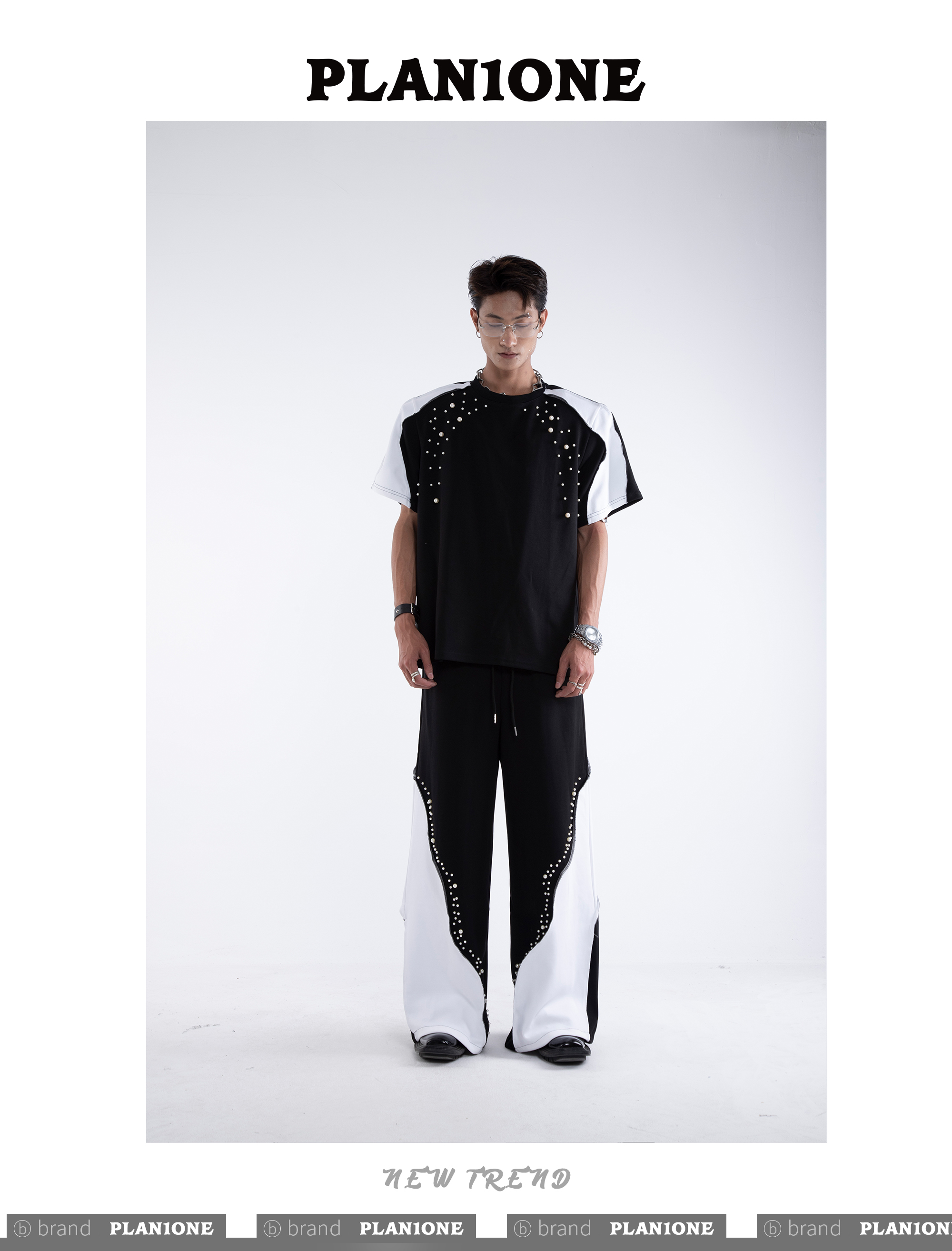 Beading Paint Shoulder-Pad Short Sleeve T-Shirt & Wide Leg Pants Setup WN20640