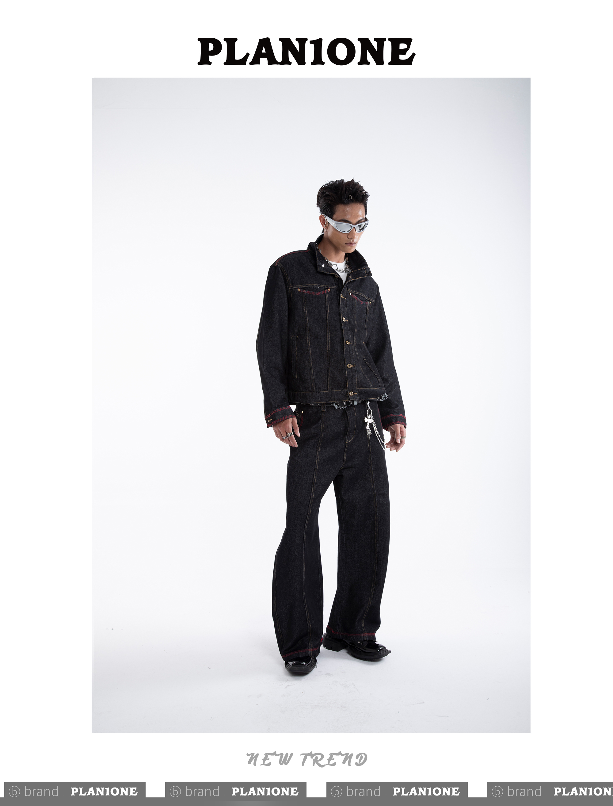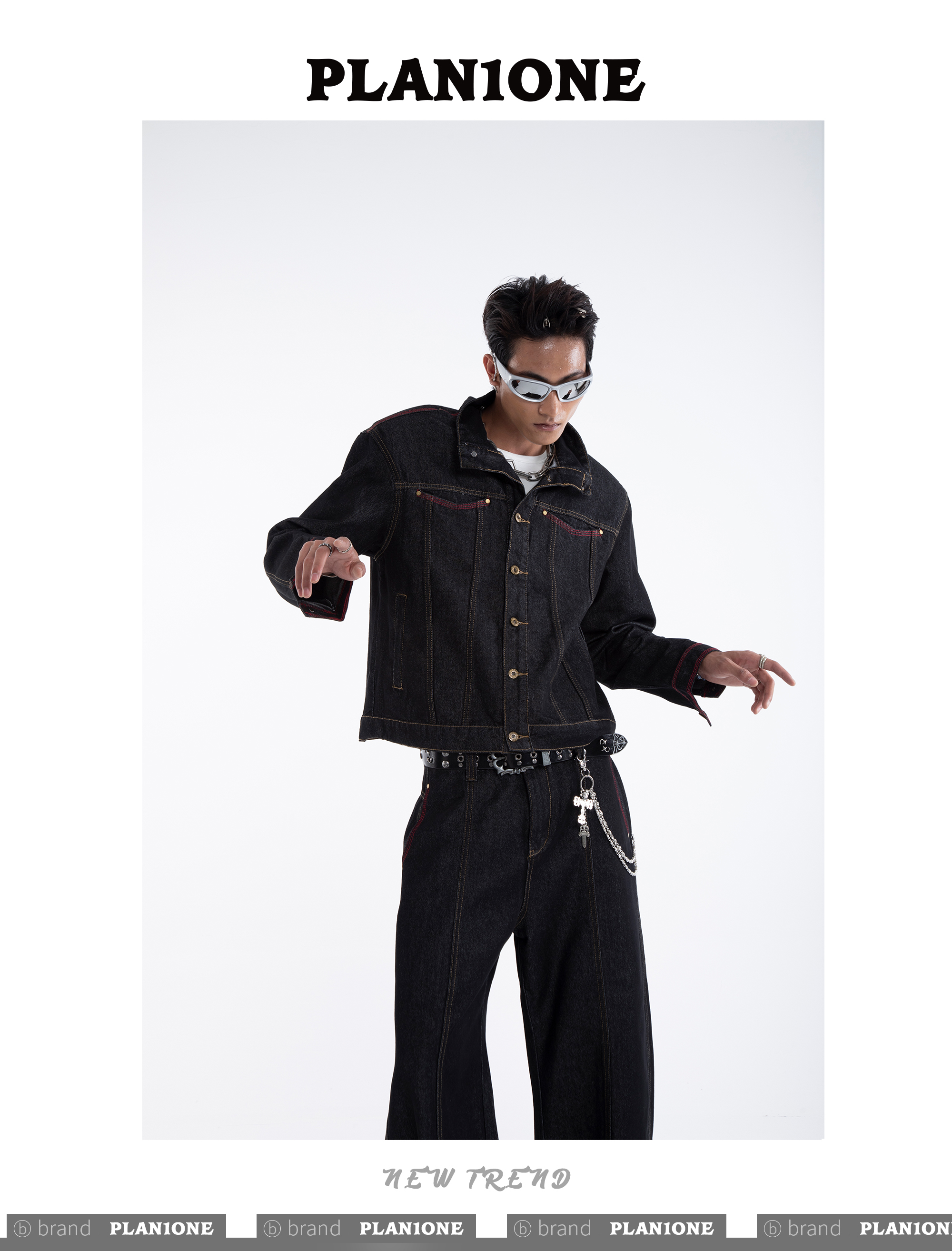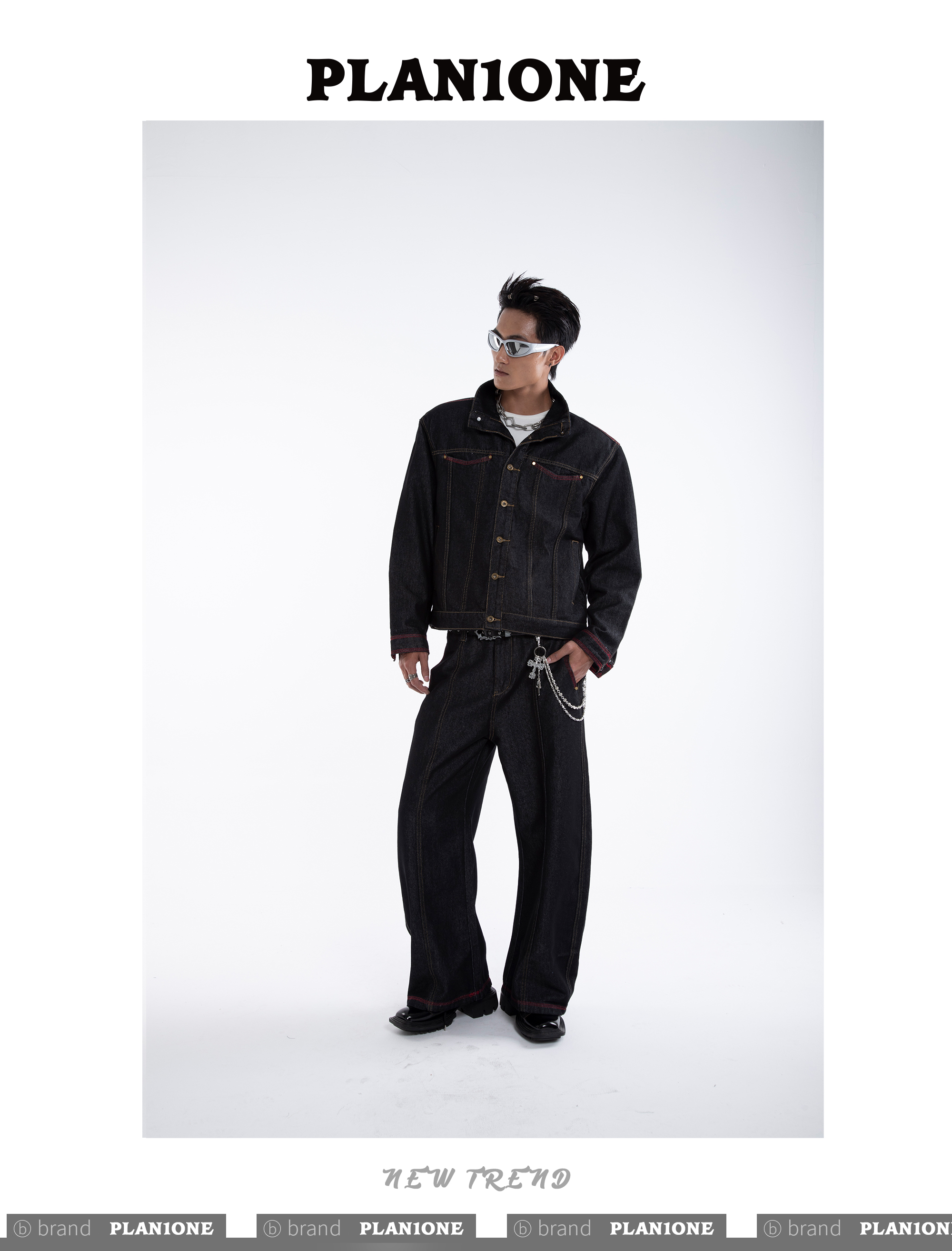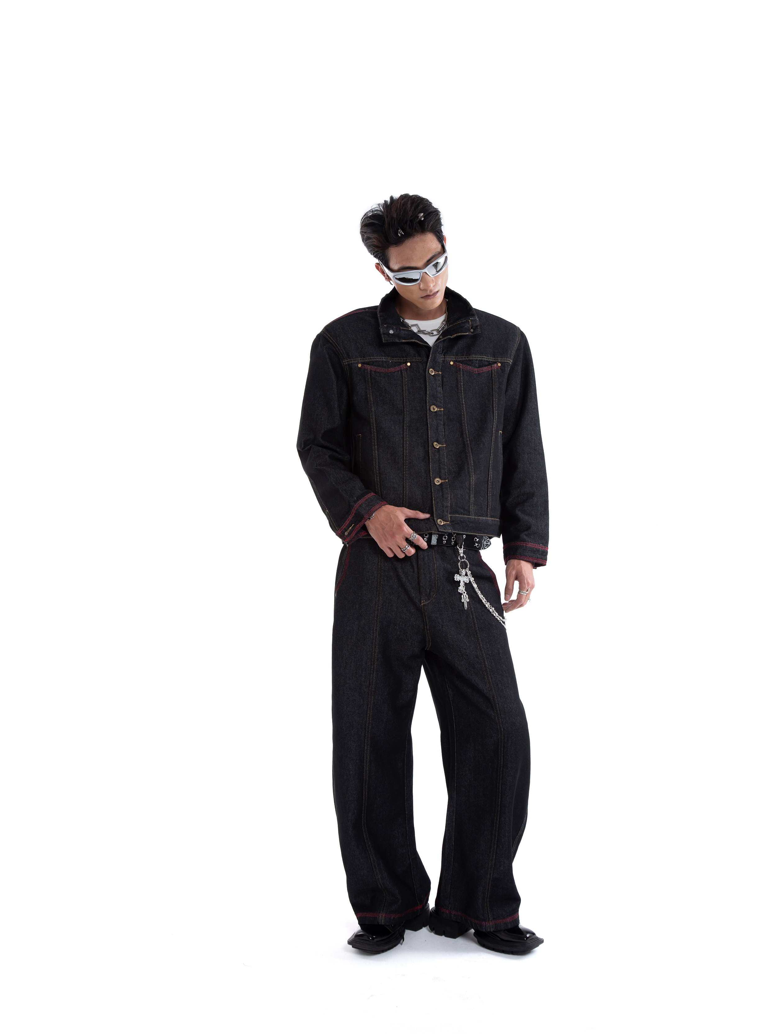 Standing-Collar Washed Denim Jacket & Denim Jeans Setup WN20655