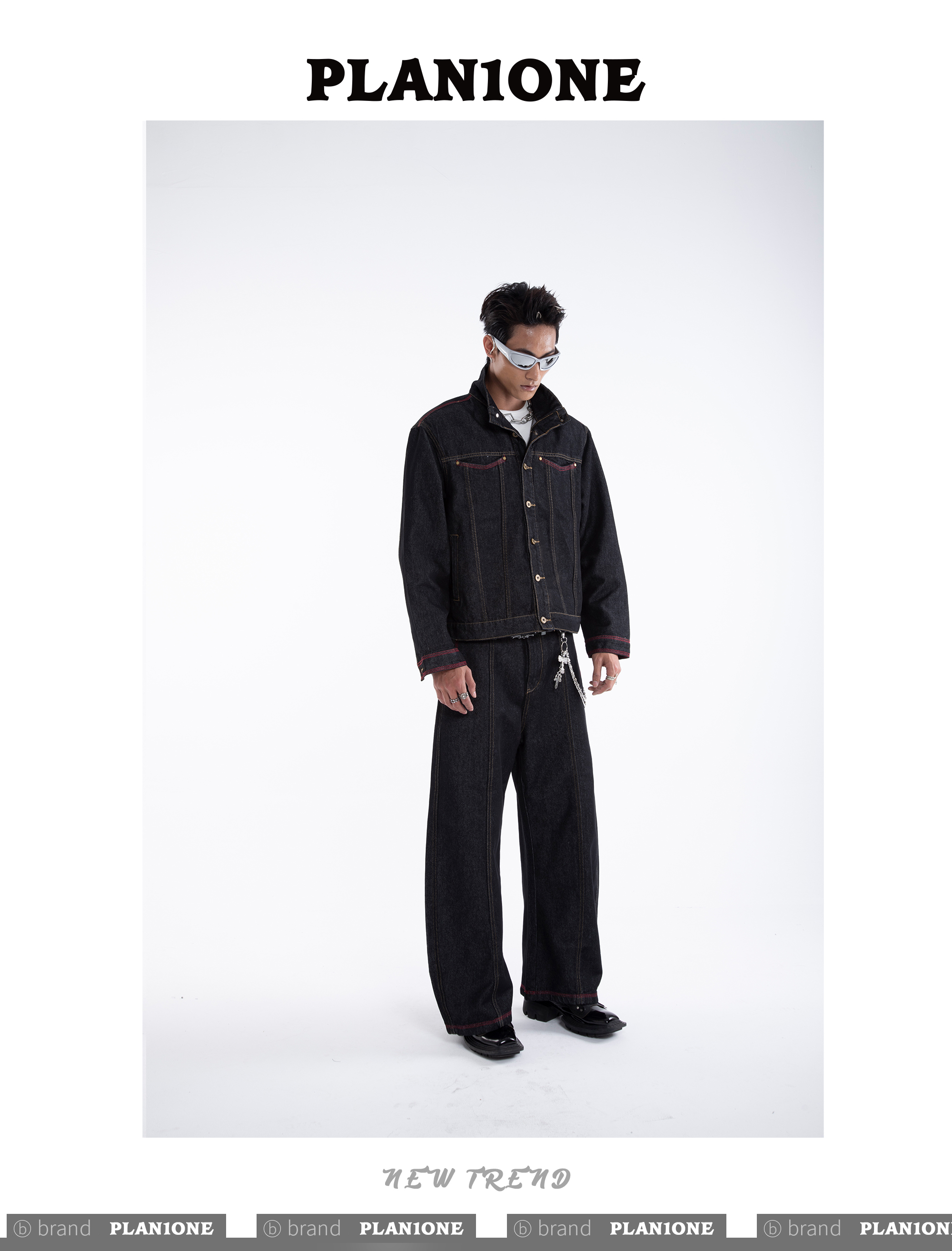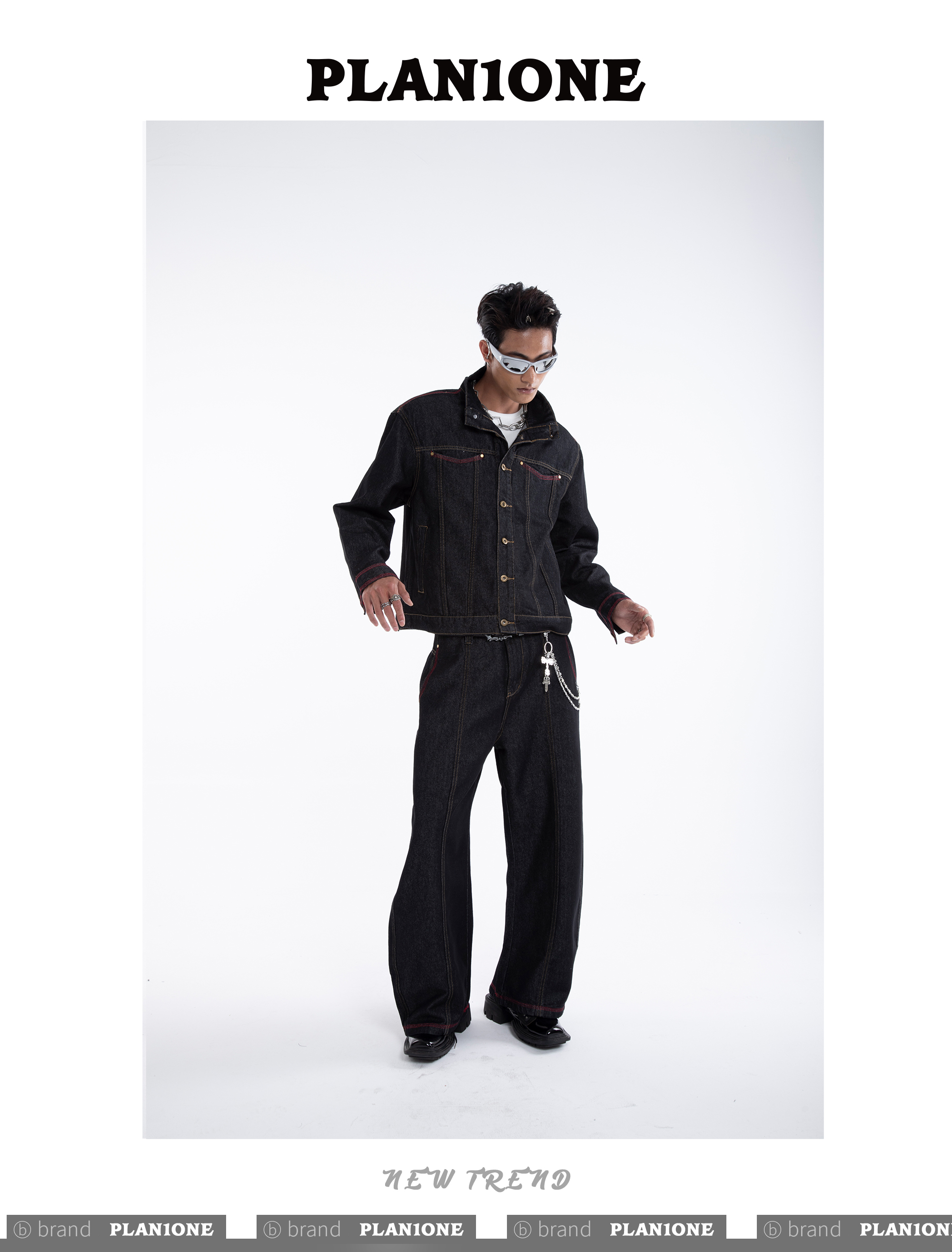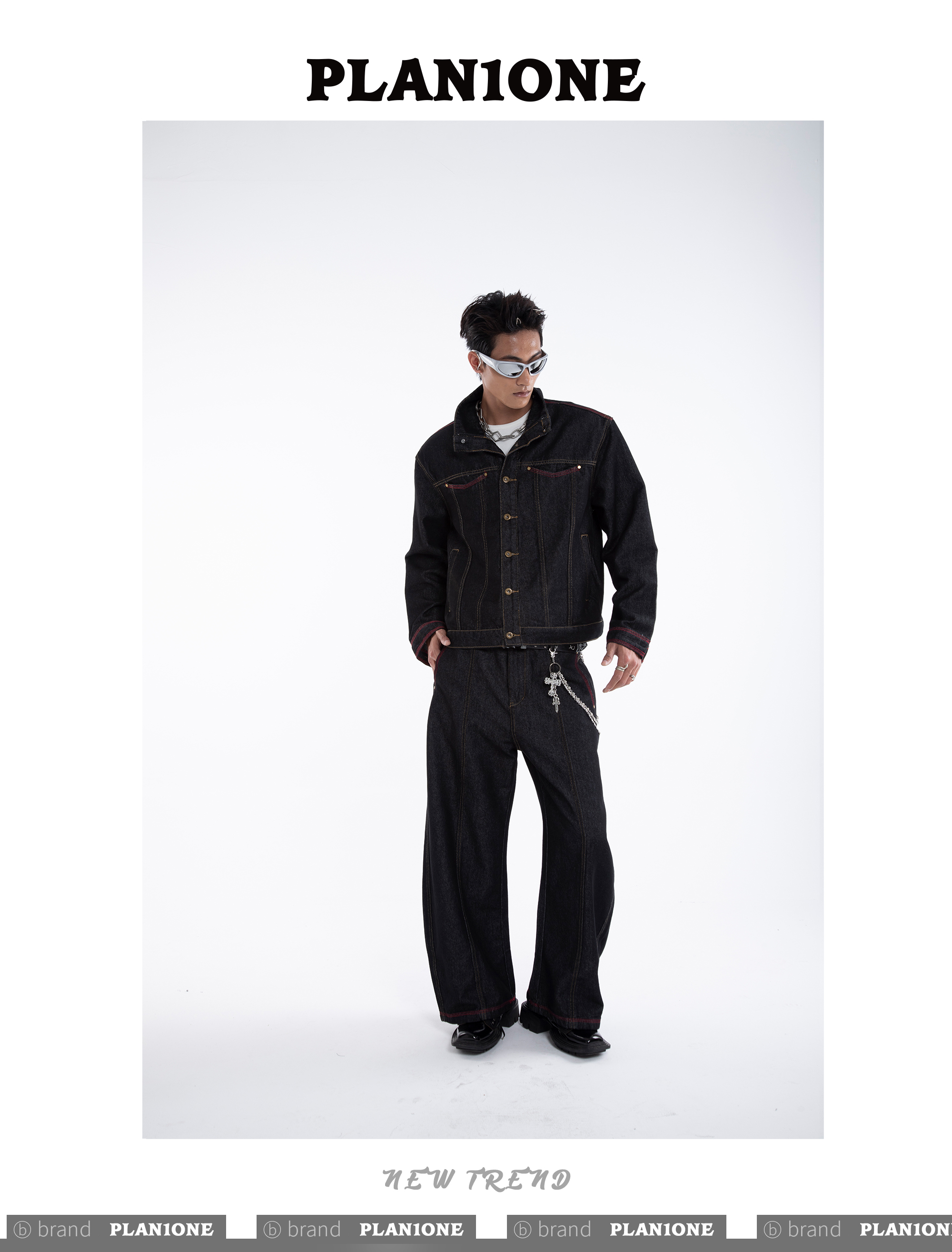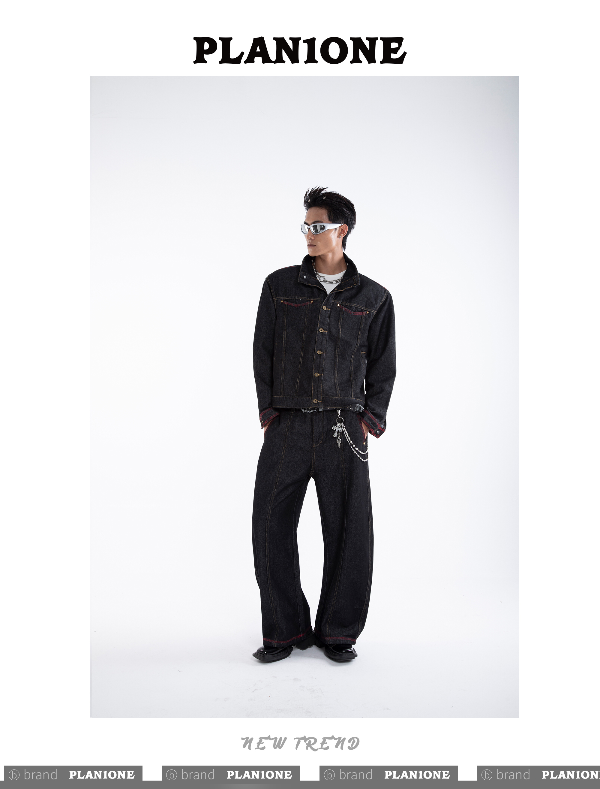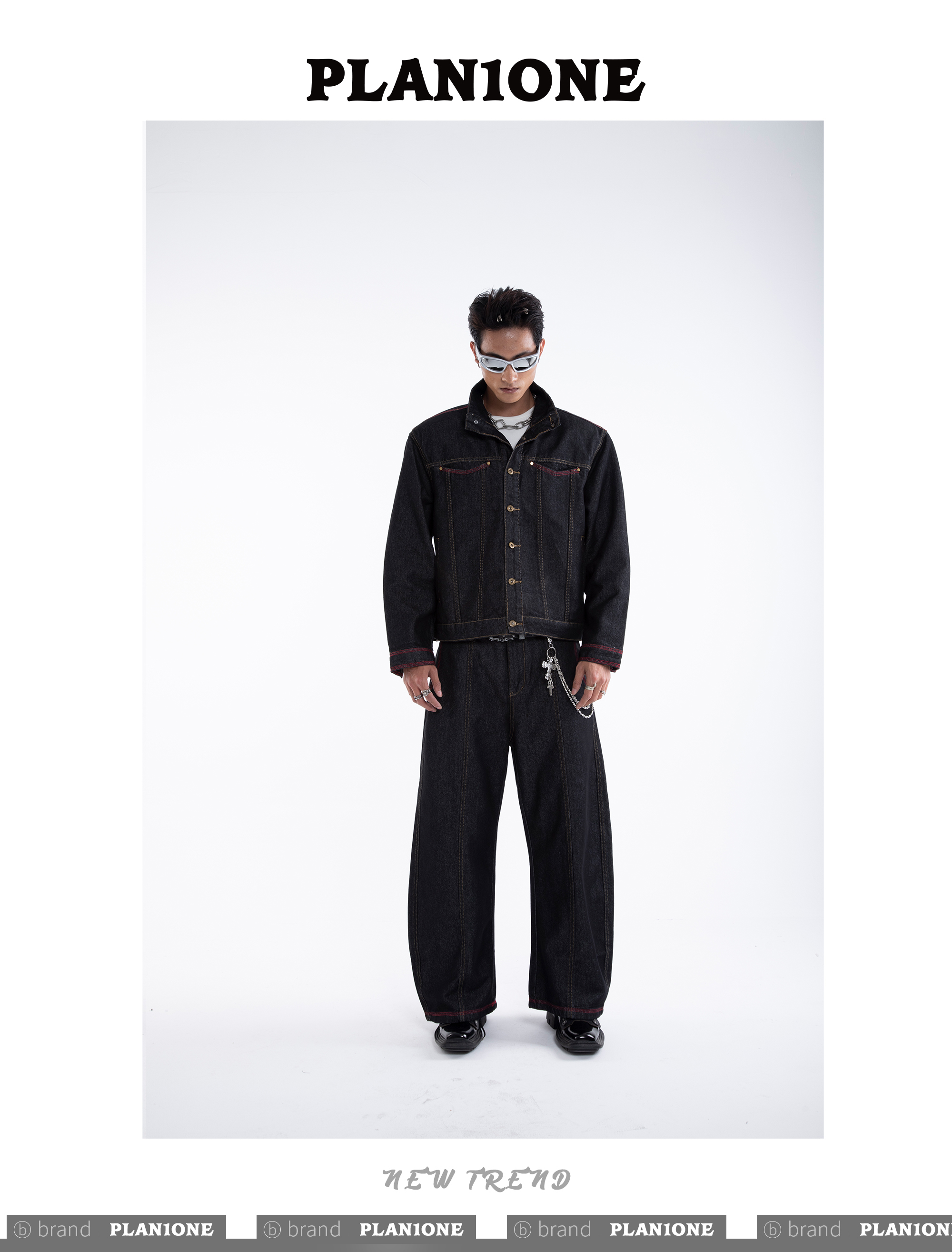 Standing-Collar Washed Denim Jacket & Denim Jeans Setup WN20655