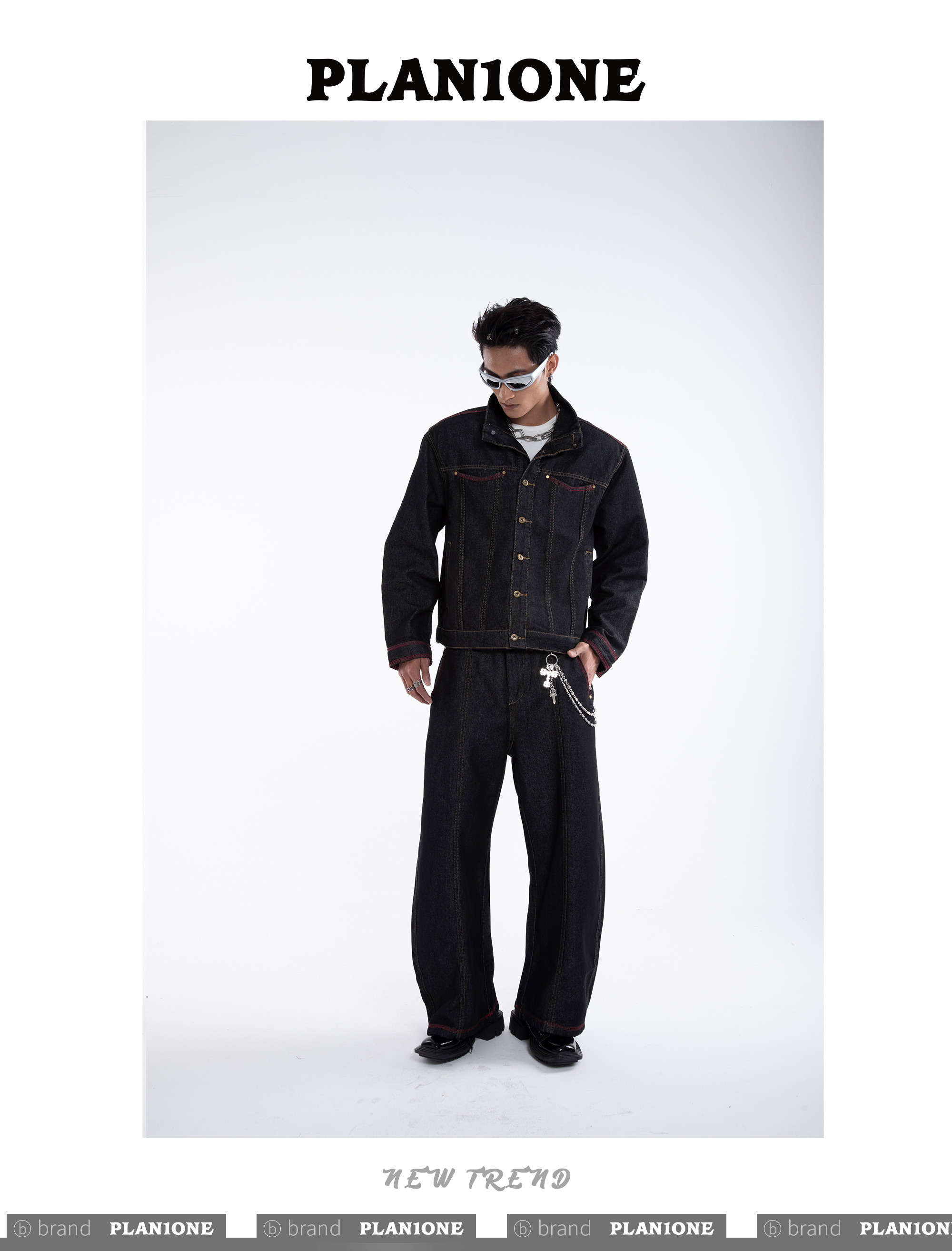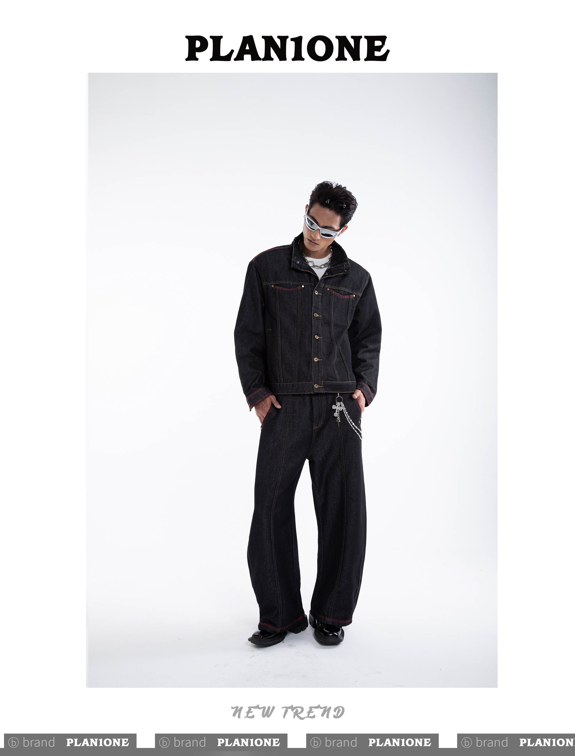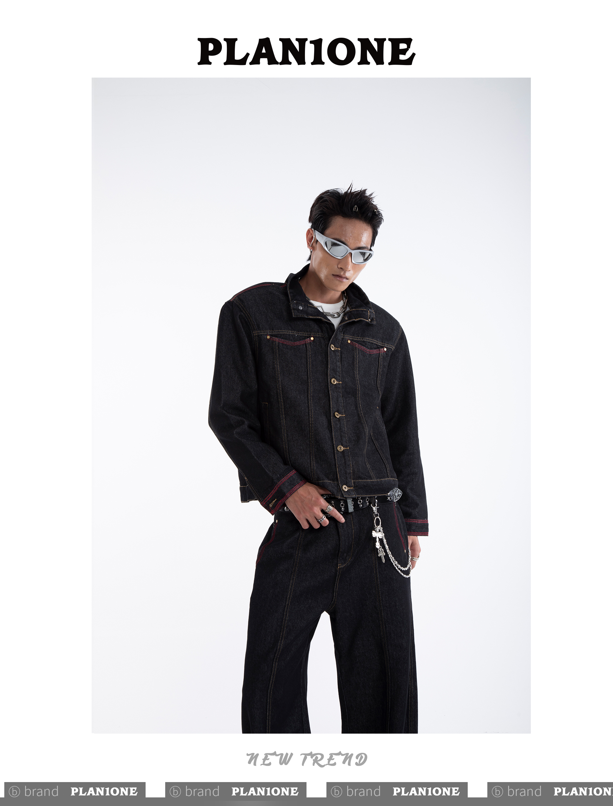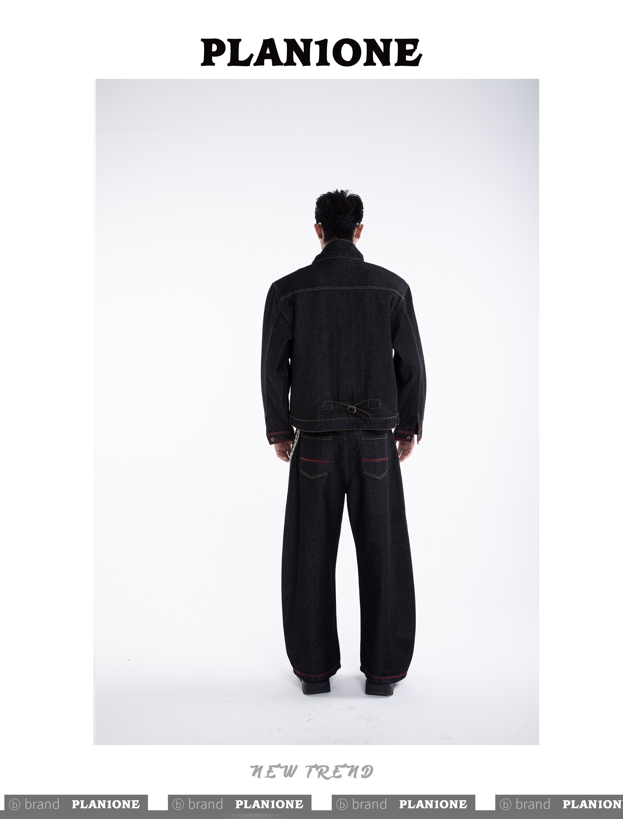 Standing-Collar Washed Denim Jacket & Denim Jeans Setup WN20655