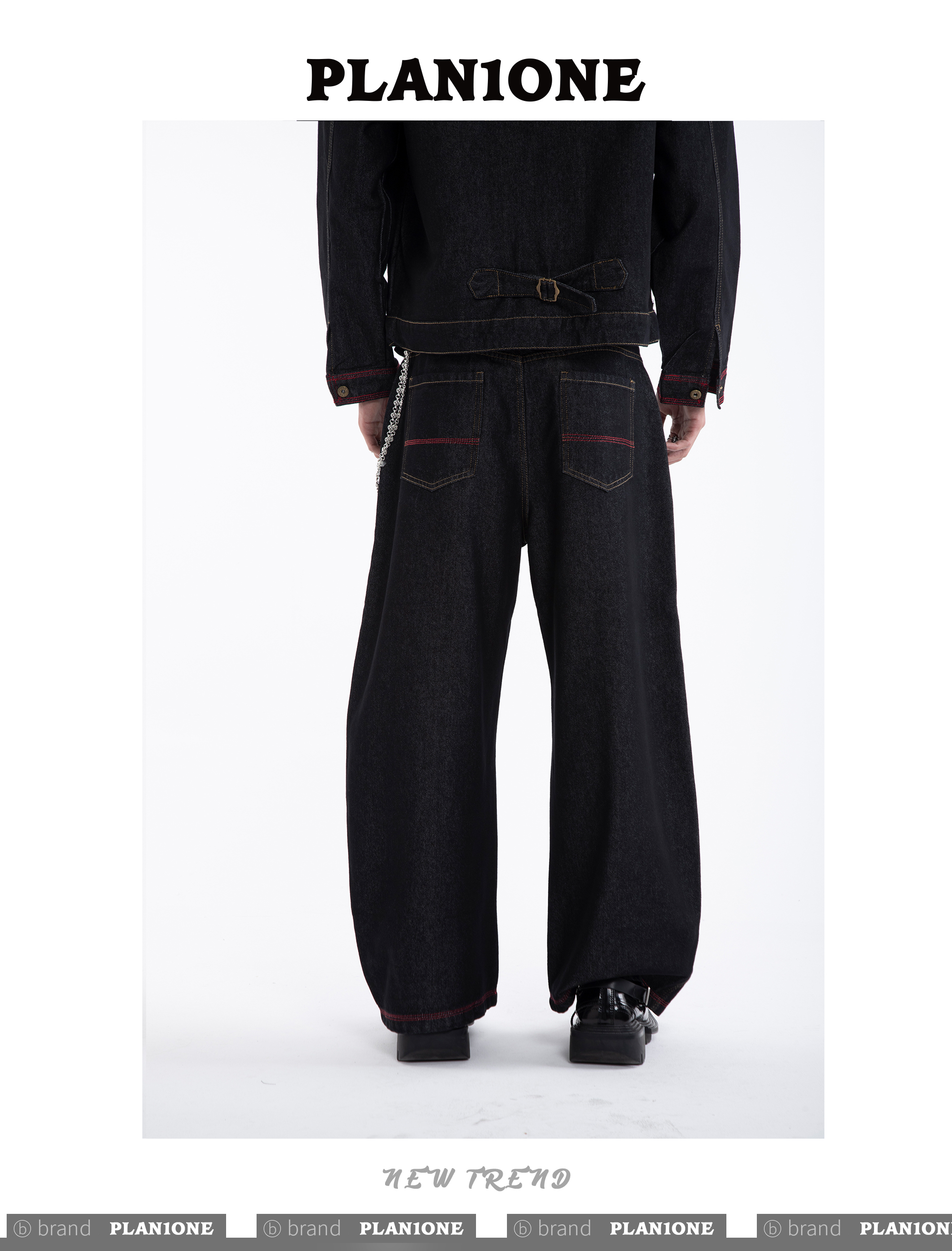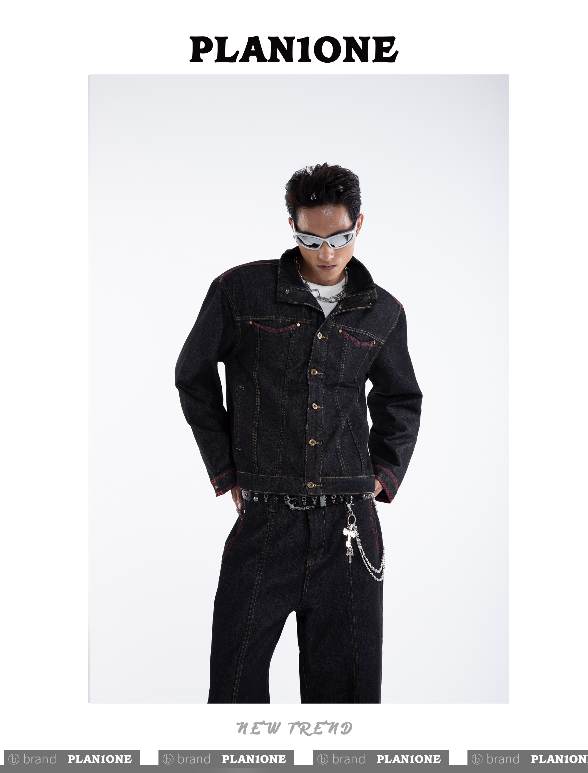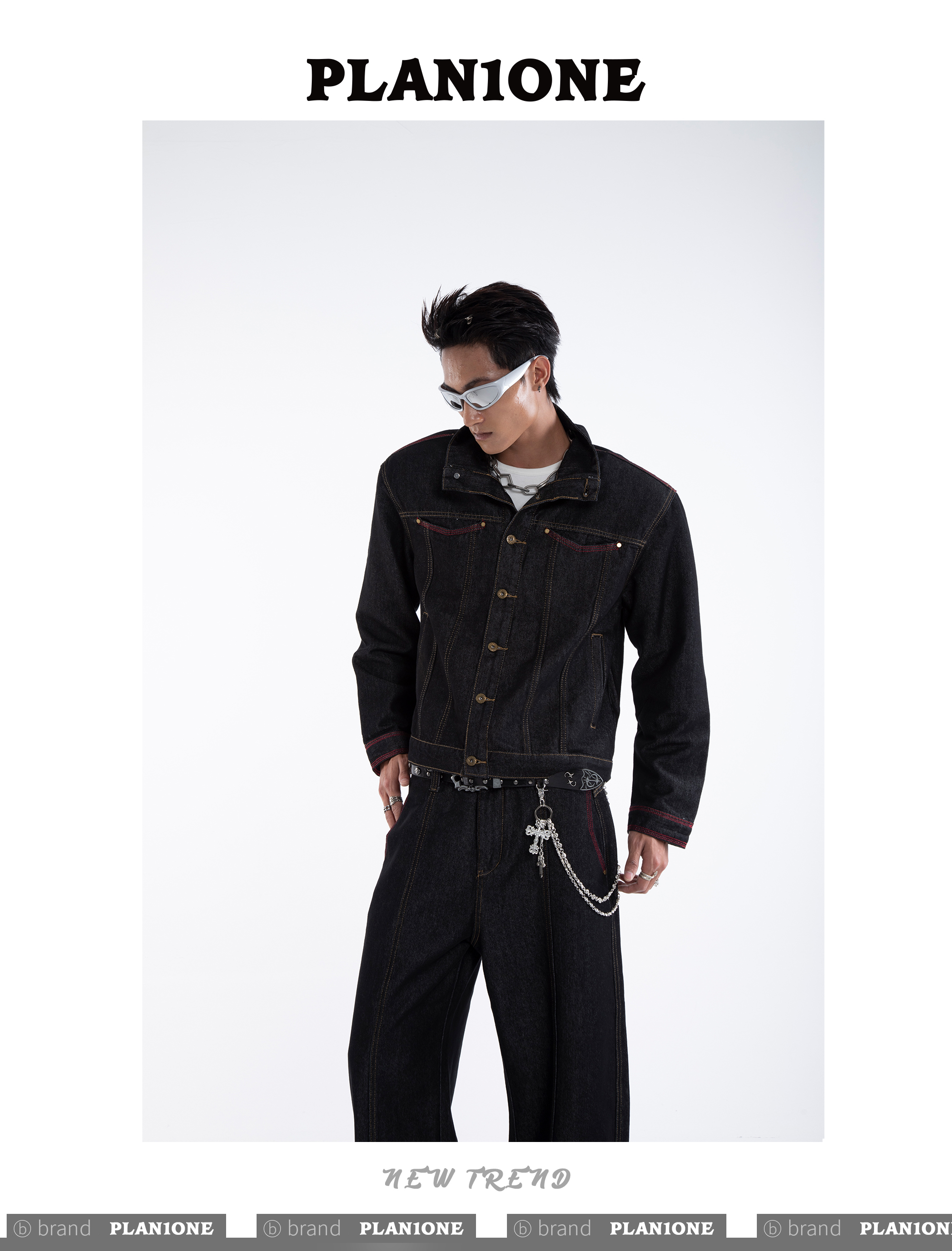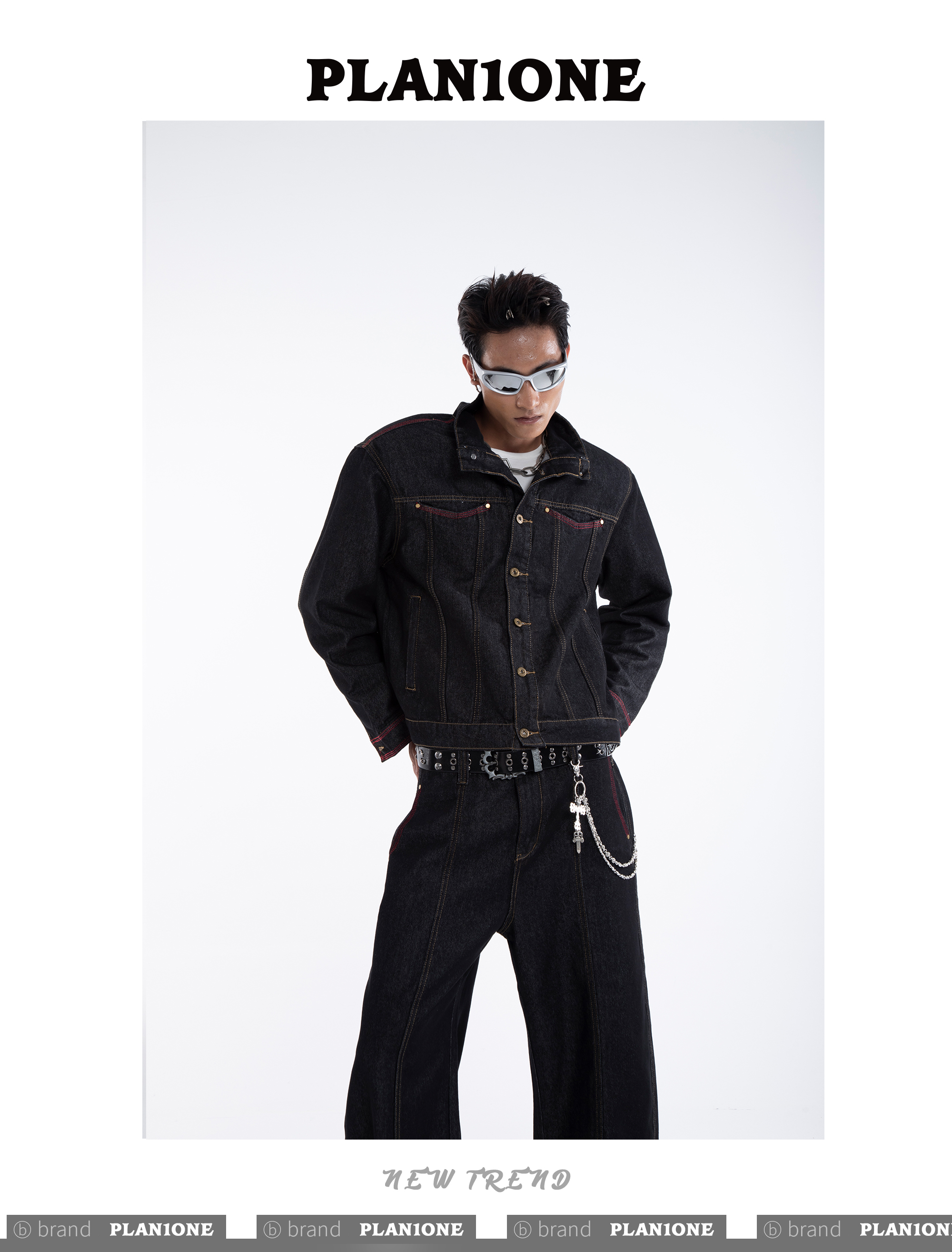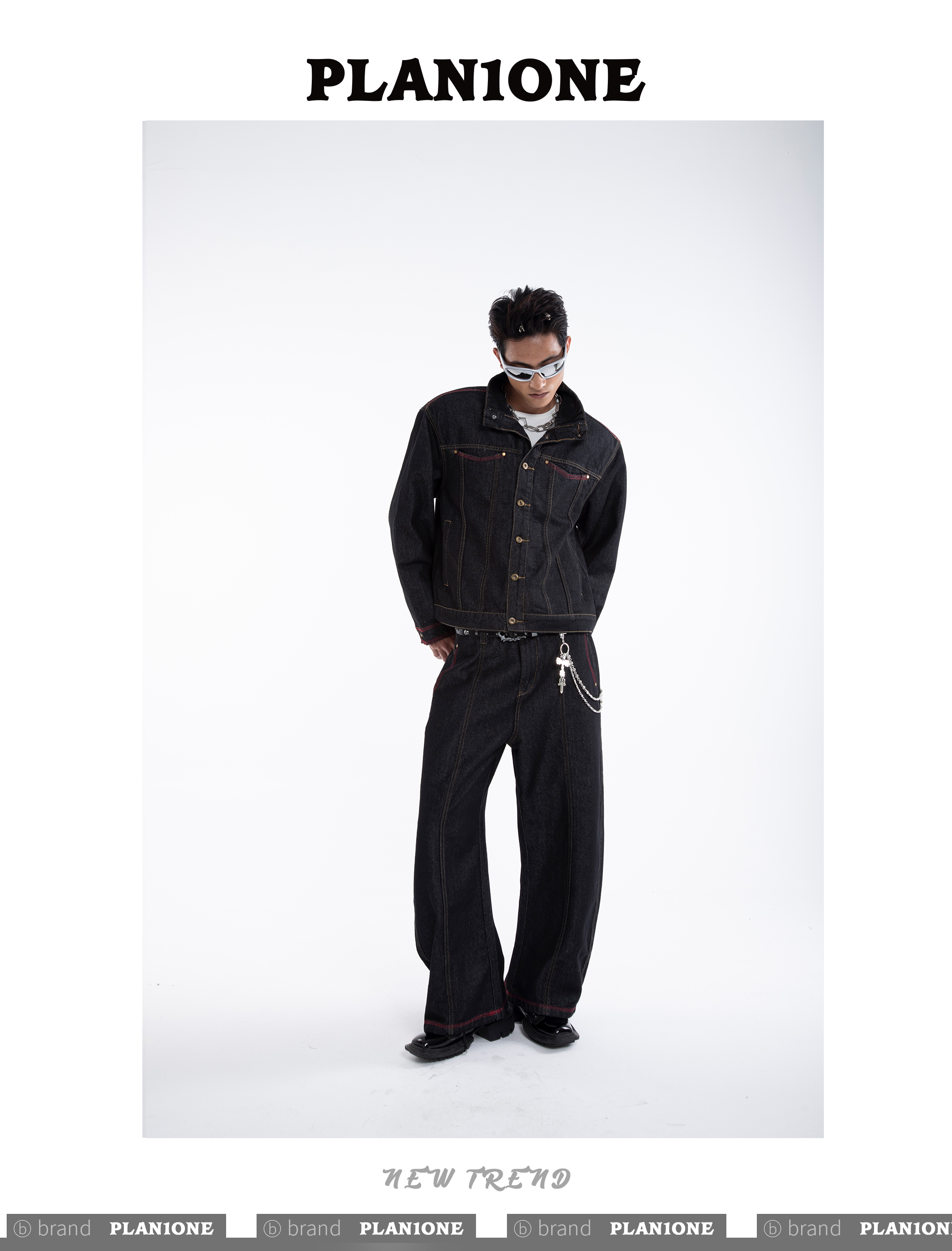 Standing-Collar Washed Denim Jacket & Denim Jeans Setup WN20655