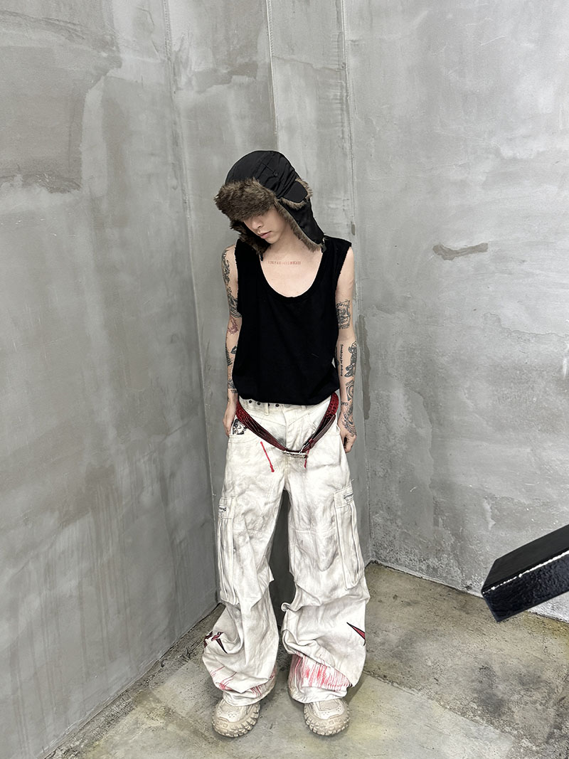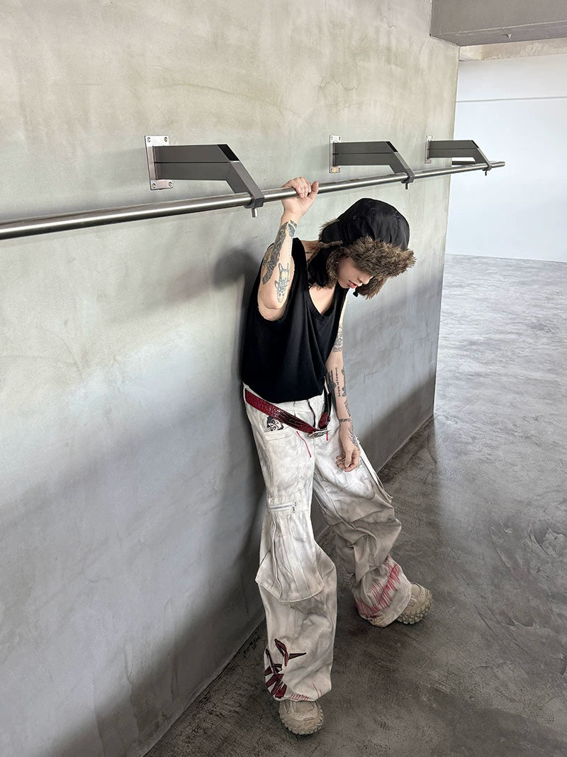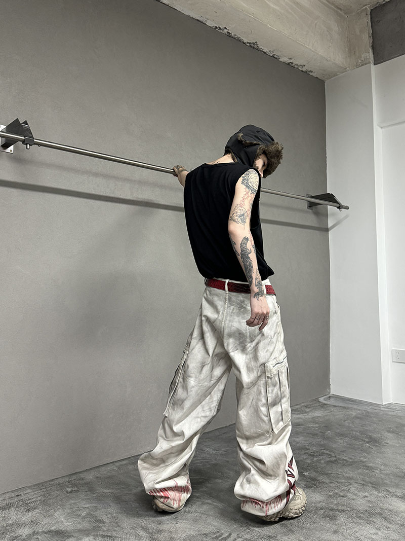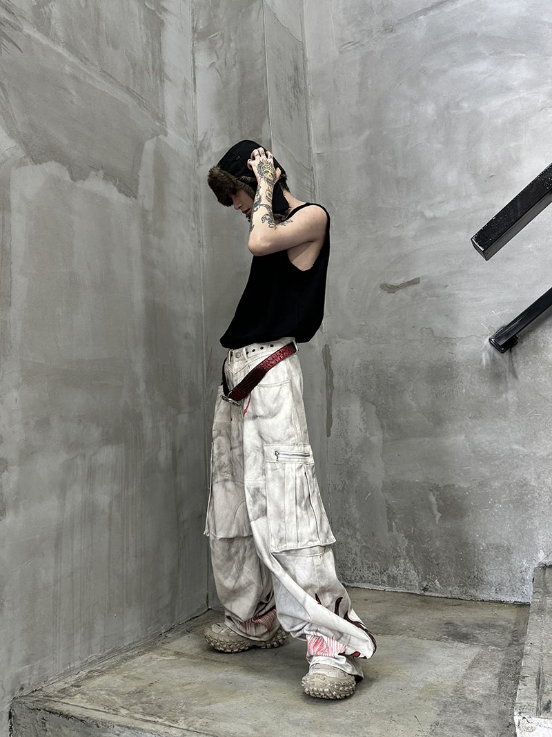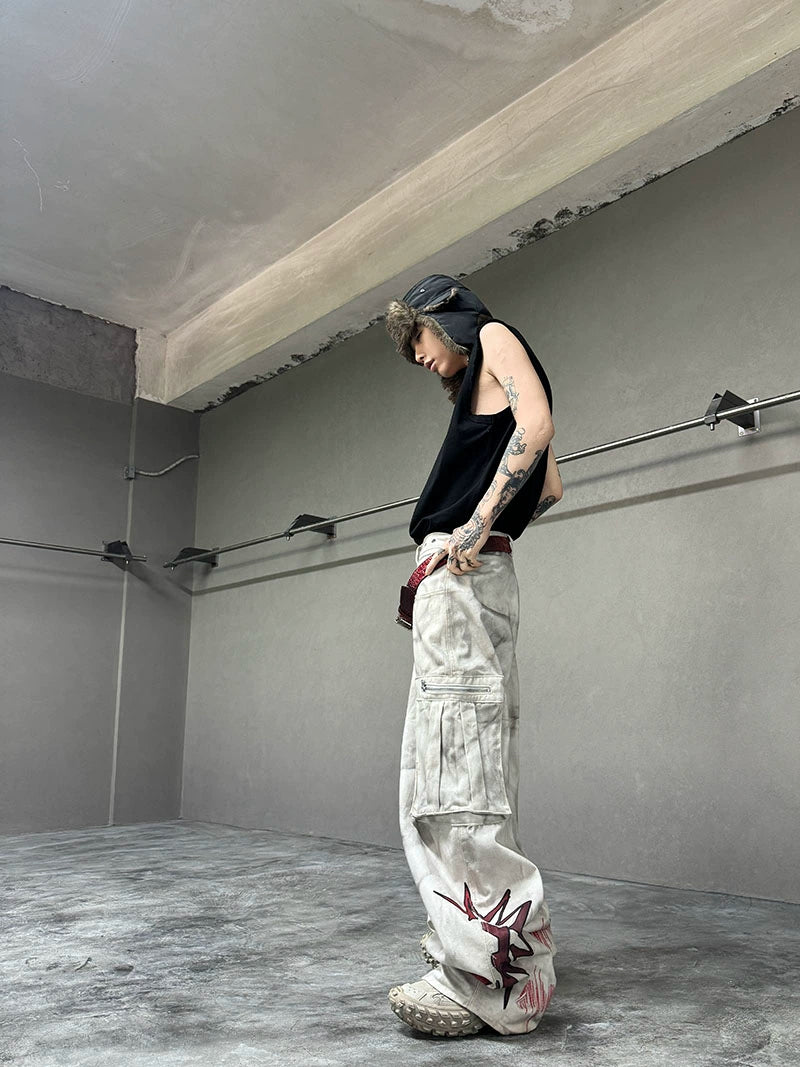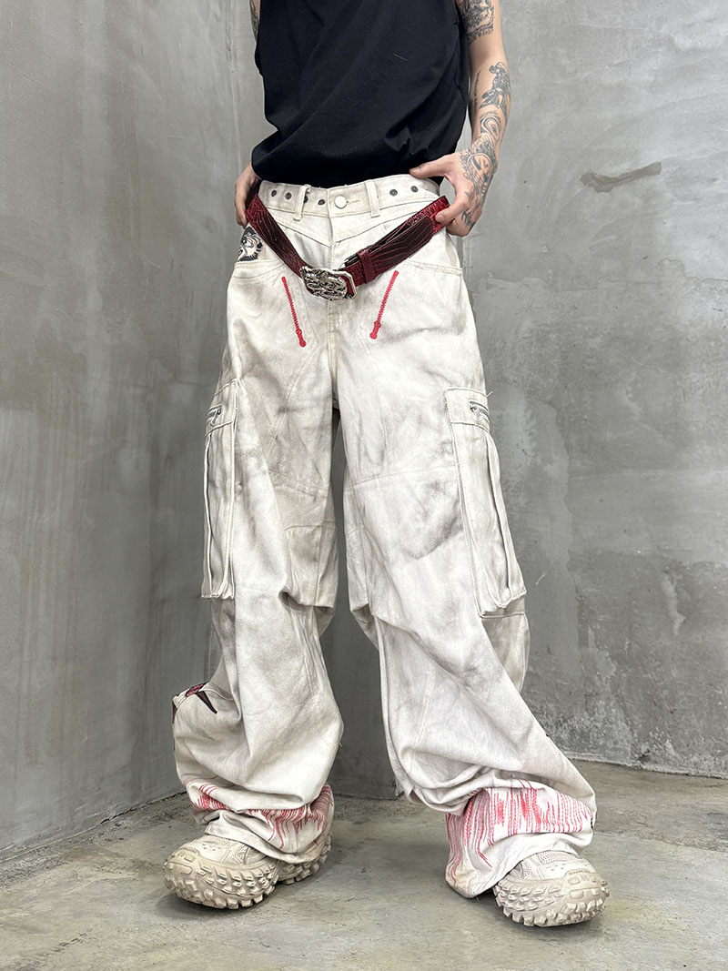 Damage Dye Print Wide Leg Cargo Denim Jeans WN21164