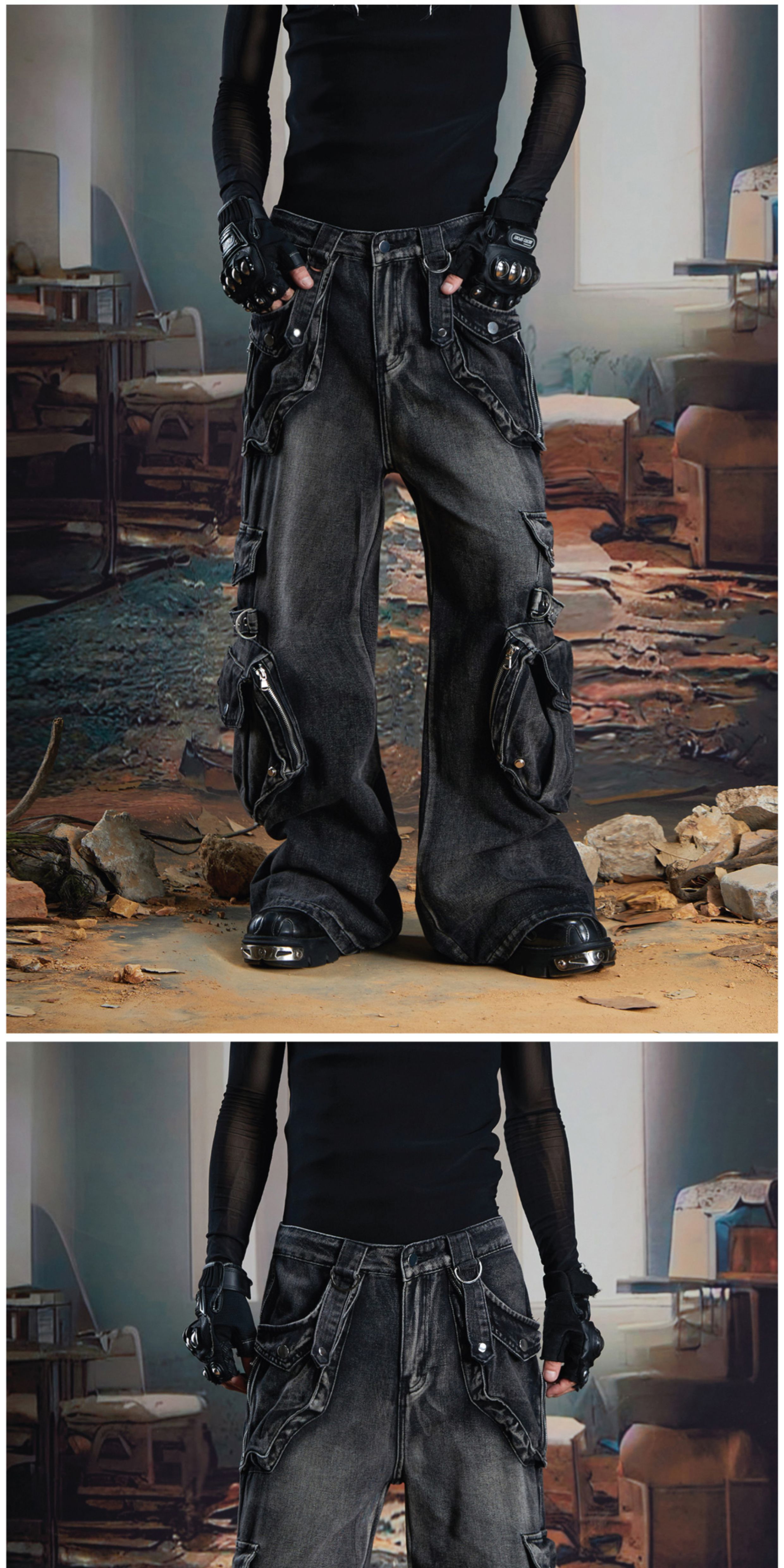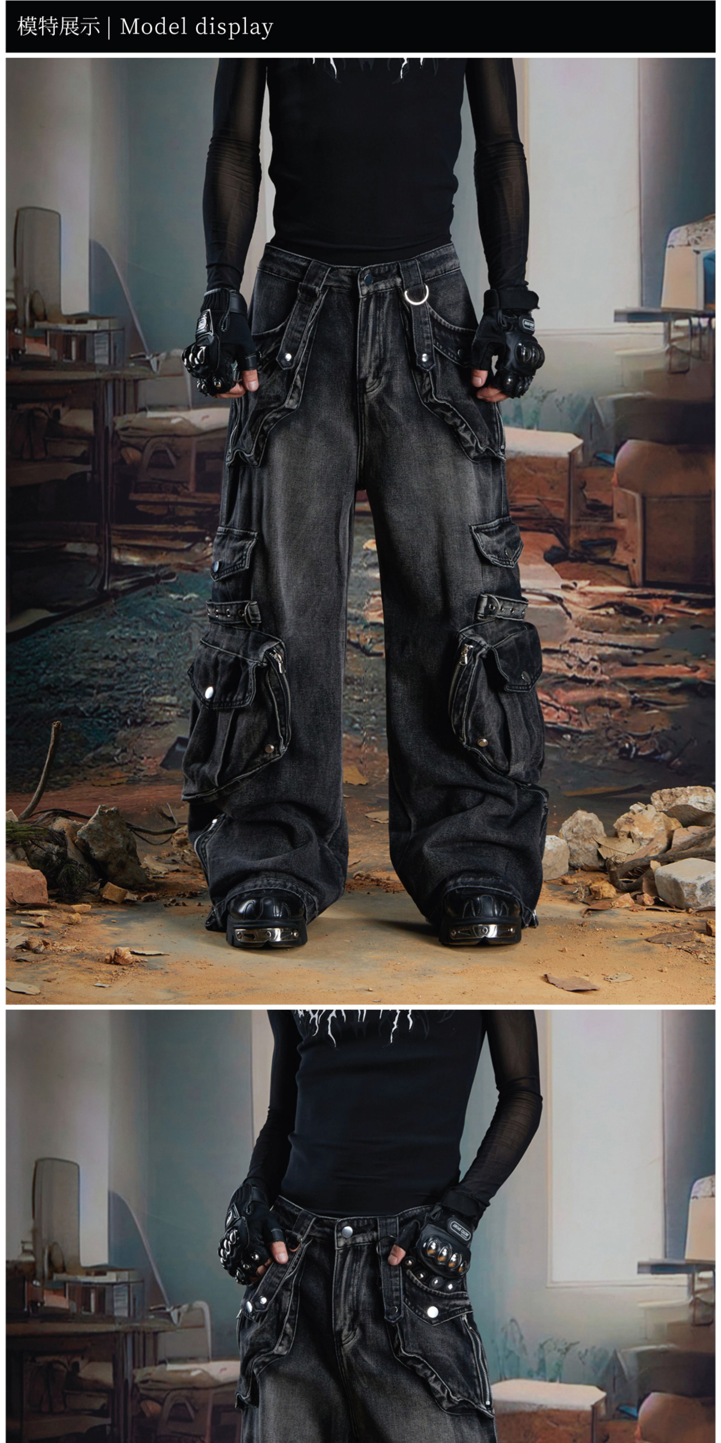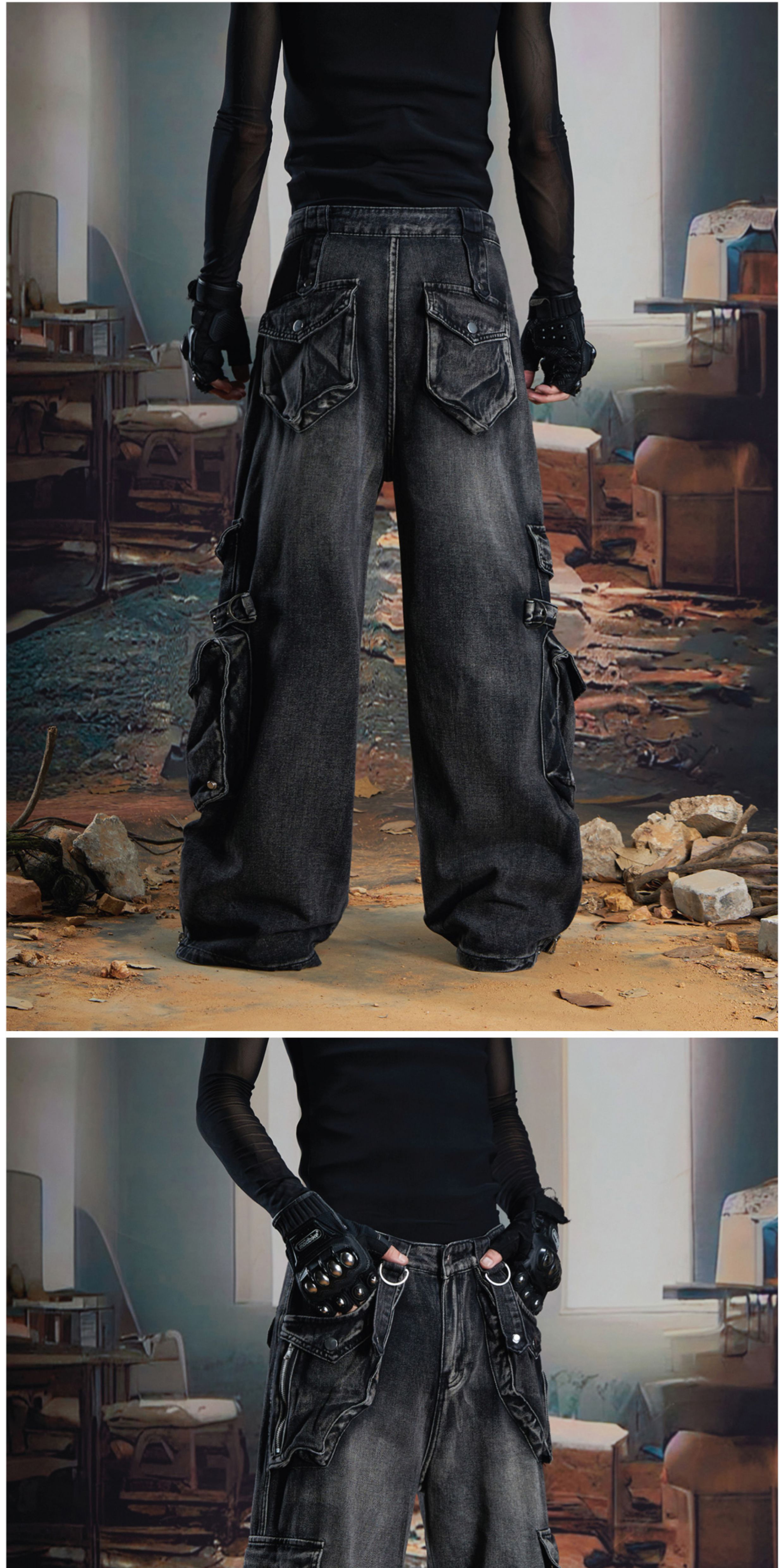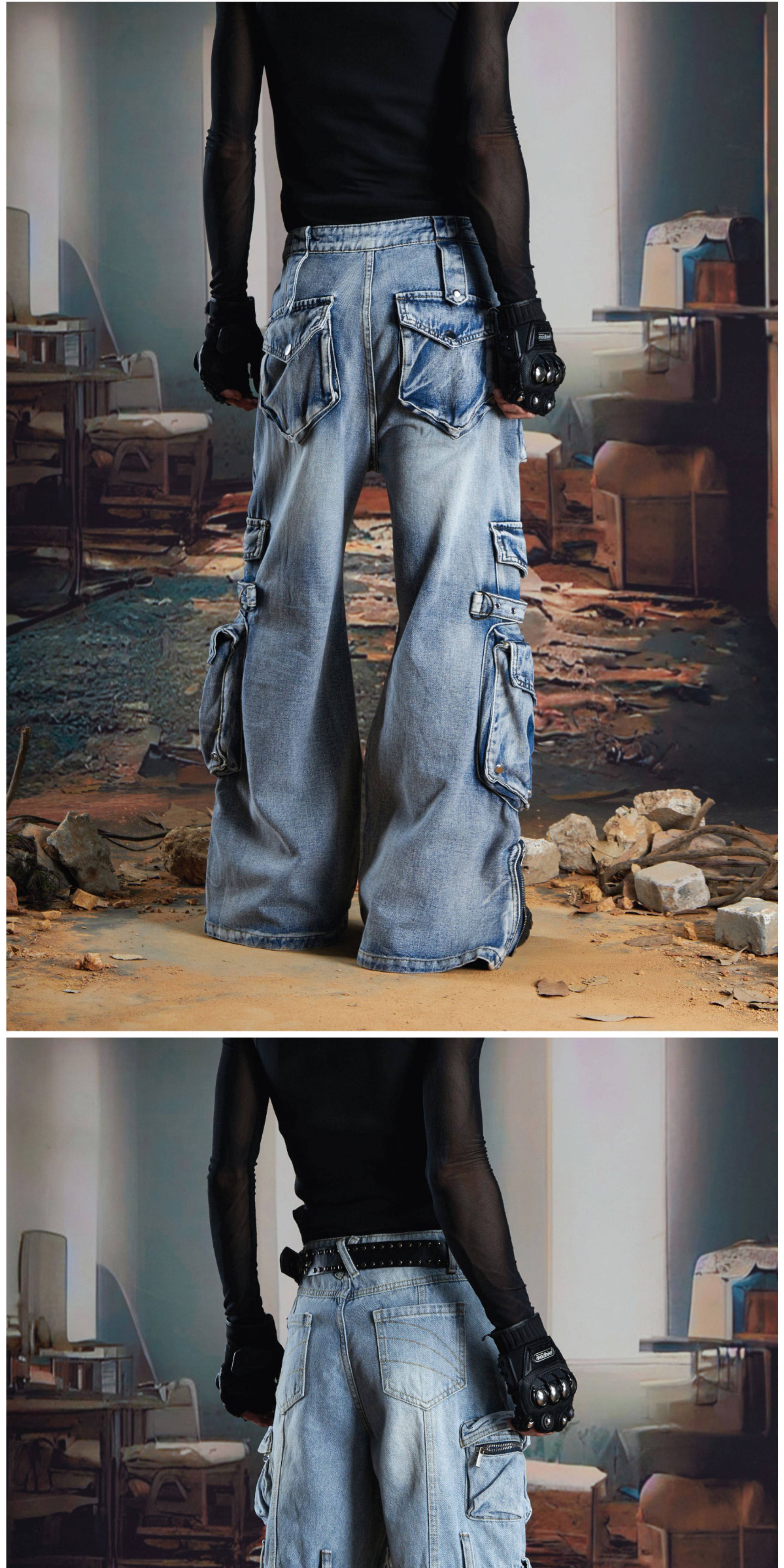 Splicing Multi-Pocket Washed Damage Cargo Denim Jeans WN21334