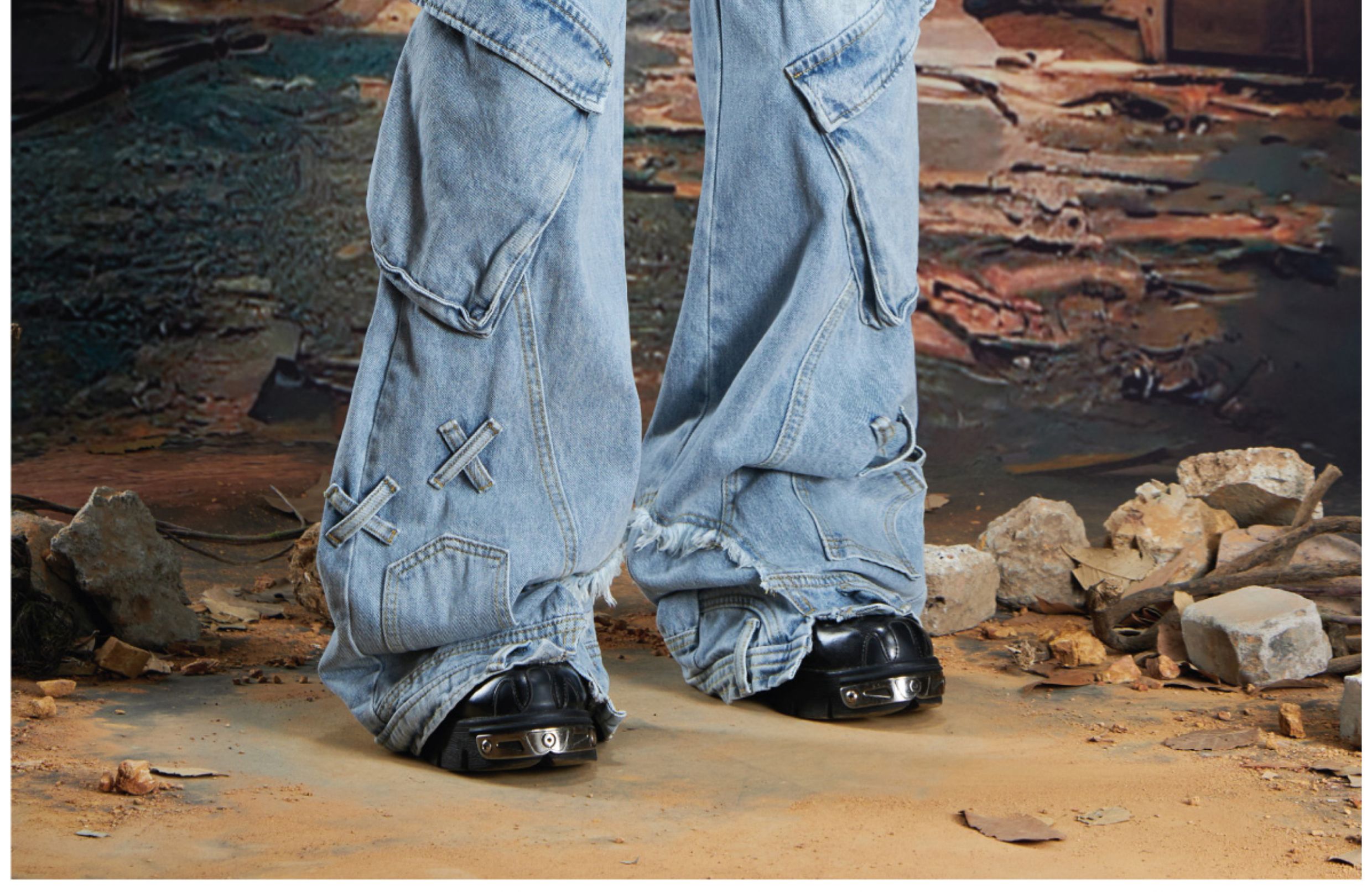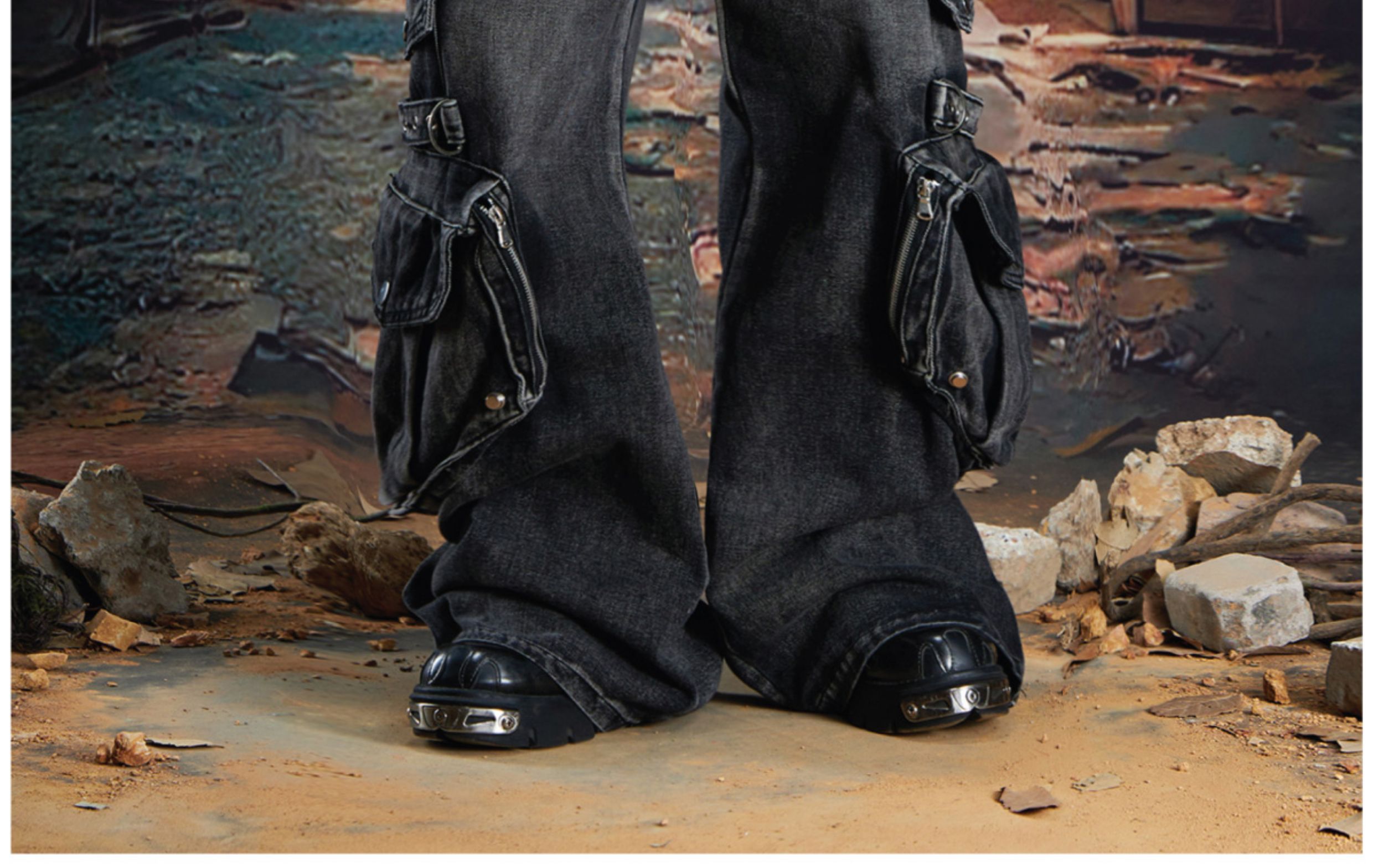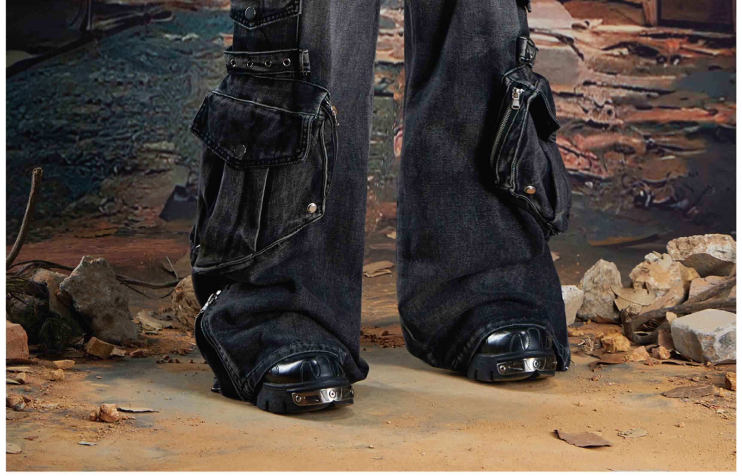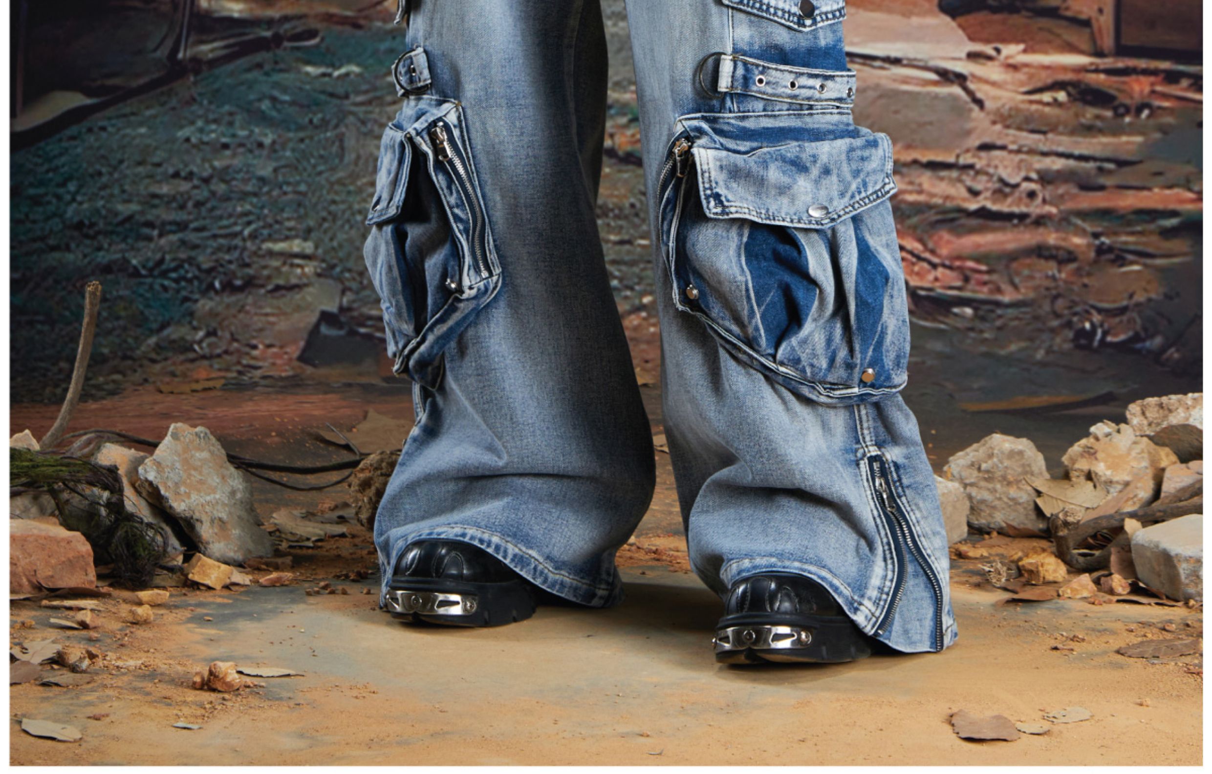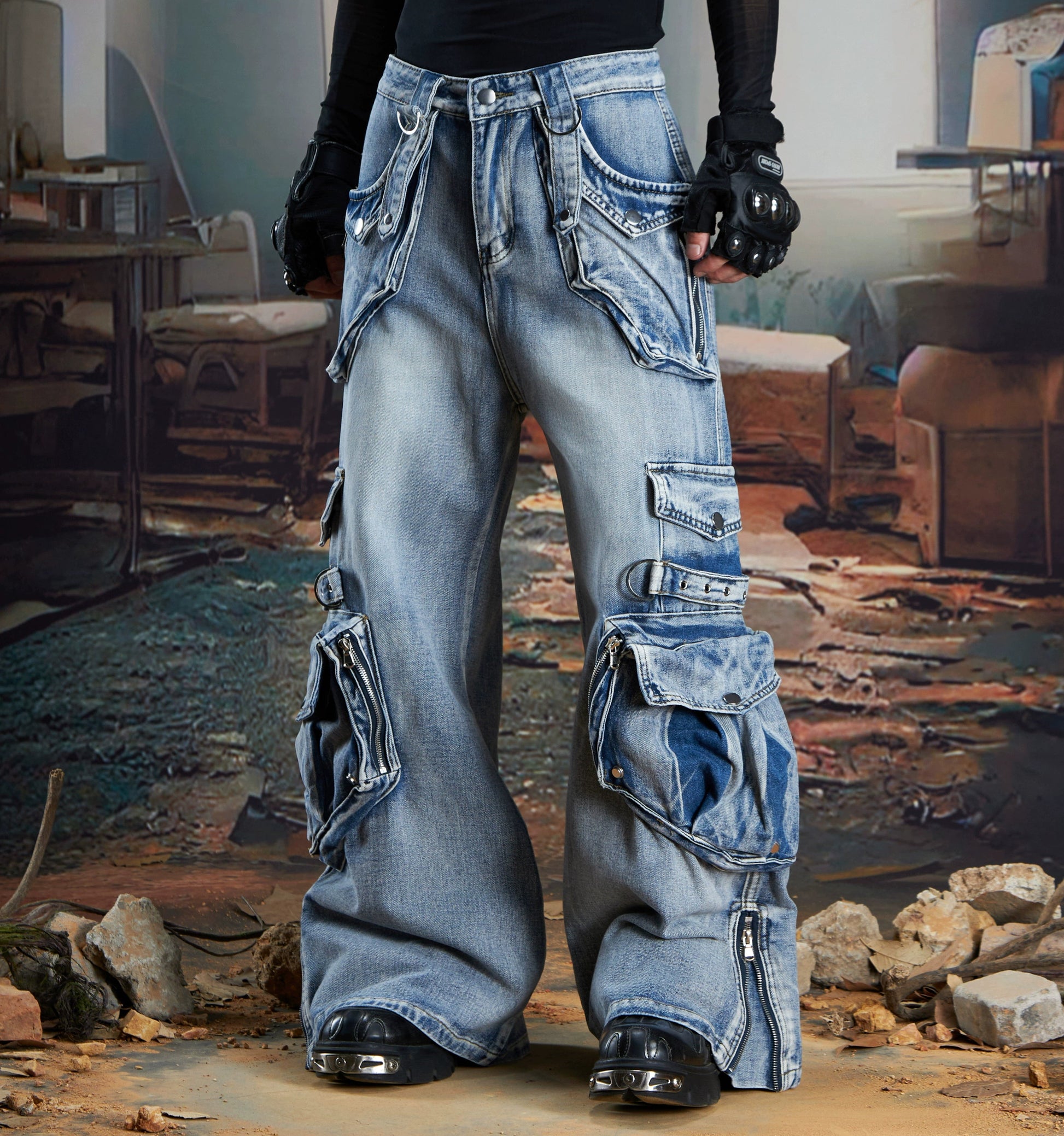Splicing Multi-Pocket Washed Damage Cargo Denim Jeans WN21334