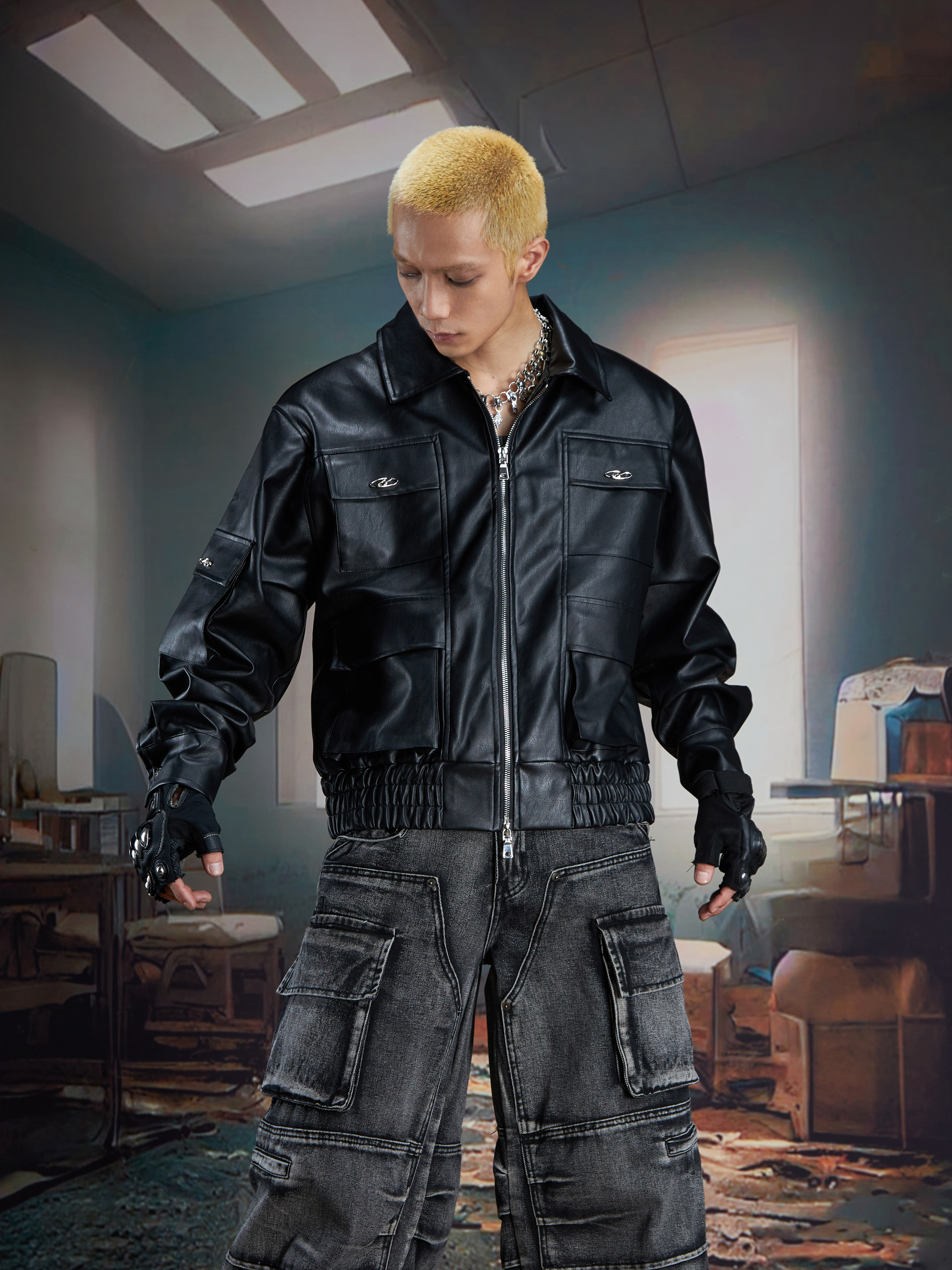 Metal Decor Multi-Pocket PU Leather Zipper Jacket WN21367
