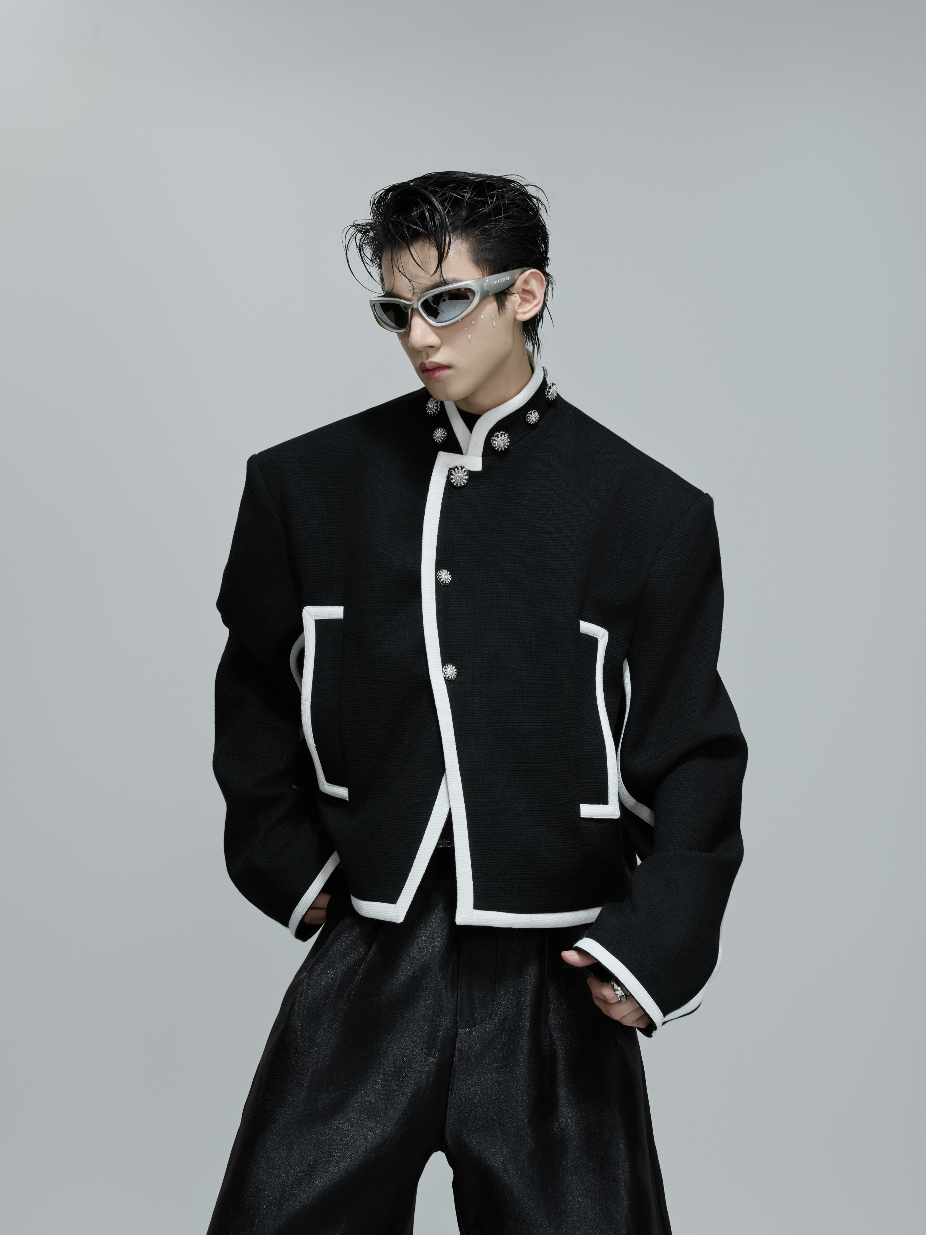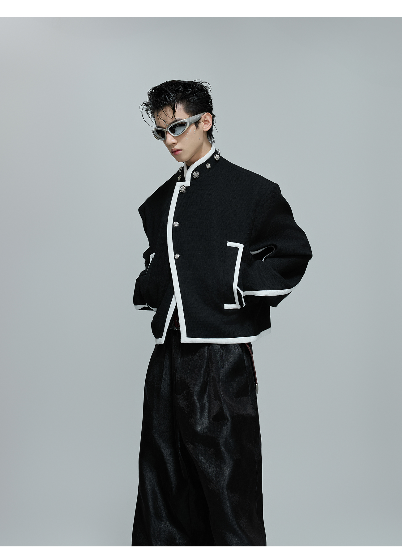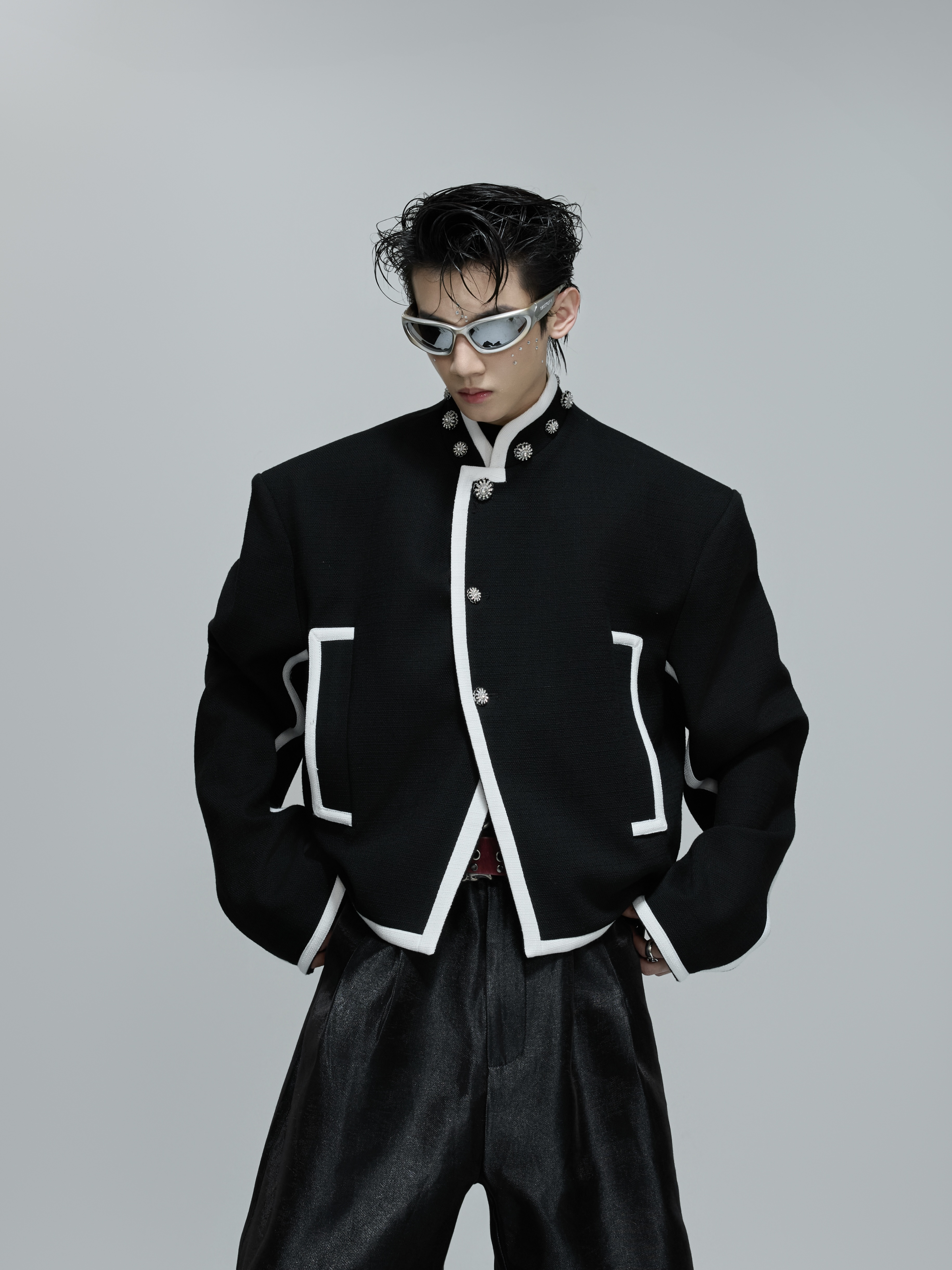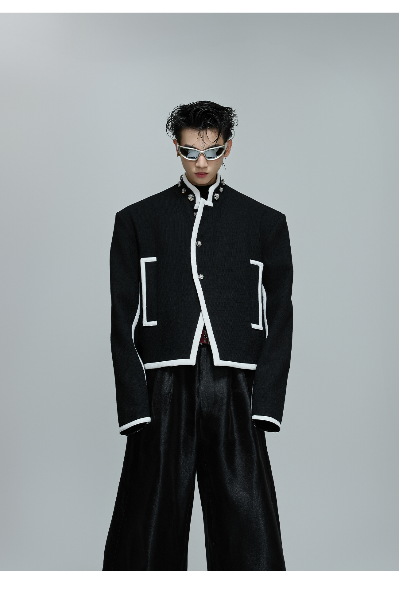 Standing-Collar Colorblock Shoulder-Pad Short Jacket WN21690