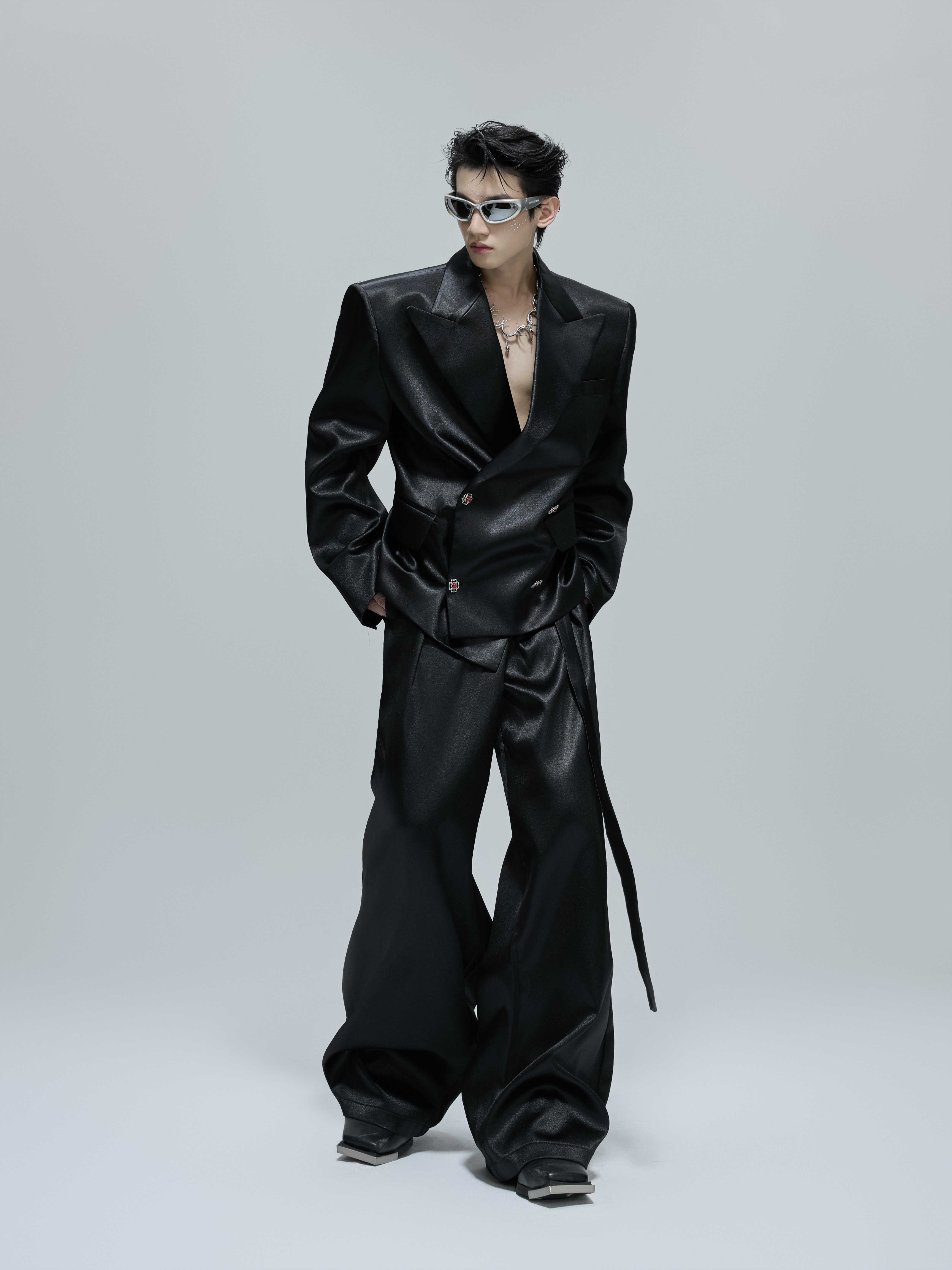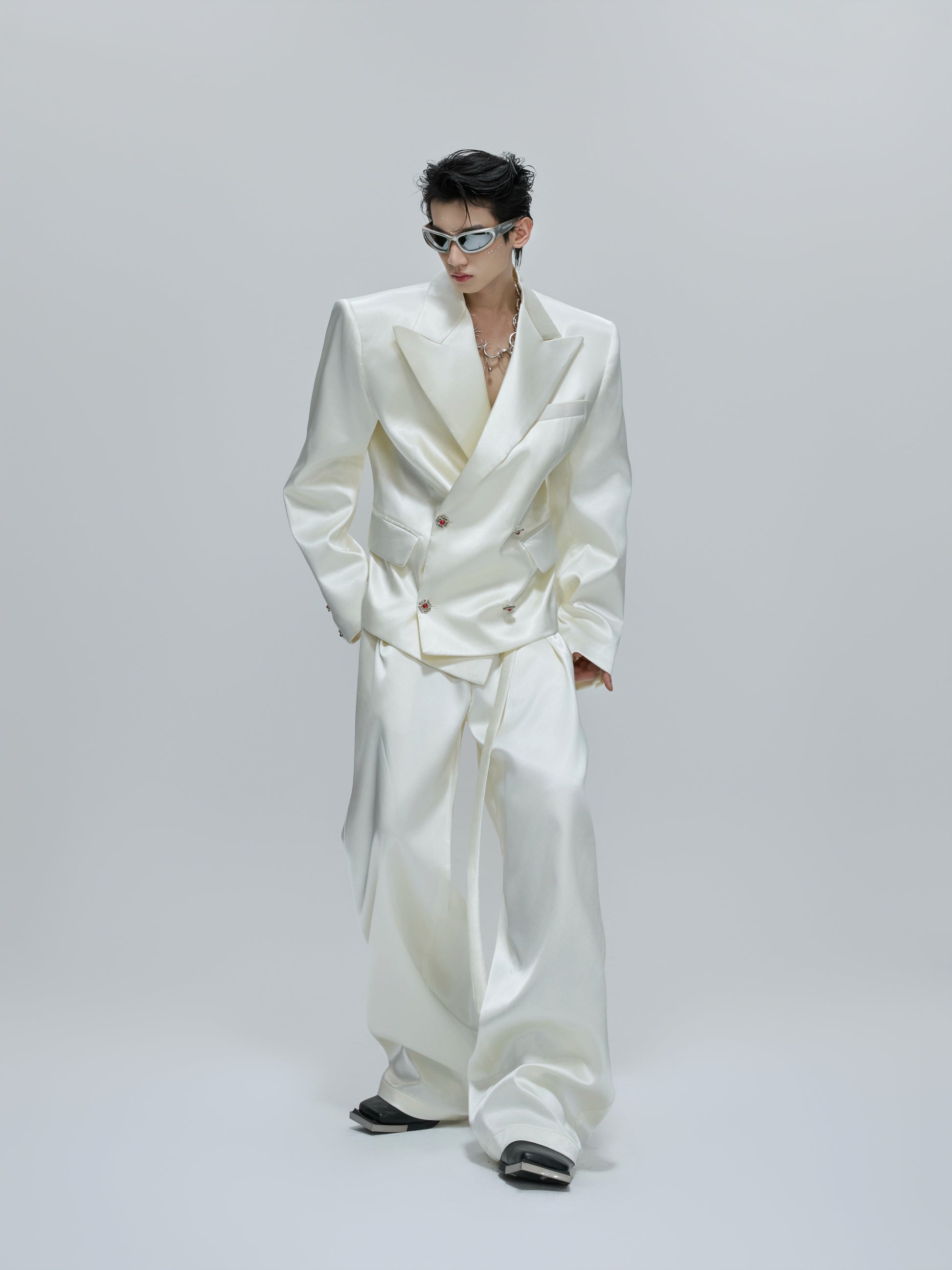 Glossy Waist-Fitted Tailored Jacket & Flare Trousers Setup WN21702
